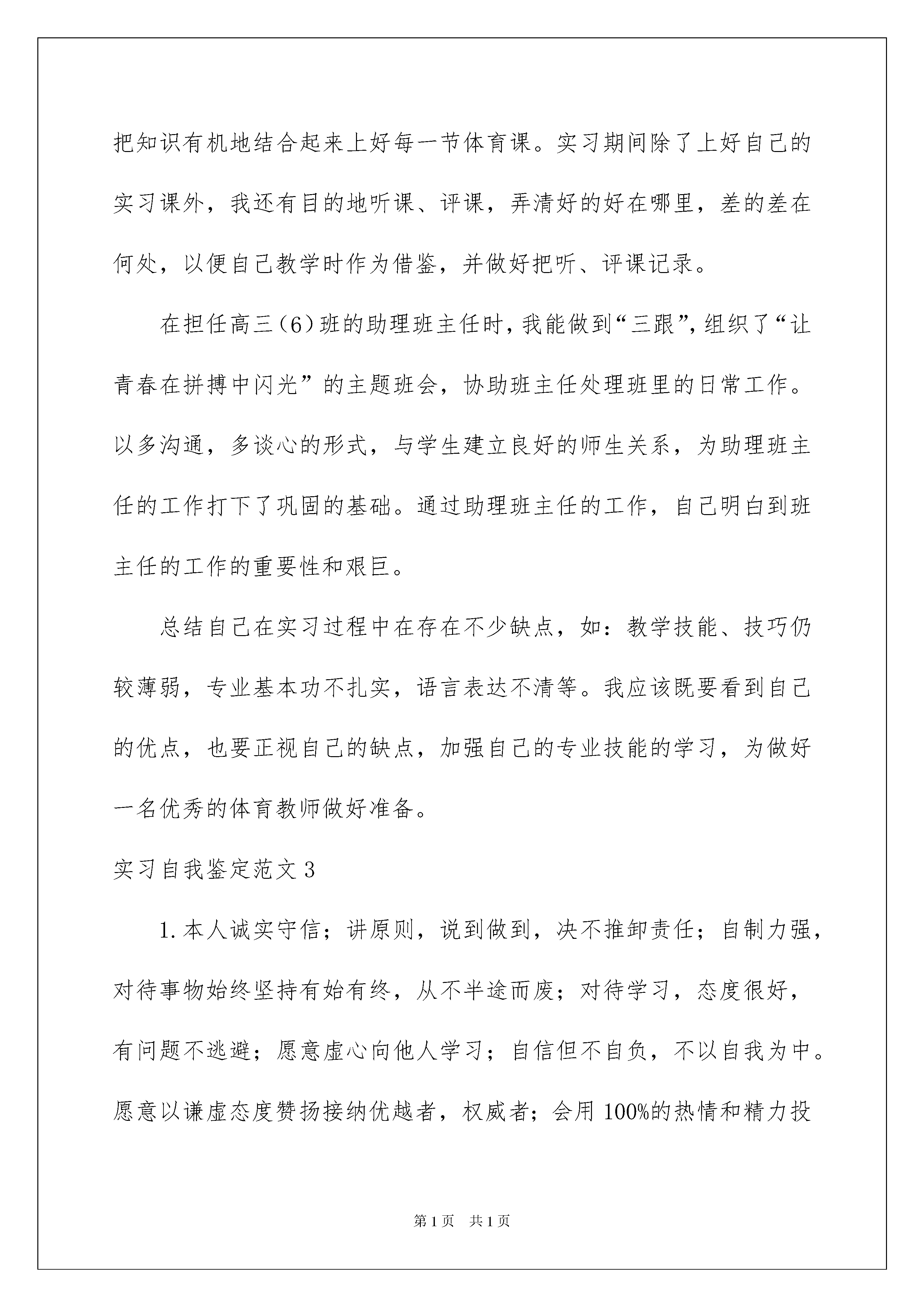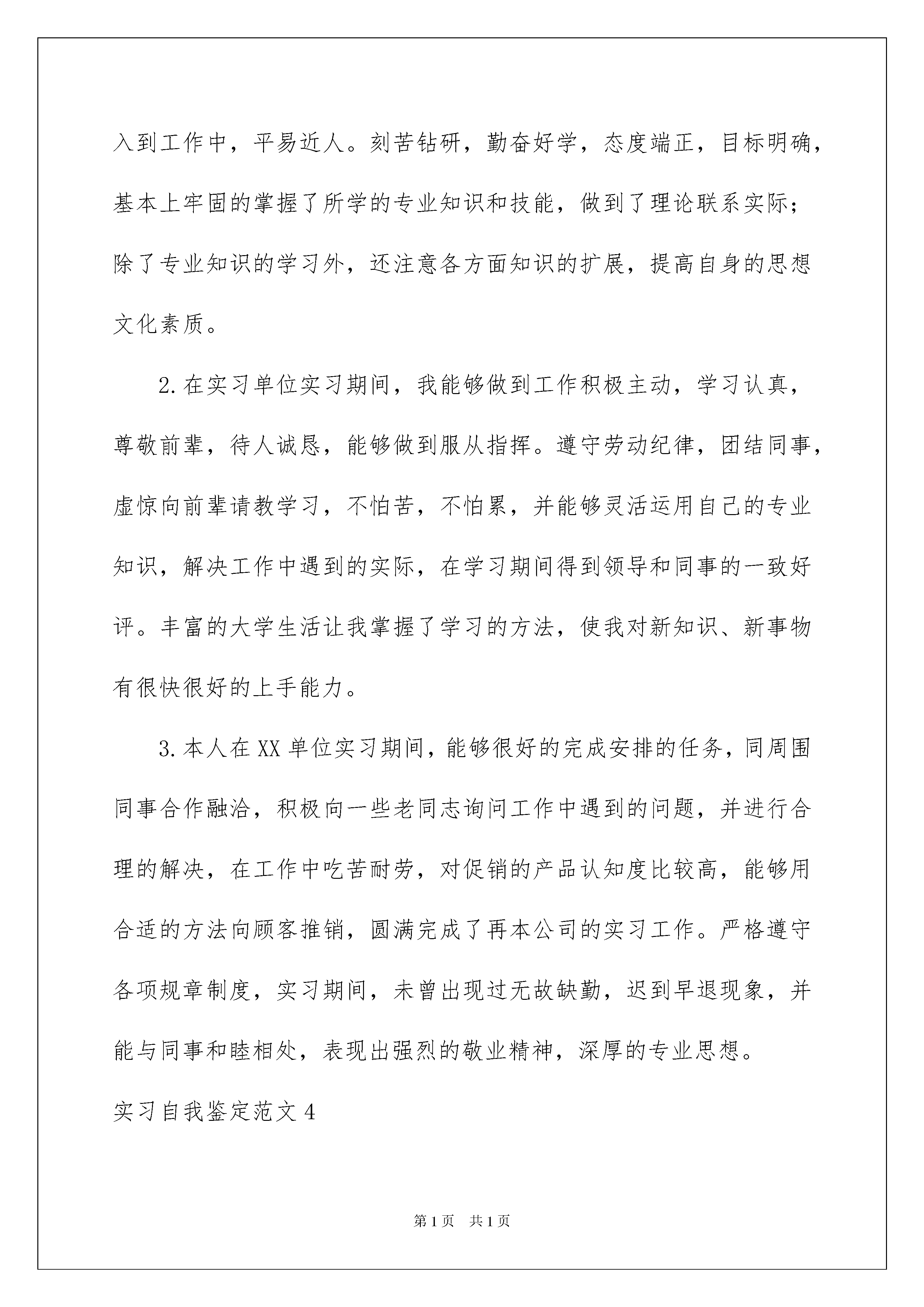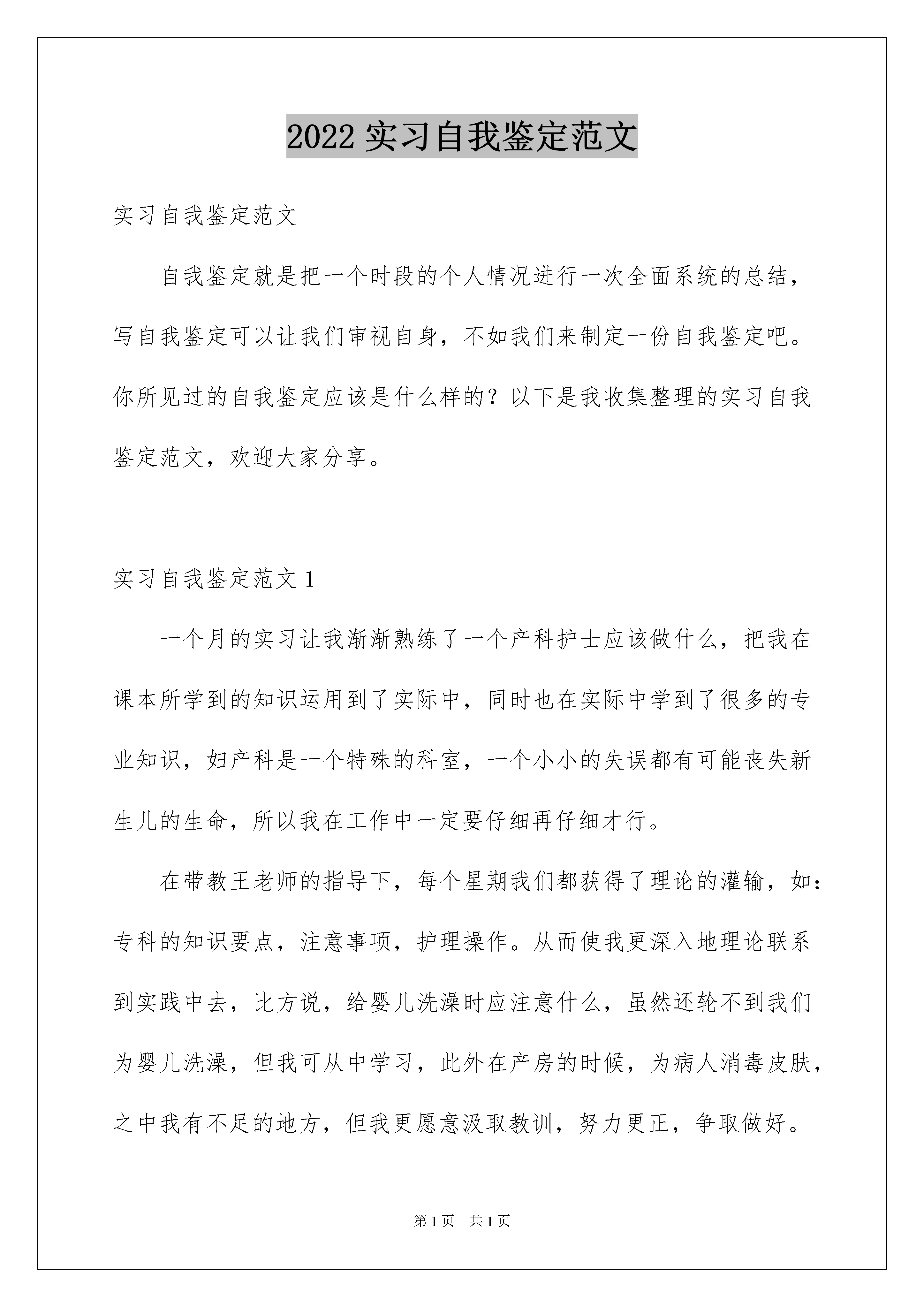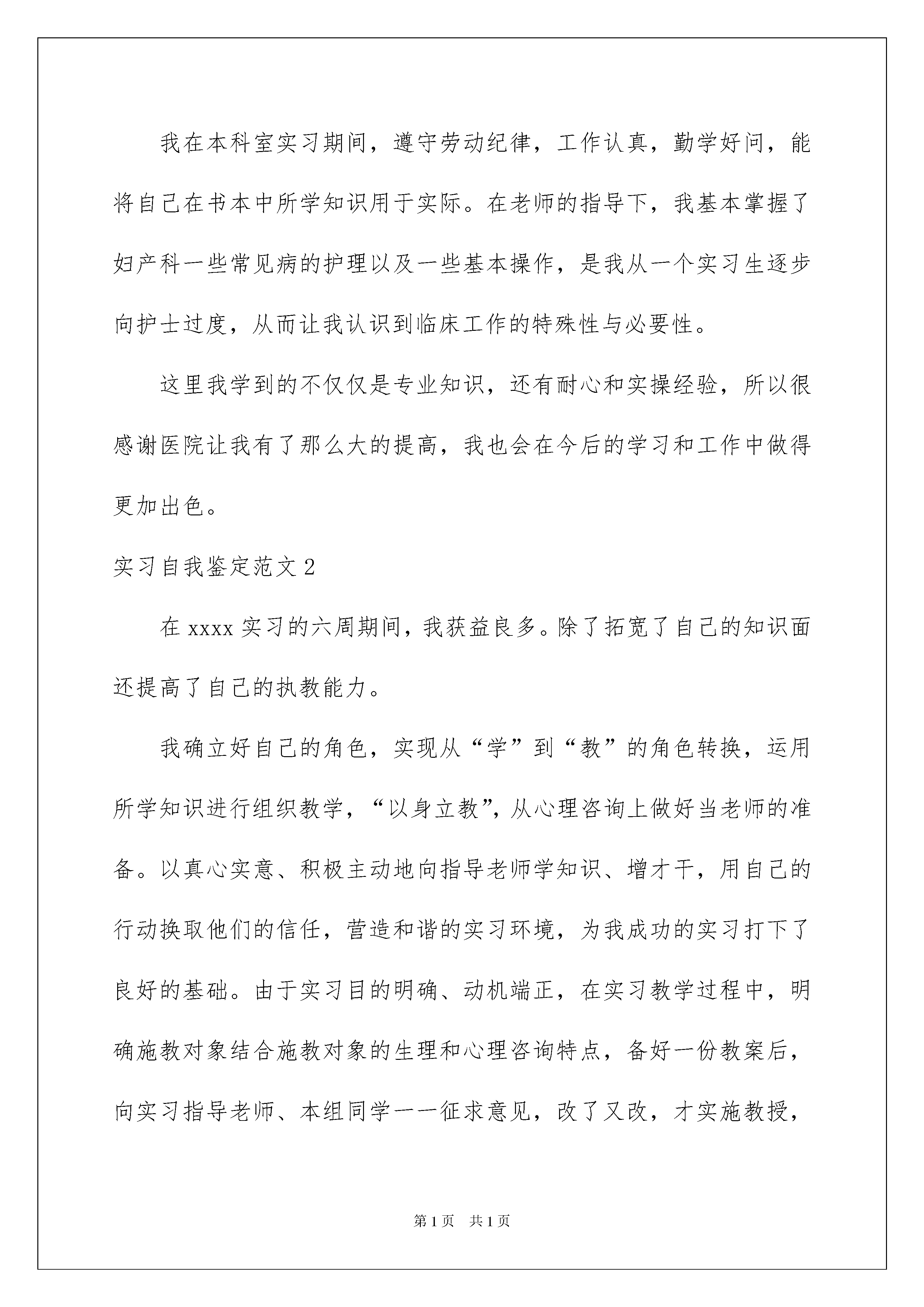 2022实习自我鉴定范文实习自我鉴定范文自我鉴定就是把一个时段的个人情况进行一次全面系统的总结,写自我鉴定可以让我们审视自身,不如我们来制定一份自我鉴定吧。你所见过的自我鉴定应该是什么样的?以下是我收集整理的实习自我鉴定范文,欢迎大家分享。实习自我鉴定范文1一个月的实习让我渐渐熟练了一个产科护士应该做什么,把我在课本所学到的知识运用到了实际中,同时也在实际中学到了很多的专业知识,妇产科是一个特殊的科室,一个小小的失误都有可能丧失新生儿的生命,所以我在工作中一定要仔细再仔细才行。在带教王老师的指导下,每个星期我们都获得了理论的灌输,如:专科的知识要点,注意事项,护理操作。从而使我更深入地理论联系到实践中去,比方说,给婴儿洗澡时应注意什么,虽然还轮不到我们为婴儿洗澡,但我可从中学习,此外在产房的时候,为病人消毒皮肤,之中我有不足的地方,但我更愿意汲取教训,努力更正,争取做好。我在本科室实习期间,遵守劳动纪律,工作认真,勤学好问,能将自己在书本中所学知识用于实际。在老师的指导下,我基本掌握了妇产科一些常见病的护理以及一些基本操作,是我从一个实习生逐步向护士过度,从而让我认识到临床工作的特殊性与必要性。这里我学到的不仅仅是专业知识,还有耐心和实操经验,所以很感谢医院让我有了那么大的提高,我也会在今后的学习和工作中做得更加出色。实习自我鉴定范文2在xxxx实习的六周期间,我获益良多。除了拓宽了自己的知识面还提高了自己的执教能力。我确立好自己的角色,实现从“学”到“教”的角色转换,运用所学知识进行组织教学,“以身立教”,从心理咨询上做好当老师的准备。以真心实意、积极主动地向指导老师学知识、增才干,用自己的行动换取他们的信任,营造和谐的实习环境,为我成功的实习打下了良好的基础。由于实习目的明确、动机端正,在实习教学过程中,明确施教对象结合施教对象的生理和心理咨询特点,备好一份教案后,向实习指导老师、本组同学一一征求意见,改了又改,才实施教授,把知识有机地结合起来上好每一节体育课。实习期间除了上好自己的实习课外,我还有目的地听课、评课,弄清好的好在哪里,差的差在何处,以便自己教学时作为借鉴,并做好把听、评课记录。在担任高三(6)班的助理班主任时,我能做到“三跟”,组织了“让青春在拼搏中闪光”的主题班会,协助班主任处理班里的日常工作。以多沟通,多谈心的形式,与学生建立良好的师生关系,为助理班主任的工作打下了巩固的基础。通过助理班主任的工作,自己明白到班主任的工作的重要性和艰巨。总结自己在实习过程中在存在不少缺点,如:教学技能、技巧仍较薄弱,专业基本功不扎实,语言表达不清等。我应该既要看到自己的优点,也要正视自己的缺点,加强自己的专业技能的学习,为做好一名优秀的体育教师做好准备。实习自我鉴定范文31.本人诚实守信;讲原则,说到做到,决不推卸责任;自制力强,对待事物始终坚持有始有终,从不半途而废;对待学习,态度很好,有问题不逃避;愿意虚心向他人学习;自信但不自负,不以自我为中。愿意以谦虚态度赞扬接纳优越者,权威者;会用100%的热情和精力投入到工作中,平易近人。刻苦钻研,勤奋好学,态度端正,目标明确,基本上牢固的掌握了所学的专业知识和技能,做到了理论联系实际;除了专业知识的学习外,还注意各方面知识的扩展,提高自身的思想文化素质。2.在实习单位实习期间,我能够做到工作积极主动,学习认真,尊敬前辈,待人诚恳,能够做到服从指挥。遵守劳动纪律,团结同事,虚惊向前辈请教学习,不怕苦,不怕累,并能够灵活运用自己的专业知识,解决工作中遇到的实际,在学习期间得到领导和同事的一致好评。丰富的大学生活让我掌握了学习的方法,使我对新知识、新事物有很快很好的上手能力。3.本人在XX单位实习期间,能够很好的完成安排的任务,同周围同事合作融洽,积极向一些老同志询问工作中遇到的问题,并进行合理的解决,在工作中吃苦耐劳,对促销的产品认知度比较高,能够用合适的方法向顾客推销,圆满完成了再本公司的实习工作。严格遵守各项规章制度,实习期间,未曾出现过无故缺勤,迟到早退现象,并能与同事和睦相处,表现出强烈的敬业精神,深厚的专业思想。实习自我鉴定范文4迎来XX年,我的实习期也接近尾声。实习期6个月中,在飞行器研发中心,我学到很多有用的知识和技能,这些是书本或是大学课堂里学不到的,也是理论知识联系实践使十年寒窗积累有用武之地。在此,我感谢公司领导的培养,感谢专家的知道,感谢同事的支持。飞行器研发中心成立时刻较短,人手紧缺,部门工作比较繁重,但在部门领导的安排和指导下有条不紊。作为飞行器研发中心测控组成员,我用心配合组长,负责文档修改和图