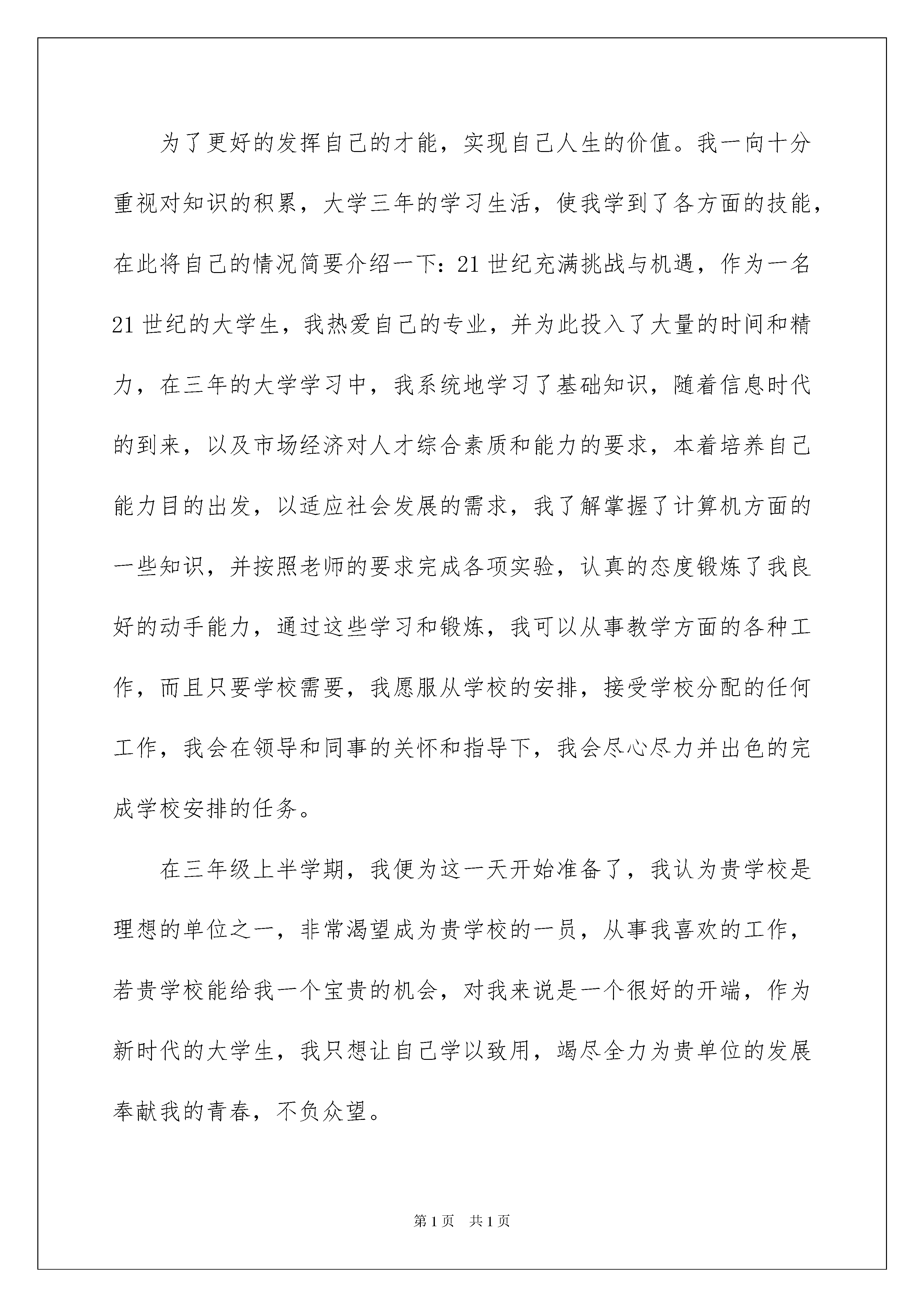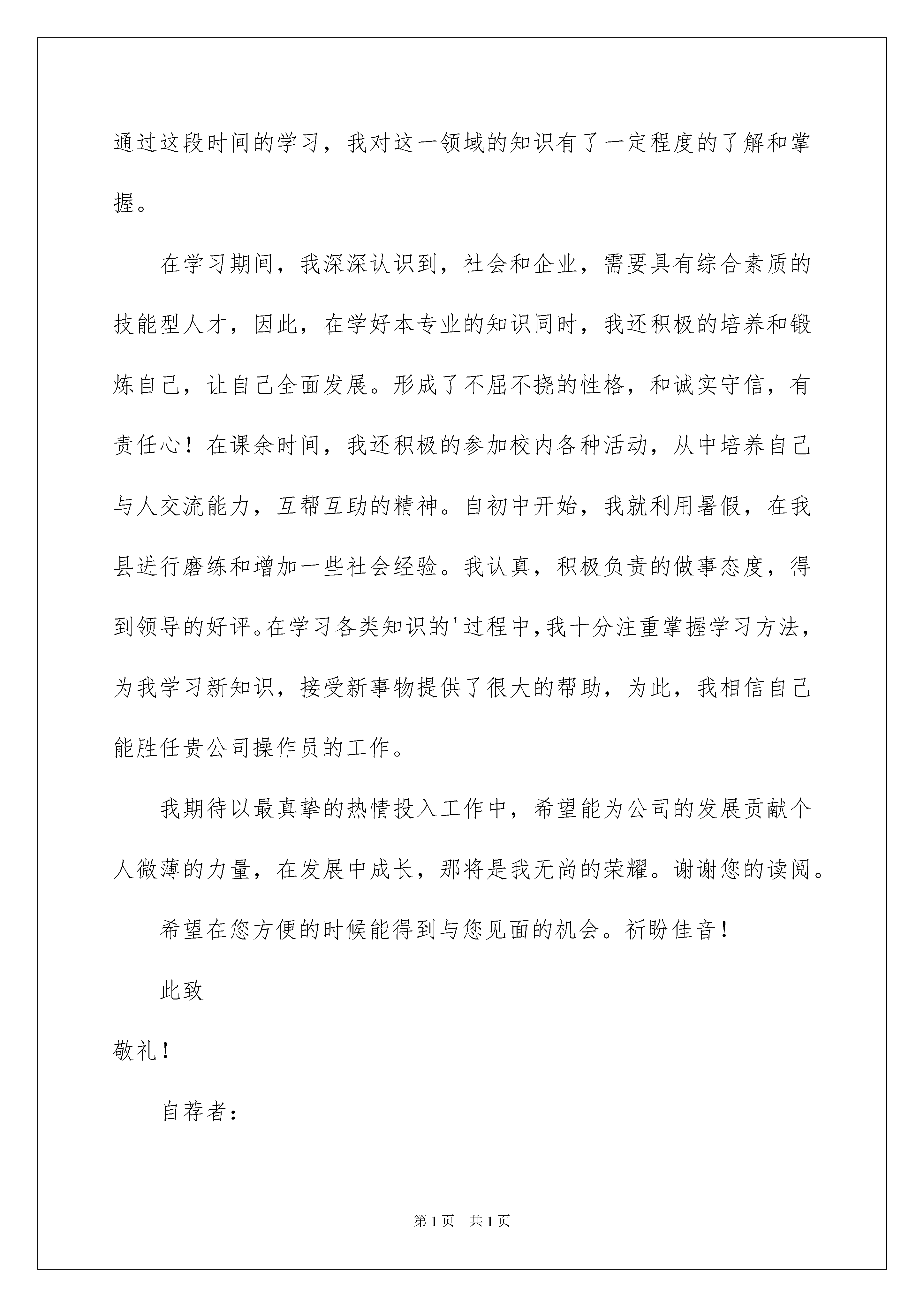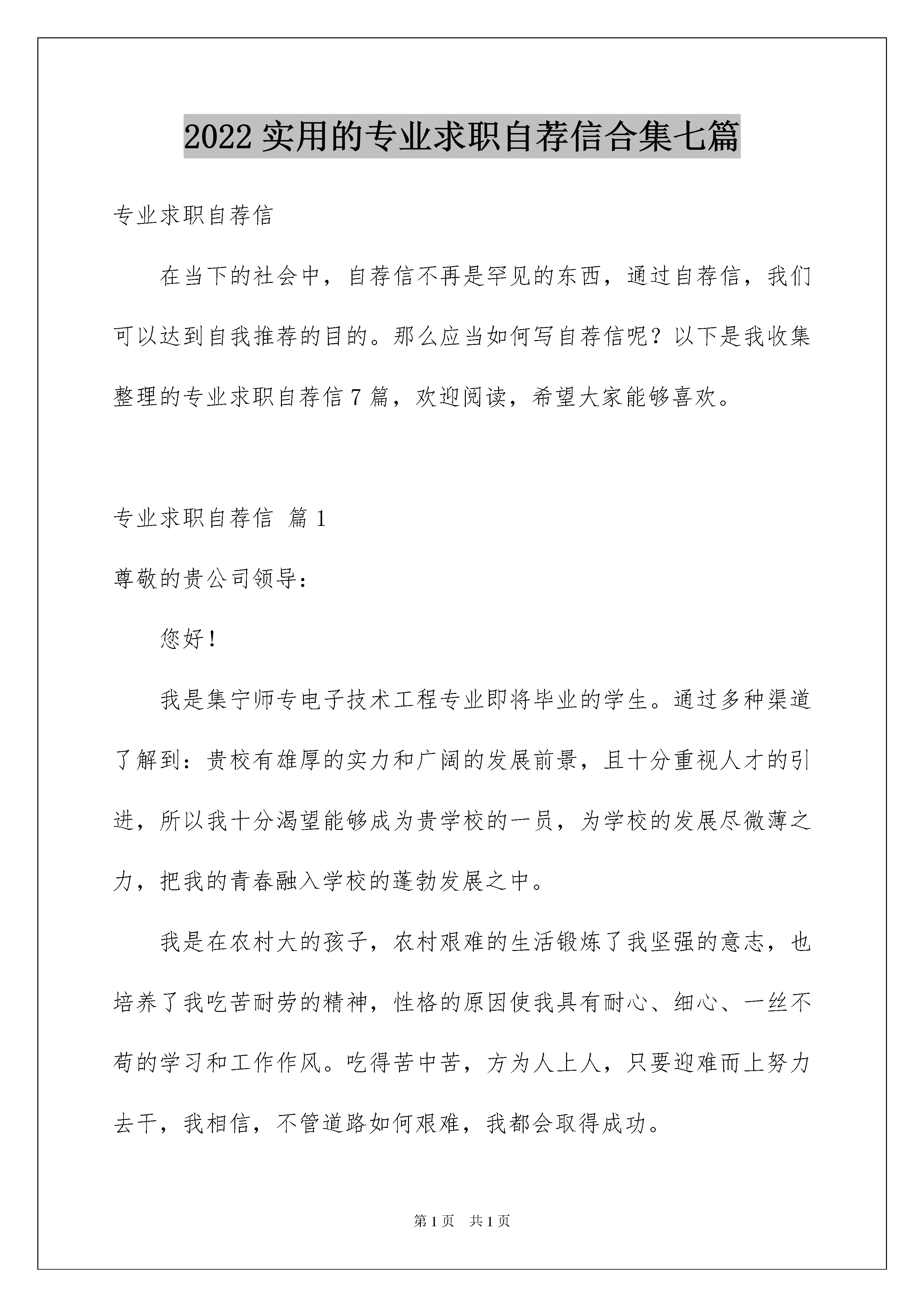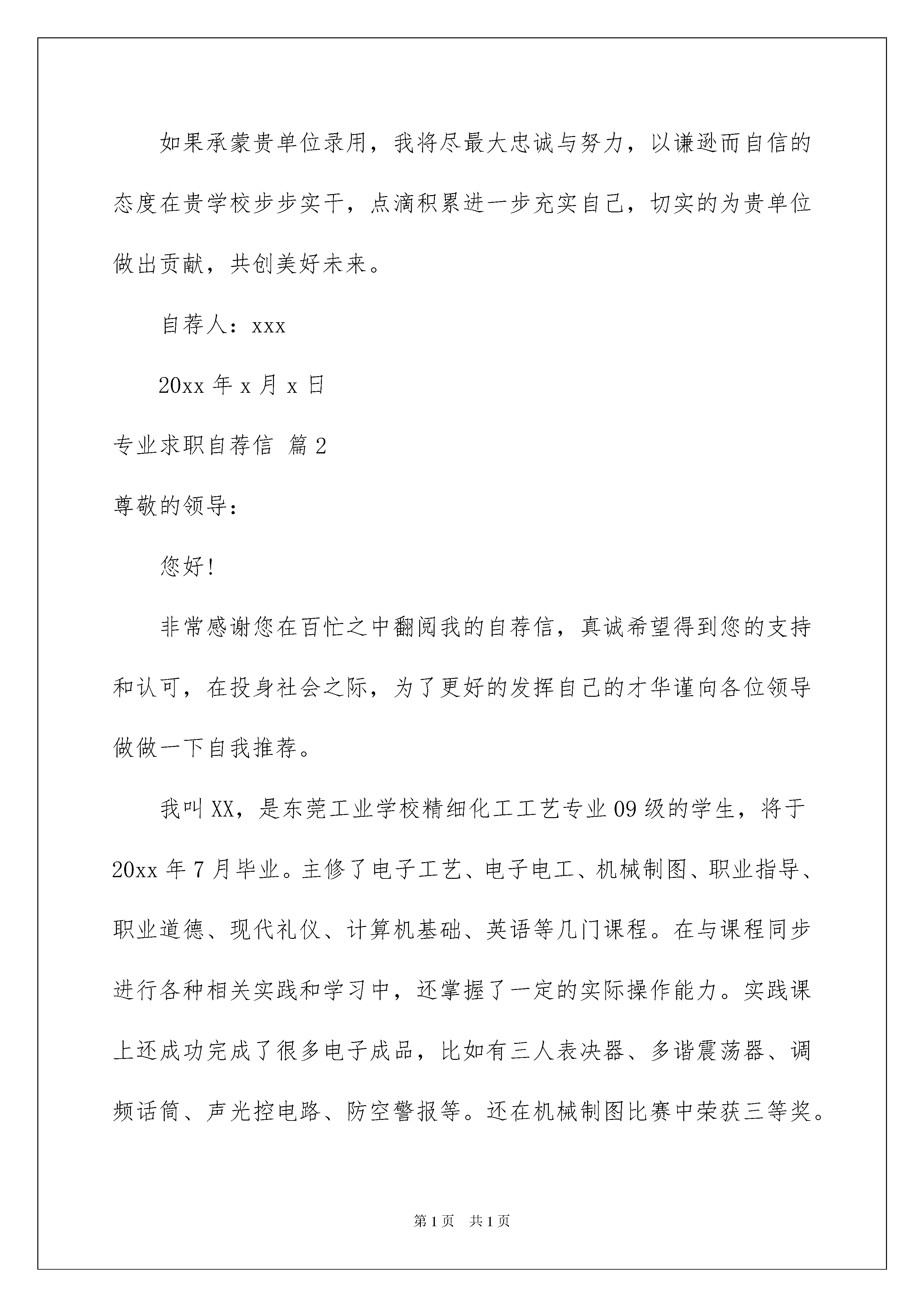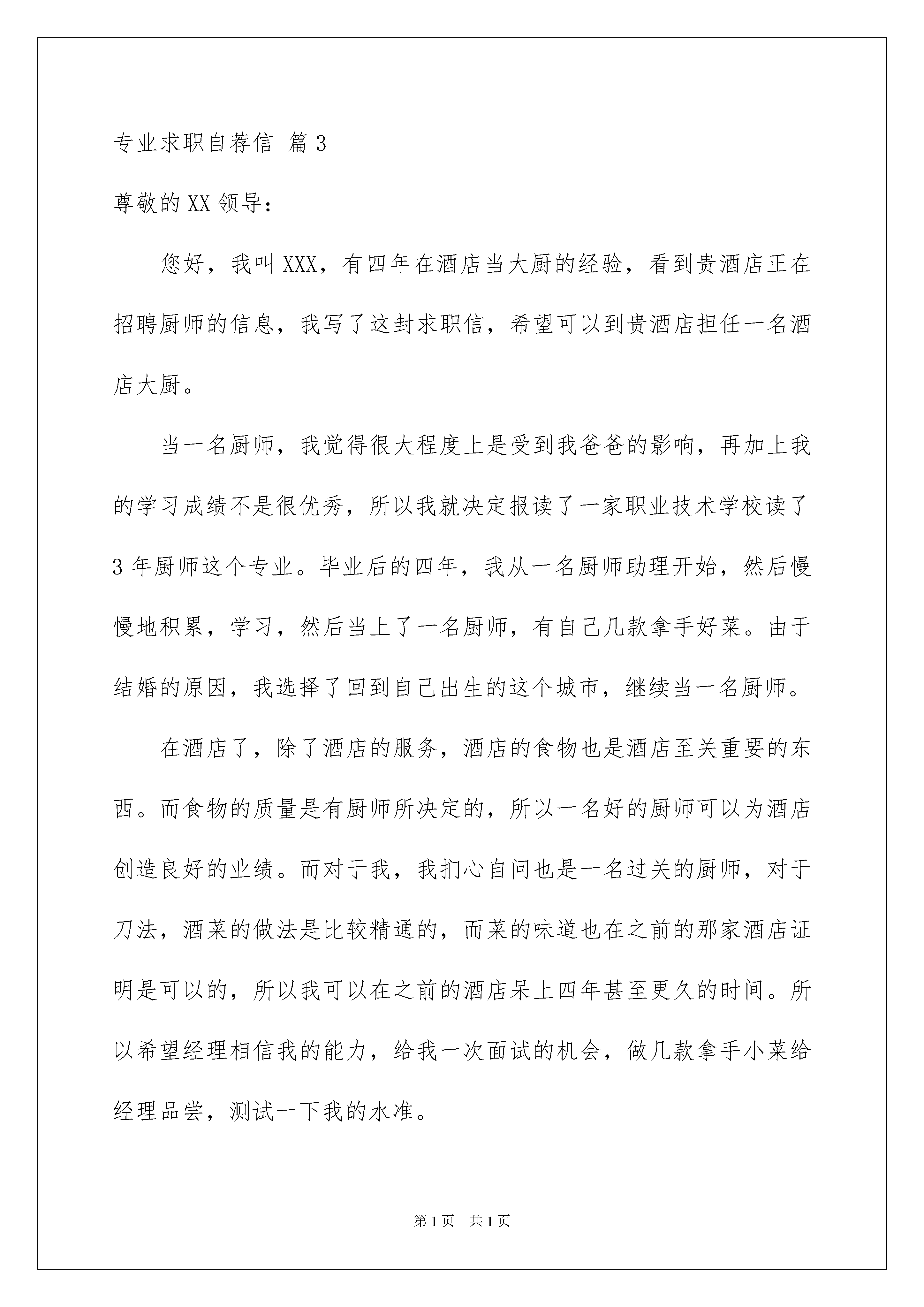 2022实用的专业求职自荐信合集七篇专业求职自荐信在当下的社会中,自荐信不再是罕见的东西,通过自荐信,我们可以达到自我推荐的目的。那么应当如何写自荐信呢?以下是我收集整理的专业求职自荐信7篇,欢迎阅读,希望大家能够喜欢。专业求职自荐信篇1尊敬的贵公司领导:您好!我是集宁师专电子技术工程专业即将毕业的学生。通过多种渠道了解到:贵校有雄厚的实力和广阔的发展前景,且十分重视人才的引进,所以我十分渴望能够成为贵学校的一员,为学校的发展尽微薄之力,把我的青春融入学校的蓬勃发展之中。我是在农村大的孩子,农村艰难的生活锻炼了我坚强的意志,也培养了我吃苦耐劳的精神,性格的原因使我具有耐心、细心、一丝不苟的学习和工作作风。吃得苦中苦,方为人上人,只要迎难而上努力去干,我相信,不管道路如何艰难,我都会取得成功。为了更好的发挥自己的才能,实现自己人生的价值。我一向十分重视对知识的积累,大学三年的学习生活,使我学到了各方面的技能,在此将自己的情况简要介绍一下:21世纪充满挑战与机遇,作为一名21世纪的大学生,我热爱自己的专业,并为此投入了大量的时间和精力,在三年的大学学习中,我系统地学习了基础知识,随着信息时代的到来,以及市场经济对人才综合素质和能力的要求,本着培养自己能力目的出发,以适应社会发展的需求,我了解掌握了计算机方面的一些知识,并按照老师的要求完成各项实验,认真的态度锻炼了我良好的动手能力,通过这些学习和锻炼,我可以从事教学方面的各种工作,而且只要学校需要,我愿服从学校的安排,接受学校分配的任何工作,我会在领导和同事的关怀和指导下,我会尽心尽力并出色的完成学校安排的任务。在三年级上半学期,我便为这一天开始准备了,我认为贵学校是理想的单位之一,非常渴望成为贵学校的一员,从事我喜欢的工作,若贵学校能给我一个宝贵的机会,对我来说是一个很好的开端,作为新时代的大学生,我只想让自己学以致用,竭尽全力为贵单位的发展奉献我的青春,不负众望。如果承蒙贵单位录用,我将尽最大忠诚与努力,以谦逊而自信的态度在贵学校步步实干,点滴积累进一步充实自己,切实的为贵单位做出贡献,共创美好未来。自荐人:xxx20xx年x月x日专业求职自荐信篇2尊敬的领导:您好!非常感谢您在百忙之中翻阅我的自荐信,真诚希望得到您的支持和认可,在投身社会之际,为了更好的发挥自己的才华谨向各位领导做做一下自我推荐。我叫XX,是东莞工业学校精细化工工艺专业09级的学生,将于20xx年7月毕业。主修了电子工艺、电子电工、机械制图、职业指导、职业道德、现代礼仪、计算机基础、英语等几门课程。在与课程同步进行各种相关实践和学习中,还掌握了一定的实际操作能力。实践课上还成功完成了很多电子成品,比如有三人表决器、多谐震荡器、调频话筒、声光控电路、防空警报等。还在机械制图比赛中荣获三等奖。通过这段时间的学习,我对这一领域的知识有了一定程度的了解和掌握。在学习期间,我深深认识到,社会和企业,需要具有综合素质的技能型人才,因此,在学好本专业的知识同时,我还积极的培养和锻炼自己,让自己全面发展。形成了不屈不挠的性格,和诚实守信,有责任心!在课余时间,我还积极的参加校内各种活动,从中培养自己与人交流能力,互帮互助的精神。自初中开始,我就利用暑假,在我县进行磨练和增加一些社会经验。我认真,积极负责的做事态度,得到领导的好评。在学习各类知识的'过程中,我十分注重掌握学习方法,为我学习新知识,接受新事物提供了很大的帮助,为此,我相信自己能胜任贵公司操作员的工作。我期待以最真挚的热情投入工作中,希望能为公司的发展贡献个人微薄的力量,在发展中成长,那将是我无尚的荣耀。谢谢您的读阅。希望在您方便的时候能得到与您见面的机会。祈盼佳音!此致敬礼!自荐者:专业求职自荐信篇3尊敬的XX领导:您好,我叫XXX,有四年在酒店当大厨的经验,看到贵酒店正在招聘厨师的信息,我写了这封求职信,希望可以到贵酒店担任一名酒店大厨。当一名厨师,我觉得很大程度上是受到我爸爸的影响,再加上我的学习成绩不是很优秀,所以我就决定报读了一家职业技术学校读了3年厨师这个专业。毕业后的四年,我从一名厨师助理开始,然后慢慢地积累,学习,然后当上了一名厨师,有自己几款拿手好菜。由于结婚的原因,我选择了回到自己出生的这个城市,继续当一名厨师。在酒店了,除了酒店的服务,酒店的食物也是酒店至关重要的东西。而食物的质量是有厨师所决定的,所以一名好的厨师可以为酒店创造良好的业绩。而对于我,我扪心自问也是一名过关的厨师,对于刀法,酒菜的做法是比较精通的,而菜的味道也在之前的那家酒店证明是可以的,所以我可以在之前的酒店呆上四年甚至