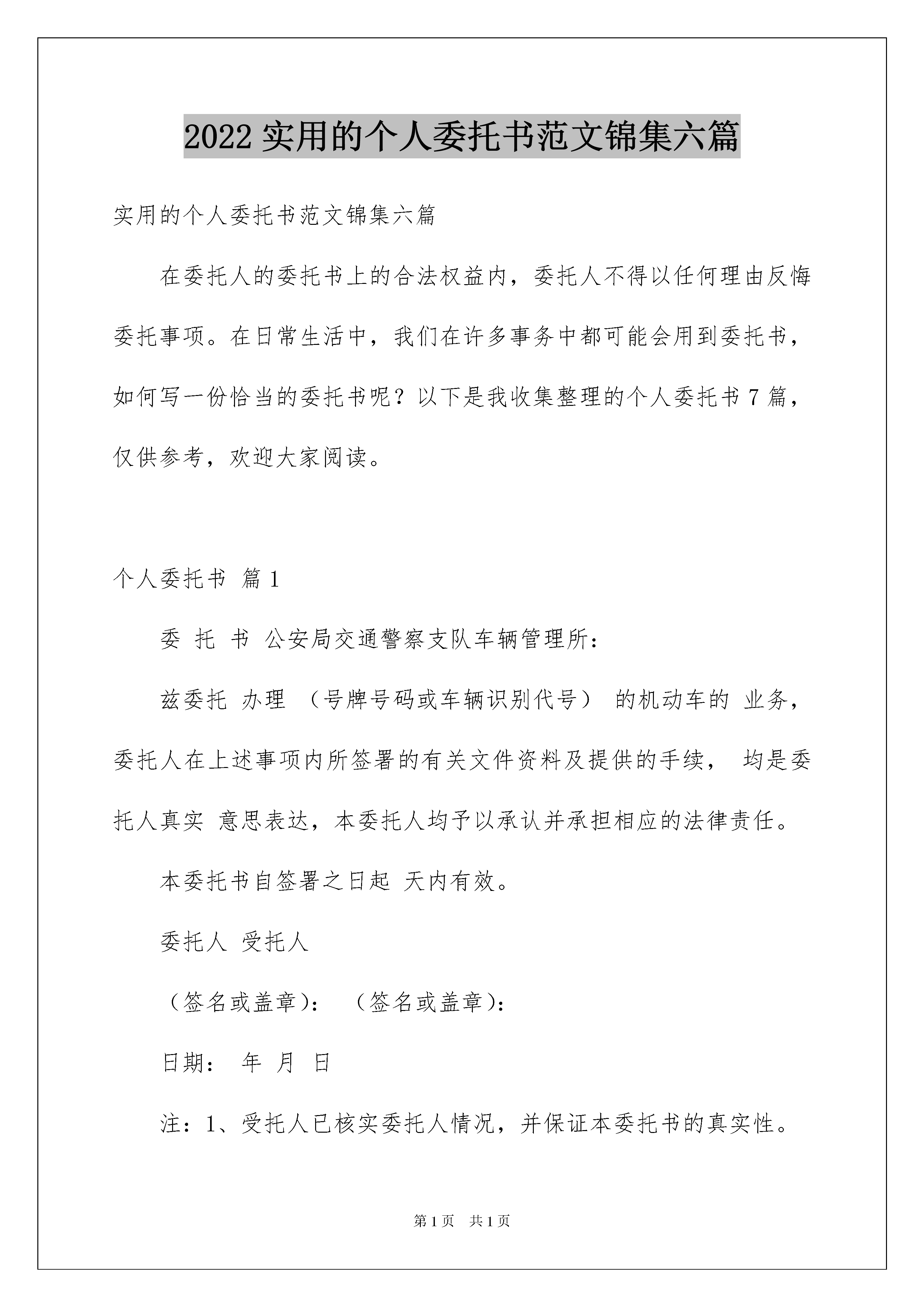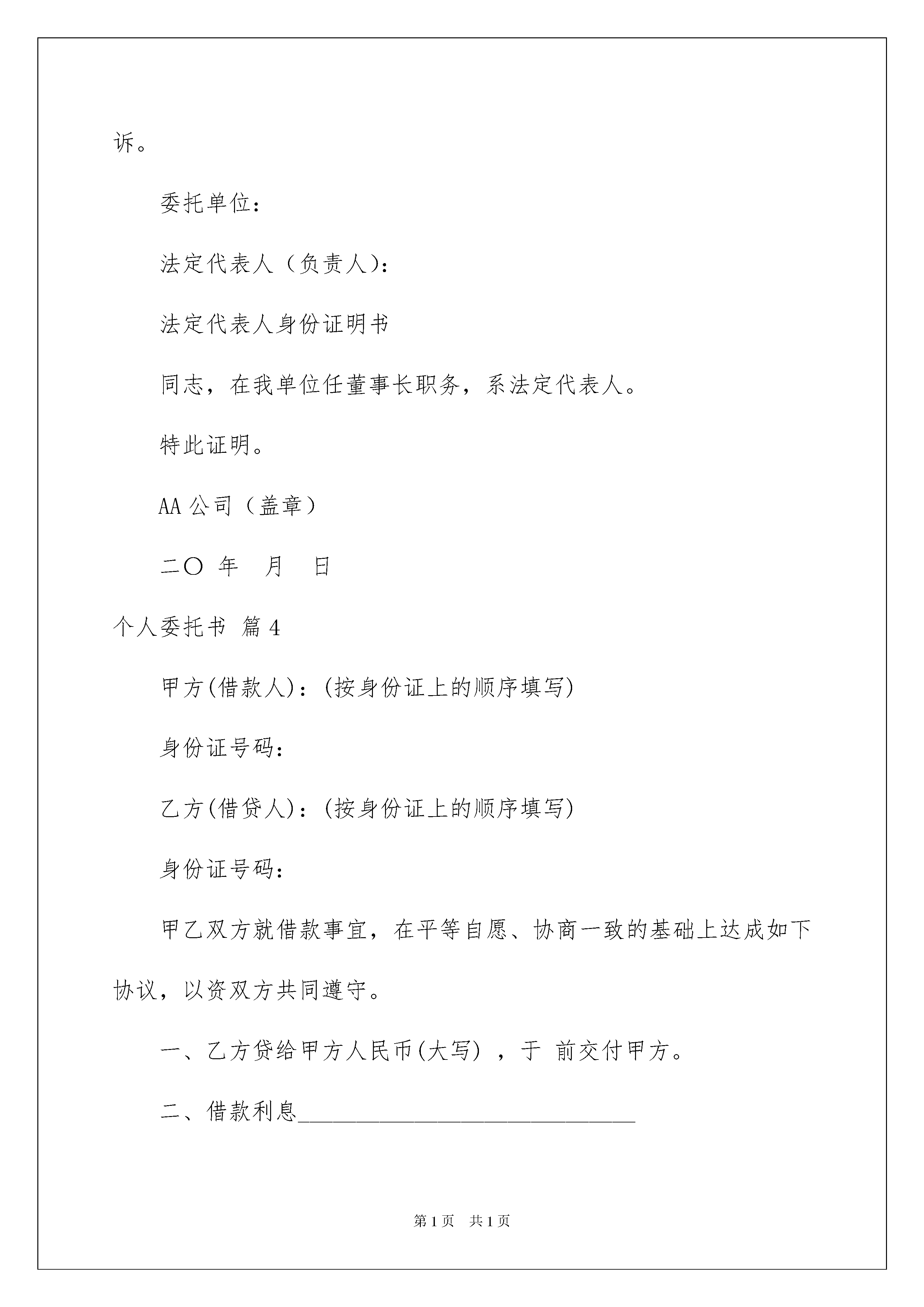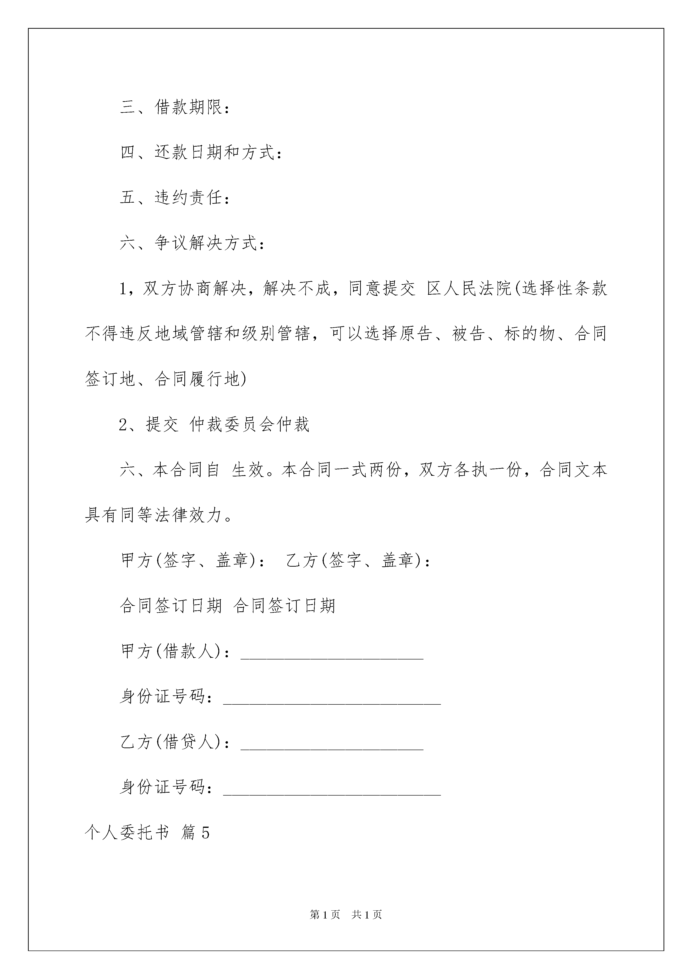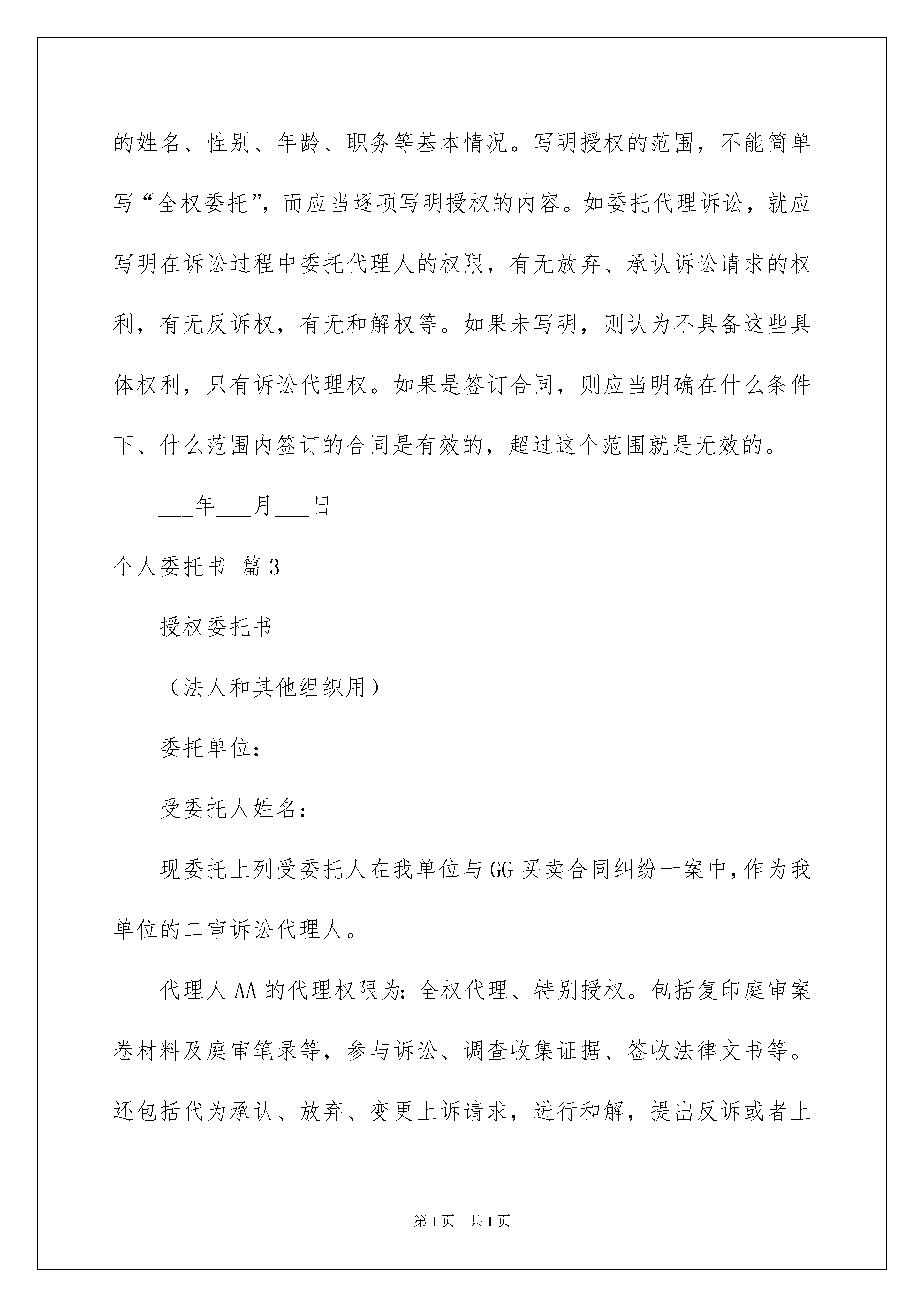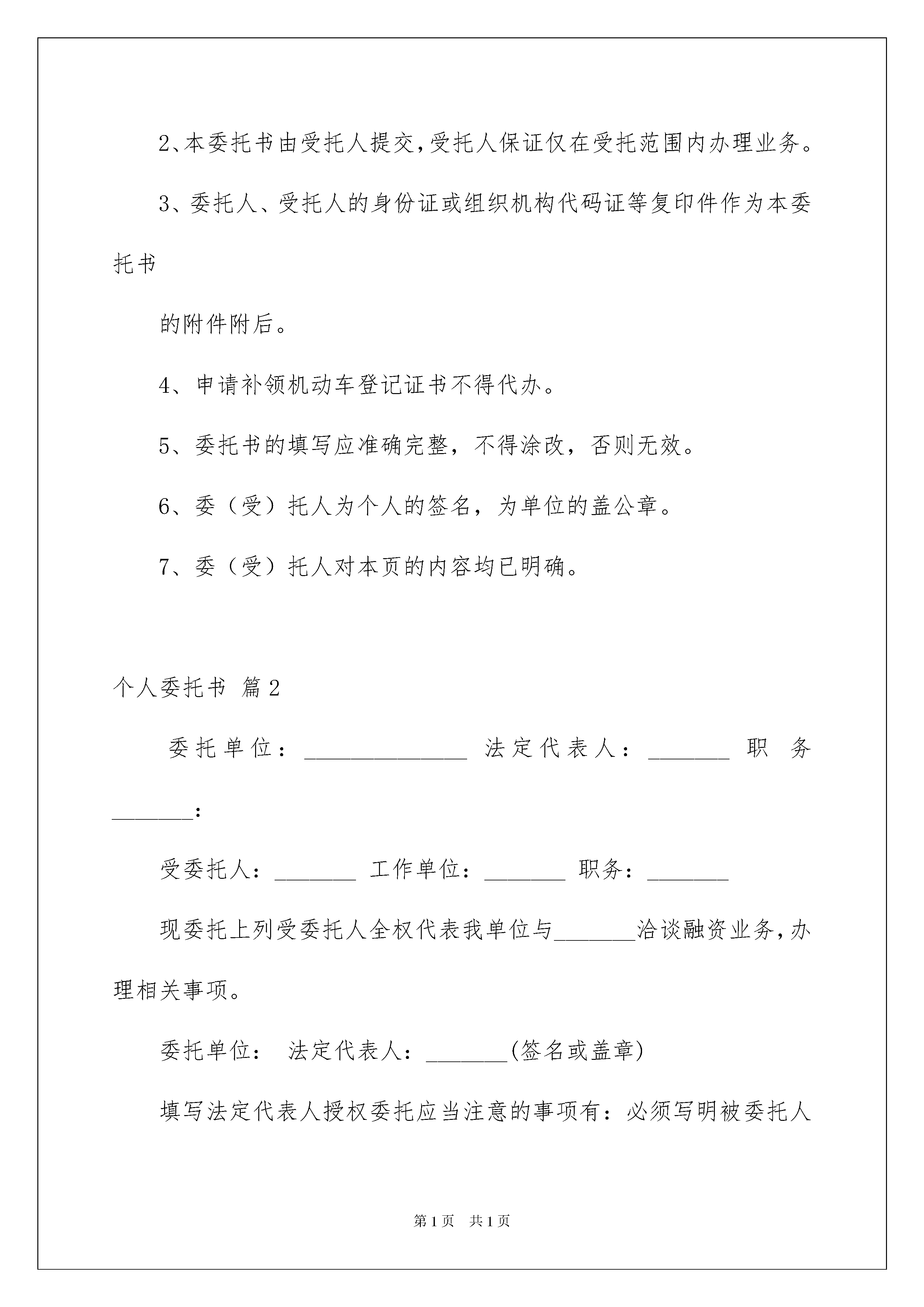 2022实用的个人委托书范文锦集六篇实用的个人委托书范文锦集六篇在委托人的委托书上的合法权益内,委托人不得以任何理由反悔委托事项。在日常生活中,我们在许多事务中都可能会用到委托书,如何写一份恰当的委托书呢?以下是我收集整理的个人委托书7篇,仅供参考,欢迎大家阅读。个人委托书篇1委托书公安局交通警察支队车辆管理所:兹委托办理(号牌号码或车辆识别代号)的机动车的业务,委托人在上述事项内所签署的有关文件资料及提供的手续,均是委托人真实意思表达,本委托人均予以承认并承担相应的法律责任。本委托书自签署之日起天内有效。委托人受托人(签名或盖章):(签名或盖章):日期:年月日注:1、受托人已核实委托人情况,并保证本委托书的真实性。2、本委托书由受托人提交,受托人保证仅在受托范围内办理业务。3、委托人、受托人的身份证或组织机构代码证等复印件作为本委托书的附件附后。4、申请补领机动车登记证书不得代办。5、委托书的填写应准确完整,不得涂改,否则无效。6、委(受)托人为个人的签名,为单位的盖公章。7、委(受)托人对本页的内容均已明确。个人委托书篇2委托单位:______________法定代表人:_______职务_______:受委托人:_______工作单位:_______职务:_______现委托上列受委托人全权代表我单位与_______洽谈融资业务,办理相关事项。委托单位:法定代表人:_______(签名或盖章)填写法定代表人授权委托应当注意的事项有:必须写明被委托人的姓名、性别、年龄、职务等基本情况。写明授权的范围,不能简单写“全权委托”,而应当逐项写明授权的内容。如委托代理诉讼,就应写明在诉讼过程中委托代理人的权限,有无放弃、承认诉讼请求的权利,有无反诉权,有无和解权等。如果未写明,则认为不具备这些具体权利,只有诉讼代理权。如果是签订合同,则应当明确在什么条件下、什么范围内签订的合同是有效的,超过这个范围就是无效的。___年___月___日个人委托书篇3授权委托书(法人和其他组织用)委托单位:受委托人姓名:现委托上列受委托人在我单位与GG买卖合同纠纷一案中,作为我单位的二审诉讼代理人。代理人AA的代理权限为:全权代理、特别授权。包括复印庭审案卷材料及庭审笔录等,参与诉讼、调查收集证据、签收法律文书等。还包括代为承认、放弃、变更上诉请求,进行和解,提出反诉或者上诉。委托单位:法定代表人(负责人):法定代表人身份证明书同志,在我单位任董事长职务,系法定代表人。特此证明。AA公司(盖章)二〇年月日个人委托书篇4甲方(借款人):(按身份证上的顺序填写)身份证号码:乙方(借贷人):(按身份证上的顺序填写)身份证号码:甲乙双方就借款事宜,在平等自愿、协商一致的基础上达成如下协议,以资双方共同遵守。一、乙方贷给甲方人民币(大写),于前交付甲方。二、借款利息_____________________________三、借款期限:四、还款日期和方式:五、违约责任:六、争议解决方式:1,双方协商解决,解决不成,同意提交区人民法院(选择性条款不得违反地域管辖和级别管辖,可以选择原告、被告、标的物、合同签订地、合同履行地)2、提交仲裁委员会仲裁六、本合同自生效。本合同一式两份,双方各执一份,合同文本具有同等法律效力。甲方(签字、盖章):乙方(签字、盖章):合同签订日期合同签订日期甲方(借款人):_____________________身份证号码:_________________________乙方(借贷人):_____________________身份证号码:_________________________个人委托书篇5委托人:身份证号码/营业执照号码:住址:法定代表人:电话:受委托人:企业法人营业执照号码:住址:电话:现委托上列受委托人在我/我单位与融资借贷一事中,作为我/我单位的代理人。委托事项及代理人的代理权限为:1.为委托人提供与融资借贷相关的咨询、媒介服务;2.参与融资借贷双方当事人的沟通、协商,争取促成交易;3.代为接收、审查借款人的借款所需身份证明文件;4.代为接收、查询及审核有关借款人还款能力的相关证明文件;5.代为开展借款人的.资信调查;6.代为办理与融资借贷相关的公证、律师见证手续;7.代为办理与融资借贷相关的其他合法事宜。委托期限至上述委托事项办理完毕之日止。受委托人有转委托权。受委托人在代理权限内所从事的一切代理行为及所签署的一切文件,本人均予以承认并承担由此产生的一切法律后果。委托人(签字或盖章):年月日个人委托书篇6兹委托xxx,男,身份证号码为123456789,办理