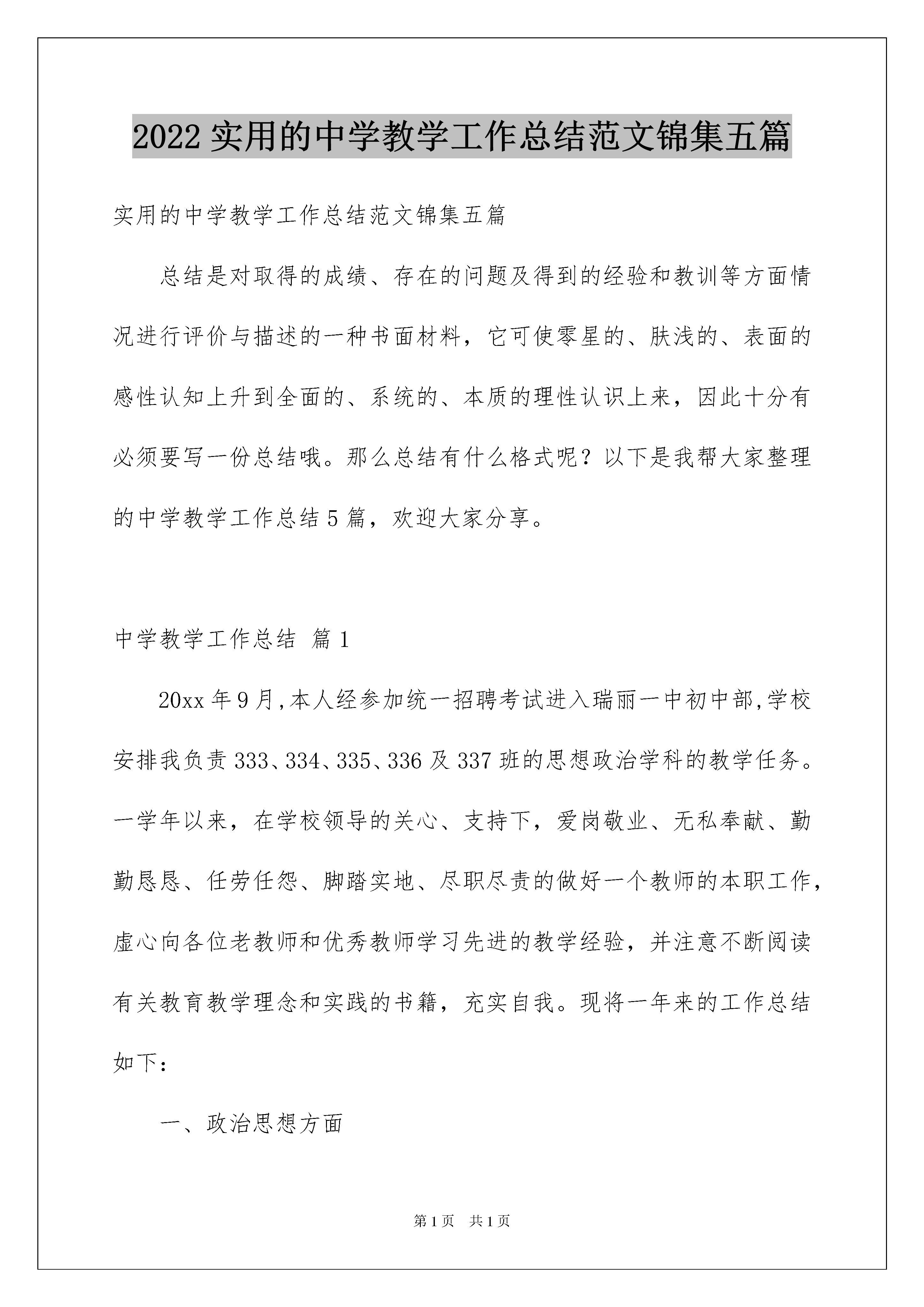 2022实用的中学教学工作总结范文锦集五篇实用的中学教学工作总结范文锦集五篇总结是对取得的成绩、存在的问题及得到的经验和教训等方面情况进行评价与描述的一种书面材料,它可使零星的、肤浅的、表面的感性认知上升到全面的、系统的、本质的理性认识上来,因此十分有必须要写一份总结哦。那么总结有什么格式呢?以下是我帮大家整理的中学教学工作总结5篇,欢迎大家分享。中学教学工作总结篇120xx年9月,本人经参加统一招聘考试进入瑞丽一中初中部,学校安排我负责333、334、335、336及337班的思想政治学科的教学任务。一学年以来,在学校领导的关心、支持下,爱岗敬业、无私奉献、勤勤恳恳、任劳任怨、脚踏实地、尽职尽责的做好一个教师的本职工作,虚心向各位老教师和优秀教师学习先进的教学经验,并注意不断阅读有关教育教学理念和实践的书籍,充实自我。现将一年来的工作总结如下:一、政治思想方面认真学习新的教育理论,及时更新教育理念。积极参加培训,并做了大量的笔记与理论笔记。新的教育形式不允许我们在课堂上重复讲书,我们必须具有先进的教育观念,才能适应教育的发展。所以我不但注重集体的政治理论学习,还注意从书本中汲取营养,认真学习仔细体会新形势下怎样做一名好教师。二、切实做好副班主任工作入校不久,校领导安排我担任337班副班主任,在副班主任工作中,做到认真完成学校布置的各项工作,密切配合班主任开展工作。重视班风、学风的培养,深入了解每个学生的思想动态。严格管理,积极与家长配合,研究教育学生的有效方法。及时发现问题及时处理。担任副班主任工作以来,针对学生常规工作常抓不懈,培养学生养成学习、清洁卫生等良好的习惯,努力创造一个团结向上,富有朝气的班集体,该班在各方面的表现都比较好。三、努力做好教学工作(一)了解情况,明确目标从事教学工作,首先必须了解学生的实际情况,了解他们原有的知识技能的质量,他们的兴趣、需要、方法、习惯,学习新知识可能会有哪些困难,采取相应的预防措施,进行因材施教。在教学之前,根据学校的工作目标和教材的内容,认真细致地研究教材,研究学生掌握知识的方法。通过钻研教学大纲和教材,不断探索,尝试各种教学的方法。对教材的基本思想、基本概念,每句话、每个字都弄清楚,了解教材的结构,重点与难点,掌握知识的逻辑,能运用自如,知道应补充哪些资料,怎样才能教好。通过对教材的分析,制定了切实可行的学期工作计划,为整个学期的思想政治教学工作定下目标和方向,保证了整个教学工作的顺利开展。(二)不断学习,努力提高在教学的过程中,学生是主体,让学生学好知识是老师的职责。由于从事教学工作的时间还不长,教学经验还不足,需要不断的学习提高。通过听课学习、参加教学比赛等活动,吸取相关的教学经验,提高自身的教学水平。通过利用网络资源、各类相关专业的书报杂志了解现代教育的动向,开拓教学视野和思维,努力提高自己的教学水平和业务能力。(三)尊重个性,因材施教在中学思想政治教育中,学生为主体,教师为主导,结合学生的具体情况,因材施教。要尊重孩子不同的生活感受和不同的表现形式,尊重他们的兴趣、需要、方法、习惯方法等等,有意识地以通过各种教学手段,充分调动他们的学习兴趣及学习积极性。使他们形成自己不同的风格,不强求一律,激发学生的创造力。让他们的天性和个性得以自由健康的发挥。让学生在视、听、触觉中培养了创造性思维方式和独立的人格。(四)做好教学工作,处好师生关系组织好课堂教学,关注全体学生,注意信息反馈,调动学生的有意注意,使其保持相对稳定性,同时,激发学生的情感,使他们产生愉悦的心境,创造良好的课堂气氛,课堂语言简洁明了,课堂提问面向全体学生,注意引发学生学数学的兴趣,课堂上讲练结合,布置好家庭作业,作业少而精,减轻学生的负担。做好课后辅导,中学生爱动、好玩,自控能力不强,常在学习上不能按时完成作业,有的学生抄袭作业,针对这种问题,就要抓好学生的思想教育,并使这一工作惯彻到对学生的学习指导中去,还要做好对学生学习的辅导和帮助工作,尤其在后进生的转化上,对后进生努力做到从友善开始,比如,握握他的手,摸摸他的头,或帮助整理衣服。从赞美着手,所有的人都渴望得到别人的理解和尊重,所以,和差生交谈时,对他的处境、想法表示深刻的'理解和尊重,还有在批评学生之前,先谈谈自己工作的不足。良好的师生关系是教学成功的基础。热爱学生,平等的对待每一个学生,让他们都感受到老师的关心,良好的师生关系促进了学生的学习。四、工作考勤方面我热爱自己的事业,从不因为个人的私事耽误工作的时间。并积极运用有效的工作时间做好自己分内的工作。在工作上,我严格要求自己,工作实干,并能完