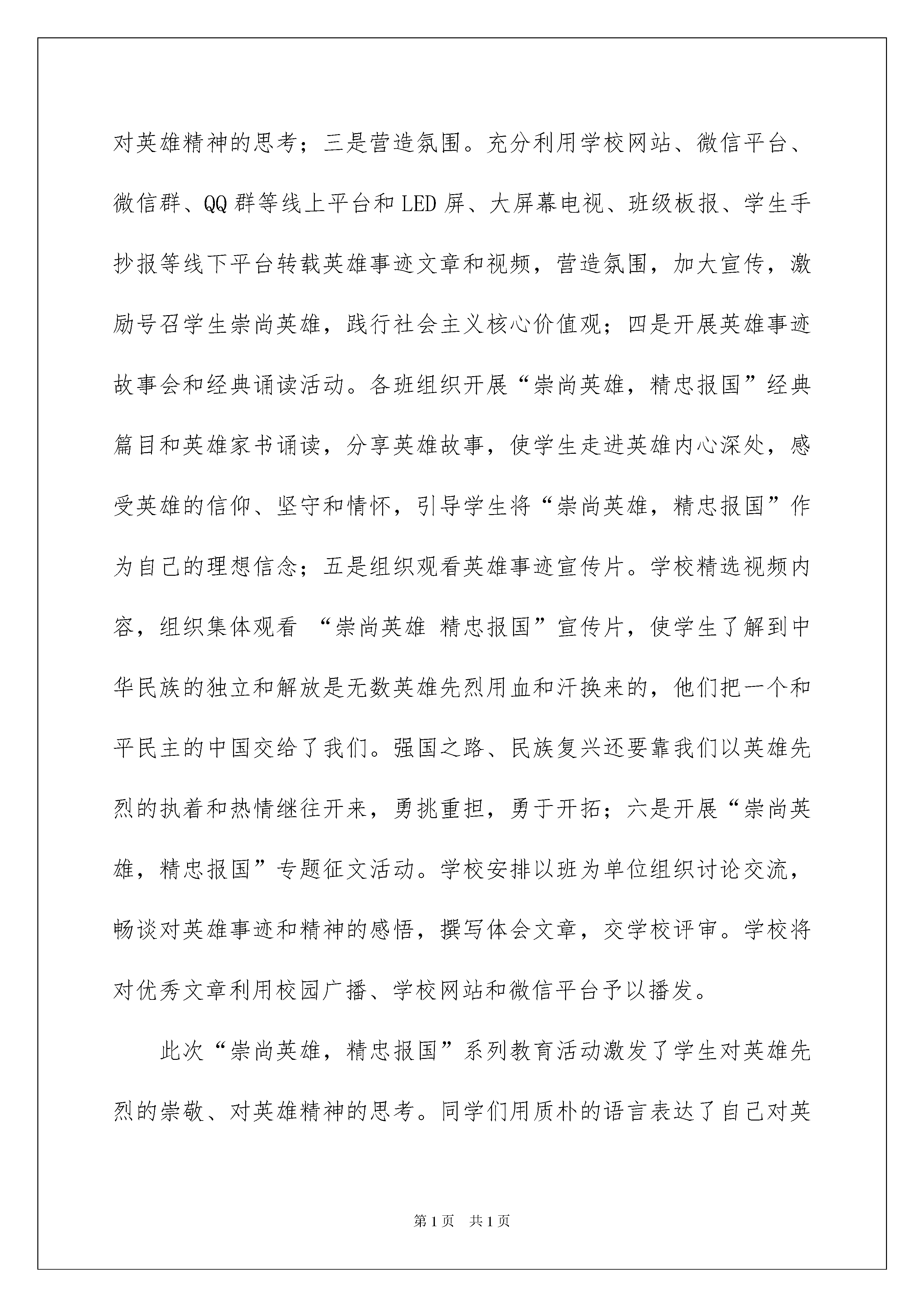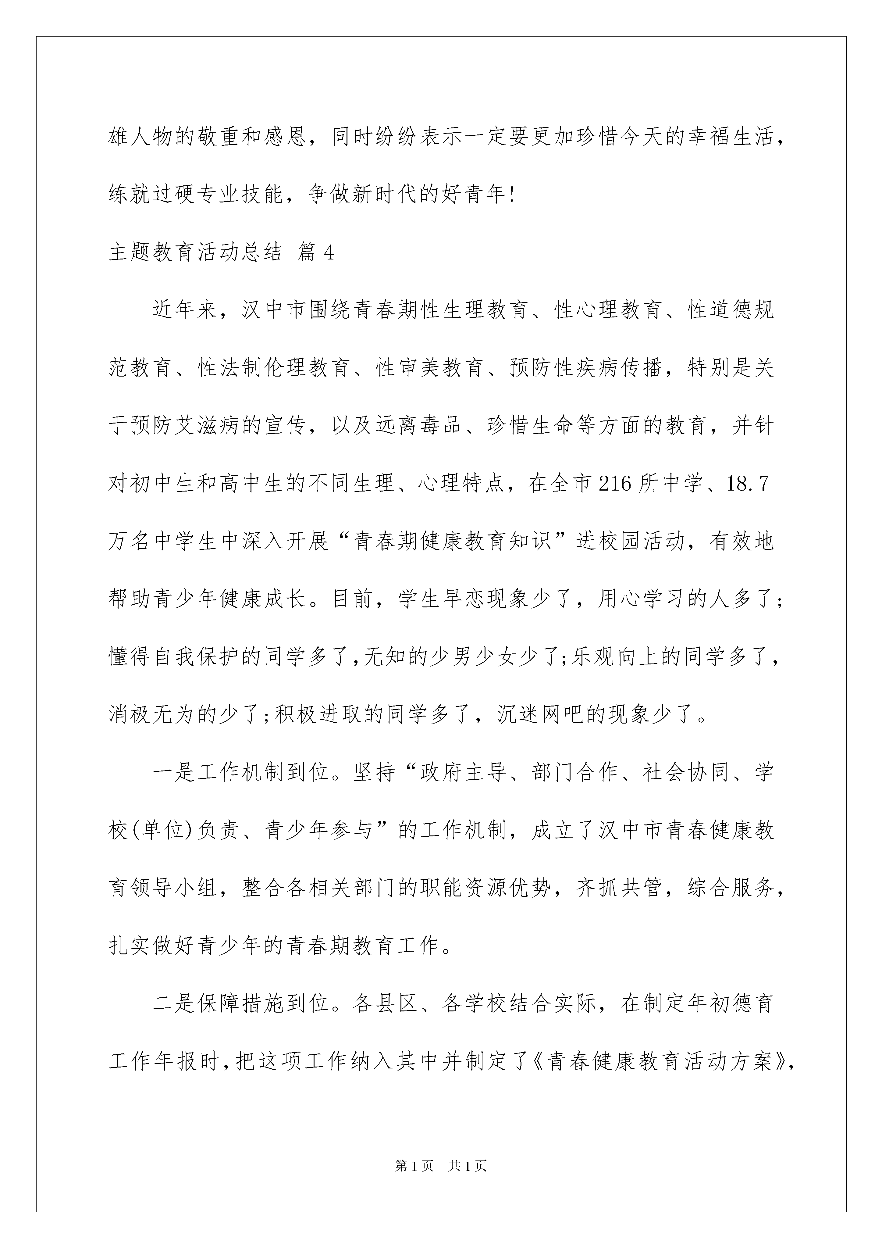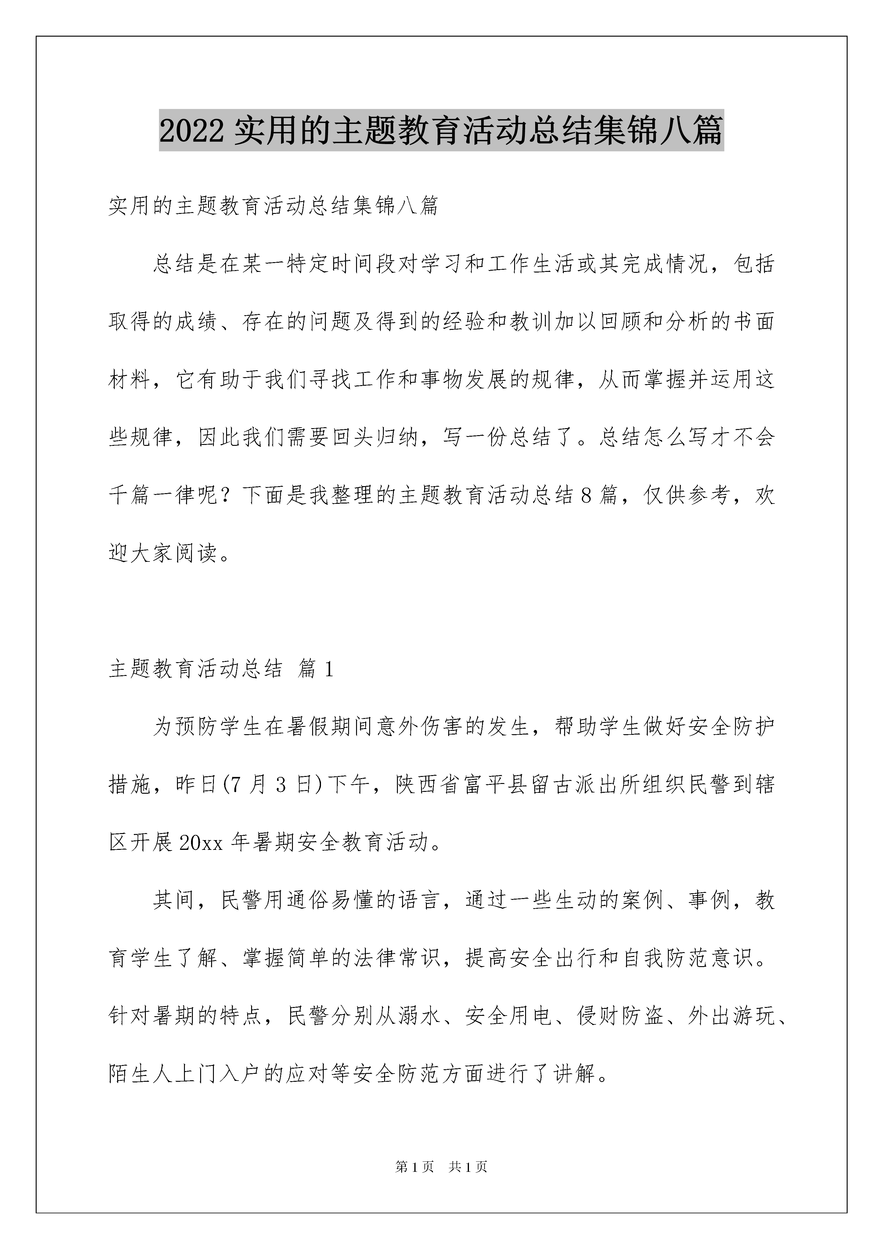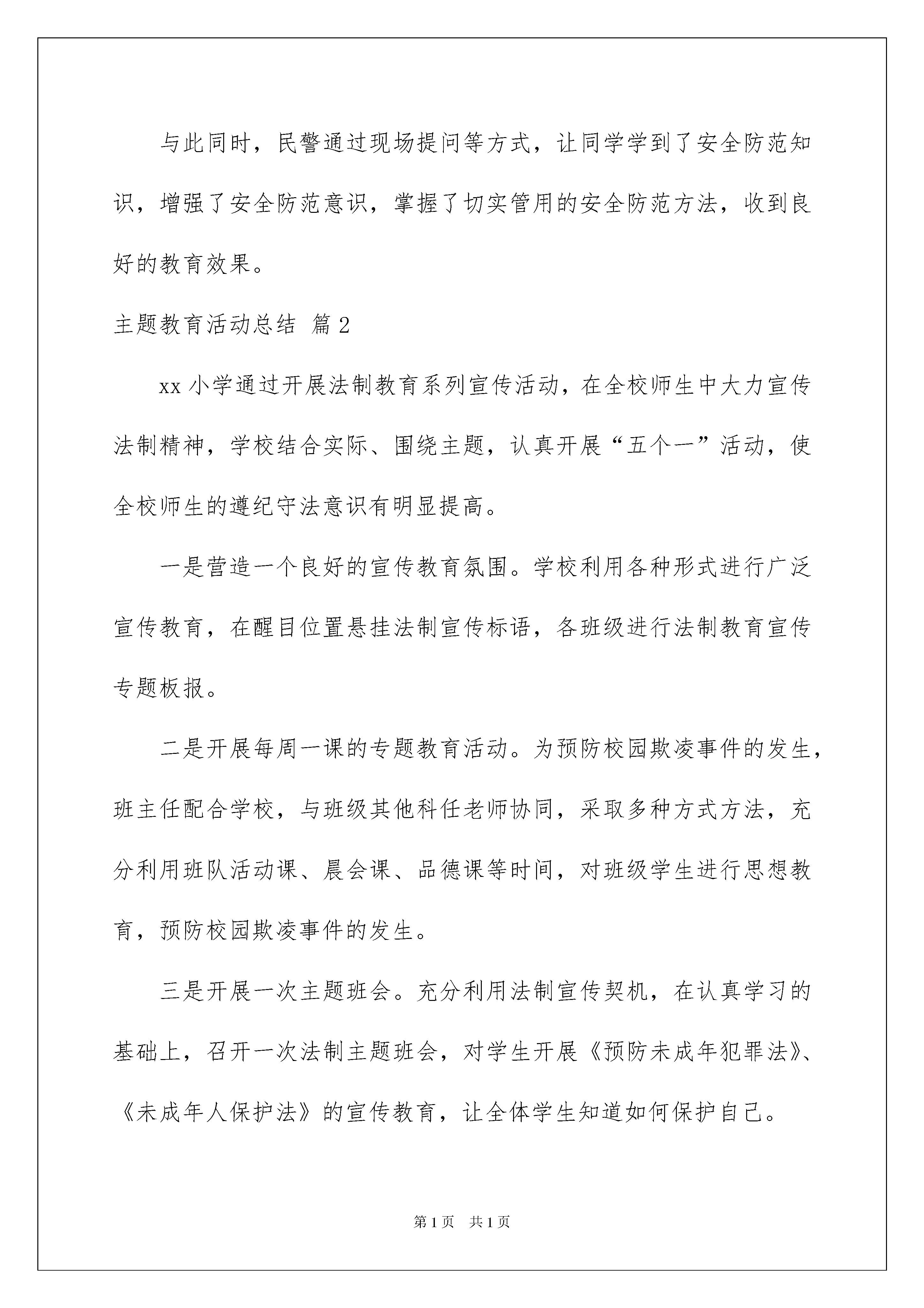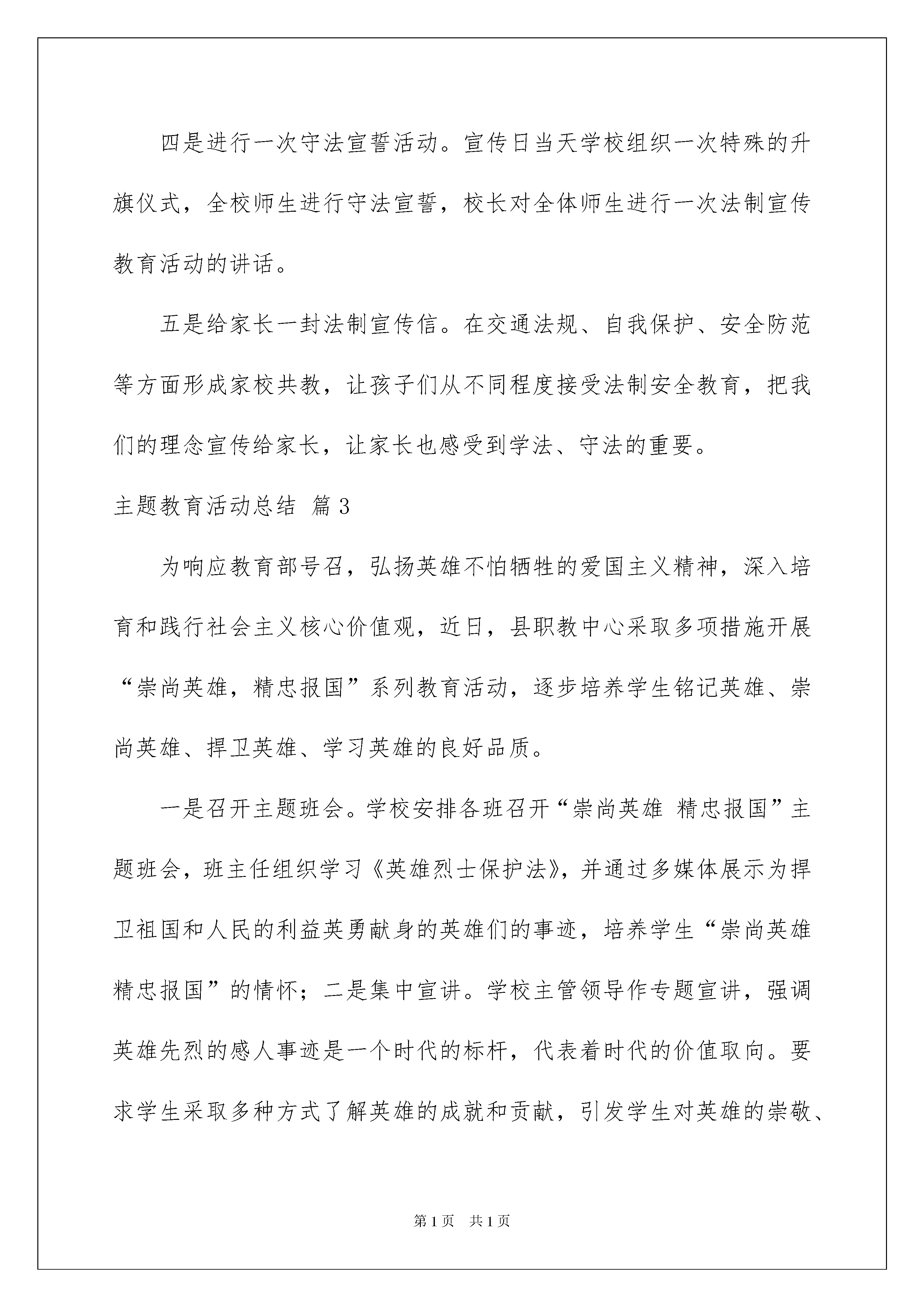 2022实用的主题教育活动总结集锦八篇实用的主题教育活动总结集锦八篇总结是在某一特定时间段对学习和工作生活或其完成情况,包括取得的成绩、存在的问题及得到的经验和教训加以回顾和分析的书面材料,它有助于我们寻找工作和事物发展的规律,从而掌握并运用这些规律,因此我们需要回头归纳,写一份总结了。总结怎么写才不会千篇一律呢?下面是我整理的主题教育活动总结8篇,仅供参考,欢迎大家阅读。主题教育活动总结篇1为预防学生在暑假期间意外伤害的发生,帮助学生做好安全防护措施,昨日(7月3日)下午,陕西省富平县留古派出所组织民警到辖区开展20xx年暑期安全教育活动。其间,民警用通俗易懂的语言,通过一些生动的案例、事例,教育学生了解、掌握简单的法律常识,提高安全出行和自我防范意识。针对暑期的特点,民警分别从溺水、安全用电、侵财防盗、外出游玩、陌生人上门入户的应对等安全防范方面进行了讲解。与此同时,民警通过现场提问等方式,让同学学到了安全防范知识,增强了安全防范意识,掌握了切实管用的安全防范方法,收到良好的教育效果。主题教育活动总结篇2xx小学通过开展法制教育系列宣传活动,在全校师生中大力宣传法制精神,学校结合实际、围绕主题,认真开展“五个一”活动,使全校师生的遵纪守法意识有明显提高。一是营造一个良好的宣传教育氛围。学校利用各种形式进行广泛宣传教育,在醒目位置悬挂法制宣传标语,各班级进行法制教育宣传专题板报。二是开展每周一课的专题教育活动。为预防校园欺凌事件的发生,班主任配合学校,与班级其他科任老师协同,采取多种方式方法,充分利用班队活动课、晨会课、品德课等时间,对班级学生进行思想教育,预防校园欺凌事件的发生。三是开展一次主题班会。充分利用法制宣传契机,在认真学习的基础上,召开一次法制主题班会,对学生开展《预防未成年犯罪法》、《未成年人保护法》的宣传教育,让全体学生知道如何保护自己。四是进行一次守法宣誓活动。宣传日当天学校组织一次特殊的升旗仪式,全校师生进行守法宣誓,校长对全体师生进行一次法制宣传教育活动的讲话。五是给家长一封法制宣传信。在交通法规、自我保护、安全防范等方面形成家校共教,让孩子们从不同程度接受法制安全教育,把我们的理念宣传给家长,让家长也感受到学法、守法的重要。主题教育活动总结篇3为响应教育部号召,弘扬英雄不怕牺牲的爱国主义精神,深入培育和践行社会主义核心价值观,近日,县职教中心采取多项措施开展“崇尚英雄,精忠报国”系列教育活动,逐步培养学生铭记英雄、崇尚英雄、捍卫英雄、学习英雄的良好品质。一是召开主题班会。学校安排各班召开“崇尚英雄精忠报国”主题班会,班主任组织学习《英雄烈士保护法》,并通过多媒体展示为捍卫祖国和人民的利益英勇献身的英雄们的事迹,培养学生“崇尚英雄精忠报国”的情怀;二是集中宣讲。学校主管领导作专题宣讲,强调英雄先烈的感人事迹是一个时代的标杆,代表着时代的价值取向。要求学生采取多种方式了解英雄的成就和贡献,引发学生对英雄的崇敬、对英雄精神的思考;三是营造氛围。充分利用学校网站、微信平台、微信群、QQ群等线上平台和LED屏、大屏幕电视、班级板报、学生手抄报等线下平台转载英雄事迹文章和视频,营造氛围,加大宣传,激励号召学生崇尚英雄,践行社会主义核心价值观;四是开展英雄事迹故事会和经典诵读活动。各班组织开展“崇尚英雄,精忠报国”经典篇目和英雄家书诵读,分享英雄故事,使学生走进英雄内心深处,感受英雄的信仰、坚守和情怀,引导学生将“崇尚英雄,精忠报国”作为自己的理想信念;五是组织观看英雄事迹宣传片。学校精选视频内容,组织集体观看“崇尚英雄精忠报国”宣传片,使学生了解到中华民族的独立和解放是无数英雄先烈用血和汗换来的,他们把一个和平民主的中国交给了我们。强国之路、民族复兴还要靠我们以英雄先烈的执着和热情继往开来,勇挑重担,勇于开拓;六是开展“崇尚英雄,精忠报国”专题征文活动。学校安排以班为单位组织讨论交流,畅谈对英雄事迹和精神的感悟,撰写体会文章,交学校评审。学校将对优秀文章利用校园广播、学校网站和微信平台予以播发。此次“崇尚英雄,精忠报国”系列教育活动激发了学生对英雄先烈的崇敬、对英雄精神的思考。同学们用质朴的语言表达了自己对英雄人物的敬重和感恩,同时纷纷表示一定要更加珍惜今天的幸福生活,练就过硬专业技能,争做新时代的好青年!主题教育活动总结篇4近年来,汉中市围绕青春期性生理教育、性心理教育、性道德规范教育、性法制伦理教育、性审美教育、预防性疾病传播,特别是关于预防艾滋病的宣传,以及远离毒品、珍惜生命等方面的教育,并针对初中生和高中生的不同生理、心理特点,在全市216所中学、1