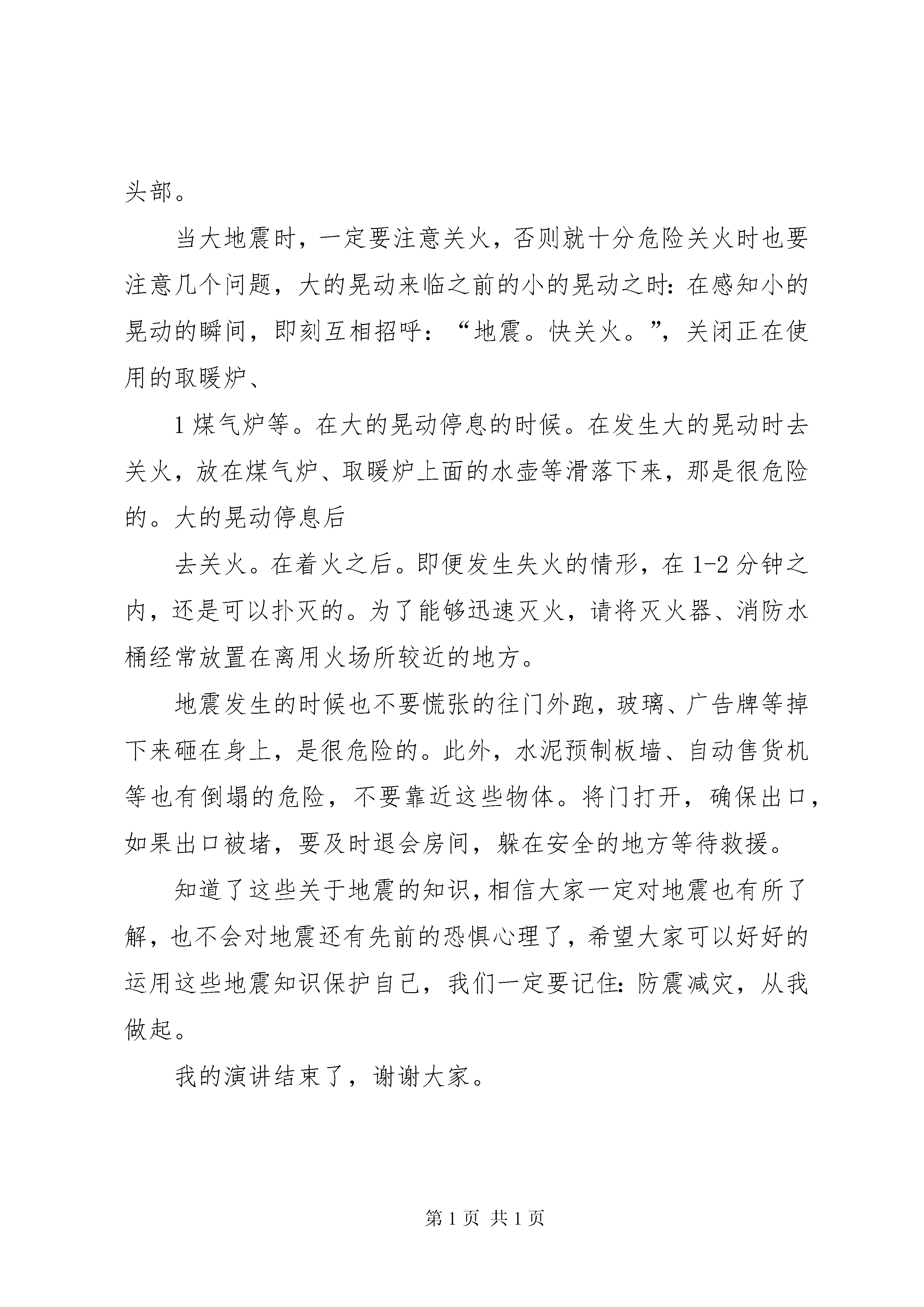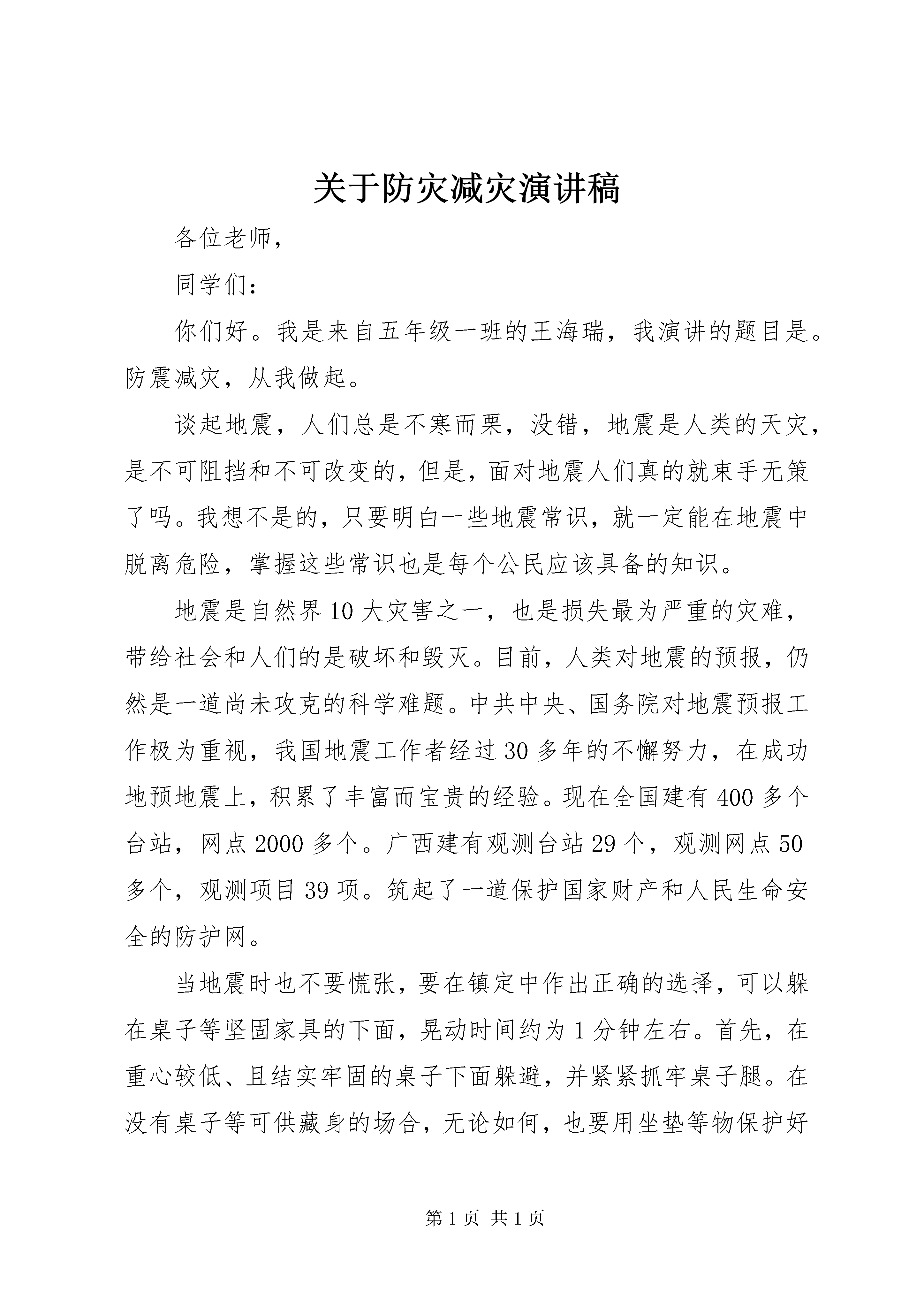 关于防灾减灾演讲稿各位老师,同学们:你们好。我是来自五年级一班的王海瑞,我演讲的题目是。防震减灾,从我做起。谈起地震,人们总是不寒而栗,没错,地震是人类的天灾,是不可阻挡和不可改变的,但是,面对地震人们真的就束手无策了吗。我想不是的,只要明白一些地震常识,就一定能在地震中脱离危险,掌握这些常识也是每个公民应该具备的知识。地震是自然界10大灾害之一,也是损失最为严重的灾难,带给社会和人们的是破坏和毁灭。目前,人类对地震的预报,仍然是一道尚未攻克的科学难题。中共中央、国务院对地震预报工作极为重视,我国地震工作者经过30多年的不懈努力,在成功地预地震上,积累了丰富而宝贵的经验。现在全国建有400多个台站,网点2000多个。广西建有观测台站29个,观测网点50多个,观测项目39项。筑起了一道保护国家财产和人民生命安全的防护网。当地震时也不要慌张,要在镇定中作出正确的选择,可以躲在桌子等坚固家具的下面,晃动时间约为1分钟左右。首先,在重心较低、且结实牢固的桌子下面躲避,并紧紧抓牢桌子腿。在没有桌子等可供藏身的场合,无论如何,也要用坐垫等物保护好头部。当大地震时,一定要注意关火,否则就十分危险关火时也要注意几个问题,大的晃动来临之前的小的晃动之时:在感知小的晃动的瞬间,即刻互相招呼:“地震。快关火。”,关闭正在使用的取暖炉、1煤气炉等。在大的晃动停息的时候。在发生大的晃动时去关火,放在煤气炉、取暖炉上面的水壶等滑落下来,那是很危险的。大的晃动停息后去关火。在着火之后。即便发生失火的情形,在1-2分钟之内,还是可以扑灭的。为了能够迅速灭火,请将灭火器、消防水桶经常放置在离用火场所较近的地方。地震发生的时候也不要慌张的往门外跑,玻璃、广告牌等掉下来砸在身上,是很危险的。此外,水泥预制板墙、自动售货机等也有倒塌的危险,不要靠近这些物体。将门打开,确保出口,如果出口被堵,要及时退会房间,躲在安全的地方等待救援。知道了这些关于地震的知识,相信大家一定对地震也有所了解,也不会对地震还有先前的恐惧心理了,希望大家可以好好的运用这些地震知识保护自己,我们一定要记住:防震减灾,从我做起。我的演讲结束了,谢谢大家。