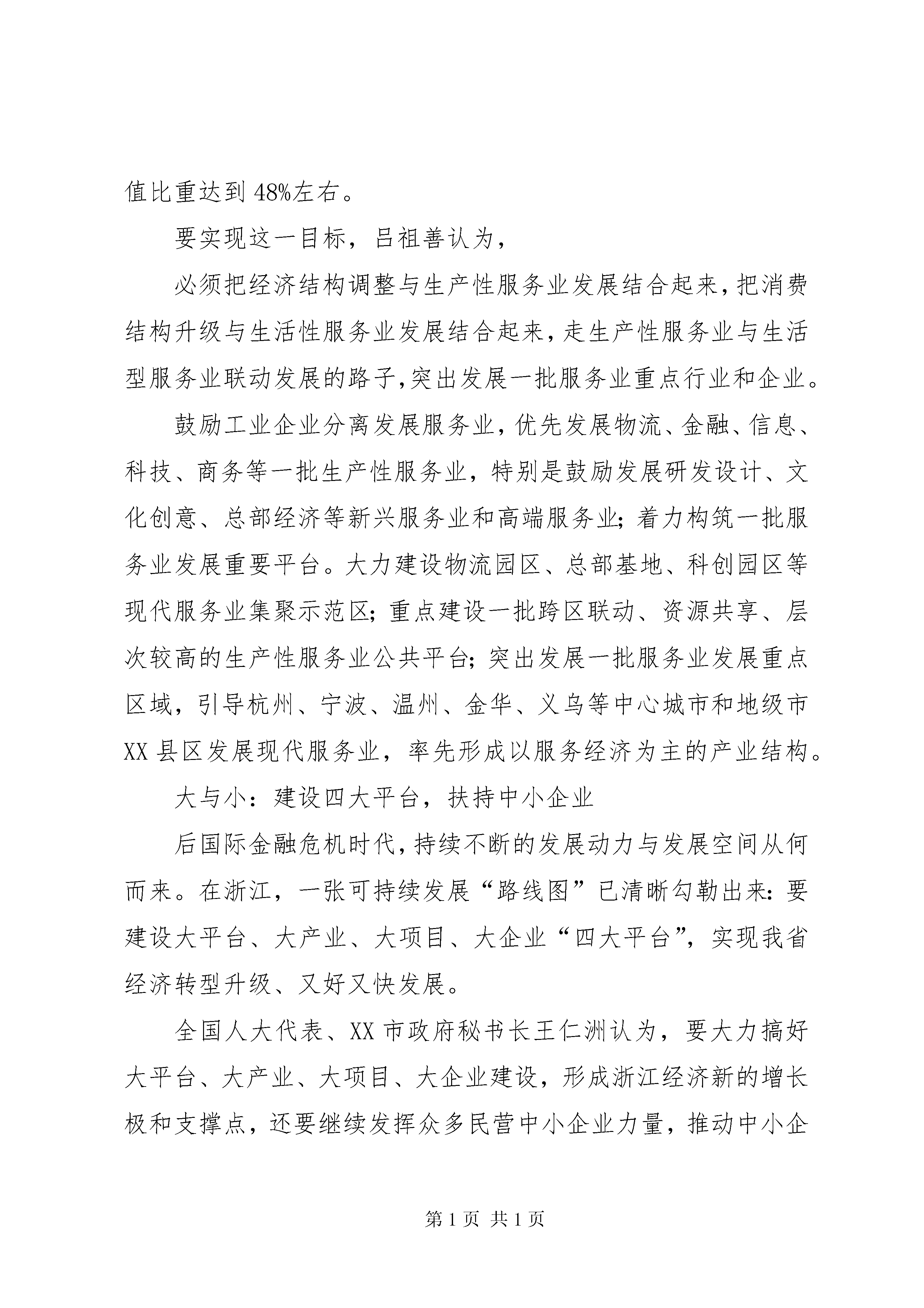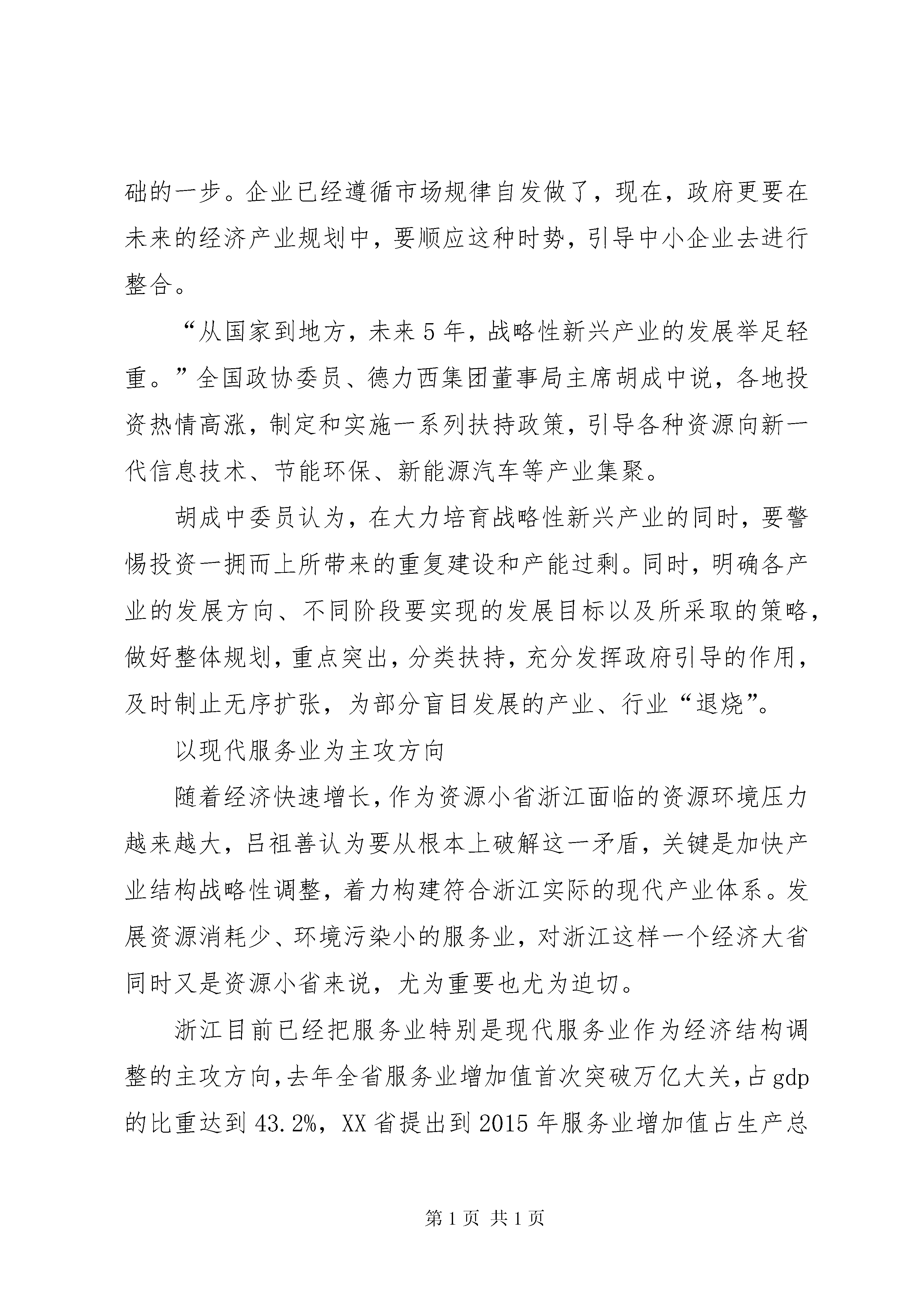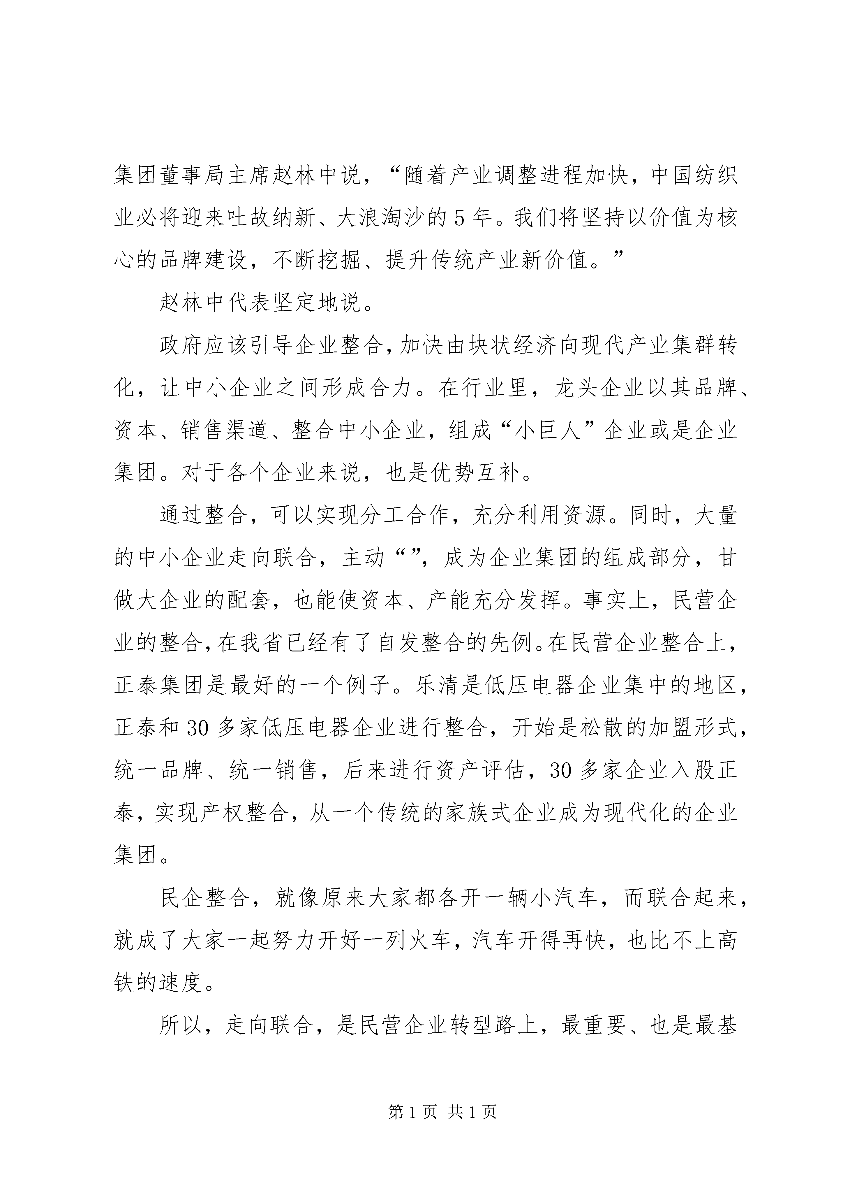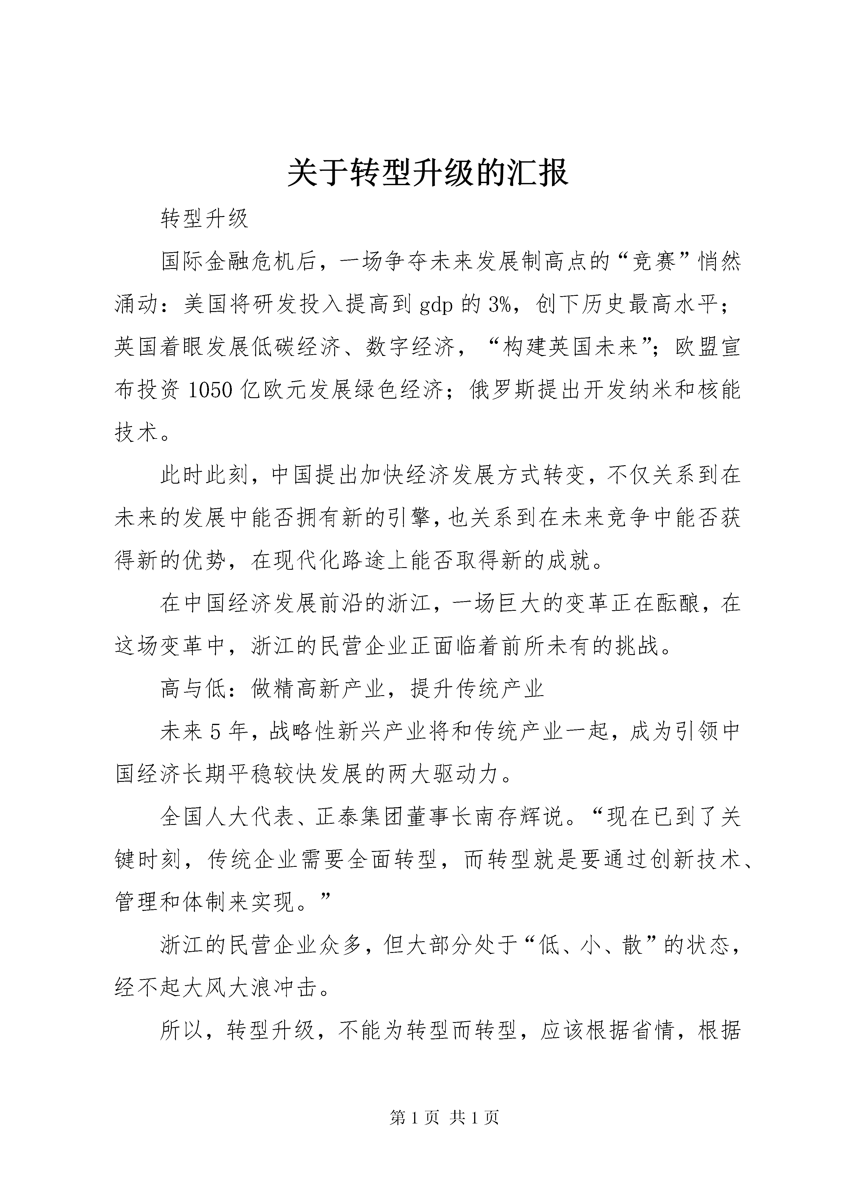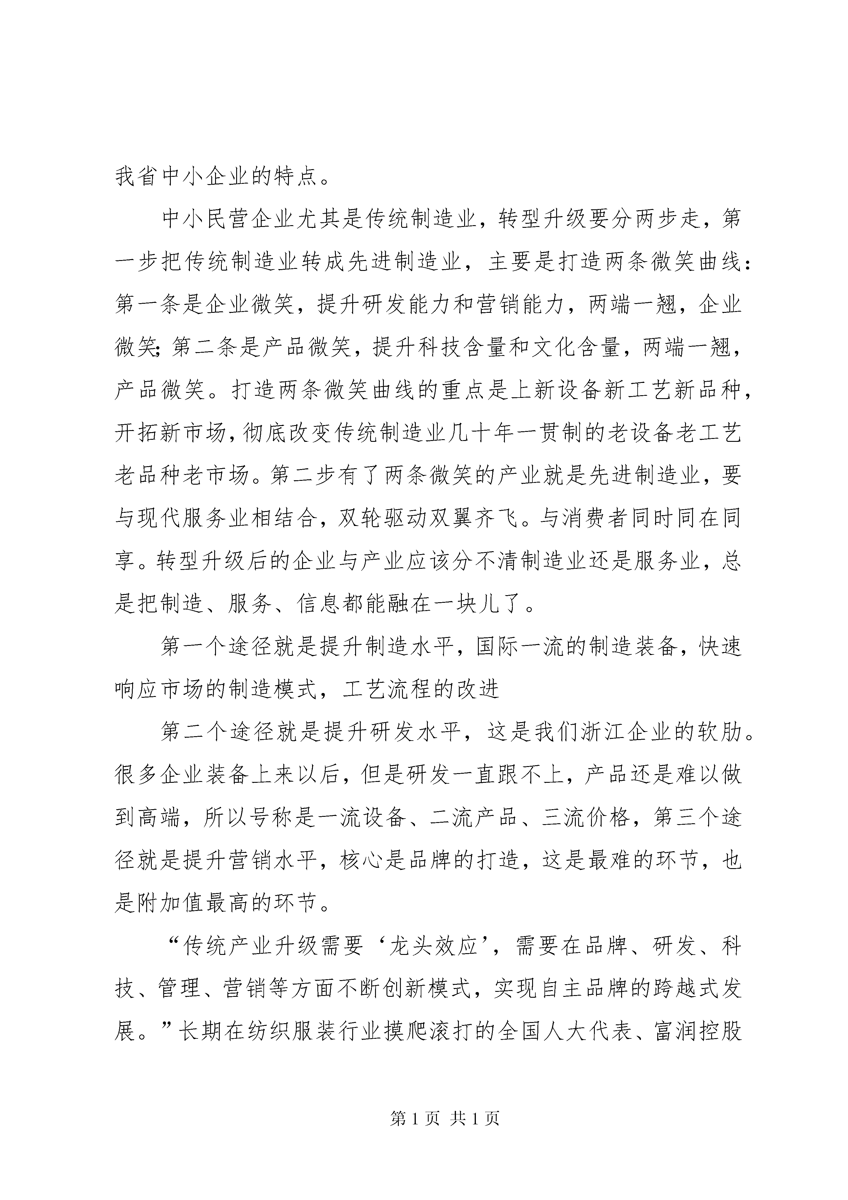 关于转型升级的汇报转型升级国际金融危机后,一场争夺未来发展制高点的“竞赛”悄然涌动:美国将研发投入提高到gdp的3%,创下历史最高水平;英国着眼发展低碳经济、数字经济,“构建英国未来”;欧盟宣布投资1050亿欧元发展绿色经济;俄罗斯提出开发纳米和核能技术。此时此刻,中国提出加快经济发展方式转变,不仅关系到在未来的发展中能否拥有新的引擎,也关系到在未来竞争中能否获得新的优势,在现代化路途上能否取得新的成就。在中国经济发展前沿的浙江,一场巨大的变革正在酝酿,在这场变革中,浙江的民营企业正面临着前所未有的挑战。高与低:做精高新产业,提升传统产业未来5年,战略性新兴产业将和传统产业一起,成为引领中国经济长期平稳较快发展的两大驱动力。全国人大代表、正泰集团董事长南存辉说。“现在已到了关键时刻,传统企业需要全面转型,而转型就是要通过创新技术、管理和体制来实现。”浙江的民营企业众多,但大部分处于“低、小、散”的状态,经不起大风大浪冲击。所以,转型升级,不能为转型而转型,应该根据省情,根据我省中小企业的特点。中小民营企业尤其是传统制造业,转型升级要分两步走,第一步把传统制造业转成先进制造业,主要是打造两条微笑曲线:第一条是企业微笑,提升研发能力和营销能力,两端一翘,企业微笑;第二条是产品微笑,提升科技含量和文化含量,两端一翘,产品微笑。打造两条微笑曲线的重点是上新设备新工艺新品种,开拓新市场,彻底改变传统制造业几十年一贯制的老设备老工艺老品种老市场。第二步有了两条微笑的产业就是先进制造业,要与现代服务业相结合,双轮驱动双翼齐飞。与消费者同时同在同享。转型升级后的企业与产业应该分不清制造业还是服务业,总是把制造、服务、信息都能融在一块儿了。第一个途径就是提升制造水平,国际一流的制造装备,快速响应市场的制造模式,工艺流程的改进第二个途径就是提升研发水平,这是我们浙江企业的软肋。很多企业装备上来以后,但是研发一直跟不上,产品还是难以做到高端,所以号称是一流设备、二流产品、三流价格,第三个途径就是提升营销水平,核心是品牌的打造,这是最难的环节,也是附加值最高的环节。“传统产业升级需要‘龙头效应’,需要在品牌、研发、科技、管理、营销等方面不断创新模式,实现自主品牌的跨越式发展。”长期在纺织服装行业摸爬滚打的全国人大代表、富润控股集团董事局主席赵林中说,“随着产业调整进程加快,中国纺织业必将迎来吐故纳新、大浪淘沙的5年。我们将坚持以价值为核心的品牌建设,不断挖掘、提升传统产业新价值。”赵林中代表坚定地说。政府应该引导企业整合,加快由块状经济向现代产业集群转化,让中小企业之间形成合力。在行业里,龙头企业以其品牌、资本、销售渠道、整合中小企业,组成“小巨人”企业或是企业集团。对于各个企业来说,也是优势互补。通过整合,可以实现分工合作,充分利用资源。同时,大量的中小企业走向联合,主动“”,成为企业集团的组成部分,甘做大企业的配套,也能使资本、产能充分发挥。事实上,民营企业的整合,在我省已经有了自发整合的先例。在民营企业整合上,正泰集团是最好的一个例子。乐清是低压电器企业集中的地区,正泰和30多家低压电器企业进行整合,开始是松散的加盟形式,统一品牌、统一销售,后来进行资产评估,30多家企业入股正泰,实现产权整合,从一个传统的家族式企业成为现代化的企业集团。民企整合,就像原来大家都各开一辆小汽车,而联合起来,就成了大家一起努力开好一列火车,汽车开得再快,也比不上高铁的速度。所以,走向联合,是民营企业转型路上,最重要、也是最基础的一步。企业已经遵循市场规律自发做了,现在,政府更要在未来的经济产业规划中,要顺应这种时势,引导中小企业去进行整合。“从国家到地方,未来5年,战略性新兴产业的发展举足轻重。”全国政协委员、德力西集团董事局主席胡成中说,各地投资热情高涨,制定和实施一系列扶持政策,引导各种资源向新一代信息技术、节能环保、新能源汽车等产业集聚。胡成中委员认为,在大力培育战略性新兴产业的同时,要警惕投资一拥而上所带来的重复建设和产能过剩。同时,明确各产业的发展方向、不同阶段要实现的发展目标以及所采取的策略,做好整体规划,重点突出,分类扶持,充分发挥政府引导的作用,及时制止无序扩张,为部分盲目发展的产业、行业“退烧”。以现代服务业为主攻方向随着经济快速增长,作为资源小省浙江面临的资源环境压力越来越大,吕祖善认为要从根本上破解这一矛盾,关键是加快产业结构战略性调整,着力构建符合浙江实际的现代产业体系。发展资源消耗少、环境污染小的服务业,对浙江这样一个经济大省同时又是资源小省来说,尤为重要也尤为迫切。浙江目前已经把服务业特别是现代服务业作为经济结构调整的主攻方向,去年全省服务业增加值首次突破万亿大关,占gdp的比重达到43.2%,XX省提出到20