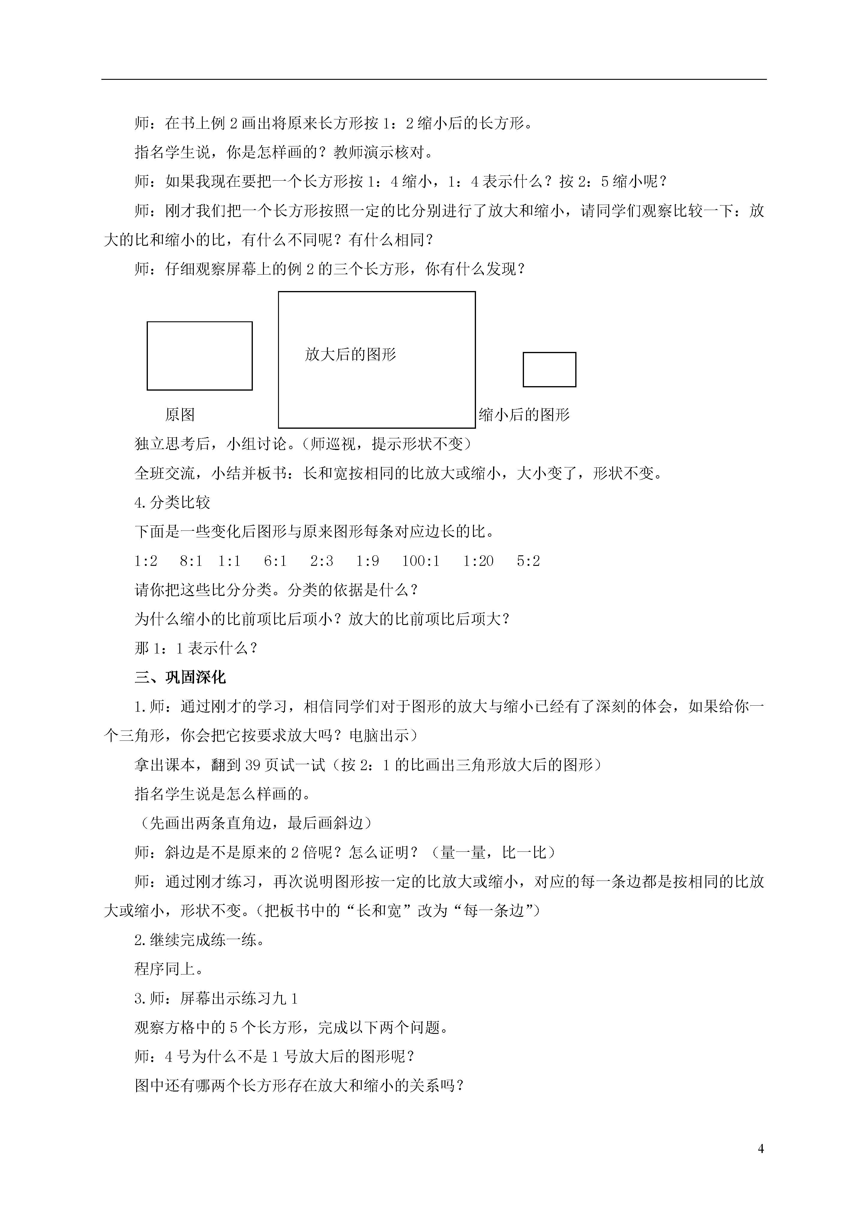 4(苏教版)六年级数学下册教案图形的放大与缩小11教学内容苏教版《义务教育课程标准实验教科书数学》六年级下册P38、39“练一练”和练习九的第1、2题。教学目标1.结合具体情境,学生在自主探索、合作交流中,初步理解图形放大和缩小的含义。2.能利用方格纸按一定的比将简单图形放大或缩小,3.学生在观察、抽象、猜想、验证等数学活动中,初步体会图形的相似,进一步发展空间观念。教学过程一、情境引入1.出示刘翔照片这是谁?后面的同学看得清楚吗?那我把它变得大一些。2.出示三张放大后的图和原图相比你觉得哪一张比较好?为什么?图一原图图三图二师:图2和原图相比变大了,但形状不变,在数学上我们称之放大。师板书:图形的放大3.图形的放大有什么特点,要注意哪些问题呢?这节课我们就来研究这些问题。二、操作探究1.观察比较,发现规律(将两张图像去掉画面变成长方形,并标上长和宽的长度)12厘米6厘米16厘米8厘米师:为了便于从数学角度研究,我们把照片隐去,并标上数据。(指课件)这张是原来的长方形图,这张是放大后的长方形图,请同学们仔细观察比较:放大后的长方形与原来的长方形有什么关系?先独立思考,然后和同桌交流。交流总结,板书:放大后原来长2︰1宽2︰1师:观察板书,你有什么发现?(都是2︰1)师:2︰1表示哪两个数量的比呢?(请学生上去指一指引出对应边)师引导小结:放大后的长方形与原来长方形对应边的比是2︰1(电脑)问:这里的“对应边”是什么意思?师:当放大后的长方形与原来的长方形对应边的比是2︰1时,我们就说把长方形按2︰1的比放大了。(课件出示)出示原图和按3︰1放大后的图,观察这两幅图,你发现什么?得出:放大后的长方形与原来的长方形对应边的比是3︰1,也就是把长方形按3︰1的比放大了。出示原图和按3︰2放大后的图,观察这两幅图,你又能发现什么?得出:放大后的长方形与原来的长方形对应边的比是3︰2,也就是把长方形按3︰2的比放大了。出示刘翔照片图师:刚才我们发现图2是把原图按2︰1的比放大了,那么图1和图3呢?你发现什么?(长和宽按相同的比放大形状不变)2.尝试操作,加深理解。(1)想自己试试放大一个图形吗?出示例2(按3:1的比画出长方形放大后的图形)“3:1”是指什么?学生在书上例2画一画,指名说怎么样画的,集体核对,师演示。(指出:为了便于操作,可以标出格子数)(2)刚才我们一起研究了图形放大的特点,谁来说说看图形放大时要注意哪些问题呢?3.类推图形缩小的含义师:图形有放大,那就会有缩小。(板书)师:如果要把原来这个长方形按1:2的比缩小,缩小后的长方形会有什么变化呢?同桌交流后,指名学生说一说,注意语言表述的完整性。师:1:2表示哪两个数量的比呢?师:在书上例2画出将原来长方形按1:2缩小后的长方形。指名学生说,你是怎样画的?教师演示核对。师:如果我现在要把一个长方形按1:4缩小,1:4表示什么?按2:5缩小呢?师:刚才我们把一个长方形按照一定的比分别进行了放大和缩小,请同学们观察比较一下:放大的比和缩小的比,有什么不同呢?有什么相同?师:仔细观察屏幕上的例2的三个长方形,你有什么发现?放大后的图形原图原图缩小后的图形独立思考后,小组讨论。(师巡视,提示形状不变)全班交流,小结并板书:长和宽按相同的比放大或缩小,大小变了,形状不变。4.分类比较下面是一些变化后图形与原来图形每条对应边长的比。1:28:11:16:12:31:9100:11:205:2请你把这些比分分类。分类的依据是什么?为什么缩小的比前项比后项小?放大的比前项比后项大?那1:1表示什么?三、巩固深化1.师:通过刚才的学习,相信同学们对于图形的放大与缩小已经有了深刻的体会,如果给你一个三角形,你会把它按要求放大吗?电脑出示)拿出课本,翻到39页试一试(按2:1的比画出三角形放大后的图形)指名学生说是怎么样画的。(先画出两条直角边,最后画斜边)师:斜边是不是原来的2倍呢?怎么证明?(量一量,比一比)师:通过刚才练习,再次说明图形按一定的比放大或缩小,对应的每一条边都是按相同的比放大或缩小,形状不变。(把板书中的“长和宽”改为“每一条边”)2.继续完成练一练。程序同上。3.师:屏幕出示练习九1观察方格中的5个长方形,完成以下两个问题。师:4号为什么不是1号放大后的图形呢?图中还有哪两个长方形存在放大和缩小的关系吗?四、总结全课,拓展延伸。这节课我们学习了图形的放大与缩小,你有哪些收获和体会呢?拓展延伸:图形的放大与缩小在我们日常