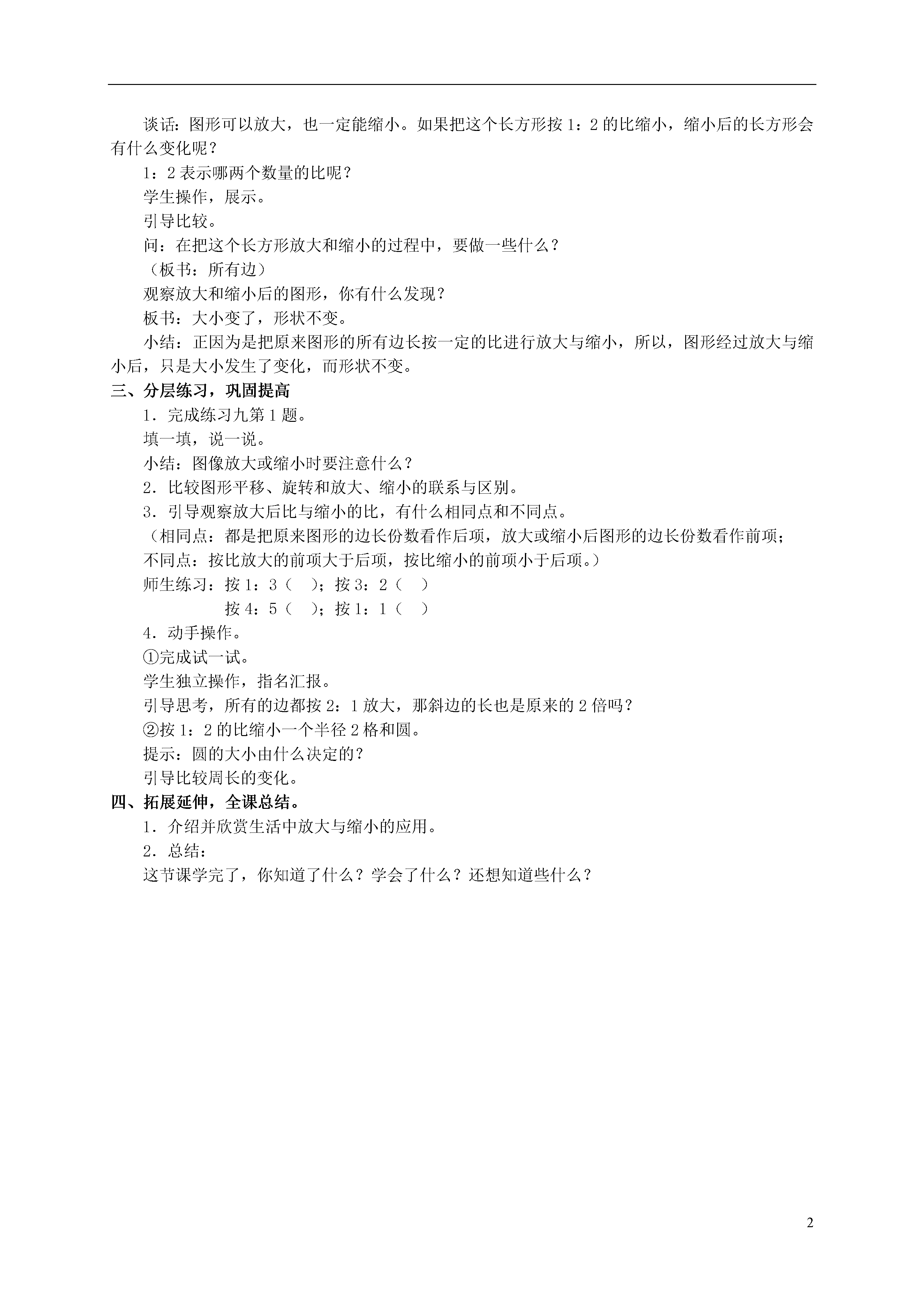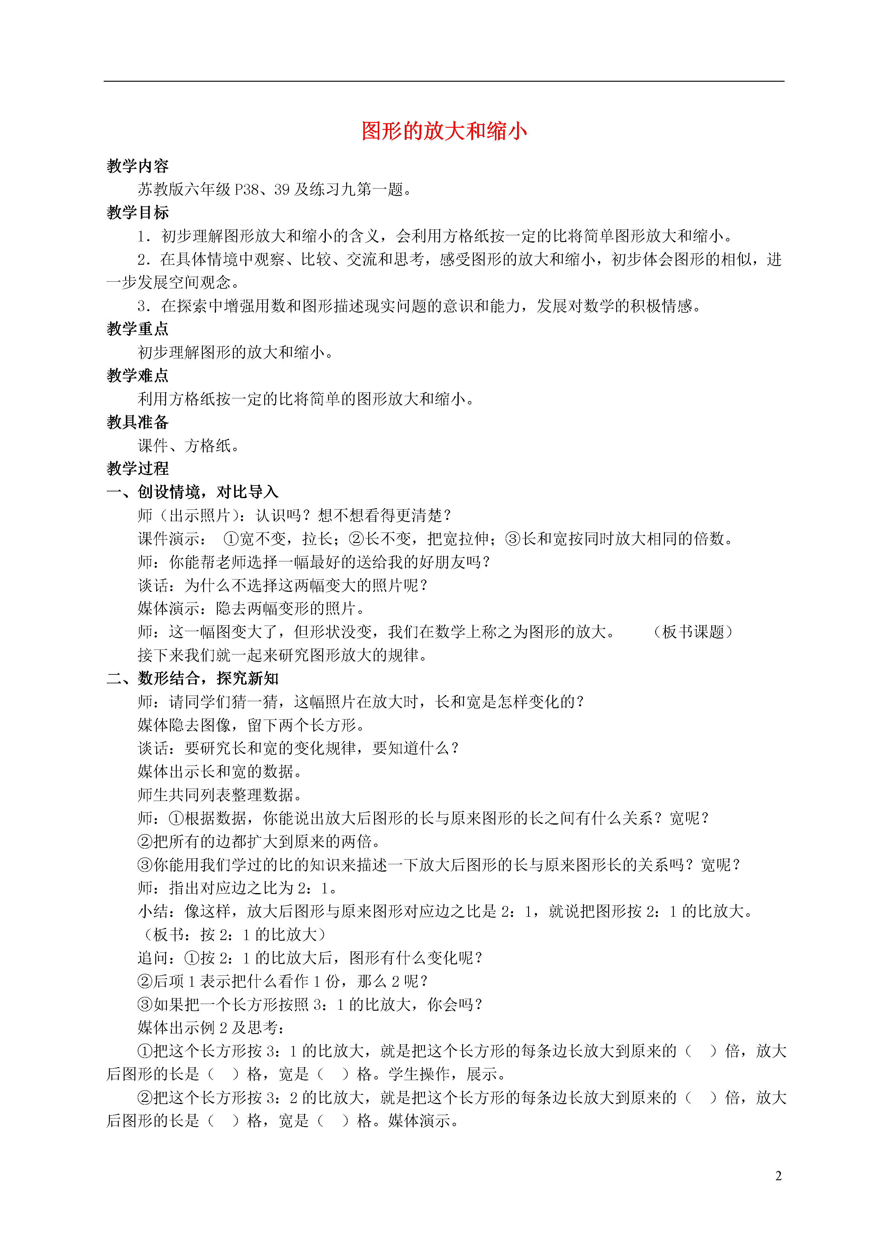 2图形的放大和缩小教学内容苏教版六年级P38、39及练习九第一题。教学目标1.初步理解图形放大和缩小的含义,会利用方格纸按一定的比将简单图形放大和缩小。2.在具体情境中观察、比较、交流和思考,感受图形的放大和缩小,初步体会图形的相似,进一步发展空间观念。3.在探索中增强用数和图形描述现实问题的意识和能力,发展对数学的积极情感。教学重点初步理解图形的放大和缩小。教学难点利用方格纸按一定的比将简单的图形放大和缩小。教具准备课件、方格纸。教学过程一、创设情境,对比导入师(出示照片):认识吗?想不想看得更清楚?课件演示:①宽不变,拉长;②长不变,把宽拉伸;③长和宽按同时放大相同的倍数。师:你能帮老师选择一幅最好的送给我的好朋友吗?谈话:为什么不选择这两幅变大的照片呢?媒体演示:隐去两幅变形的照片。师:这一幅图变大了,但形状没变,我们在数学上称之为图形的放大。(板书课题)接下来我们就一起来研究图形放大的规律。二、数形结合,探究新知师:请同学们猜一猜,这幅照片在放大时,长和宽是怎样变化的?媒体隐去图像,留下两个长方形。谈话:要研究长和宽的变化规律,要知道什么?媒体出示长和宽的数据。师生共同列表整理数据。师:①根据数据,你能说出放大后图形的长与原来图形的长之间有什么关系?宽呢?②把所有的边都扩大到原来的两倍。③你能用我们学过的比的知识来描述一下放大后图形的长与原来图形长的关系吗?宽呢?师:指出对应边之比为2:1。小结:像这样,放大后图形与原来图形对应边之比是2:1,就说把图形按2:1的比放大。(板书:按2:1的比放大)追问:①按2:1的比放大后,图形有什么变化呢?②后项1表示把什么看作1份,那么2呢?③如果把一个长方形按照3:1的比放大,你会吗?媒体出示例2及思考:①把这个长方形按3:1的比放大,就是把这个长方形的每条边长放大到原来的()倍,放大后图形的长是()格,宽是()格。学生操作,展示。②把这个长方形按3:2的比放大,就是把这个长方形的每条边长放大到原来的()倍,放大后图形的长是()格,宽是()格。媒体演示。谈话:图形可以放大,也一定能缩小。如果把这个长方形按1:2的比缩小,缩小后的长方形会有什么变化呢?1:2表示哪两个数量的比呢?学生操作,展示。引导比较。问:在把这个长方形放大和缩小的过程中,要做一些什么?(板书:所有边)观察放大和缩小后的图形,你有什么发现?板书:大小变了,形状不变。小结:正因为是把原来图形的所有边长按一定的比进行放大与缩小,所以,图形经过放大与缩小后,只是大小发生了变化,而形状不变。三、分层练习,巩固提高1.完成练习九第1题。填一填,说一说。小结:图像放大或缩小时要注意什么?2.比较图形平移、旋转和放大、缩小的联系与区别。3.引导观察放大后比与缩小的比,有什么相同点和不同点。(相同点:都是把原来图形的边长份数看作后项,放大或缩小后图形的边长份数看作前项;不同点:按比放大的前项大于后项,按比缩小的前项小于后项。)师生练习:按1:3();按3:2()按4:5();按1:1()4.动手操作。①完成试一试。学生独立操作,指名汇报。引导思考,所有的边都按2:1放大,那斜边的长也是原来的2倍吗?②按1:2的比缩小一个半径2格和圆。提示:圆的大小由什么决定的?引导比较周长的变化。四、拓展延伸,全课总结。1.介绍并欣赏生活中放大与缩小的应用。2.总结:这节课学完了,你知道了什么?学会了什么?还想知道些什么?