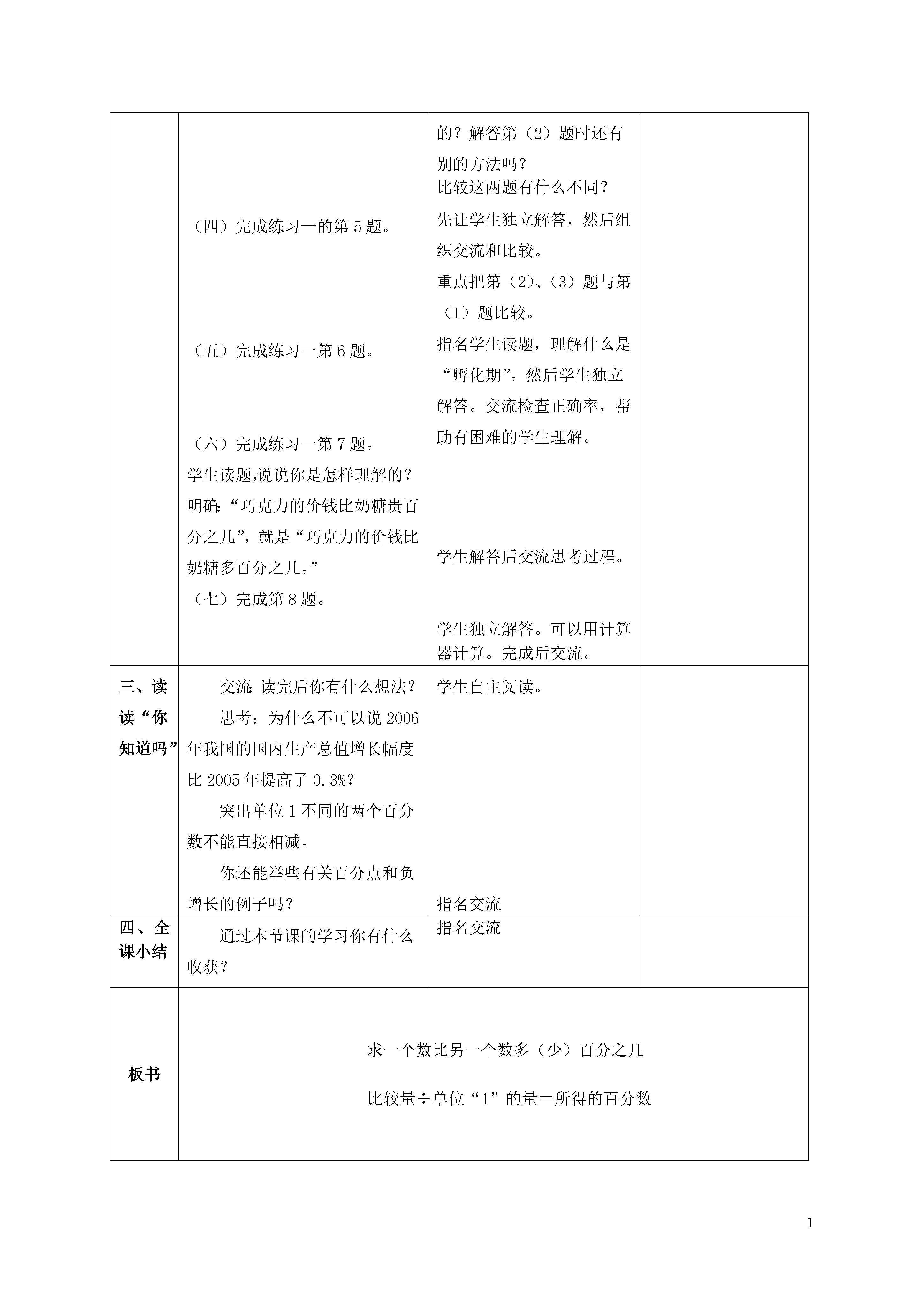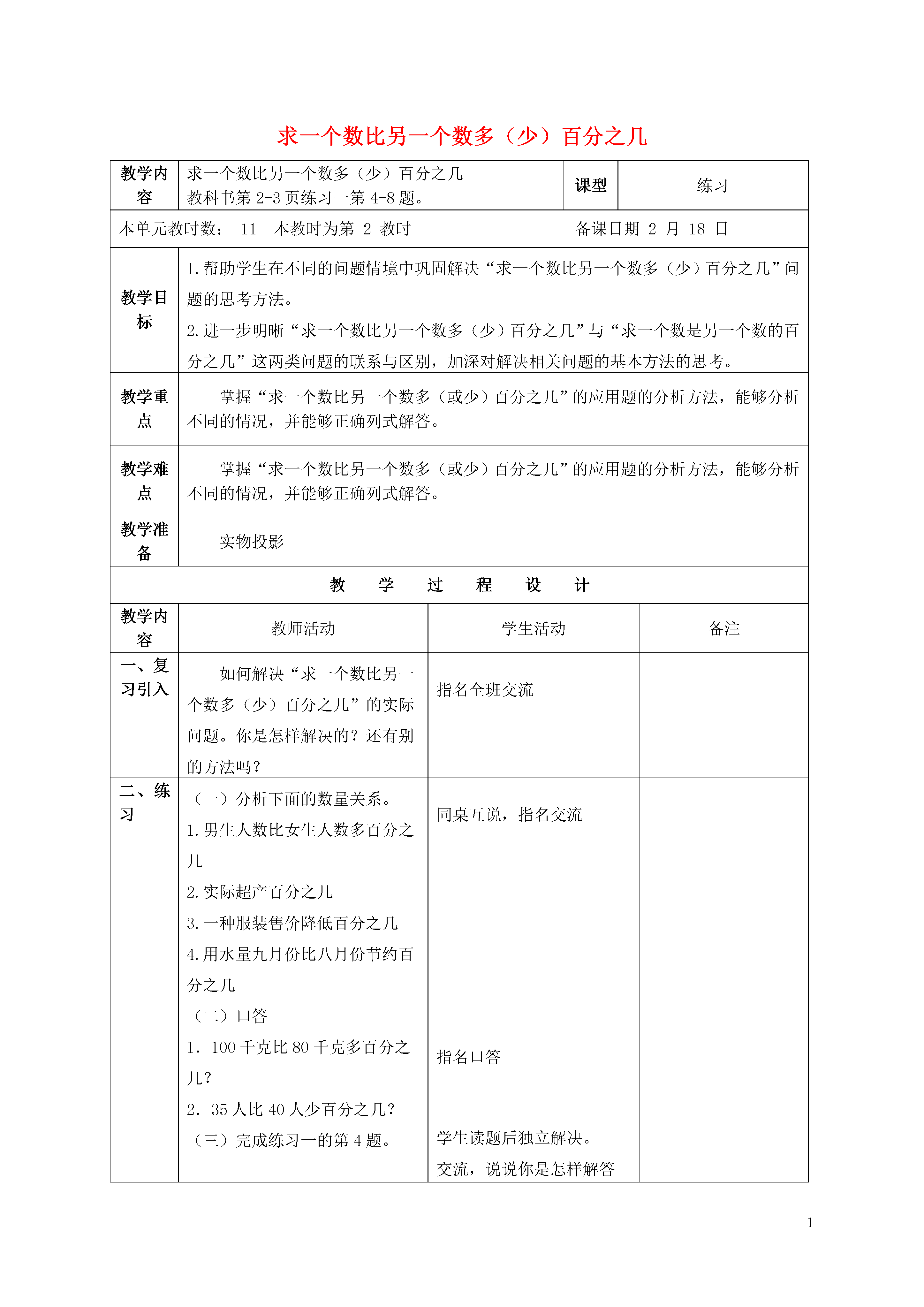 1求一个数比另一个数多(少)百分之几教学内容求一个数比另一个数多(少)百分之几教科书第2-3页练习一第4-8题。课型练习本单元教时数:11本教时为第2教时备课日期2月18日教学目标1.帮助学生在不同的问题情境中巩固解决“求一个数比另一个数多(少)百分之几”问题的思考方法。2.进一步明晰“求一个数比另一个数多(少)百分之几”与“求一个数是另一个数的百分之几”这两类问题的联系与区别,加深对解决相关问题的基本方法的思考。教学重点掌握“求一个数比另一个数多(或少)百分之几”的应用题的分析方法,能够分析不同的情况,并能够正确列式解答。教学难点掌握“求一个数比另一个数多(或少)百分之几”的应用题的分析方法,能够分析不同的情况,并能够正确列式解答。教学准备实物投影教学过程设计教学内容教师活动学生活动备注一、复习引入如何解决“求一个数比另一个数多(少)百分之几”的实际问题。你是怎样解决的?还有别的方法吗?指名全班交流二、练习(一)分析下面的数量关系。1.男生人数比女生人数多百分之几2.实际超产百分之几3.一种服装售价降低百分之几4.用水量九月份比八月份节约百分之几(二)口答1.100千克比80千克多百分之几?2.35人比40人少百分之几?(三)完成练习一的第4题。(四)完成练习一的第5题。(五)完成练习一第6题。(六)完成练习一第7题。学生读题,说说你是怎样理解的?明确:“巧克力的价钱比奶糖贵百分之几”,就是“巧克力的价钱比奶糖多百分之几。”(七)完成第8题。同桌互说,指名交流指名口答学生读题后独立解决。交流,说说你是怎样解答的?解答第(2)题时还有别的方法吗?比较这两题有什么不同?先让学生独立解答,然后组织交流和比较。重点把第(2)、(3)题与第(1)题比较。指名学生读题,理解什么是“孵化期”。然后学生独立解答。交流检查正确率,帮助有困难的学生理解。学生解答后交流思考过程。学生独立解答。可以用计算器计算。完成后交流。三、读读“你知道吗”交流:读完后你有什么想法?思考:为什么不可以说2006年我国的国内生产总值增长幅度比2005年提高了0.3%?突出单位1不同的两个百分数不能直接相减。你还能举些有关百分点和负增长的例子吗?学生自主阅读。指名交流四、全课小结通过本节课的学习你有什么收获?指名交流板书求一个数比另一个数多(少)百分之几比较量÷单位“1”的量=所得的百分数课后感受