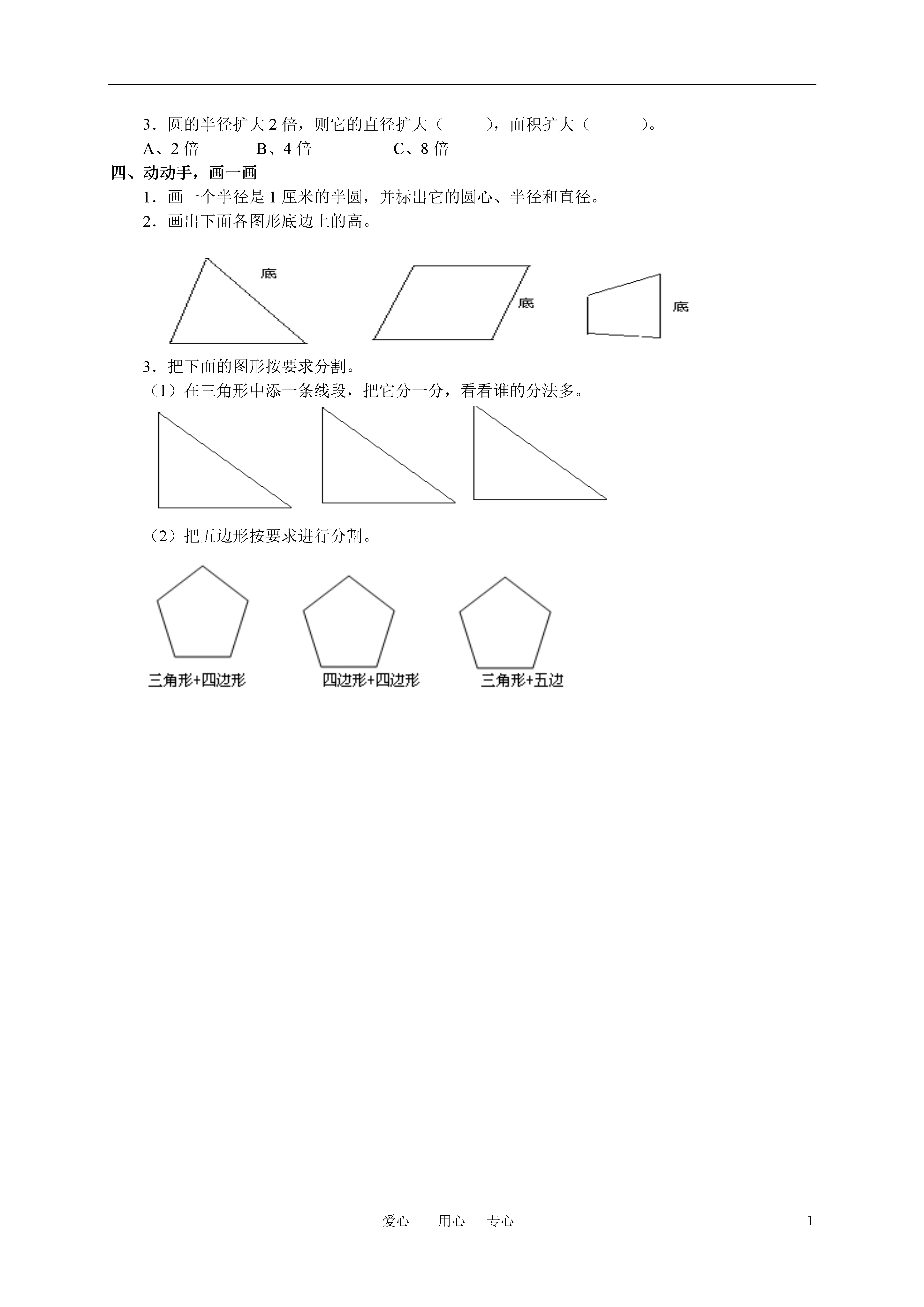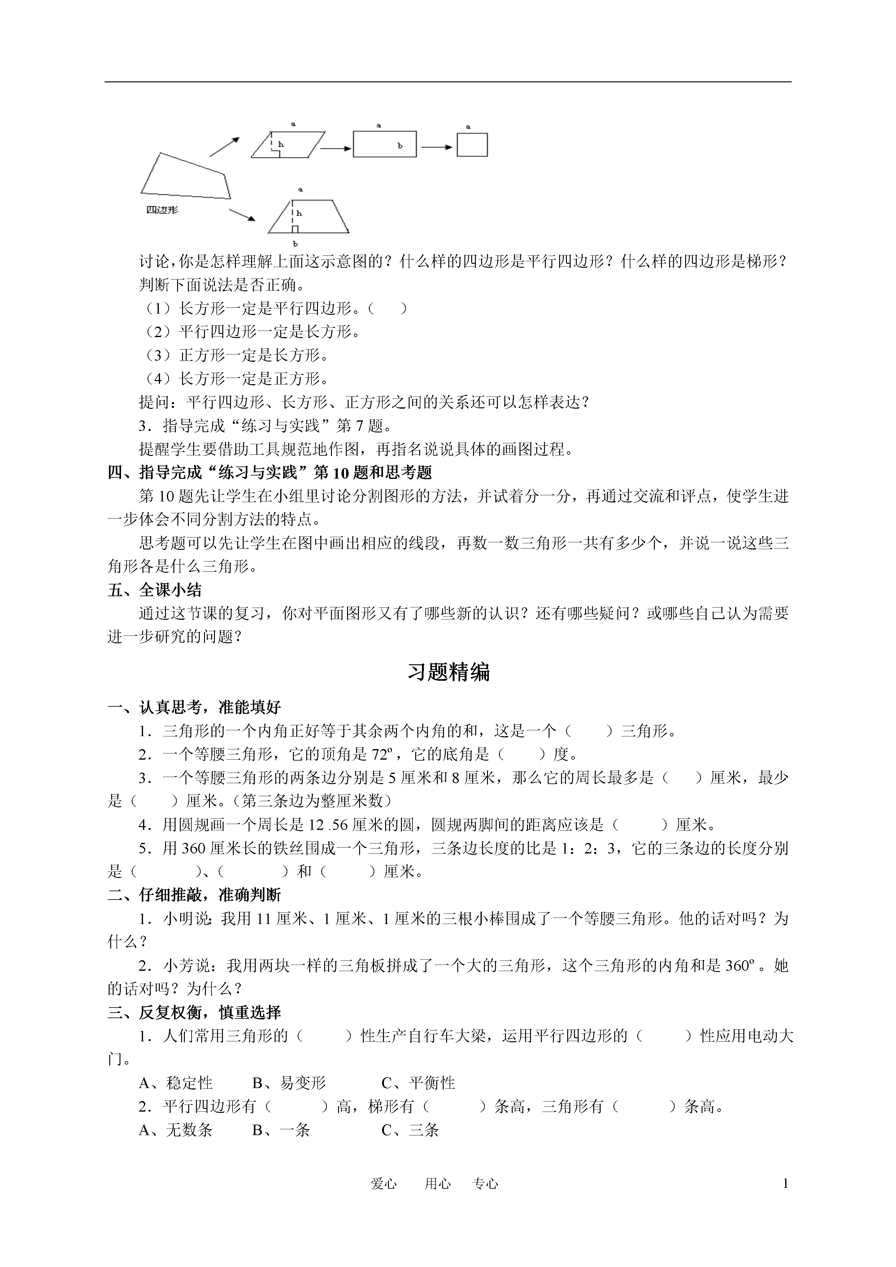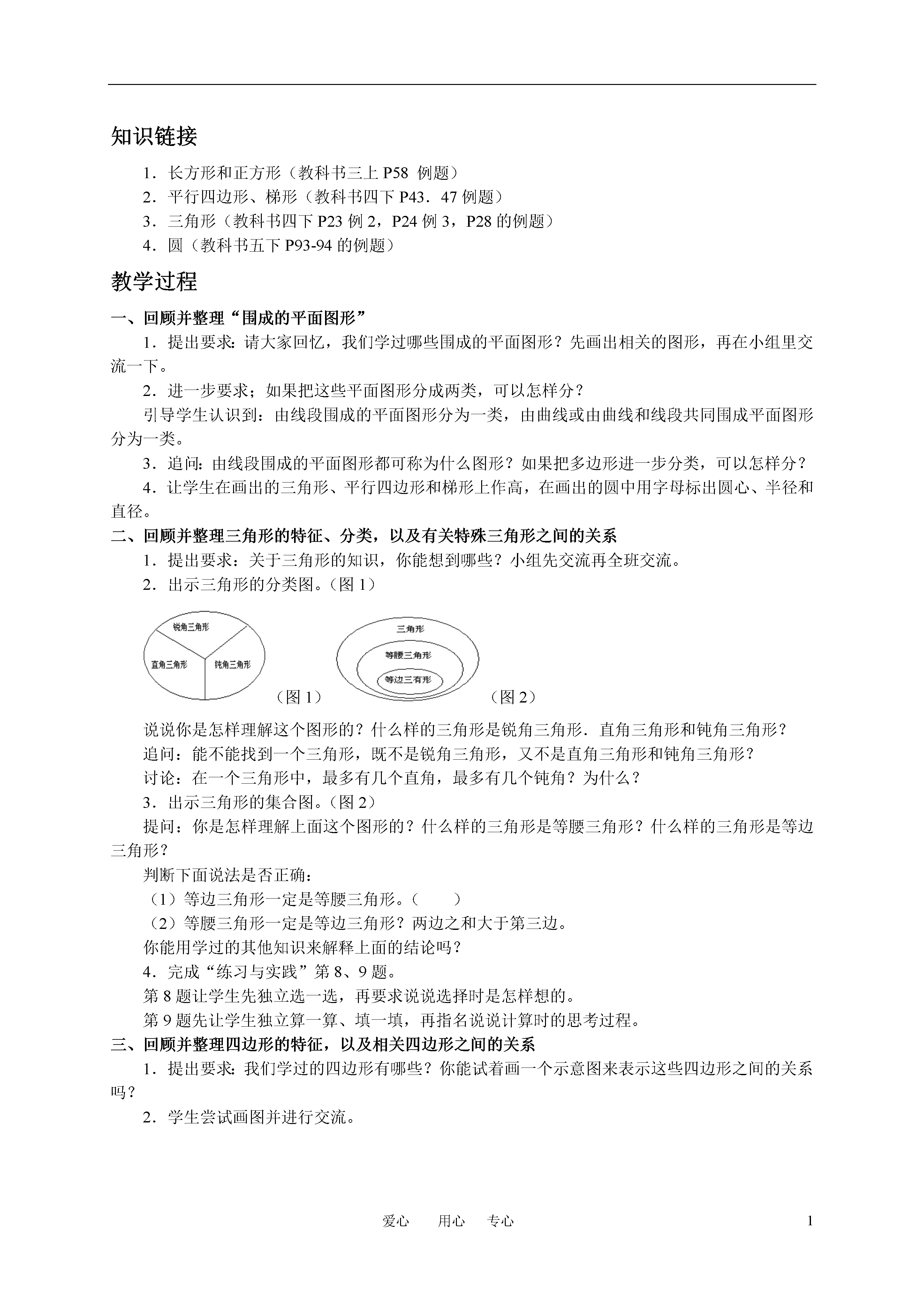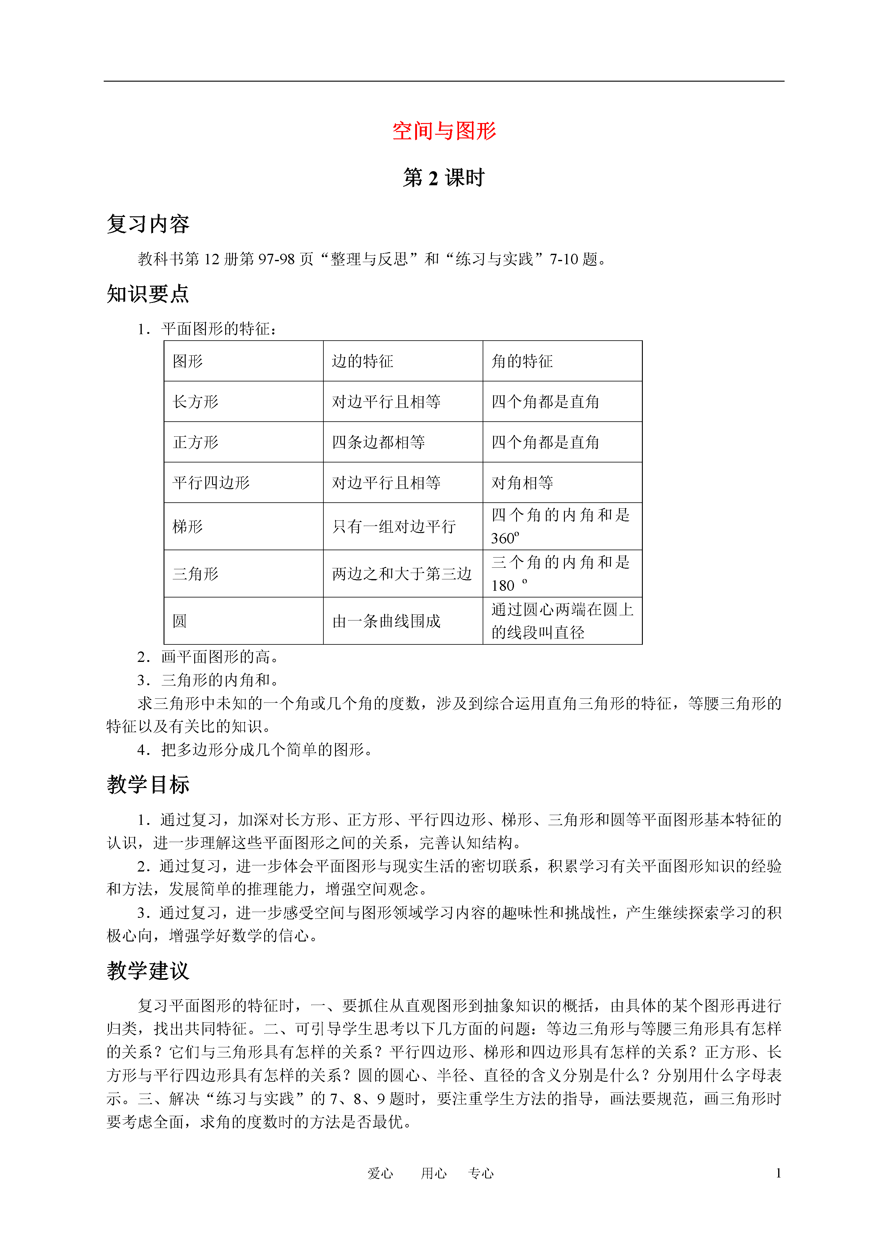 1爱心用心专心空间与图形第2课时复习内容教科书第12册第97-98页“整理与反思”和“练习与实践”7-10题。知识要点1.平面图形的特征:图形边的特征角的特征长方形对边平行且相等四个角都是直角正方形四条边都相等四个角都是直角平行四边形对边平行且相等对角相等梯形只有一组对边平行四个角的内角和是360º三角形两边之和大于第三边三个角的内角和是180º圆由一条曲线围成通过圆心两端在圆上的线段叫直径2.画平面图形的高。3.三角形的内角和。求三角形中未知的一个角或几个角的度数,涉及到综合运用直角三角形的特征,等腰三角形的特征以及有关比的知识。4.把多边形分成几个简单的图形。教学目标1.通过复习,加深对长方形、正方形、平行四边形、梯形、三角形和圆等平面图形基本特征的认识,进一步理解这些平面图形之间的关系,完善认知结构。2.通过复习,进一步体会平面图形与现实生活的密切联系,积累学习有关平面图形知识的经验和方法,发展简单的推理能力,增强空间观念。3.通过复习,进一步感受空间与图形领域学习内容的趣味性和挑战性,产生继续探索学习的积极心向,增强学好数学的信心。教学建议复习平面图形的特征时,一、要抓住从直观图形到抽象知识的概括,由具体的某个图形再进行归类,找出共同特征。二、可引导学生思考以下几方面的问题:等边三角形与等腰三角形具有怎样的关系?它们与三角形具有怎样的关系?平行四边形、梯形和四边形具有怎样的关系?正方形、长方形与平行四边形具有怎样的关系?圆的圆心、半径、直径的含义分别是什么?分别用什么字母表示。三、解决“练习与实践”的7、8、9题时,要注重学生方法的指导,画法要规范,画三角形时要考虑全面,求角的度数时的方法是否最优。知识链接1.长方形和正方形(教科书三上P58例题)2.平行四边形、梯形(教科书四下P43.47例题)3.三角形(教科书四下P23例2,P24例3,P28的例题)4.圆(教科书五下P93-94的例题)教学过程一、回顾并整理“围成的平面图形”1.提出要求:请大家回忆,我们学过哪些围成的平面图形?先画出相关的图形,再在小组里交流一下。2.进一步要求;如果把这些平面图形分成两类,可以怎样分?引导学生认识到:由线段围成的平面图形分为一类,由曲线或由曲线和线段共同围成平面图形分为一类。3.追问:由线段围成的平面图形都可称为什么图形?如果把多边形进一步分类,可以怎样分?4.让学生在画出的三角形、平行四边形和梯形上作高,在画出的圆中用字母标出圆心、半径和直径。二、回顾并整理三角形的特征、分类,以及有关特殊三角形之间的关系1.提出要求:关于三角形的知识,你能想到哪些?小组先交流再全班交流。2.出示三角形的分类图。(图1)(图1)(图2)说说你是怎样理解这个图形的?什么样的三角形是锐角三角形.直角三角形和钝角三角形?追问:能不能找到一个三角形,既不是锐角三角形,又不是直角三角形和钝角三角形?讨论:在一个三角形中,最多有几个直角,最多有几个钝角?为什么?3.出示三角形的集合图。(图2)提问:你是怎样理解上面这个图形的?什么样的三角形是等腰三角形?什么样的三角形是等边三角形?判断下面说法是否正确:(1)等边三角形一定是等腰三角形。()(2)等腰三角形一定是等边三角形?两边之和大于第三边。你能用学过的其他知识来解释上面的结论吗?4.完成“练习与实践”第8、9题。第8题让学生先独立选一选,再要求说说选择时是怎样想的。第9题先让学生独立算一算、填一填,再指名说说计算时的思考过程。三、回顾并整理四边形的特征,以及相关四边形之间的关系1.提出要求:我们学过的四边形有哪些?你能试着画一个示意图来表示这些四边形之间的关系吗?2.学生尝试画图并进行交流。讨论,你是怎样理解上面这示意图的?什么样的四边形是平行四边形?什么样的四边形是梯形?判断下面说法是否正确。(1)长方形一定是平行四边形。()(2)平行四边形一定是长方形。(3)正方形一定是长方形。(4)长方形一定是正方形。提问:平行四边形、长方形、正方形之间的关系还可以怎样表达?3.指导完成“练习与实践”第7题。提醒学生要借助工具规范地作图,再指名说说具体的画图过程。四、指导完成“练习与实践”第10题和思考题第10题先让学生在小组里讨论分割图形的方法,并试着分一分,再通过交流和评点,使学生进一步体会不同分割方法的特点。思考题可以先让学生在图中画出相应的线段,再数一数三角形一共有多少个,并说一说这些三角形各是什么三角形。五、全课小结通过这节课的复习,你对平面图形又有了哪些新的认识?还有哪些疑问?或哪些自己认为需要进一步研究的问题?习题精编一、认真思考,准能填好1.三角形的一个