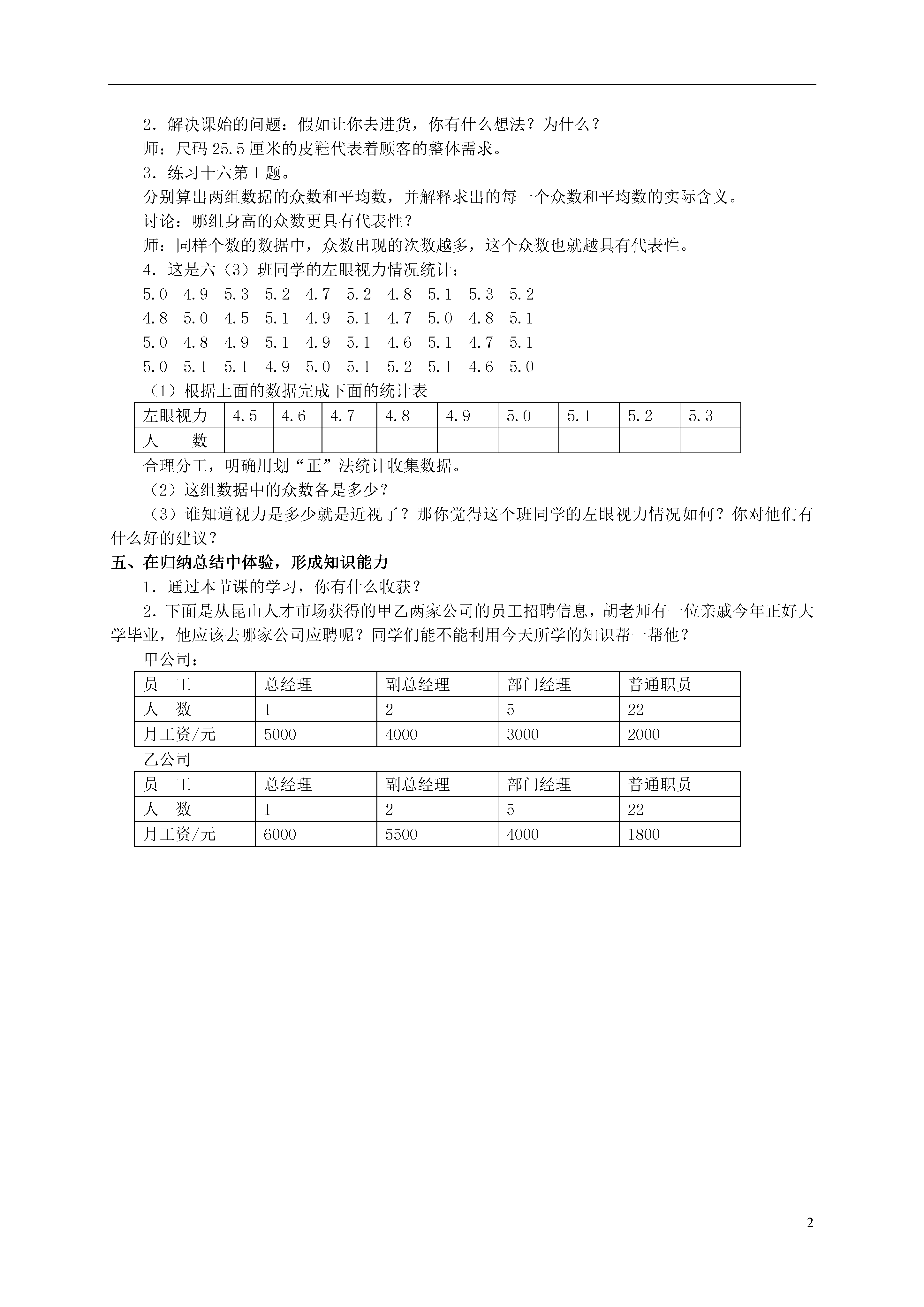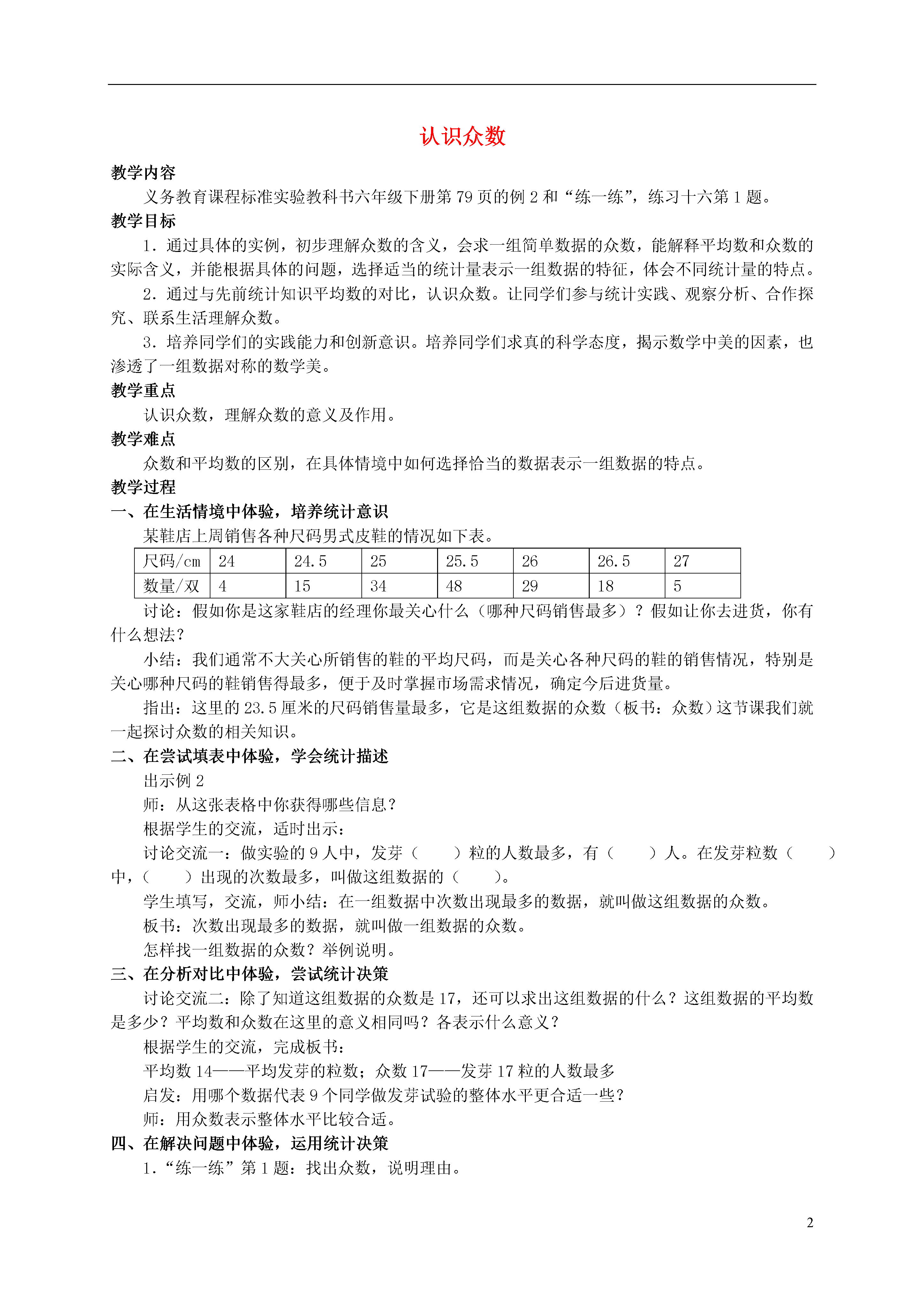 2认识众数教学内容义务教育课程标准实验教科书六年级下册的例2和“练一练”,练习十六第1题。教学目标1.通过具体的实例,初步理解众数的含义,会求一组简单数据的众数,能解释平均数和众数的实际含义,并能根据具体的问题,选择适当的统计量表示一组数据的特征,体会不同统计量的特点。2.通过与先前统计知识平均数的对比,认识众数。让同学们参与统计实践、观察分析、合作探究、联系生活理解众数。3.培养同学们的实践能力和创新意识。培养同学们求真的科学态度,揭示数学中美的因素,也渗透了一组数据对称的数学美。教学重点认识众数,理解众数的意义及作用。教学难点众数和平均数的区别,在具体情境中如何选择恰当的数据表示一组数据的特点。教学过程一、在生活情境中体验,培养统计意识某鞋店上周销售各种尺码男式皮鞋的情况如下表。尺码/cm2424.52525.52626.527数量/双415344829185讨论:假如你是这家鞋店的经理你最关心什么(哪种尺码销售最多)?假如让你去进货,你有什么想法?小结:我们通常不大关心所销售的鞋的平均尺码,而是关心各种尺码的鞋的销售情况,特别是关心哪种尺码的鞋销售得最多,便于及时掌握市场需求情况,确定今后进货量。指出:这里的23.5厘米的尺码销售量最多,它是这组数据的众数(板书:众数)这节课我们就一起探讨众数的相关知识。二、在尝试填表中体验,学会统计描述出示例2师:从这张表格中你获得哪些信息?根据学生的交流,适时出示:讨论交流一:做实验的9人中,发芽()粒的人数最多,有()人。在发芽粒数()中,()出现的次数最多,叫做这组数据的()。学生填写,交流,师小结:在一组数据中次数出现最多的数据,就叫做这组数据的众数。板书:次数出现最多的数据,就叫做一组数据的众数。怎样找一组数据的众数?举例说明。三、在分析对比中体验,尝试统计决策讨论交流二:除了知道这组数据的众数是17,还可以求出这组数据的什么?这组数据的平均数是多少?平均数和众数在这里的意义相同吗?各表示什么意义?根据学生的交流,完成板书:平均数14——平均发芽的粒数;众数17——发芽17粒的人数最多启发:用哪个数据代表9个同学做发芽试验的整体水平更合适一些?师:用众数表示整体水平比较合适。四、在解决问题中体验,运用统计决策1.“练一练”第1题:找出众数,说明理由。2.解决课始的问题:假如让你去进货,你有什么想法?为什么?师:尺码25.5厘米的皮鞋代表着顾客的整体需求。3.练习十六第1题。分别算出两组数据的众数和平均数,并解释求出的每一个众数和平均数的实际含义。讨论:哪组身高的众数更具有代表性?师:同样个数的数据中,众数出现的次数越多,这个众数也就越具有代表性。4.这是六(3)班同学的左眼视力情况统计:5.04.95.35.24.75.24.85.15.35.24.85.04.55.14.95.14.75.04.85.15.04.84.95.14.95.14.65.14.75.15.05.15.14.95.05.15.25.14.65.0(1)根据上面的数据完成下面的统计表左眼视力4.54.64.74.84.95.05.15.25.3人数合理分工,明确用划“正”法统计收集数据。(2)这组数据中的众数各是多少?(3)谁知道视力是多少就是近视了?那你觉得这个班同学的左眼视力情况如何?你对他们有什么好的建议?五、在归纳总结中体验,形成知识能力1.通过本节课的学习,你有什么收获?2.下面是从昆山人才市场获得的甲乙两家公司的员工招聘信息,胡老师有一位亲戚今年正好大学毕业,他应该去哪家公司应聘呢?同学们能不能利用今天所学的知识帮一帮他?甲公司:员工总经理副总经理部门经理普通职员人数12522月工资/元5000400030002000乙公司员工总经理副总经理部门经理普通职员人数12522月工资/元6000550040001800