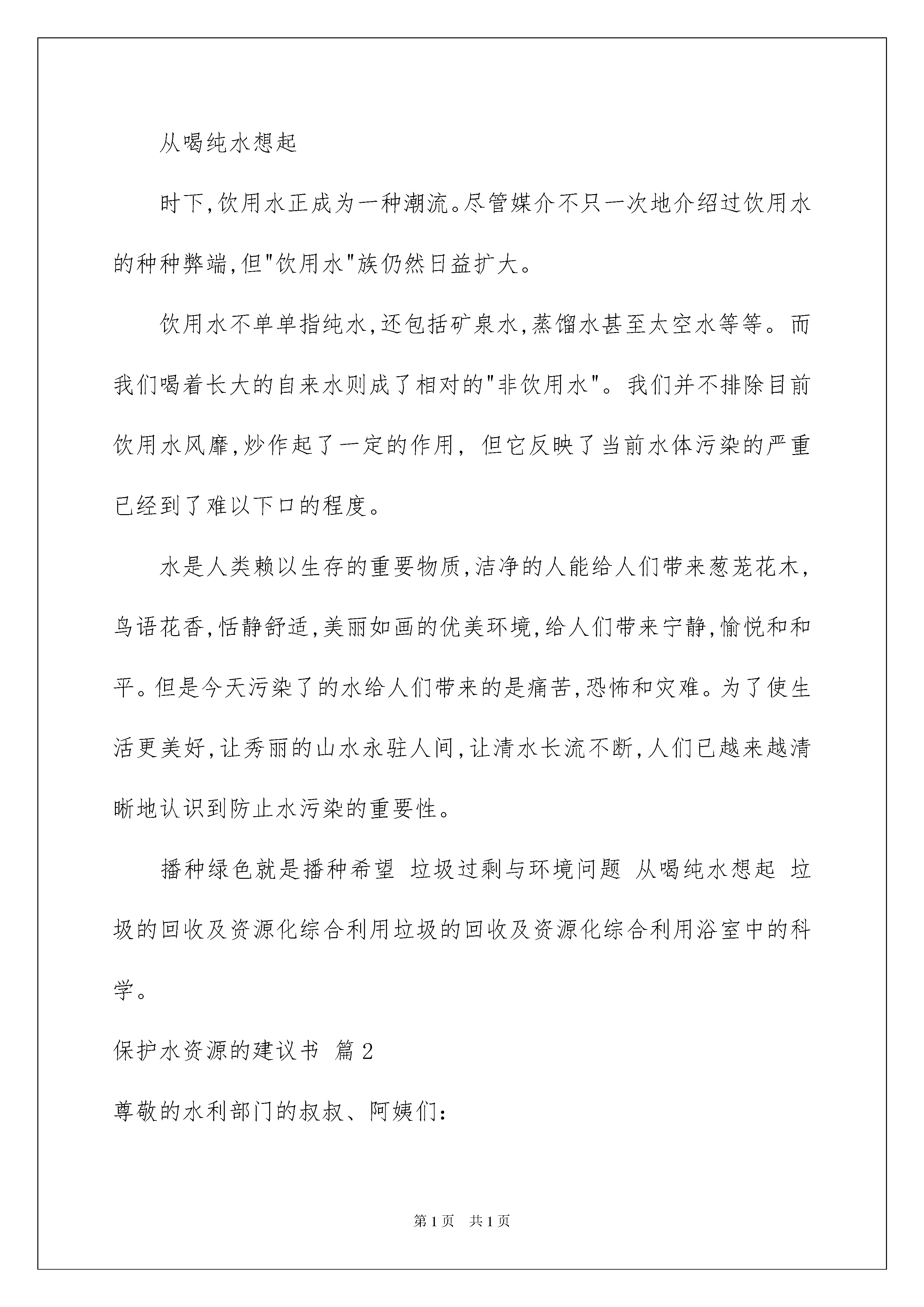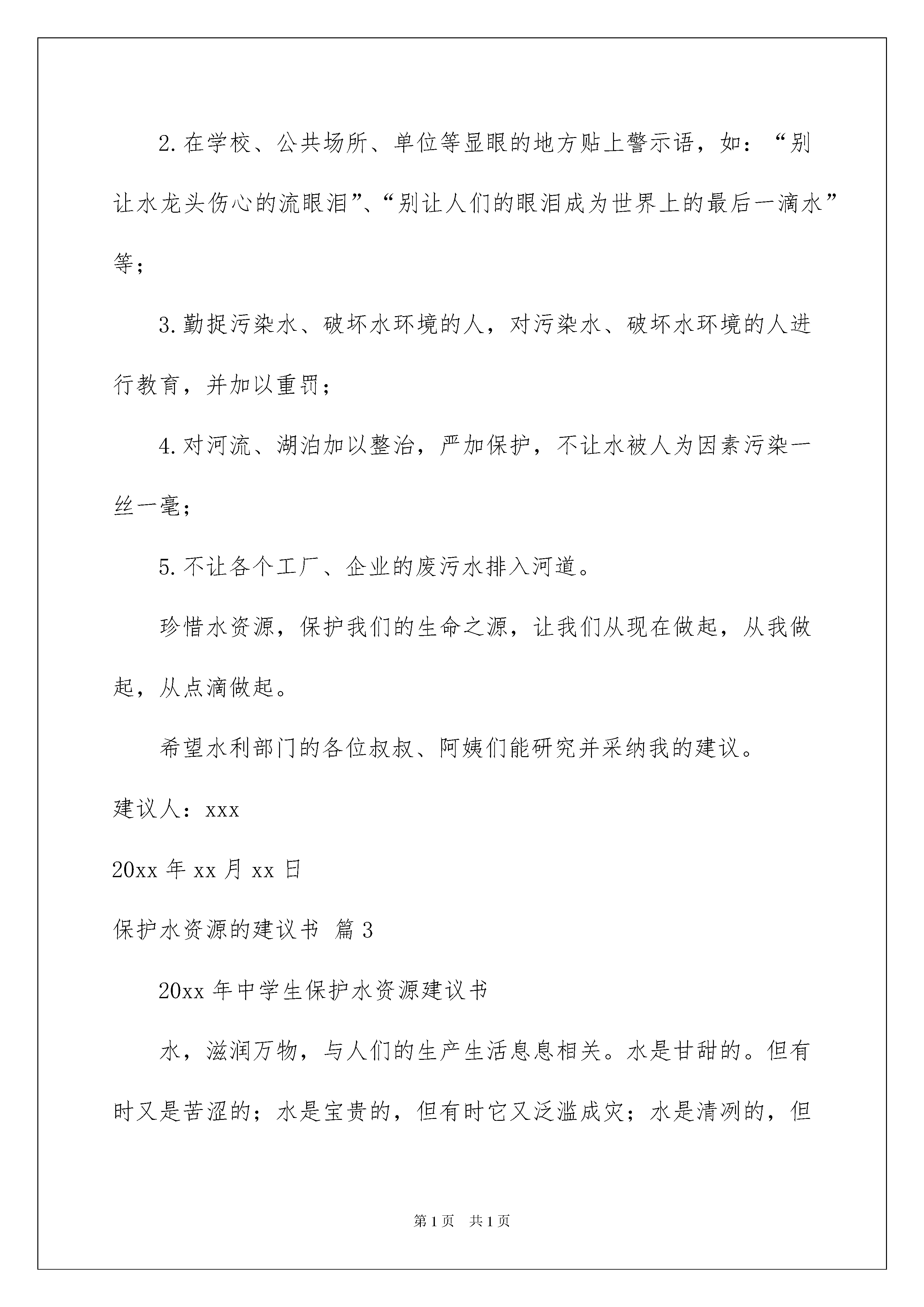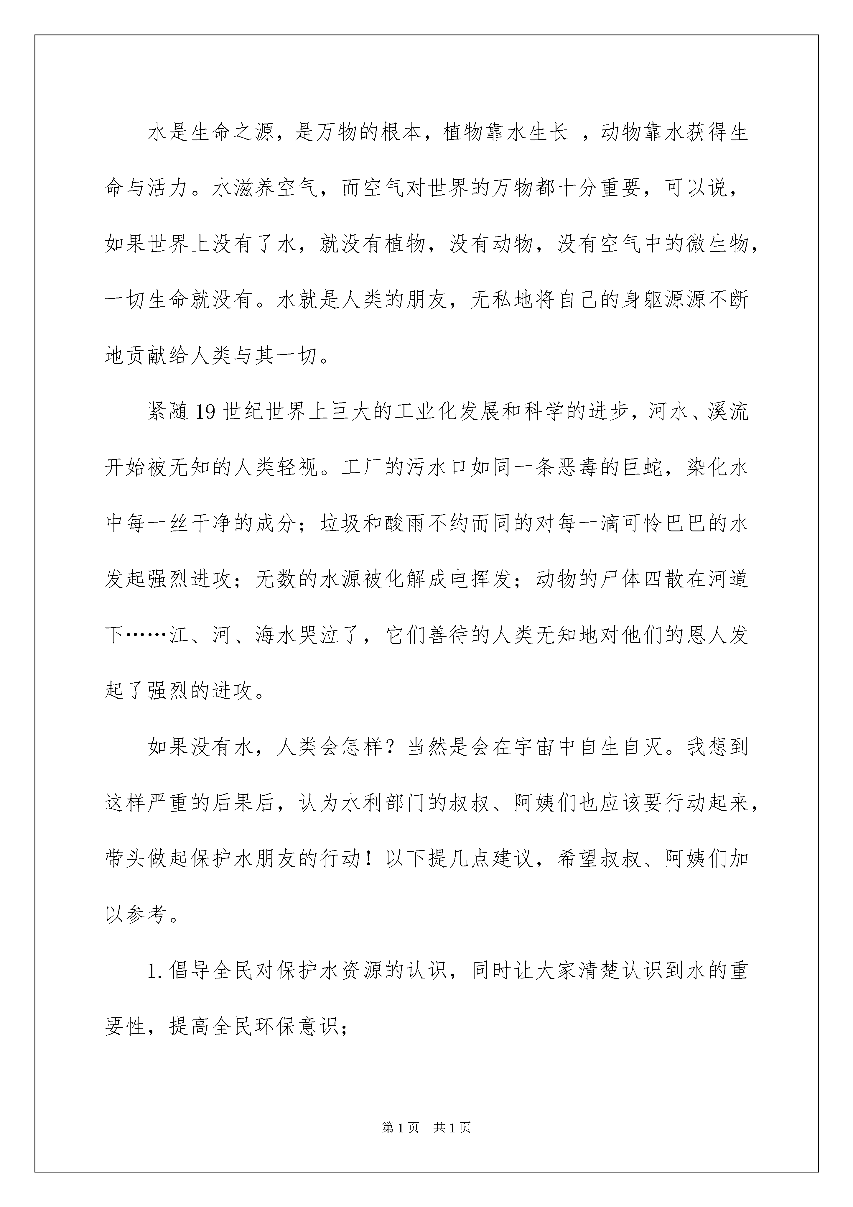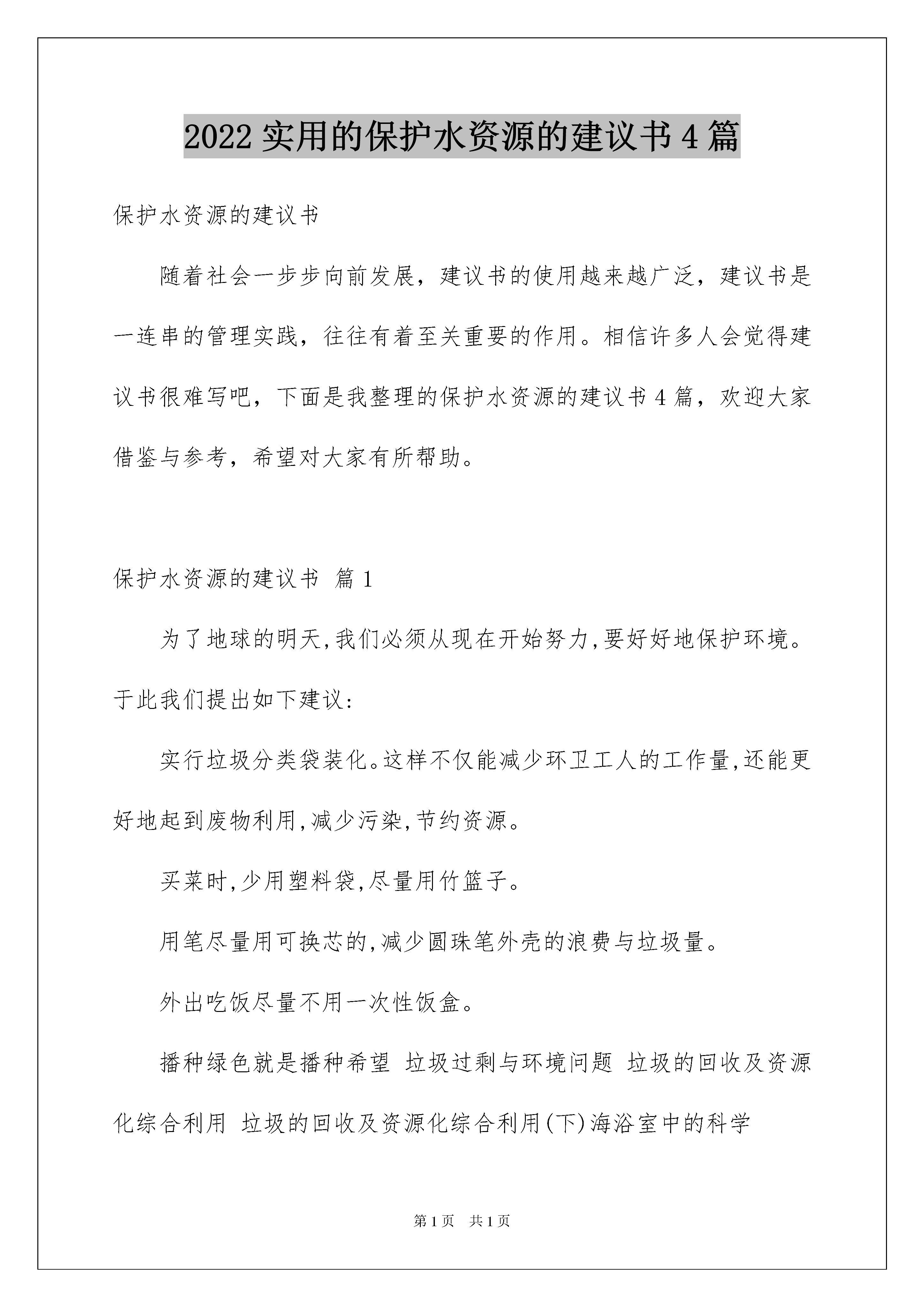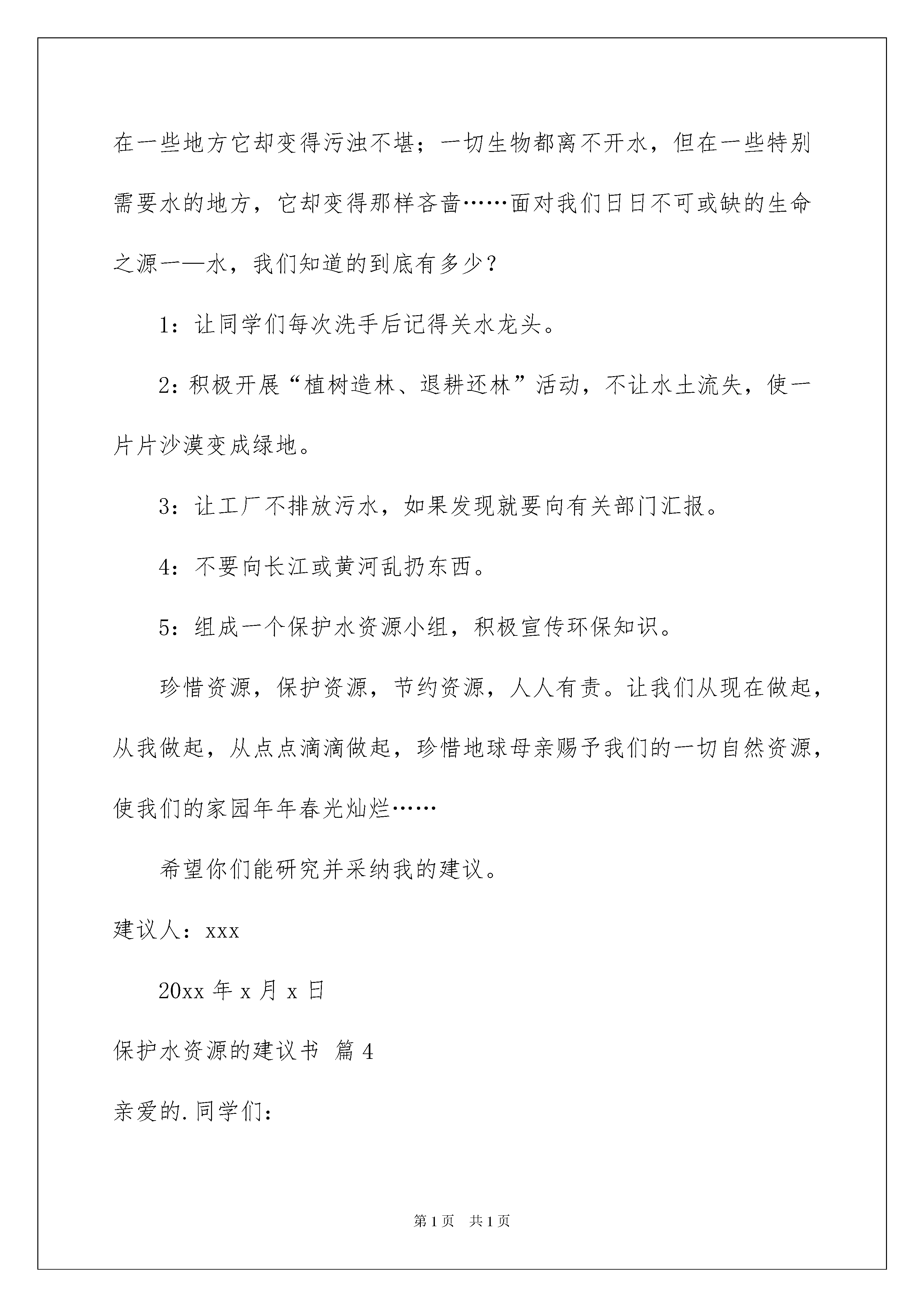 2022实用的保护水资源的建议书4篇保护水资源的建议书随着社会一步步向前发展,建议书的使用越来越广泛,建议书是一连串的管理实践,往往有着至关重要的作用。相信许多人会觉得建议书很难写吧,下面是我整理的保护水资源的建议书4篇,欢迎大家借鉴与参考,希望对大家有所帮助。保护水资源的建议书篇1为了地球的明天,我们必须从现在开始努力,要好好地保护环境。于此我们提出如下建议:实行垃圾分类袋装化。这样不仅能减少环卫工人的工作量,还能更好地起到废物利用,减少污染,节约资源。买菜时,少用塑料袋,尽量用竹篮子。用笔尽量用可换芯的,减少圆珠笔外壳的浪费与垃圾量。外出吃饭尽量不用一次性饭盒。播种绿色就是播种希望垃圾过剩与环境问题垃圾的回收及资源化综合利用垃圾的回收及资源化综合利用(下)海浴室中的科学从喝纯水想起时下,饮用水正成为一种潮流。尽管媒介不只一次地介绍过饮用水的种种弊端,但"饮用水"族仍然日益扩大。饮用水不单单指纯水,还包括矿泉水,蒸馏水甚至太空水等等。而我们喝着长大的自来水则成了相对的"非饮用水"。我们并不排除目前饮用水风靡,炒作起了一定的作用,但它反映了当前水体污染的严重已经到了难以下口的程度。水是人类赖以生存的重要物质,洁净的人能给人们带来葱茏花木,鸟语花香,恬静舒适,美丽如画的优美环境,给人们带来宁静,愉悦和和平。但是今天污染了的水给人们带来的是痛苦,恐怖和灾难。为了使生活更美好,让秀丽的山水永驻人间,让清水长流不断,人们已越来越清晰地认识到防止水污染的重要性。播种绿色就是播种希望垃圾过剩与环境问题从喝纯水想起垃圾的回收及资源化综合利用垃圾的回收及资源化综合利用浴室中的科学。保护水资源的建议书篇2尊敬的水利部门的叔叔、阿姨们:水是生命之源,是万物的根本,植物靠水生长,动物靠水获得生命与活力。水滋养空气,而空气对世界的万物都十分重要,可以说,如果世界上没有了水,就没有植物,没有动物,没有空气中的微生物,一切生命就没有。水就是人类的朋友,无私地将自己的身躯源源不断地贡献给人类与其一切。紧随19世纪世界上巨大的工业化发展和科学的进步,河水、溪流开始被无知的人类轻视。工厂的污水口如同一条恶毒的巨蛇,染化水中每一丝干净的成分;垃圾和酸雨不约而同的对每一滴可怜巴巴的水发起强烈进攻;无数的水源被化解成电挥发;动物的尸体四散在河道下……江、河、海水哭泣了,它们善待的人类无知地对他们的恩人发起了强烈的进攻。如果没有水,人类会怎样?当然是会在宇宙中自生自灭。我想到这样严重的后果后,认为水利部门的叔叔、阿姨们也应该要行动起来,带头做起保护水朋友的行动!以下提几点建议,希望叔叔、阿姨们加以参考。1.倡导全民对保护水资源的认识,同时让大家清楚认识到水的重要性,提高全民环保意识;2.在学校、公共场所、单位等显眼的地方贴上警示语,如:“别让水龙头伤心的流眼泪”、“别让人们的眼泪成为世界上的最后一滴水”等;3.勤捉污染水、破坏水环境的人,对污染水、破坏水环境的人进行教育,并加以重罚;4.对河流、湖泊加以整治,严加保护,不让水被人为因素污染一丝一毫;5.不让各个工厂、企业的废污水排入河道。珍惜水资源,保护我们的生命之源,让我们从现在做起,从我做起,从点滴做起。希望水利部门的各位叔叔、阿姨们能研究并采纳我的建议。建议人:xxx20xx年xx月xx日保护水资源的建议书篇320xx年中学生保护水资源建议书水,滋润万物,与人们的生产生活息息相关。水是甘甜的。但有时又是苦涩的;水是宝贵的,但有时它又泛滥成灾;水是清冽的,但在一些地方它却变得污浊不堪;一切生物都离不开水,但在一些特别需要水的地方,它却变得那样吝啬……面对我们日日不可或缺的生命之源一—水,我们知道的到底有多少?1:让同学们每次洗手后记得关水龙头。2:积极开展“植树造林、退耕还林”活动,不让水土流失,使一片片沙漠变成绿地。3:让工厂不排放污水,如果发现就要向有关部门汇报。4:不要向长江或黄河乱扔东西。5:组成一个保护水资源小组,积极宣传环保知识。珍惜资源,保护资源,节约资源,人人有责。让我们从现在做起,从我做起,从点点滴滴做起,珍惜地球母亲赐予我们的一切自然资源,使我们的家园年年春光灿烂……希望你们能研究并采纳我的建议。建议人:xxx20xx年x月x日保护水资源的建议书篇4亲爱的.同学们:大家好!我们生活的地球是一个美丽的家园,有巍峨峻拔的高山,有广阔无边的大海,有一望无际的草原,也有四季如春的平原。而水,无疑是一切生命的根本,没有了水,我们的地球将不复存在。水在我们的生活中随处可见,洗衣做饭、浇灌农田、滋养花草,还是各种动物生命的摇篮。然而,现在看去,原本奔腾不