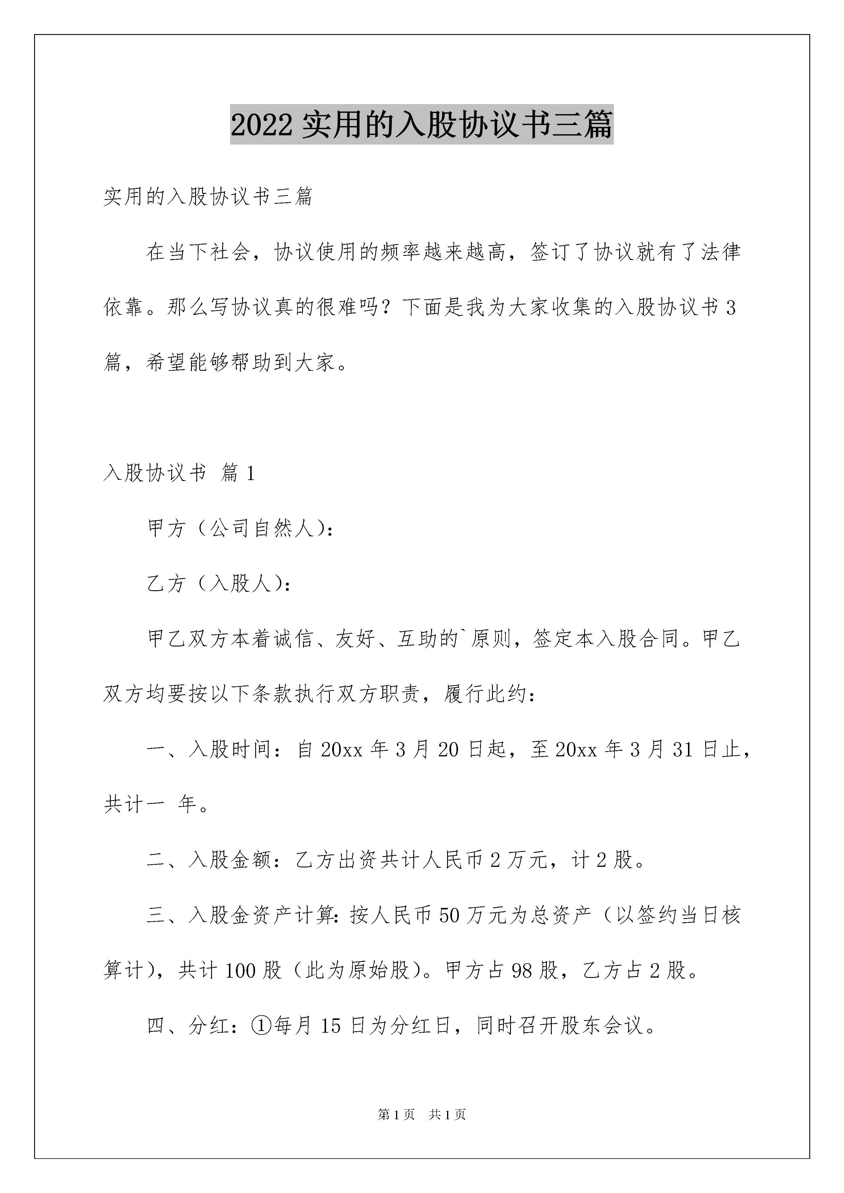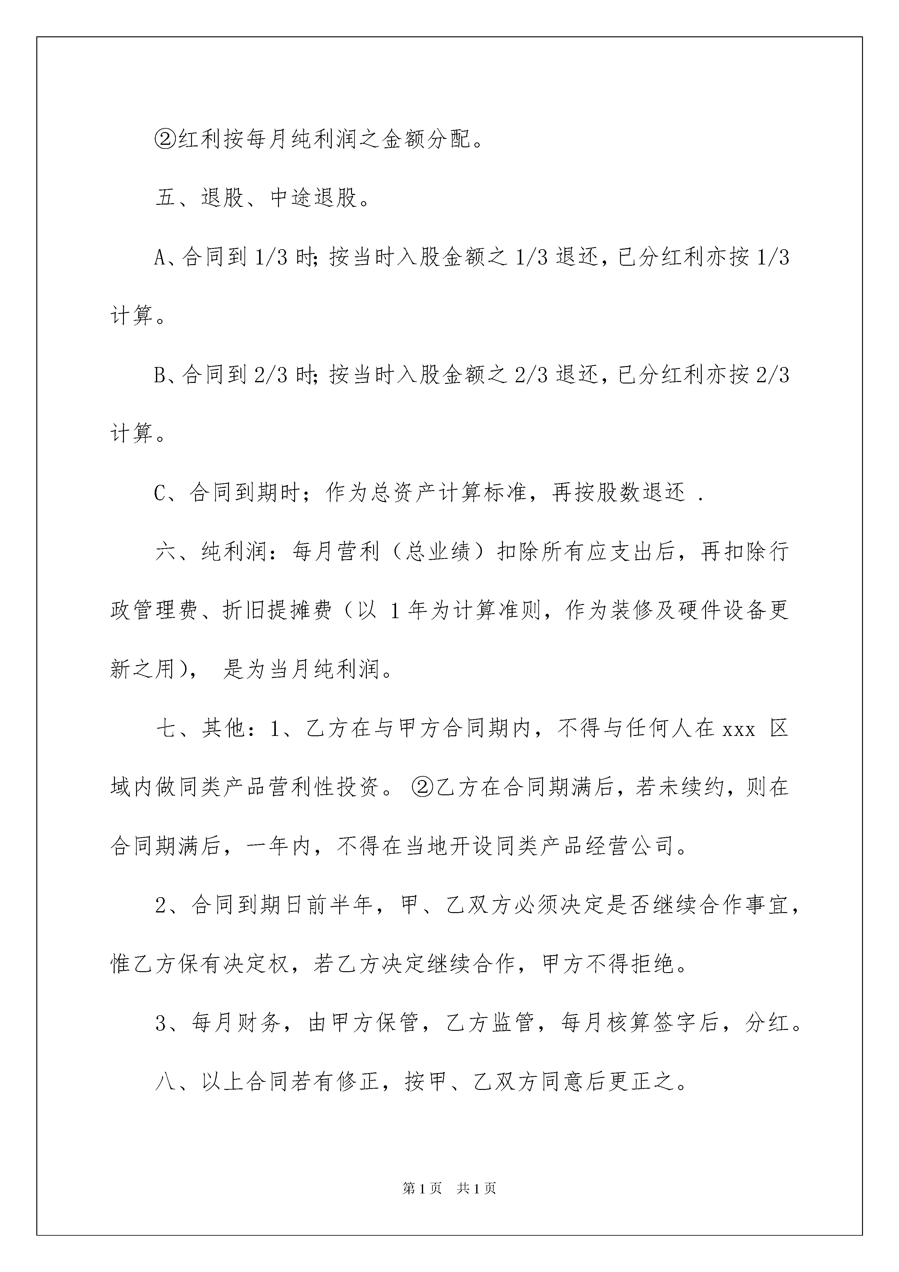 2022实用的入股协议书三篇实用的入股协议书三篇在当下社会,协议使用的频率越来越高,签订了协议就有了法律依靠。那么写协议真的很难吗?下面是我为大家收集的入股协议书3篇,希望能够帮助到大家。入股协议书篇1甲方(公司自然人):乙方(入股人):甲乙双方本着诚信、友好、互助的`原则,签定本入股合同。甲乙双方均要按以下条款执行双方职责,履行此约:一、入股时间:自20xx年3月20日起,至20xx年3月31日止,共计一年。二、入股金额:乙方出资共计人民币2万元,计2股。三、入股金资产计算:按人民币50万元为总资产(以签约当日核算计),共计100股(此为原始股)。甲方占98股,乙方占2股。四、分红:①每月15日为分红日,同时召开股东会议。②红利按每月纯利润之金额分配。五、退股、中途退股。A、合同到1/3时;按当时入股金额之1/3退还,已分红利亦按1/3计算。B、合同到2/3时;按当时入股金额之2/3退还,已分红利亦按2/3计算。C、合同到期时;作为总资产计算标准,再按股数退还.六、纯利润:每月营利(总业绩)扣除所有应支出后,再扣除行政管理费、折旧提摊费(以1年为计算准则,作为装修及硬件设备更新之用),是为当月纯利润。七、其他:1、乙方在与甲方合同期内,不得与任何人在xxx区域内做同类产品营利性投资。②乙方在合同期满后,若未续约,则在合同期满后,一年内,不得在当地开设同类产品经营公司。2、合同到期日前半年,甲、乙双方必须决定是否继续合作事宜,惟乙方保有决定权,若乙方决定继续合作,甲方不得拒绝。3、每月财务,由甲方保管,乙方监管,每月核算签字后,分红。八、以上合同若有修正,按甲、乙双方同意后更正之。九、本合同一式两份,由甲乙双方各持一份。甲方:乙方:代表人:身份证号:签约日:年月日签约日:年月日入股协议书篇2甲方:(法人代表:_____)乙方:_______为了国峰车行迅速发展,也为了让企业内部核心及骨干将国峰车当做自己的事业干,双方在实际经营中共同努力创造更大价值,共制入股分红协议如下:1、乙方自愿将人民币__________元注入甲方总资金内,期限为__________年,从__________年__________月__________日至__________年__________月_____日,这期间乙方享有国峰所有门店净利润的_____,分红兑现日期为年月。2、如中途乙方需用一部分或全部资金,正常来讲是不允许的,尤其是旺季,资金肯定被货款占用,但如果特殊情况急需用款,必须提前上报甲方,甲方与乙方一同分析整体资金周转情况而定,尽全力满足乙方需求。并按银行高出一倍的定期存款利率及结止到取款时间(以整月为单位)来计算乙方撤出的部分及全部资金。3、不满一年的资金不享有分红权。4、到期后,甲方无条件根据乙方要求:(1)连本带盈利都取走。(2)可将盈利取走,本金继续注入国峰车行,续签下一年协议。5、此协议一式两份,甲乙双方各执一份,签字生效。甲方签字(法人代表:_____)乙方签字:____________年_____月_____日入股协议书篇3甲方:(法人代表:_____)乙方:__________________为了__________车行迅速发展,也为了让企业内部核心及骨干将__________车当做自己的事业干,双方在实际经营中共同努力创造更大价值,共制入股分红协议如下:1.乙方自愿将人民币__________元注入甲方总资金内,期限为__________年,从__________年__________月__________日至__________年__________月_____日,这期间乙方享有__________所有门店净利润的_____,分红兑现日期为__________年__________月。2.如中途乙方需用一部分或全部资金,正常来讲是不允许的,尤其是旺季,资金肯定被货款占用,但如果特殊情况急需用款,必须提前上报甲方,甲方与乙方一同分析整体资金周转情况而定,尽全力满足乙方需求。并按银行高出一倍的定期存款利率及结止到取款时间(以整月为单位)来计算乙方撤出的部分及全部资金。3.不满一年的资金不享有分红权。4.到期后,甲方无条件根据乙方要求:(1)连本带盈利都取走。(2)可将盈利取走,本金继续注入__________车行,续签下一年协议。5.此协议一式两份,甲乙双方各执一份,签生效。甲方签(法人代表:_____)乙方签:_________________________年_____月_____日本文来源:网络收集与整理,如有侵权,请联系作者删除,谢谢!