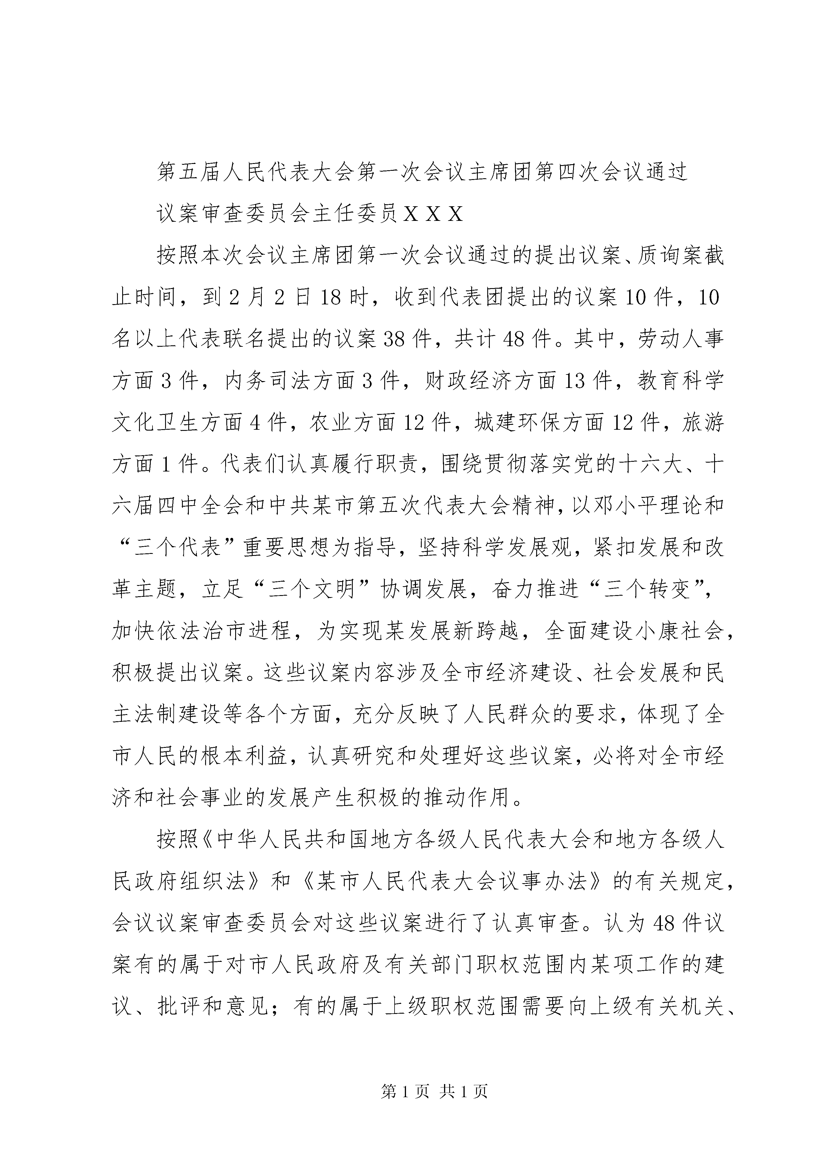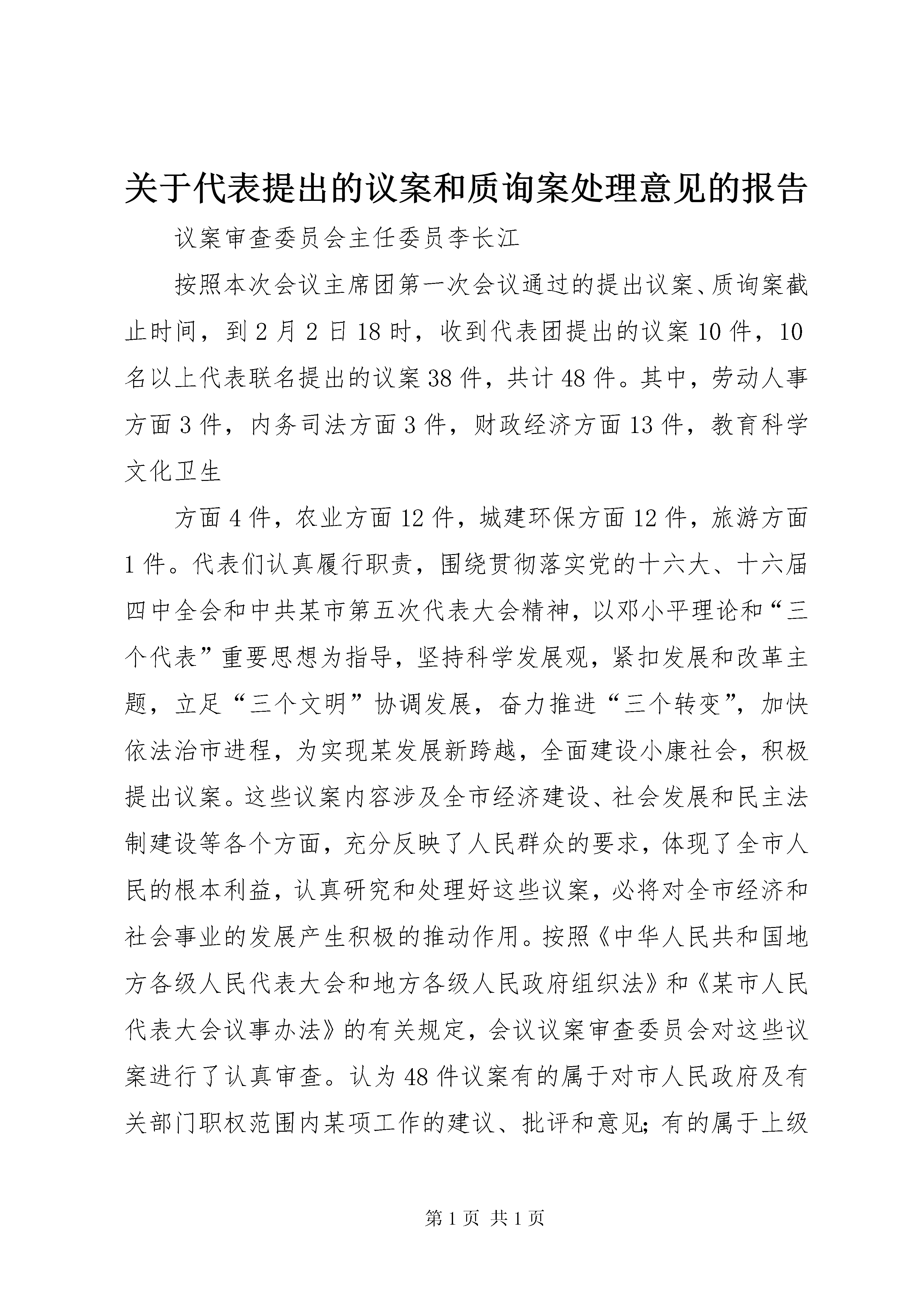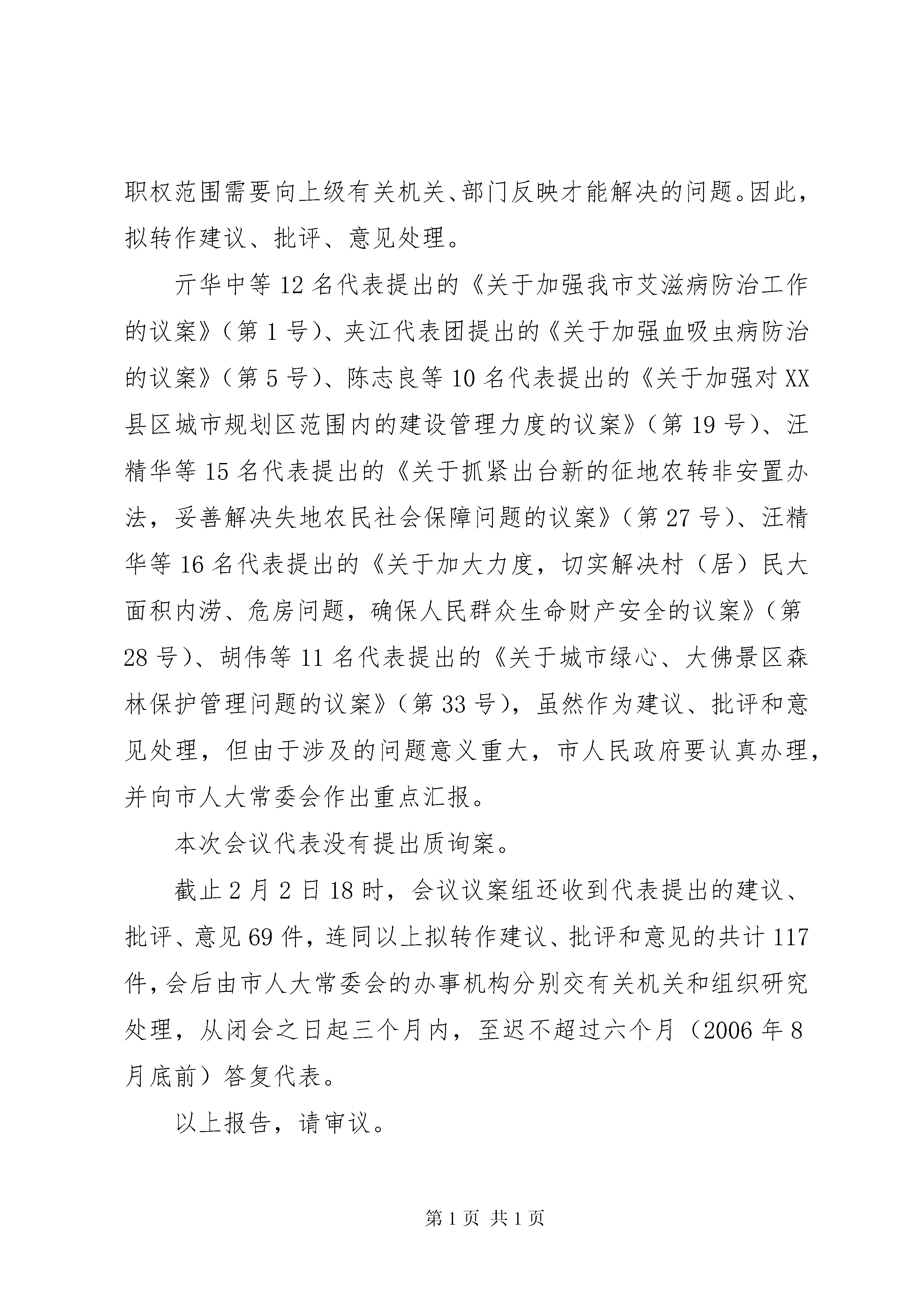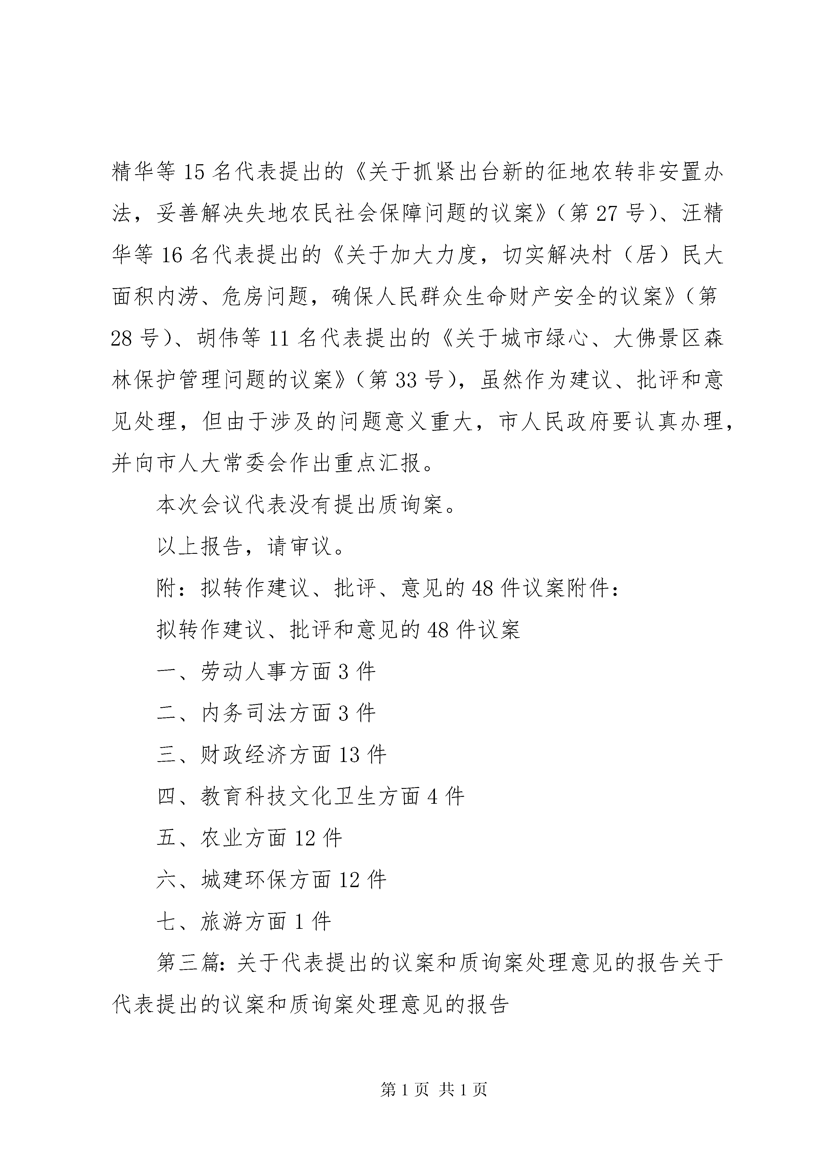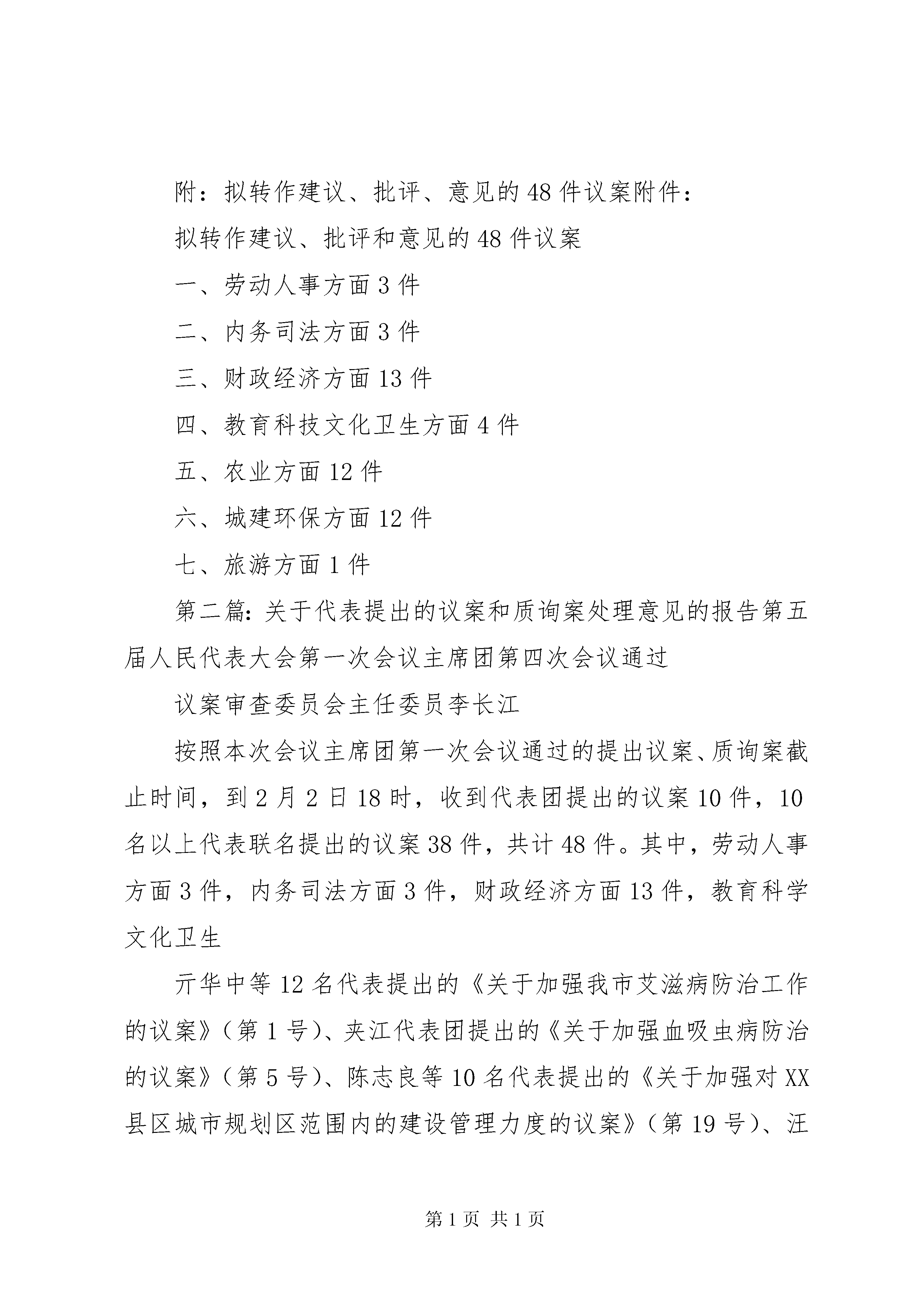 关于代表提出的议案和质询案处理意见的报告议案审查委员会主任委员李长江按照本次会议主席团第一次会议通过的提出议案、质询案截止时间,到2月2日18时,收到代表团提出的议案10件,10名以上代表联名提出的议案38件,共计48件。其中,劳动人事方面3件,内务司法方面3件,财政经济方面13件,教育科学文化卫生方面4件,农业方面12件,城建环保方面12件,旅游方面1件。代表们认真履行职责,围绕贯彻落实党的十六大、十六届四中全会和中共某市第五次代表大会精神,以邓小平理论和“三个代表”重要思想为指导,坚持科学发展观,紧扣发展和改革主题,立足“三个文明”协调发展,奋力推进“三个转变”,加快依法治市进程,为实现某发展新跨越,全面建设小康社会,积极提出议案。这些议案内容涉及全市经济建设、社会发展和民主法制建设等各个方面,充分反映了人民群众的要求,体现了全市人民的根本利益,认真研究和处理好这些议案,必将对全市经济和社会事业的发展产生积极的推动作用。按照《中华人民共和国地方各级人民代表大会和地方各级人民政府组织法》和《某市人民代表大会议事办法》的有关规定,会议议案审查委员会对这些议案进行了认真审查。认为48件议案有的属于对市人民政府及有关部门职权范围内某项工作的建议、批评和意见;有的属于上级职权范围需要向上级有关机关、部门反映才能解决的问题。因此,拟转作建议、批评、意见处理。亓华中等12名代表提出的《关于加强我市艾滋病防治工作的议案》(第1号)、夹江代表团提出的《关于加强血吸虫病防治的议案》(第5号)、陈志良等10名代表提出的《关于加强对XX县区城市规划区范围内的建设管理力度的议案》(第19号)、汪精华等15名代表提出的《关于抓紧出台新的征地农转非安置办法,妥善解决失地农民社会保障问题的议案》(第27号)、汪精华等16名代表提出的《关于加大力度,切实解决村(居)民大面积内涝、危房问题,确保人民群众生命财产安全的议案》(第28号)、胡伟等11名代表提出的《关于城市绿心、大佛景区森林保护管理问题的议案》(第33号),虽然作为建议、批评和意见处理,但由于涉及的问题意义重大,市人民政府要认真办理,并向市人大常委会作出重点汇报。本次会议代表没有提出质询案。截止2月2日18时,会议议案组还收到代表提出的建议、批评、意见69件,连同以上拟转作建议、批评和意见的共计117件,会后由市人大常委会的办事机构分别交有关机关和组织研究处理,从闭会之日起三个月内,至迟不超过六个月(2006年8月底前)答复代表。以上报告,请审议。附:拟转作建议、批评、意见的48件议案附件:拟转作建议、批评和意见的48件议案一、劳动人事方面3件二、内务司法方面3件三、财政经济方面13件四、教育科技文化卫生方面4件五、农业方面12件六、城建环保方面12件七、旅游方面1件第二篇:关于代表提出的议案和质询案处理意见的报告第五届人民代表大会第一次会议主席团第四次会议通过议案审查委员会主任委员李长江按照本次会议主席团第一次会议通过的提出议案、质询案截止时间,到2月2日18时,收到代表团提出的议案10件,10名以上代表联名提出的议案38件,共计48件。其中,劳动人事方面3件,内务司法方面3件,财政经济方面13件,教育科学文化卫生亓华中等12名代表提出的《关于加强我市艾滋病防治工作的议案》(第1号)、夹江代表团提出的《关于加强血吸虫病防治的议案》(第5号)、陈志良等10名代表提出的《关于加强对XX县区城市规划区范围内的建设管理力度的议案》(第19号)、汪精华等15名代表提出的《关于抓紧出台新的征地农转非安置办法,妥善解决失地农民社会保障问题的议案》(第27号)、汪精华等16名代表提出的《关于加大力度,切实解决村(居)民大面积内涝、危房问题,确保人民群众生命财产安全的议案》(第28号)、胡伟等11名代表提出的《关于城市绿心、大佛景区森林保护管理问题的议案》(第33号),虽然作为建议、批评和意见处理,但由于涉及的问题意义重大,市人民政府要认真办理,并向市人大常委会作出重点汇报。本次会议代表没有提出质询案。以上报告,请审议。附:拟转作建议、批评、意见的48件议案附件:拟转作建议、批评和意见的48件议案一、劳动人事方面3件二、内务司法方面3件三、财政经济方面13件四、教育科技文化卫生方面4件五、农业方面12件六、城建环保方面12件七、旅游方面1件第三篇:关于代表提出的议案和质询案处理意见的报告关于代表提出的议案和质询案处理意见的报告第五届人民代表大会第一次会议主席团第四次会议通过议案审查委员会主任委员XXX按照本次会议主席团第一次会议通过的提出议案、质询案截止时间,到2月2日18时,收到代表团提出的议案10件,10名以上代表联名提出的议案38件,共计48件。其中,劳动人事方面3件,内务司法方面