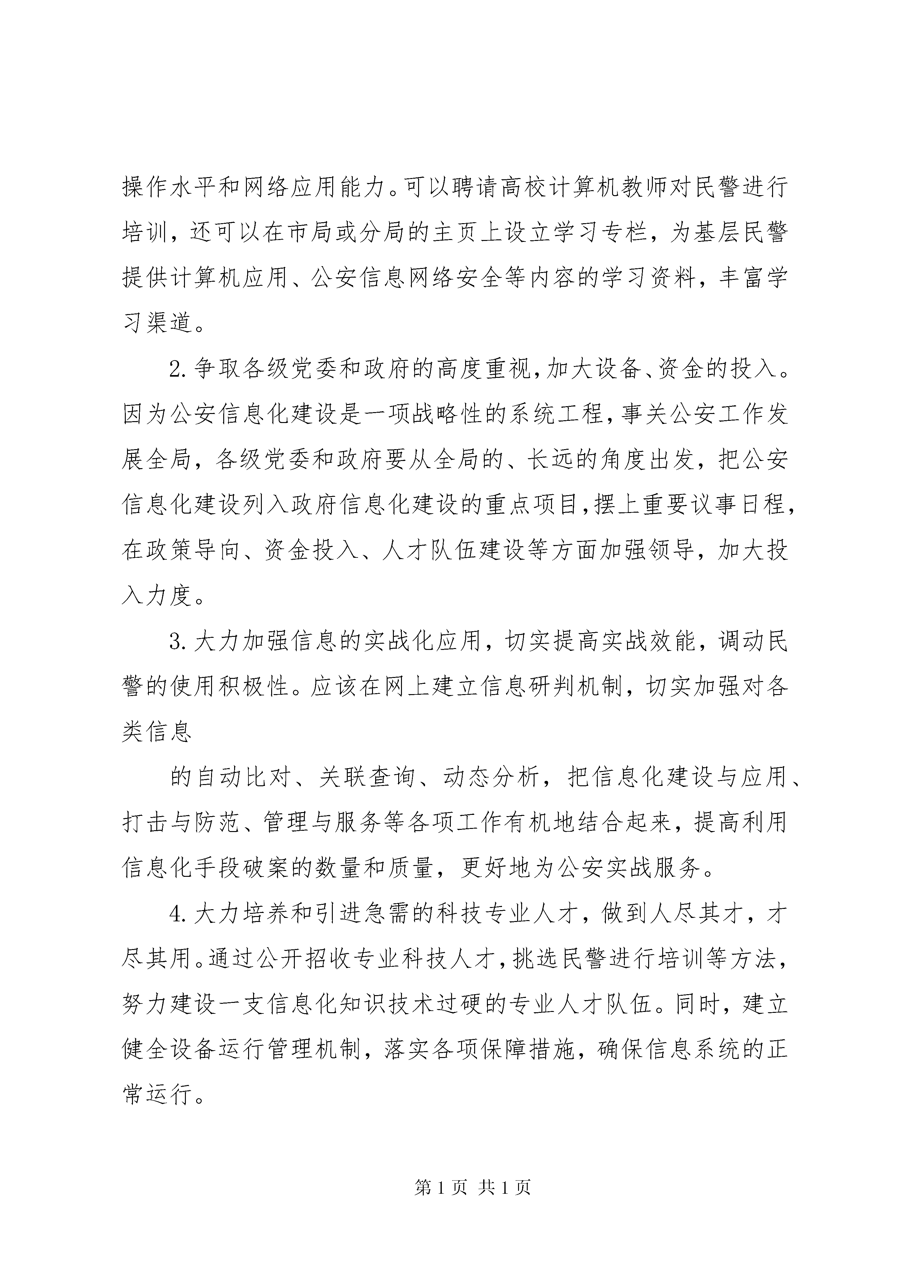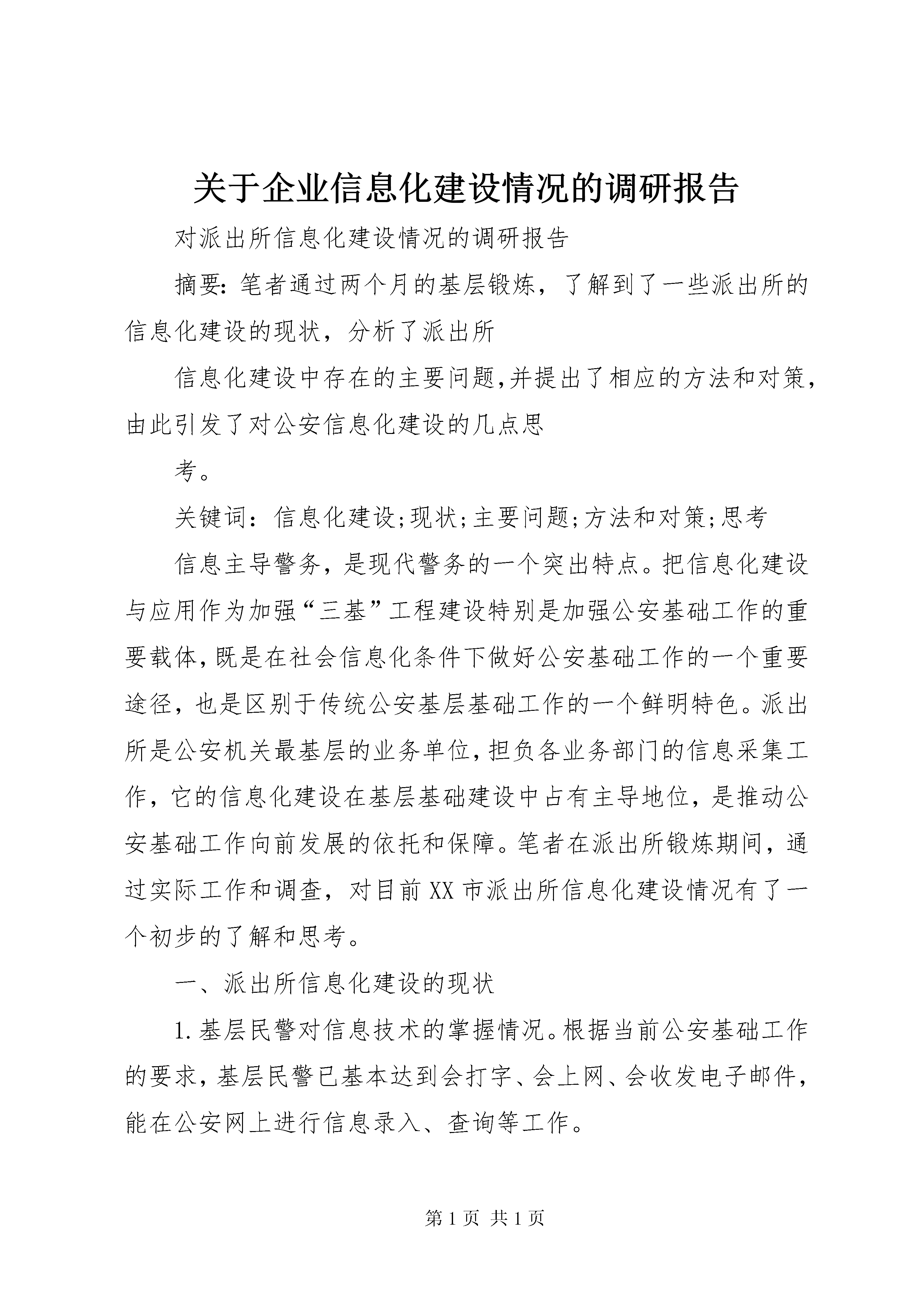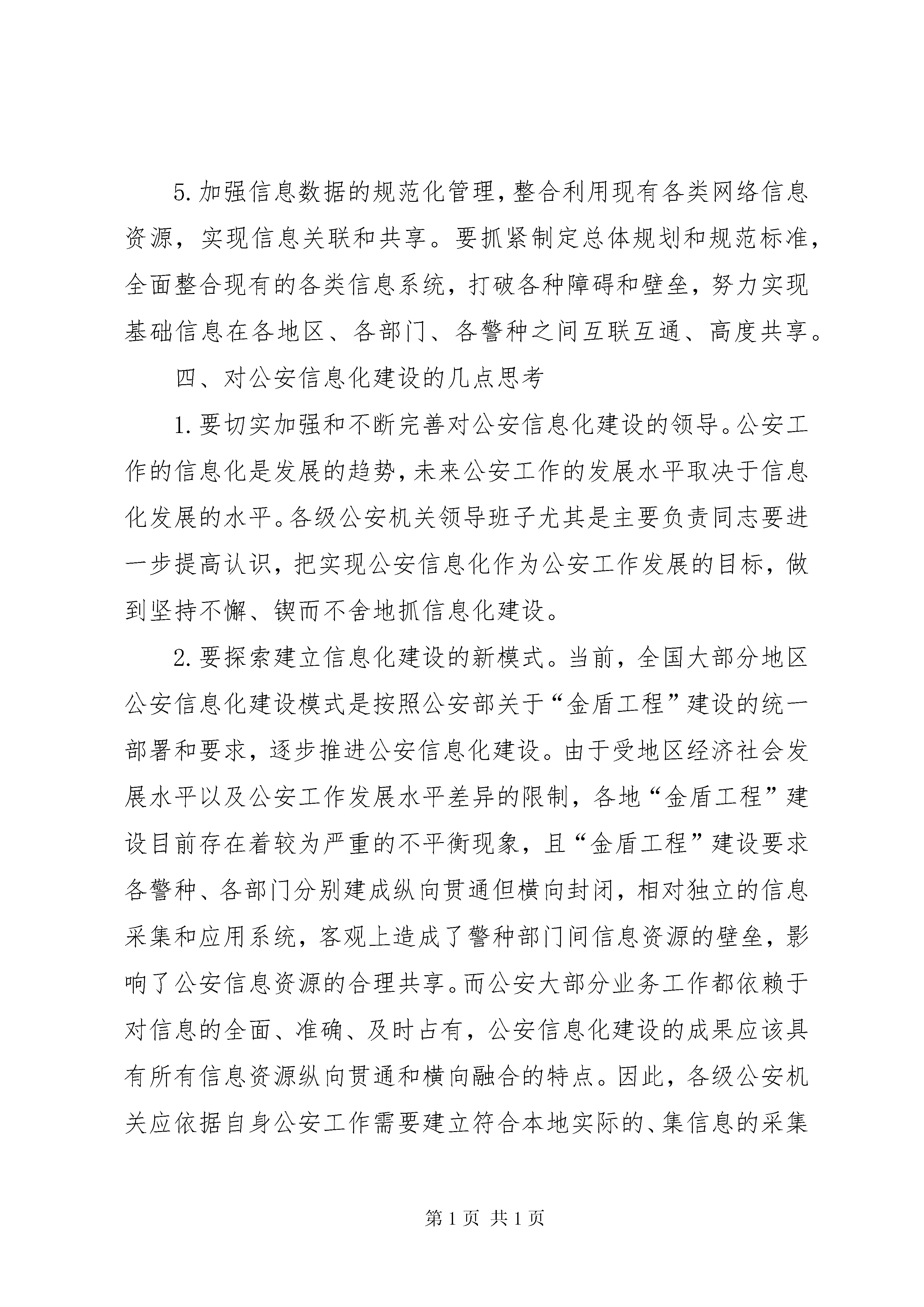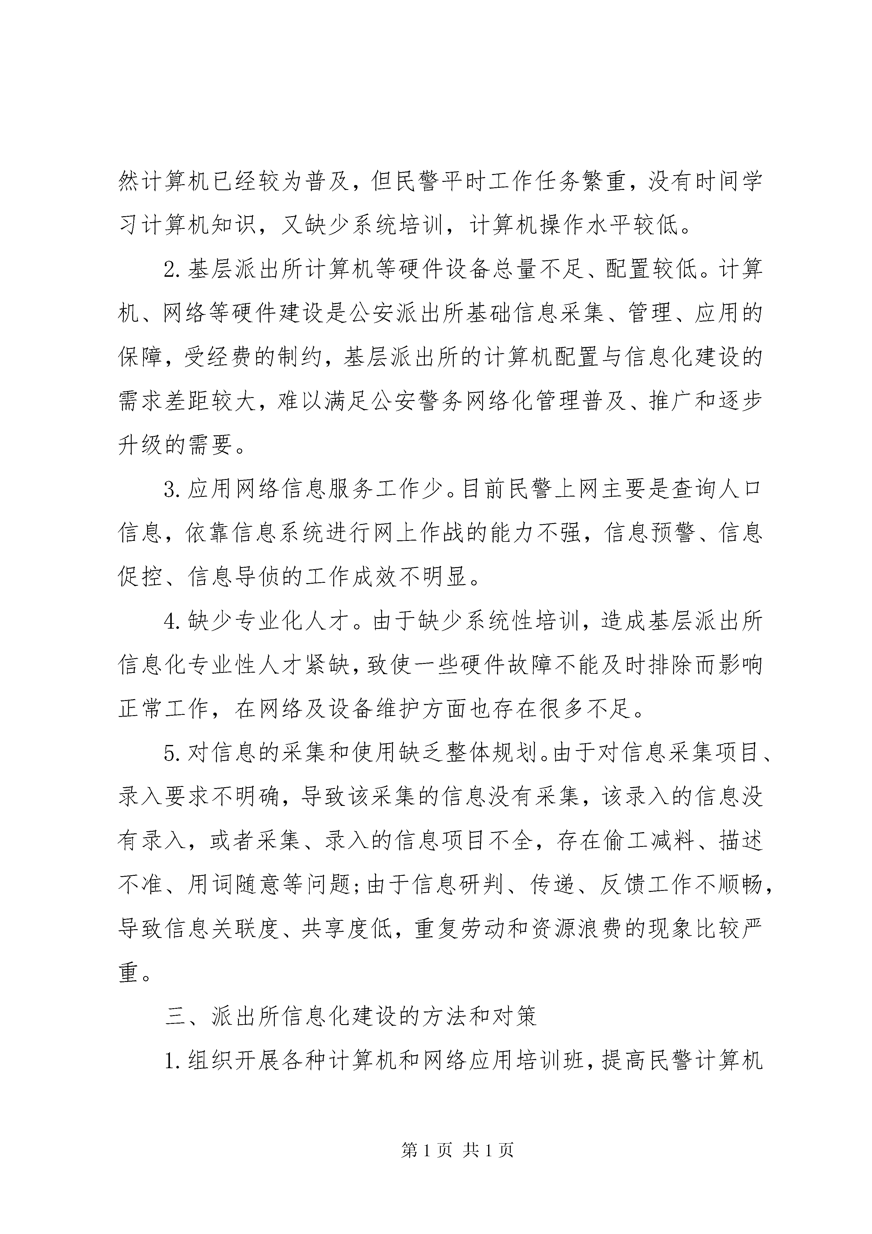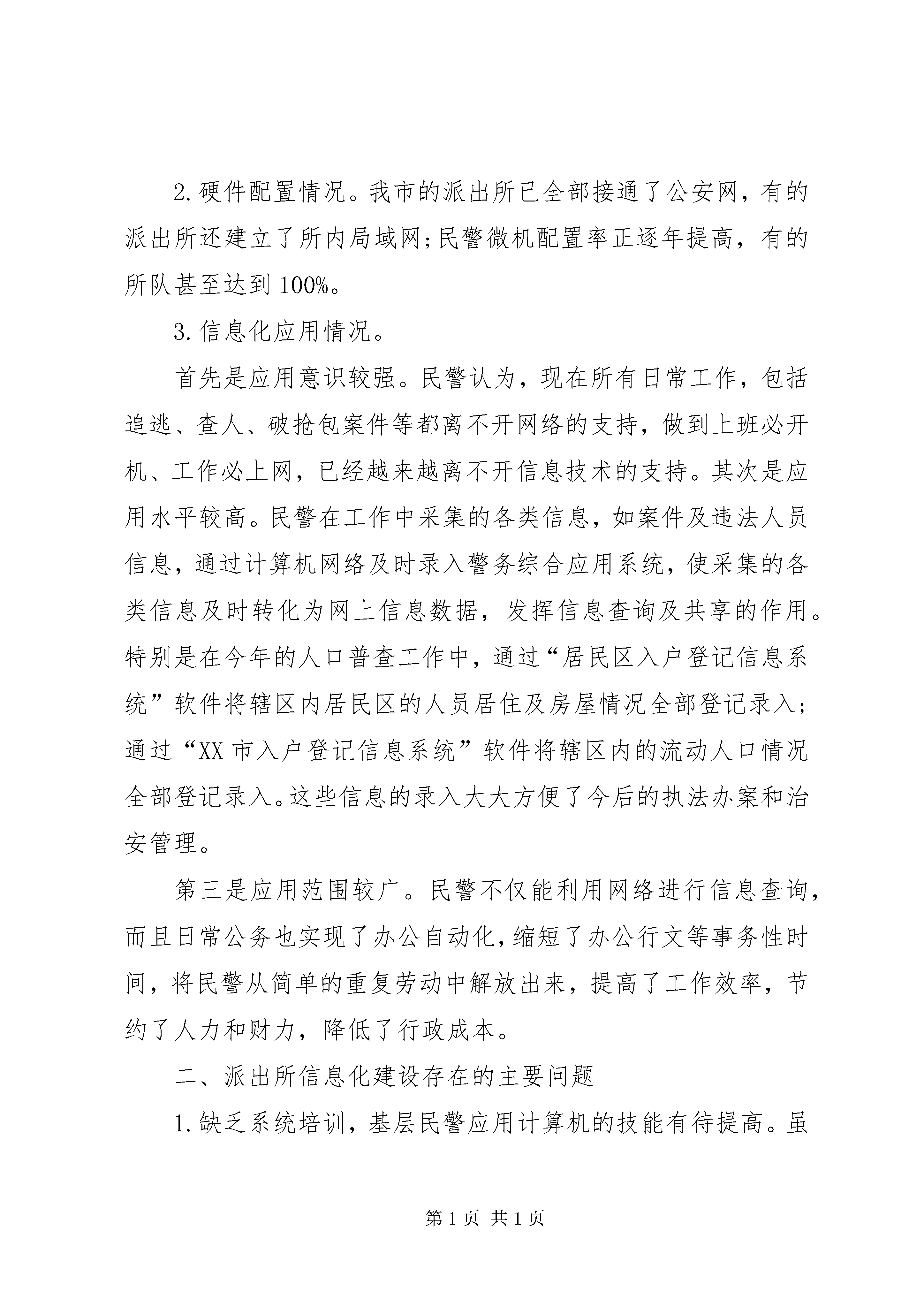 关于企业信息化建设情况的调研报告对派出所信息化建设情况的调研报告摘要:笔者通过两个月的基层锻炼,了解到了一些派出所的信息化建设的现状,分析了派出所信息化建设中存在的主要问题,并提出了相应的方法和对策,由此引发了对公安信息化建设的几点思考。关键词:信息化建设;现状;主要问题;方法和对策;思考信息主导警务,是现代警务的一个突出特点。把信息化建设与应用作为加强“三基”工程建设特别是加强公安基础工作的重要载体,既是在社会信息化条件下做好公安基础工作的一个重要途径,也是区别于传统公安基层基础工作的一个鲜明特色。派出所是公安机关最基层的业务单位,担负各业务部门的信息采集工作,它的信息化建设在基层基础建设中占有主导地位,是推动公安基础工作向前发展的依托和保障。笔者在派出所锻炼期间,通过实际工作和调查,对目前XX市派出所信息化建设情况有了一个初步的了解和思考。一、派出所信息化建设的现状1.基层民警对信息技术的掌握情况。根据当前公安基础工作的要求,基层民警已基本达到会打字、会上网、会收发电子邮件,能在公安网上进行信息录入、查询等工作。2.硬件配置情况。我市的派出所已全部接通了公安网,有的派出所还建立了所内局域网;民警微机配置率正逐年提高,有的所队甚至达到100%。3.信息化应用情况。首先是应用意识较强。民警认为,现在所有日常工作,包括追逃、查人、破抢包案件等都离不开网络的支持,做到上班必开机、工作必上网,已经越来越离不开信息技术的支持。其次是应用水平较高。民警在工作中采集的各类信息,如案件及违法人员信息,通过计算机网络及时录入警务综合应用系统,使采集的各类信息及时转化为网上信息数据,发挥信息查询及共享的作用。特别是在今年的人口普查工作中,通过“居民区入户登记信息系统”软件将辖区内居民区的人员居住及房屋情况全部登记录入;通过“XX市入户登记信息系统”软件将辖区内的流动人口情况全部登记录入。这些信息的录入大大方便了今后的执法办案和治安管理。第三是应用范围较广。民警不仅能利用网络进行信息查询,而且日常公务也实现了办公自动化,缩短了办公行文等事务性时间,将民警从简单的重复劳动中解放出来,提高了工作效率,节约了人力和财力,降低了行政成本。二、派出所信息化建设存在的主要问题1.缺乏系统培训,基层民警应用计算机的技能有待提高。虽然计算机已经较为普及,但民警平时工作任务繁重,没有时间学习计算机知识,又缺少系统培训,计算机操作水平较低。2.基层派出所计算机等硬件设备总量不足、配置较低。计算机、网络等硬件建设是公安派出所基础信息采集、管理、应用的保障,受经费的制约,基层派出所的计算机配置与信息化建设的需求差距较大,难以满足公安警务网络化管理普及、推广和逐步升级的需要。3.应用网络信息服务工作少。目前民警上网主要是查询人口信息,依靠信息系统进行网上作战的能力不强,信息预警、信息促控、信息导侦的工作成效不明显。4.缺少专业化人才。由于缺少系统性培训,造成基层派出所信息化专业性人才紧缺,致使一些硬件故障不能及时排除而影响正常工作,在网络及设备维护方面也存在很多不足。5.对信息的采集和使用缺乏整体规划。由于对信息采集项目、录入要求不明确,导致该采集的信息没有采集,该录入的信息没有录入,或者采集、录入的信息项目不全,存在偷工减料、描述不准、用词随意等问题;由于信息研判、传递、反馈工作不顺畅,导致信息关联度、共享度低,重复劳动和资源浪费的现象比较严重。三、派出所信息化建设的方法和对策1.组织开展各种计算机和网络应用培训班,提高民警计算机操作水平和网络应用能力。可以聘请高校计算机教师对民警进行培训,还可以在市局或分局的主页上设立学习专栏,为基层民警提供计算机应用、公安信息网络安全等内容的学习资料,丰富学习渠道。2.争取各级党委和政府的高度重视,加大设备、资金的投入。因为公安信息化建设是一项战略性的系统工程,事关公安工作发展全局,各级党委和政府要从全局的、长远的角度出发,把公安信息化建设列入政府信息化建设的重点项目,摆上重要议事日程,在政策导向、资金投入、人才队伍建设等方面加强领导,加大投入力度。3.大力加强信息的实战化应用,切实提高实战效能,调动民警的使用积极性。应该在网上建立信息研判机制,切实加强对各类信息的自动比对、关联查询、动态分析,把信息化建设与应用、打击与防范、管理与服务等各项工作有机地结合起来,提高利用信息化手段破案的数量和质量,更好地为公安实战服务。4.大力培养和引进急需的科技专业人才,做到人尽其才,才尽其用。通过公开招收专业科技人才,挑选民警进行培训等方法,努力建设一支信息化知识技术过硬的专业人才队伍。同时,建立健全设备运行管理机制,落实各项保障措施,确保信息系统的正常运行。5.加强信息数据的规范化管理,整合利用现有各类网络信息资源,实