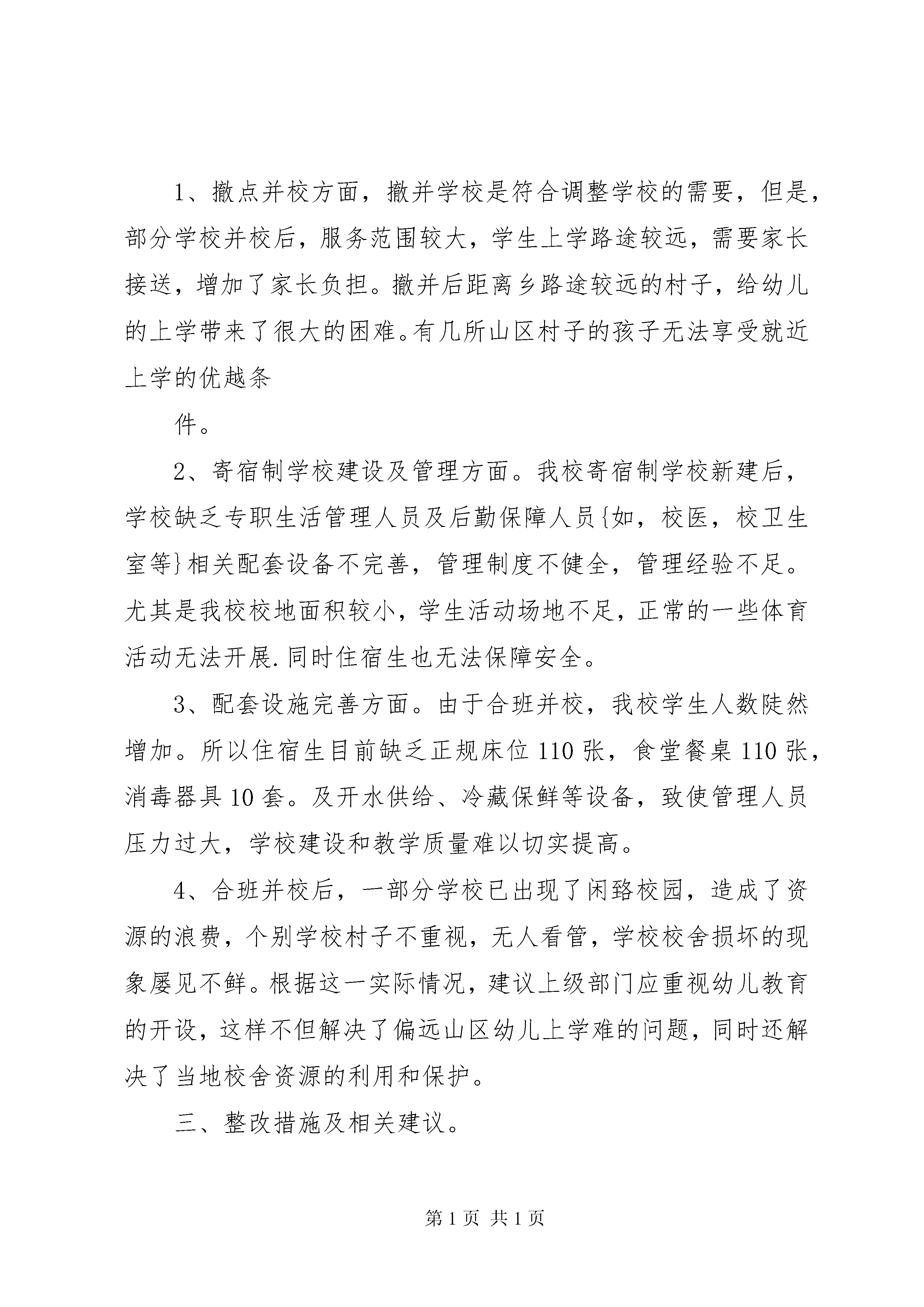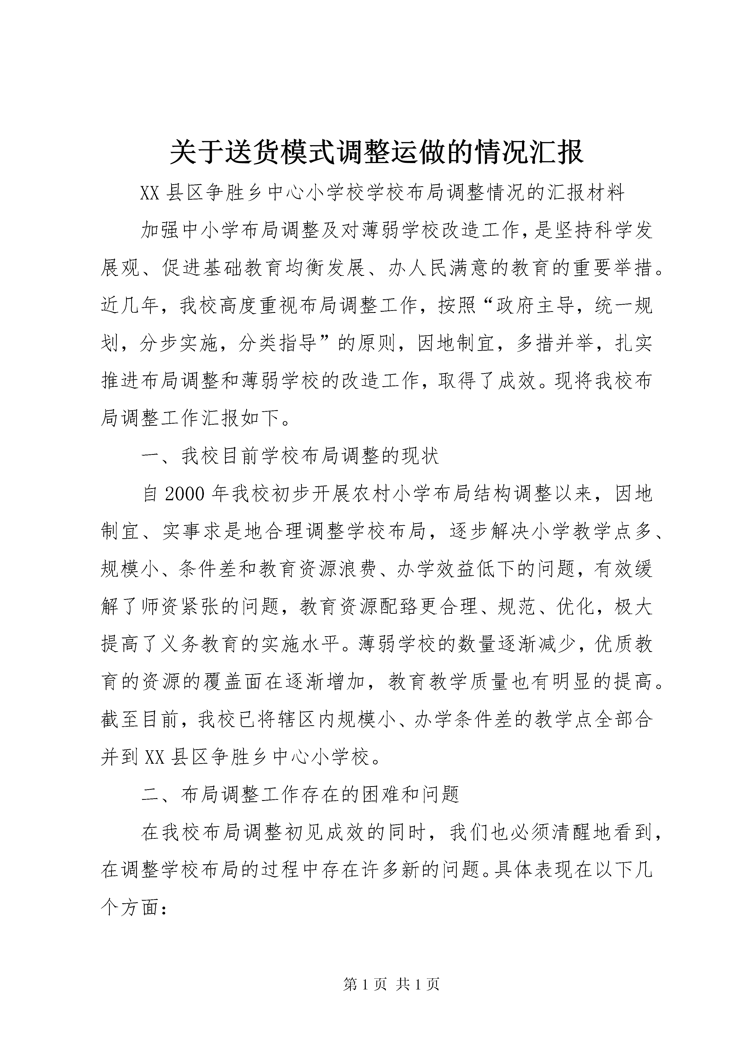 关于送货模式调整运做的情况汇报XX县区争胜乡中心小学校学校布局调整情况的汇报材料加强中小学布局调整及对薄弱学校改造工作,是坚持科学发展观、促进基础教育均衡发展、办人民满意的教育的重要举措。近几年,我校高度重视布局调整工作,按照“政府主导,统一规划,分步实施,分类指导”的原则,因地制宜,多措并举,扎实推进布局调整和薄弱学校的改造工作,取得了成效。现将我校布局调整工作汇报如下。一、我校目前学校布局调整的现状自2000年我校初步开展农村小学布局结构调整以来,因地制宜、实事求是地合理调整学校布局,逐步解决小学教学点多、规模小、条件差和教育资源浪费、办学效益低下的问题,有效缓解了师资紧张的问题,教育资源配臵更合理、规范、优化,极大提高了义务教育的实施水平。薄弱学校的数量逐渐减少,优质教育的资源的覆盖面在逐渐增加,教育教学质量也有明显的提高。截至目前,我校已将辖区内规模小、办学条件差的教学点全部合并到XX县区争胜乡中心小学校。二、布局调整工作存在的困难和问题在我校布局调整初见成效的同时,我们也必须清醒地看到,在调整学校布局的过程中存在许多新的问题。具体表现在以下几个方面:1、撤点并校方面,撤并学校是符合调整学校的需要,但是,部分学校并校后,服务范围较大,学生上学路途较远,需要家长接送,增加了家长负担。撤并后距离乡路途较远的村子,给幼儿的上学带来了很大的困难。有几所山区村子的孩子无法享受就近上学的优越条件。2、寄宿制学校建设及管理方面。我校寄宿制学校新建后,学校缺乏专职生活管理人员及后勤保障人员{如,校医,校卫生室等}相关配套设备不完善,管理制度不健全,管理经验不足。尤其是我校校地面积较小,学生活动场地不足,正常的一些体育活动无法开展.同时住宿生也无法保障安全。3、配套设施完善方面。由于合班并校,我校学生人数陡然增加。所以住宿生目前缺乏正规床位110张,食堂餐桌110张,消毒器具10套。及开水供给、冷藏保鲜等设备,致使管理人员压力过大,学校建设和教学质量难以切实提高。4、合班并校后,一部分学校已出现了闲臵校园,造成了资源的浪费,个别学校村子不重视,无人看管,学校校舍损坏的现象屡见不鲜。根据这一实际情况,建议上级部门应重视幼儿教育的开设,这样不但解决了偏远山区幼儿上学难的问题,同时还解决了当地校舍资源的利用和保护。三、整改措施及相关建议。1、学习先进经验,完善管理制度,提高管理能力。2、筹措资金,合理利用资金,补充设施的不足,逐步将学校办成群众满意的寄宿制学校。3、建议上级部门协调解决校园活动场地不足的问题。