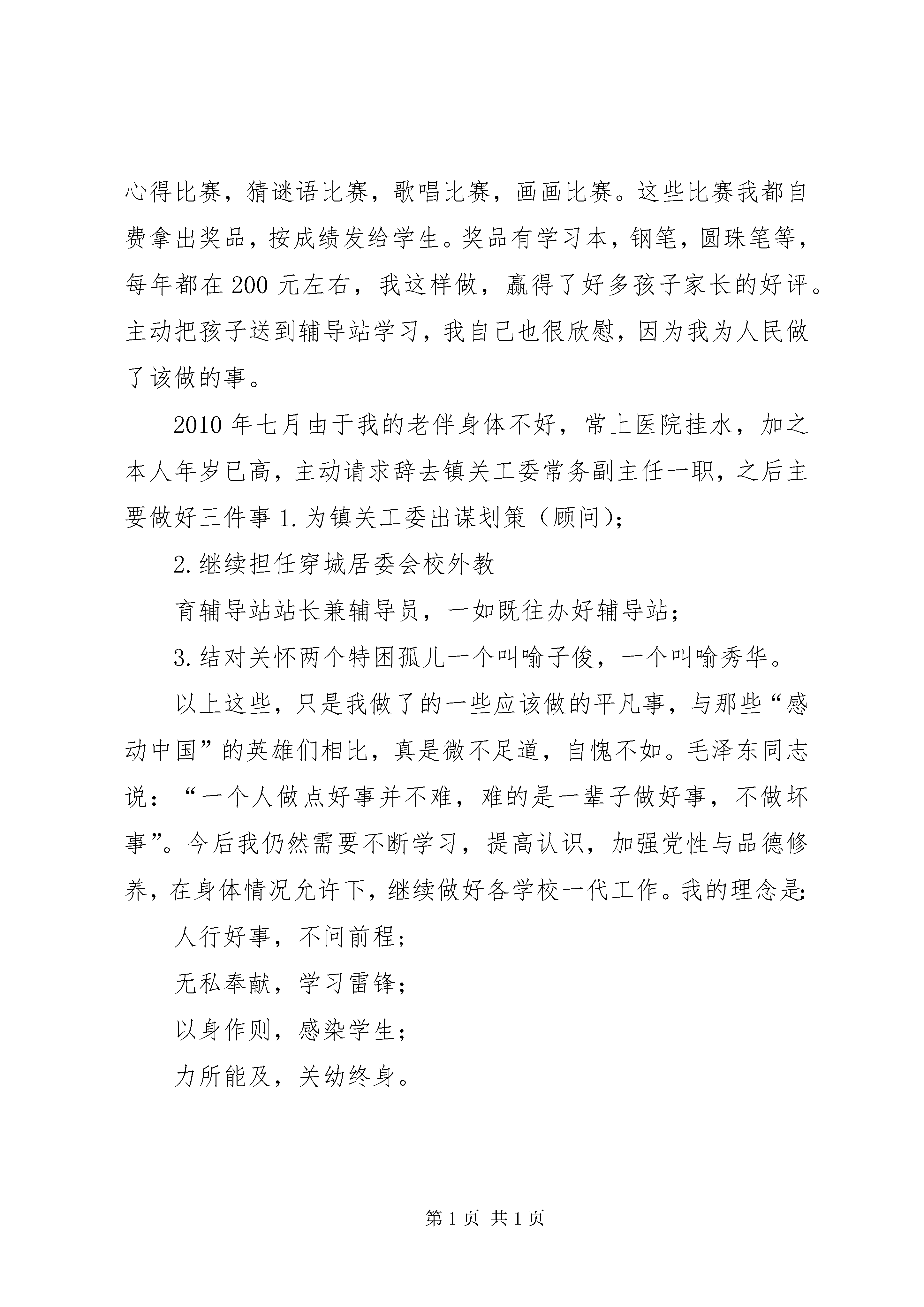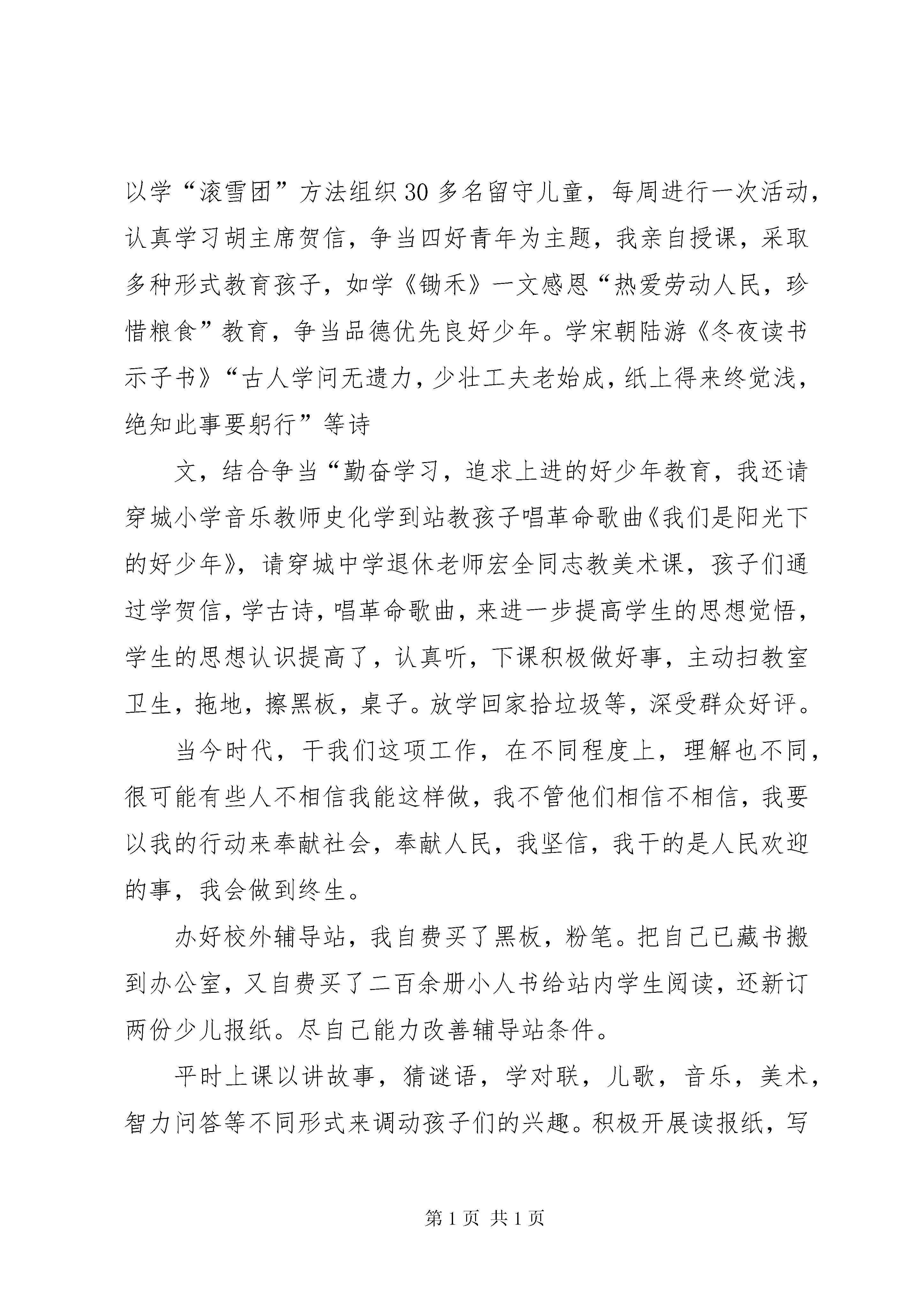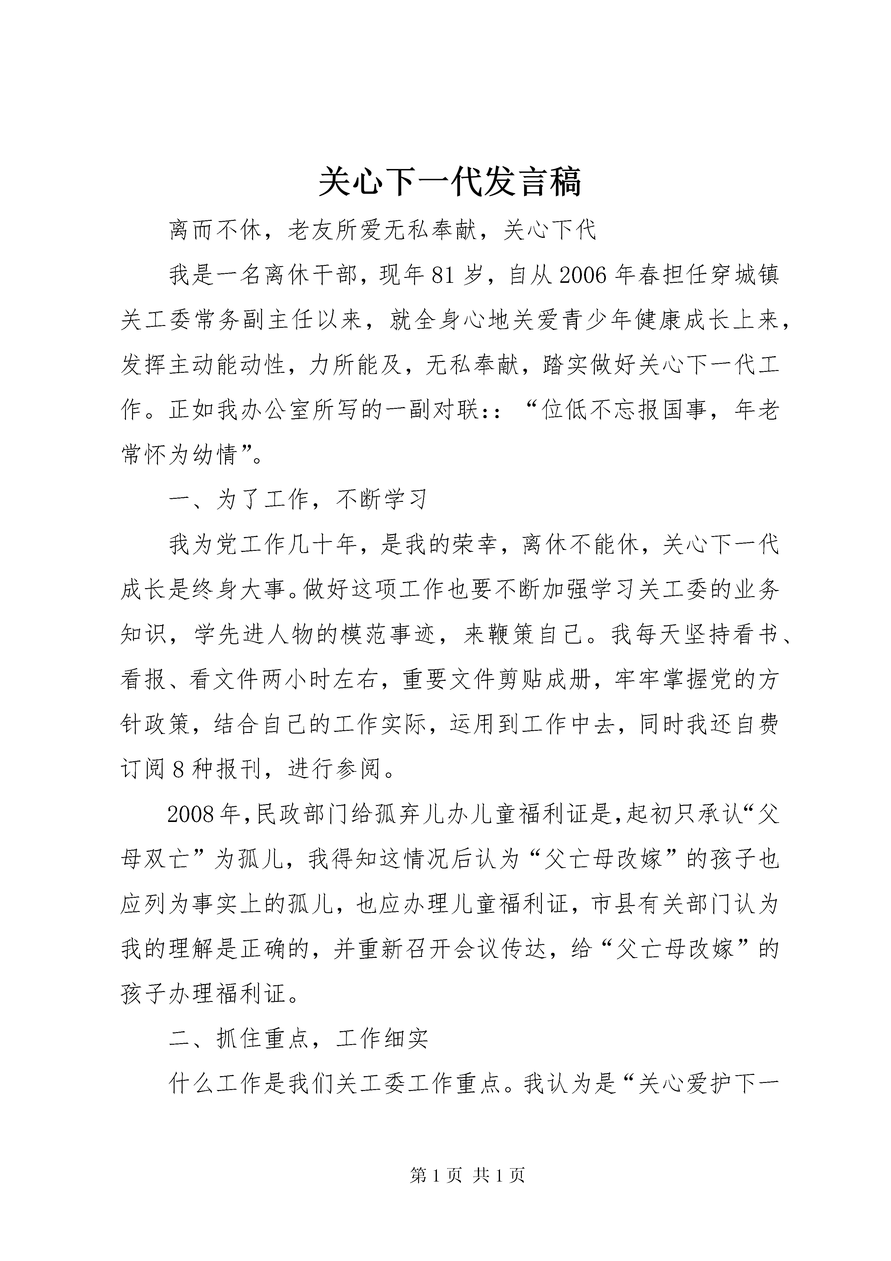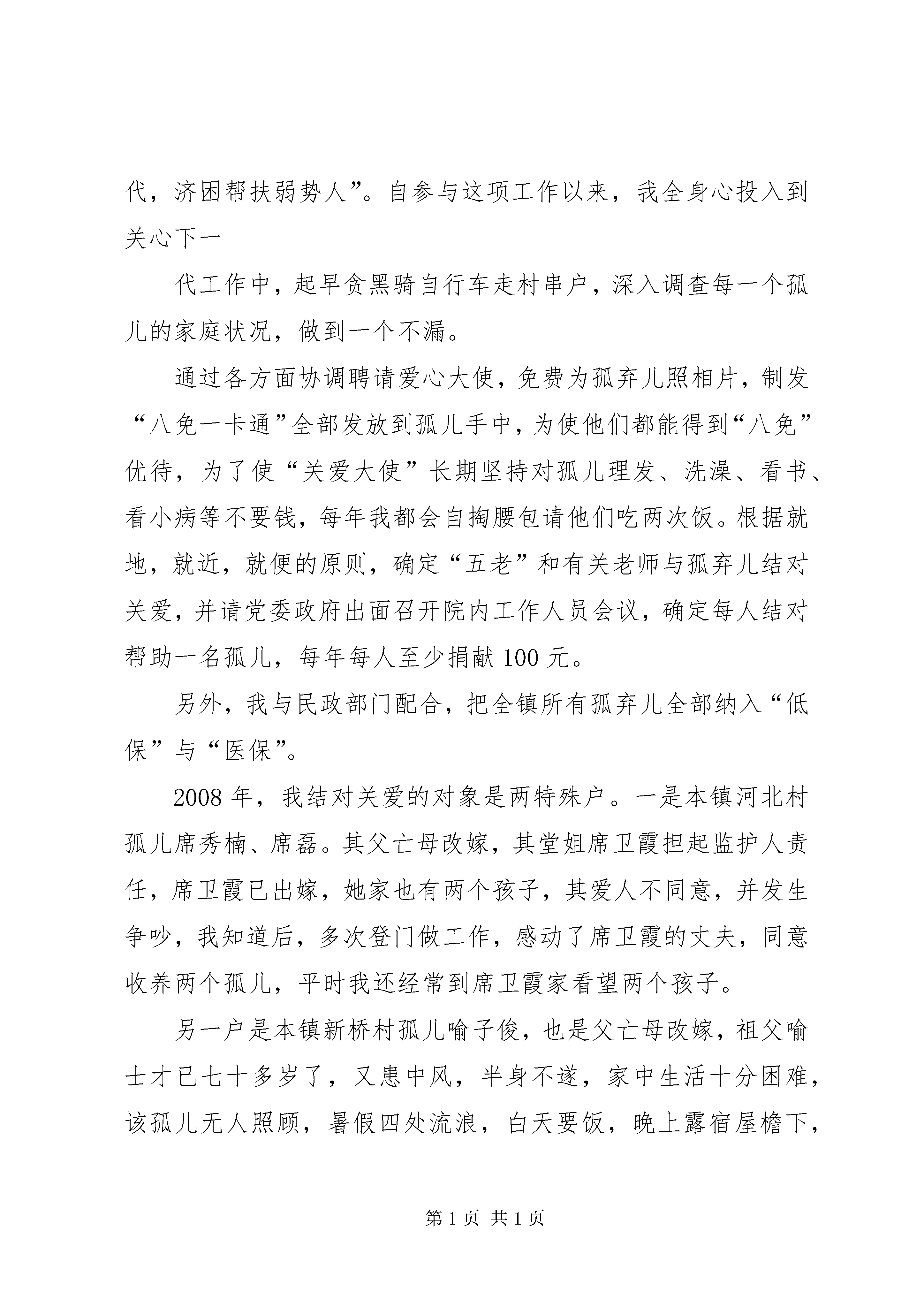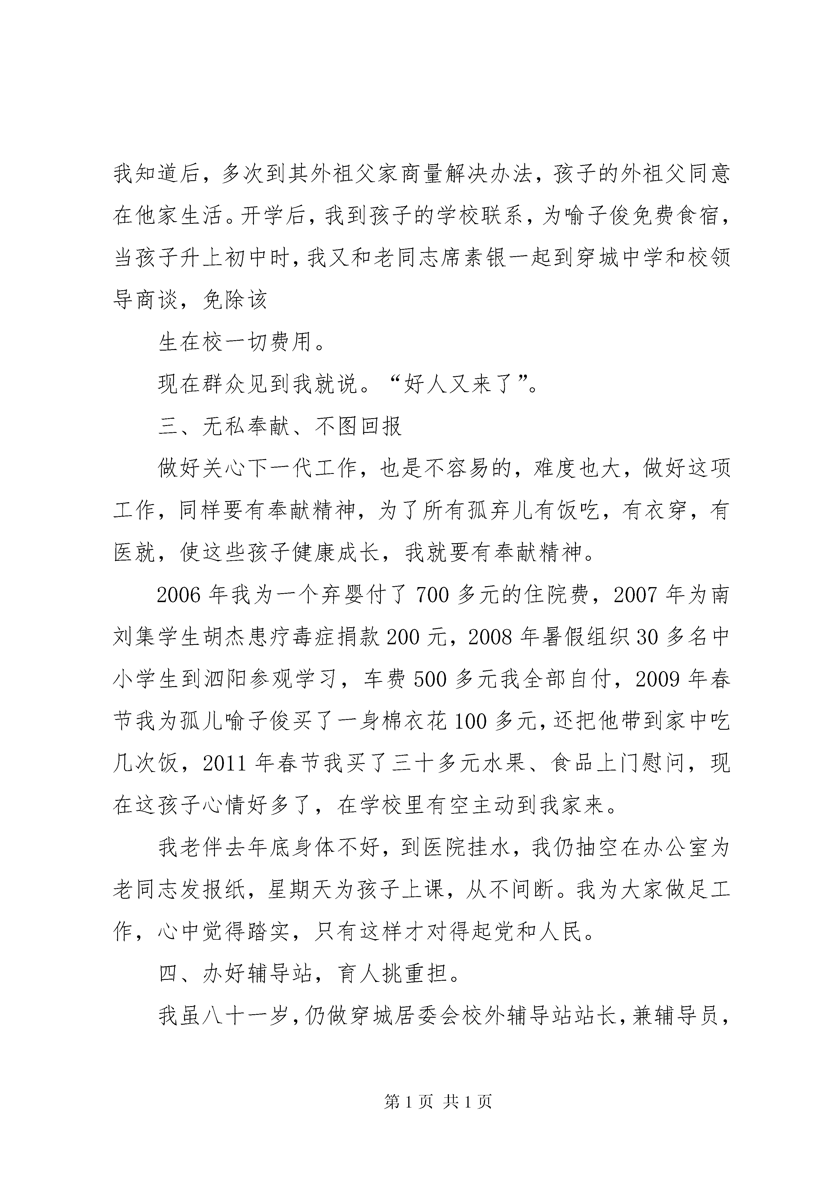 关心下一代发言稿离而不休,老友所爱无私奉献,关心下代我是一名离休干部,现年81岁,自从2006年春担任穿城镇关工委常务副主任以来,就全身心地关爱青少年健康成长上来,发挥主动能动性,力所能及,无私奉献,踏实做好关心下一代工作。正如我办公室所写的一副对联::“位低不忘报国事,年老常怀为幼情”。一、为了工作,不断学习我为党工作几十年,是我的荣幸,离休不能休,关心下一代成长是终身大事。做好这项工作也要不断加强学习关工委的业务知识,学先进人物的模范事迹,来鞭策自己。我每天坚持看书、看报、看文件两小时左右,重要文件剪贴成册,牢牢掌握党的方针政策,结合自己的工作实际,运用到工作中去,同时我还自费订阅8种报刊,进行参阅。2008年,民政部门给孤弃儿办儿童福利证是,起初只承认“父母双亡”为孤儿,我得知这情况后认为“父亡母改嫁”的孩子也应列为事实上的孤儿,也应办理儿童福利证,市县有关部门认为我的理解是正确的,并重新召开会议传达,给“父亡母改嫁”的孩子办理福利证。二、抓住重点,工作细实什么工作是我们关工委工作重点。我认为是“关心爱护下一代,济困帮扶弱势人”。自参与这项工作以来,我全身心投入到关心下一代工作中,起早贪黑骑自行车走村串户,深入调查每一个孤儿的家庭状况,做到一个不漏。通过各方面协调聘请爱心大使,免费为孤弃儿照相片,制发“八免一卡通”全部发放到孤儿手中,为使他们都能得到“八免”优待,为了使“关爱大使”长期坚持对孤儿理发、洗澡、看书、看小病等不要钱,每年我都会自掏腰包请他们吃两次饭。根据就地,就近,就便的原则,确定“五老”和有关老师与孤弃儿结对关爱,并请党委政府出面召开院内工作人员会议,确定每人结对帮助一名孤儿,每年每人至少捐献100元。另外,我与民政部门配合,把全镇所有孤弃儿全部纳入“低保”与“医保”。2008年,我结对关爱的对象是两特殊户。一是本镇河北村孤儿席秀楠、席磊。其父亡母改嫁,其堂姐席卫霞担起监护人责任,席卫霞已出嫁,她家也有两个孩子,其爱人不同意,并发生争吵,我知道后,多次登门做工作,感动了席卫霞的丈夫,同意收养两个孤儿,平时我还经常到席卫霞家看望两个孩子。另一户是本镇新桥村孤儿喻子俊,也是父亡母改嫁,祖父喻士才已七十多岁了,又患中风,半身不遂,家中生活十分困难,该孤儿无人照顾,暑假四处流浪,白天要饭,晚上露宿屋檐下,我知道后,多次到其外祖父家商量解决办法,孩子的外祖父同意在他家生活。开学后,我到孩子的学校联系,为喻子俊免费食宿,当孩子升上初中时,我又和老同志席素银一起到穿城中学和校领导商谈,免除该生在校一切费用。现在群众见到我就说。“好人又来了”。三、无私奉献、不图回报做好关心下一代工作,也是不容易的,难度也大,做好这项工作,同样要有奉献精神,为了所有孤弃儿有饭吃,有衣穿,有医就,使这些孩子健康成长,我就要有奉献精神。2006年我为一个弃婴付了700多元的住院费,2007年为南刘集学生胡杰患疗毒症捐款200元,2008年暑假组织30多名中小学生到泗阳参观学习,车费500多元我全部自付,2009年春节我为孤儿喻子俊买了一身棉衣花100多元,还把他带到家中吃几次饭,2011年春节我买了三十多元水果、食品上门慰问,现在这孩子心情好多了,在学校里有空主动到我家来。我老伴去年底身体不好,到医院挂水,我仍抽空在办公室为老同志发报纸,星期天为孩子上课,从不间断。我为大家做足工作,心中觉得踏实,只有这样才对得起党和人民。四、办好辅导站,育人挑重担。我虽八十一岁,仍做穿城居委会校外辅导站站长,兼辅导员,以学“滚雪团”方法组织30多名留守儿童,每周进行一次活动,认真学习胡主席贺信,争当四好青年为主题,我亲自授课,采取多种形式教育孩子,如学《锄禾》一文感恩“热爱劳动人民,珍惜粮食”教育,争当品德优先良好少年。学宋朝陆游《冬夜读书示子书》“古人学问无遗力,少壮工夫老始成,纸上得来终觉浅,绝知此事要躬行”等诗文,结合争当“勤奋学习,追求上进的好少年教育,我还请穿城小学音乐教师史化学到站教孩子唱革命歌曲《我们是阳光下的好少年》,请穿城中学退休老师宏全同志教美术课,孩子们通过学贺信,学古诗,唱革命歌曲,来进一步提高学生的思想觉悟,学生的思想认识提高了,认真听,下课积极做好事,主动扫教室卫生,拖地,擦黑板,桌子。放学回家拾垃圾等,深受群众好评。当今时代,干我们这项工作,在不同程度上,理解也不同,很可能有些人不相信我能这样做,我不管他们相信不相信,我要以我的行动来奉献社会,奉献人民,我坚信,我干的是人民欢迎的事,我会做到终生。办好校外辅导站,我自费买了黑板,粉笔。把自己已藏书搬到办公室,又自费买了二百余册小人书给站内学生阅读,还新订两份少儿报纸。尽自己能力改善辅导站条件。平时上课以讲故事,猜谜语,学对联,儿歌,音乐,美术,智力问答等不
