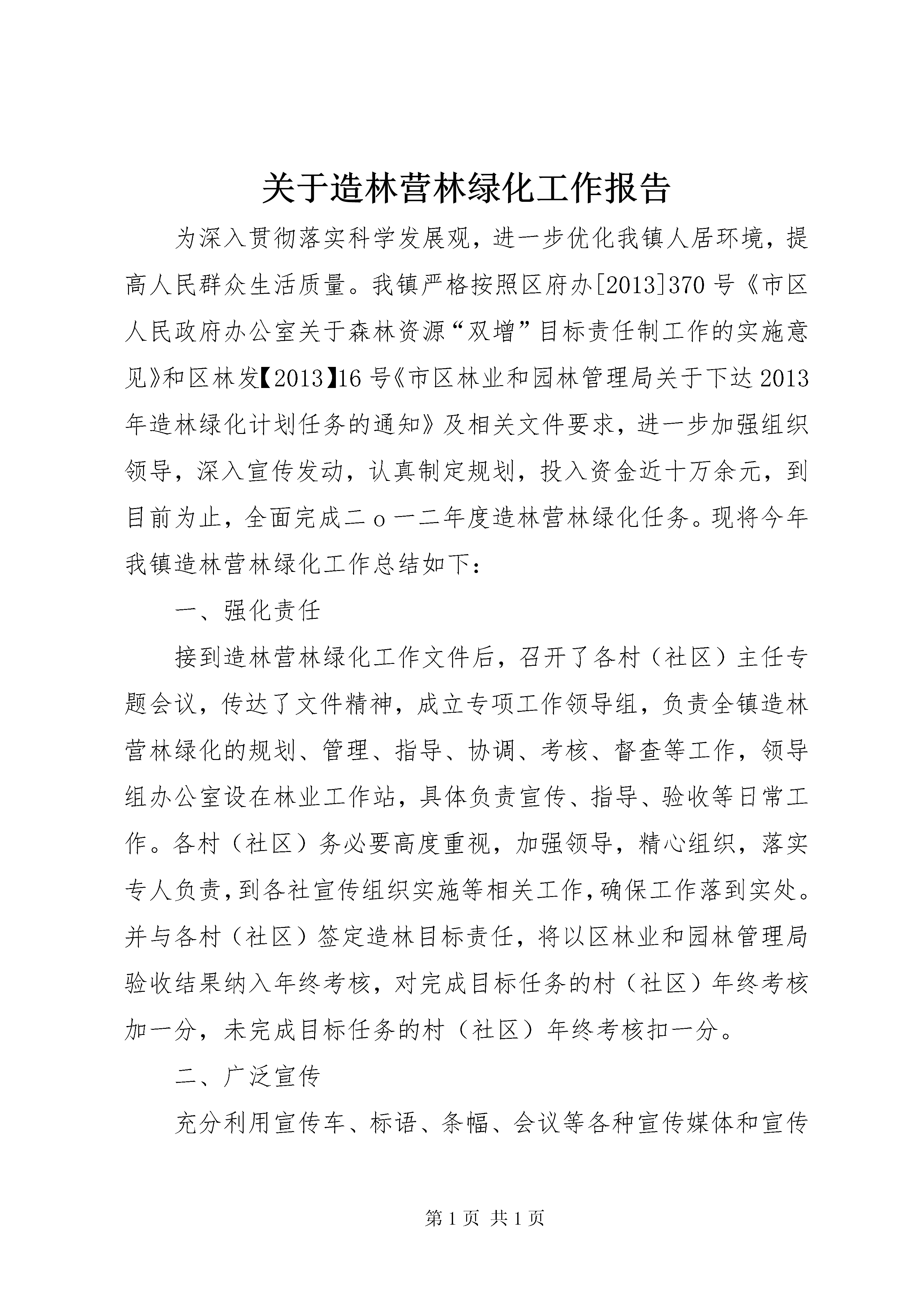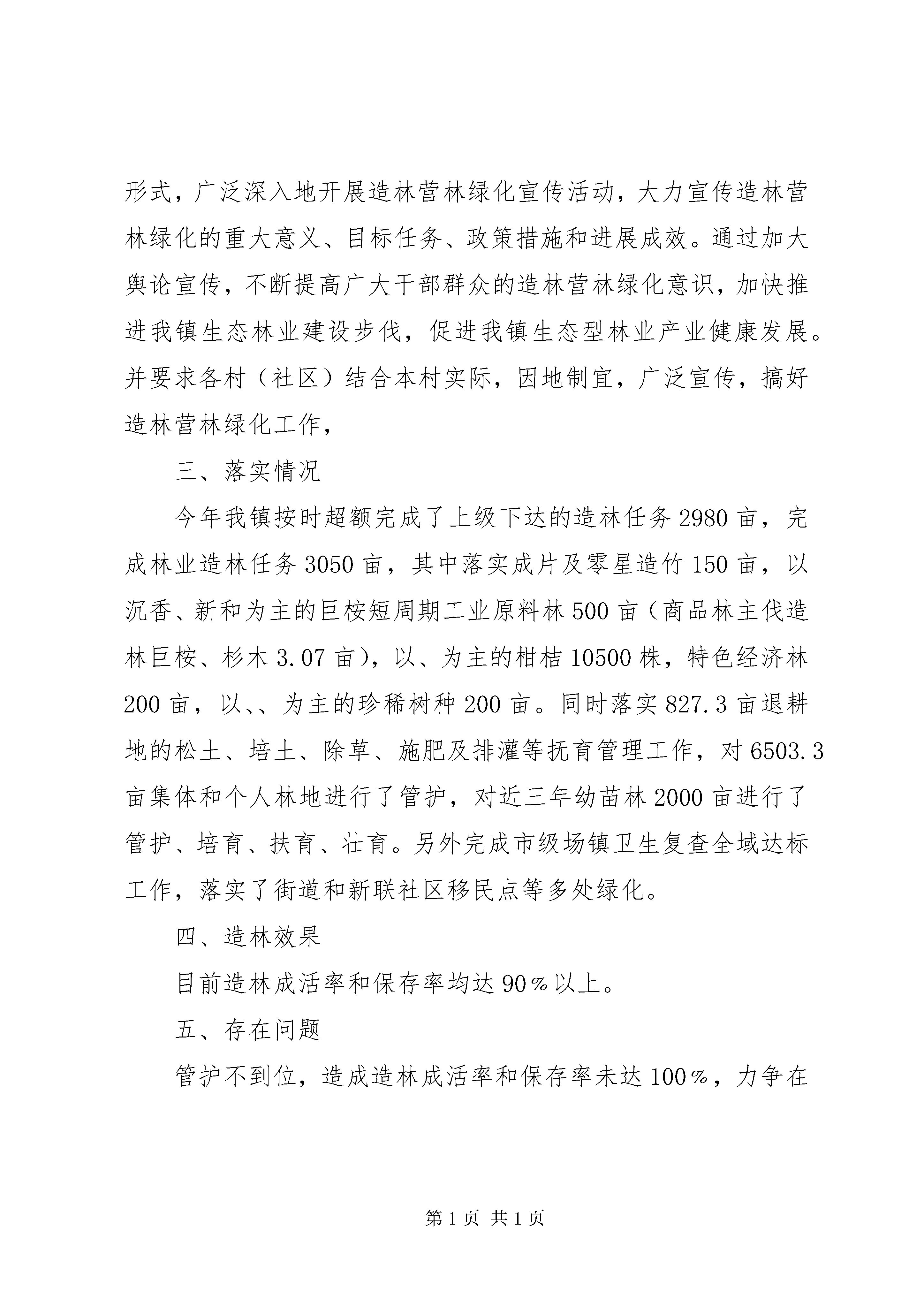 关于造林营林绿化工作报告为深入贯彻落实科学发展观,进一步优化我镇人居环境,提高人民群众生活质量。我镇严格按照区府办[2013]370号《市区人民政府办公室关于森林资源“双增”目标责任制工作的实施意见》和区林发【2013】16号《市区林业和园林管理局关于下达2013年造林绿化计划任务的通知》及相关文件要求,进一步加强组织领导,深入宣传发动,认真制定规划,投入资金近十万余元,到目前为止,全面完成二o一二年度造林营林绿化任务。现将今年我镇造林营林绿化工作总结如下:一、强化责任接到造林营林绿化工作文件后,召开了各村(社区)主任专题会议,传达了文件精神,成立专项工作领导组,负责全镇造林营林绿化的规划、管理、指导、协调、考核、督查等工作,领导组办公室设在林业工作站,具体负责宣传、指导、验收等日常工作。各村(社区)务必要高度重视,加强领导,精心组织,落实专人负责,到各社宣传组织实施等相关工作,确保工作落到实处。并与各村(社区)签定造林目标责任,将以区林业和园林管理局验收结果纳入年终考核,对完成目标任务的村(社区)年终考核加一分,未完成目标任务的村(社区)年终考核扣一分。二、广泛宣传充分利用宣传车、标语、条幅、会议等各种宣传媒体和宣传形式,广泛深入地开展造林营林绿化宣传活动,大力宣传造林营林绿化的重大意义、目标任务、政策措施和进展成效。通过加大舆论宣传,不断提高广大干部群众的造林营林绿化意识,加快推进我镇生态林业建设步伐,促进我镇生态型林业产业健康发展。并要求各村(社区)结合本村实际,因地制宜,广泛宣传,搞好造林营林绿化工作,三、落实情况今年我镇按时超额完成了上级下达的造林任务2980亩,完成林业造林任务3050亩,其中落实成片及零星造竹150亩,以沉香、新和为主的巨桉短周期工业原料林500亩(商品林主伐造林巨桉、杉木3.07亩),以、为主的柑桔10500株,特色经济林200亩,以、、为主的珍稀树种200亩。同时落实827.3亩退耕地的松土、培土、除草、施肥及排灌等抚育管理工作,对6503.3亩集体和个人林地进行了管护,对近三年幼苗林2000亩进行了管护、培育、扶育、壮育。另外完成市级场镇卫生复查全域达标工作,落实了街道和新联社区移民点等多处绿化。四、造林效果目前造林成活率和保存率均达90﹪以上。五、存在问题管护不到位,造成造林成活率和保存率未达100﹪,力争在明年春季进行全面补植。
