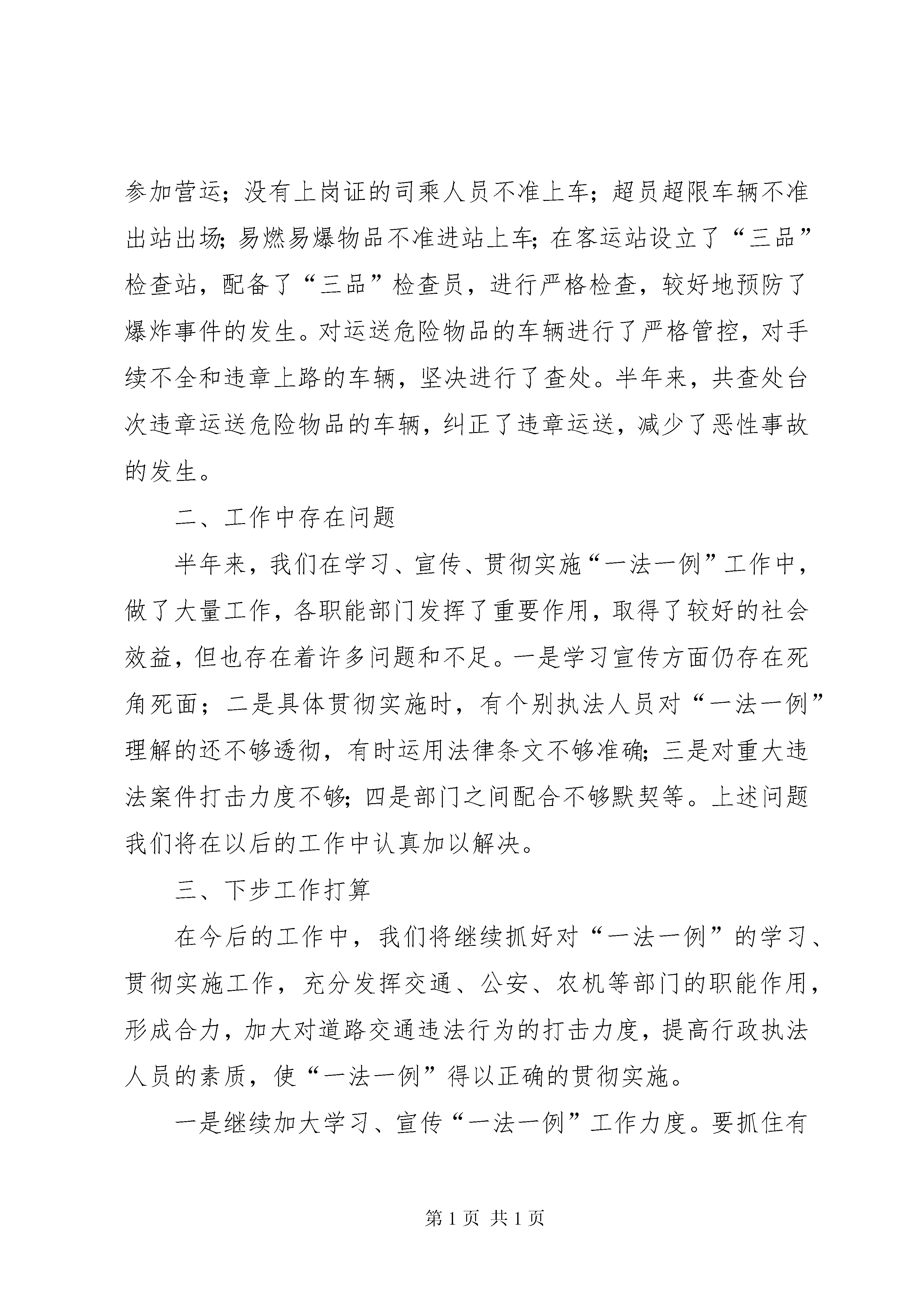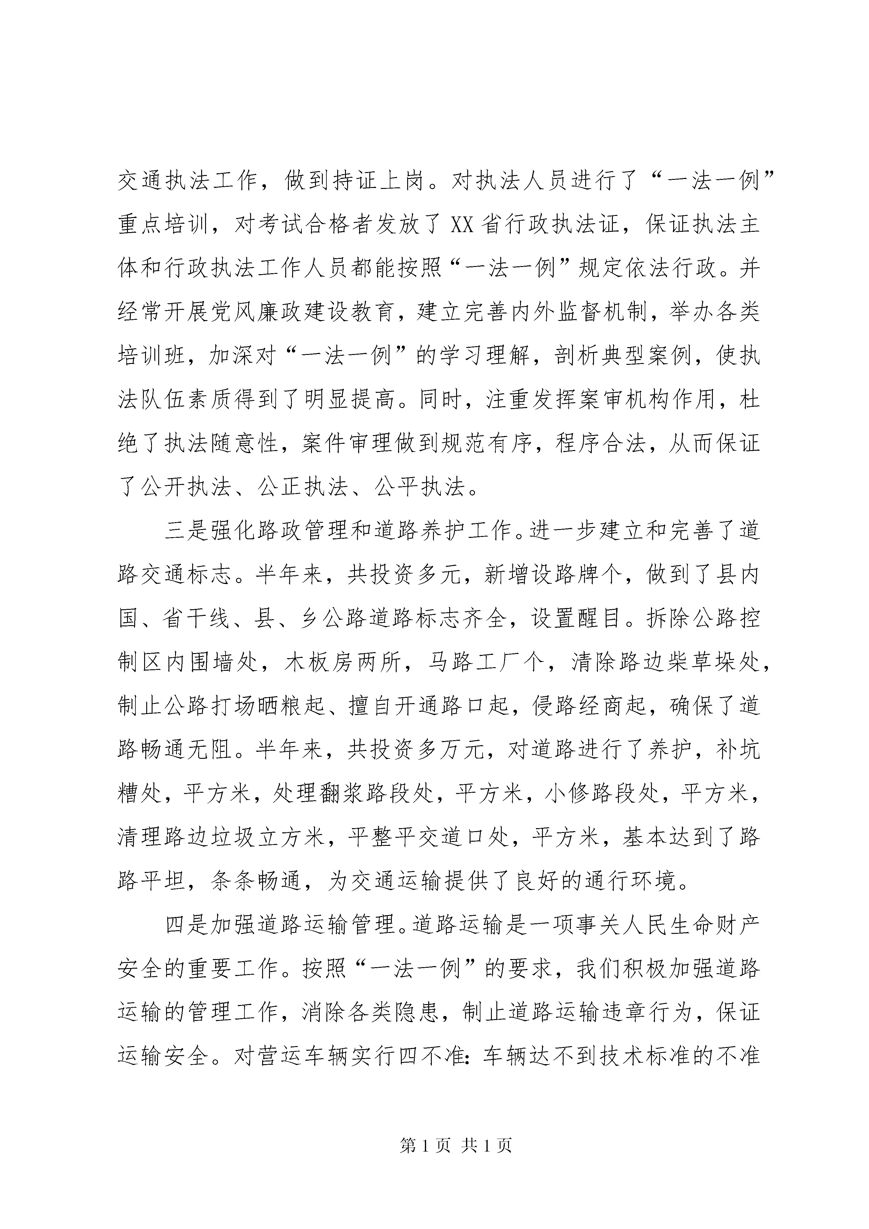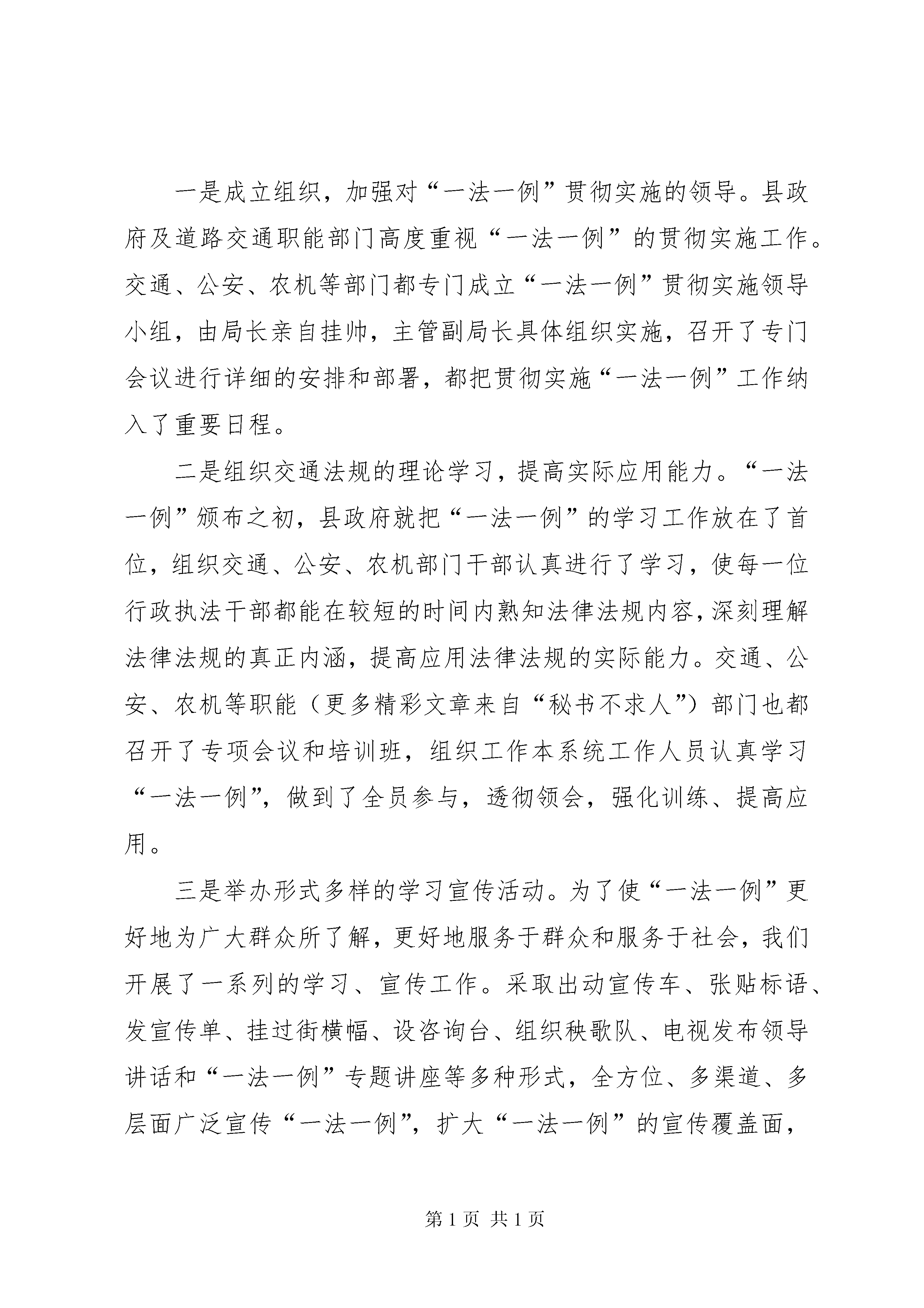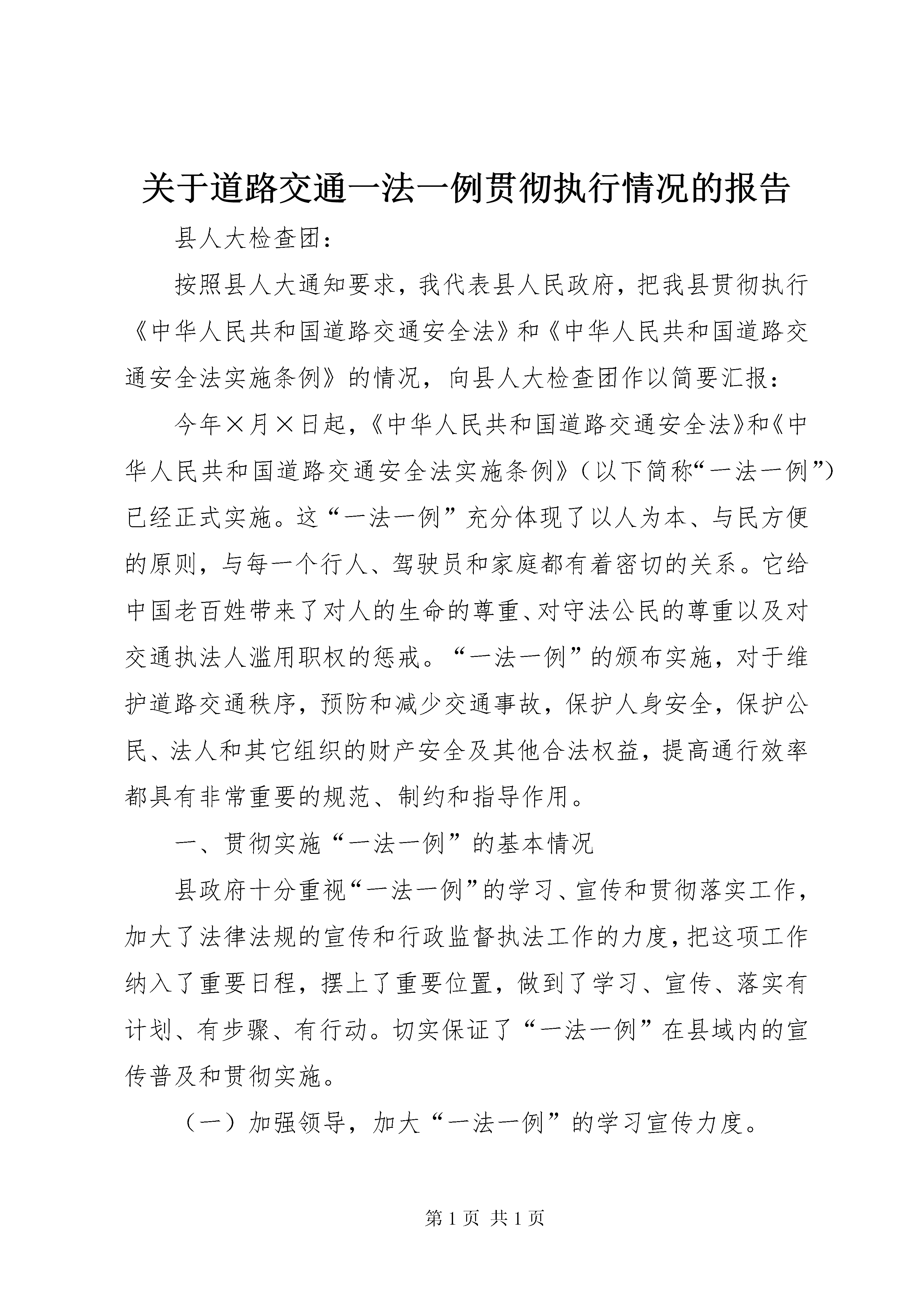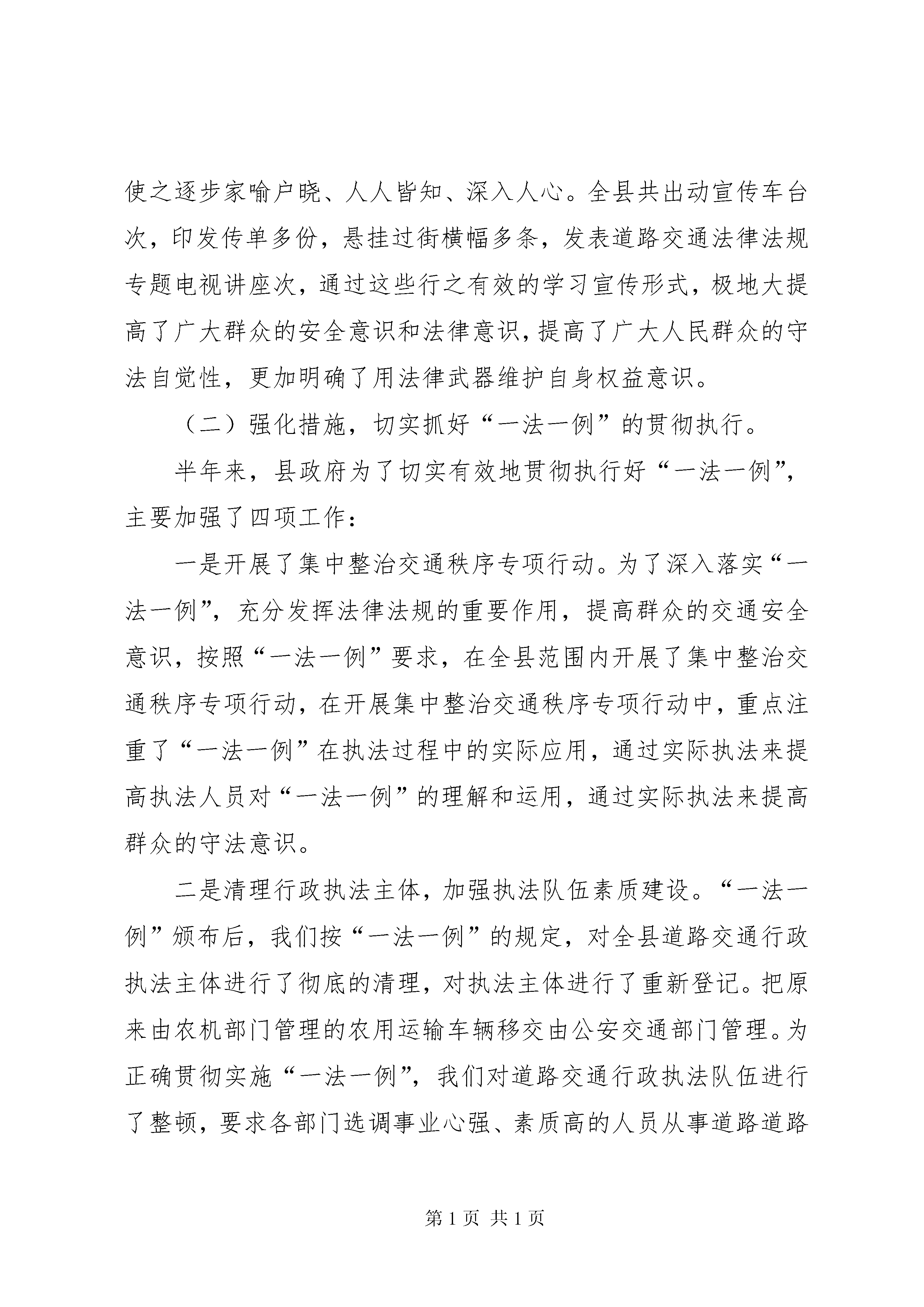 关于道路交通一法一例贯彻执行情况的报告县人大检查团:按照县人大通知要求,我代表县人民政府,把我县贯彻执行《中华人民共和国道路交通安全法》和《中华人民共和国道路交通安全法实施条例》的情况,向县人大检查团作以简要汇报:今年×月×日起,《中华人民共和国道路交通安全法》和《中华人民共和国道路交通安全法实施条例》(以下简称“一法一例”)已经正式实施。这“一法一例”充分体现了以人为本、与民方便的原则,与每一个行人、驾驶员和家庭都有着密切的关系。它给中国老百姓带来了对人的生命的尊重、对守法公民的尊重以及对交通执法人滥用职权的惩戒。“一法一例”的颁布实施,对于维护道路交通秩序,预防和减少交通事故,保护人身安全,保护公民、法人和其它组织的财产安全及其他合法权益,提高通行效率都具有非常重要的规范、制约和指导作用。一、贯彻实施“一法一例”的基本情况县政府十分重视“一法一例”的学习、宣传和贯彻落实工作,加大了法律法规的宣传和行政监督执法工作的力度,把这项工作纳入了重要日程,摆上了重要位置,做到了学习、宣传、落实有计划、有步骤、有行动。切实保证了“一法一例”在县域内的宣传普及和贯彻实施。(一)加强领导,加大“一法一例”的学习宣传力度。一是成立组织,加强对“一法一例”贯彻实施的领导。县政府及道路交通职能部门高度重视“一法一例”的贯彻实施工作。交通、公安、农机等部门都专门成立“一法一例”贯彻实施领导小组,由局长亲自挂帅,主管副局长具体组织实施,召开了专门会议进行详细的安排和部署,都把贯彻实施“一法一例”工作纳入了重要日程。二是组织交通法规的理论学习,提高实际应用能力。“一法一例”颁布之初,县政府就把“一法一例”的学习工作放在了首位,组织交通、公安、农机部门干部认真进行了学习,使每一位行政执法干部都能在较短的时间内熟知法律法规内容,深刻理解法律法规的真正内涵,提高应用法律法规的实际能力。交通、公安、农机等职能(更多精彩文章来自“秘书不求人”)部门也都召开了专项会议和培训班,组织工作本系统工作人员认真学习“一法一例”,做到了全员参与,透彻领会,强化训练、提高应用。三是举办形式多样的学习宣传活动。为了使“一法一例”更好地为广大群众所了解,更好地服务于群众和服务于社会,我们开展了一系列的学习、宣传工作。采取出动宣传车、张贴标语、发宣传单、挂过街横幅、设咨询台、组织秧歌队、电视发布领导讲话和“一法一例”专题讲座等多种形式,全方位、多渠道、多层面广泛宣传“一法一例”,扩大“一法一例”的宣传覆盖面,使之逐步家喻户晓、人人皆知、深入人心。全县共出动宣传车台次,印发传单多份,悬挂过街横幅多条,发表道路交通法律法规专题电视讲座次,通过这些行之有效的学习宣传形式,极地大提高了广大群众的安全意识和法律意识,提高了广大人民群众的守法自觉性,更加明确了用法律武器维护自身权益意识。(二)强化措施,切实抓好“一法一例”的贯彻执行。半年来,县政府为了切实有效地贯彻执行好“一法一例”,主要加强了四项工作:一是开展了集中整治交通秩序专项行动。为了深入落实“一法一例”,充分发挥法律法规的重要作用,提高群众的交通安全意识,按照“一法一例”要求,在全县范围内开展了集中整治交通秩序专项行动,在开展集中整治交通秩序专项行动中,重点注重了“一法一例”在执法过程中的实际应用,通过实际执法来提高执法人员对“一法一例”的理解和运用,通过实际执法来提高群众的守法意识。二是清理行政执法主体,加强执法队伍素质建设。“一法一例”颁布后,我们按“一法一例”的规定,对全县道路交通行政执法主体进行了彻底的清理,对执法主体进行了重新登记。把原来由农机部门管理的农用运输车辆移交由公安交通部门管理。为正确贯彻实施“一法一例”,我们对道路交通行政执法队伍进行了整顿,要求各部门选调事业心强、素质高的人员从事道路道路交通执法工作,做到持证上岗。对执法人员进行了“一法一例”重点培训,对考试合格者发放了XX省行政执法证,保证执法主体和行政执法工作人员都能按照“一法一例”规定依法行政。并经常开展党风廉政建设教育,建立完善内外监督机制,举办各类培训班,加深对“一法一例”的学习理解,剖析典型案例,使执法队伍素质得到了明显提高。同时,注重发挥案审机构作用,杜绝了执法随意性,案件审理做到规范有序,程序合法,从而保证了公开执法、公正执法、公平执法。三是强化路政管理和道路养护工作。进一步建立和完善了道路交通标志。半年来,共投资多元,新增设路牌个,做到了县内国、省干线、县、乡公路道路标志齐全,设置醒目。拆除公路控制区内围墙处,木板房两所,马路工厂个,清除路边柴草垛处,制止公路打场晒粮起、擅自开通路口起,侵路经商起,确保了道路畅通无阻。半年来,共投资多万元,对道路进行了养护,补坑糟处,平方米,处理翻浆路段处,平方米,小修路段处,平方