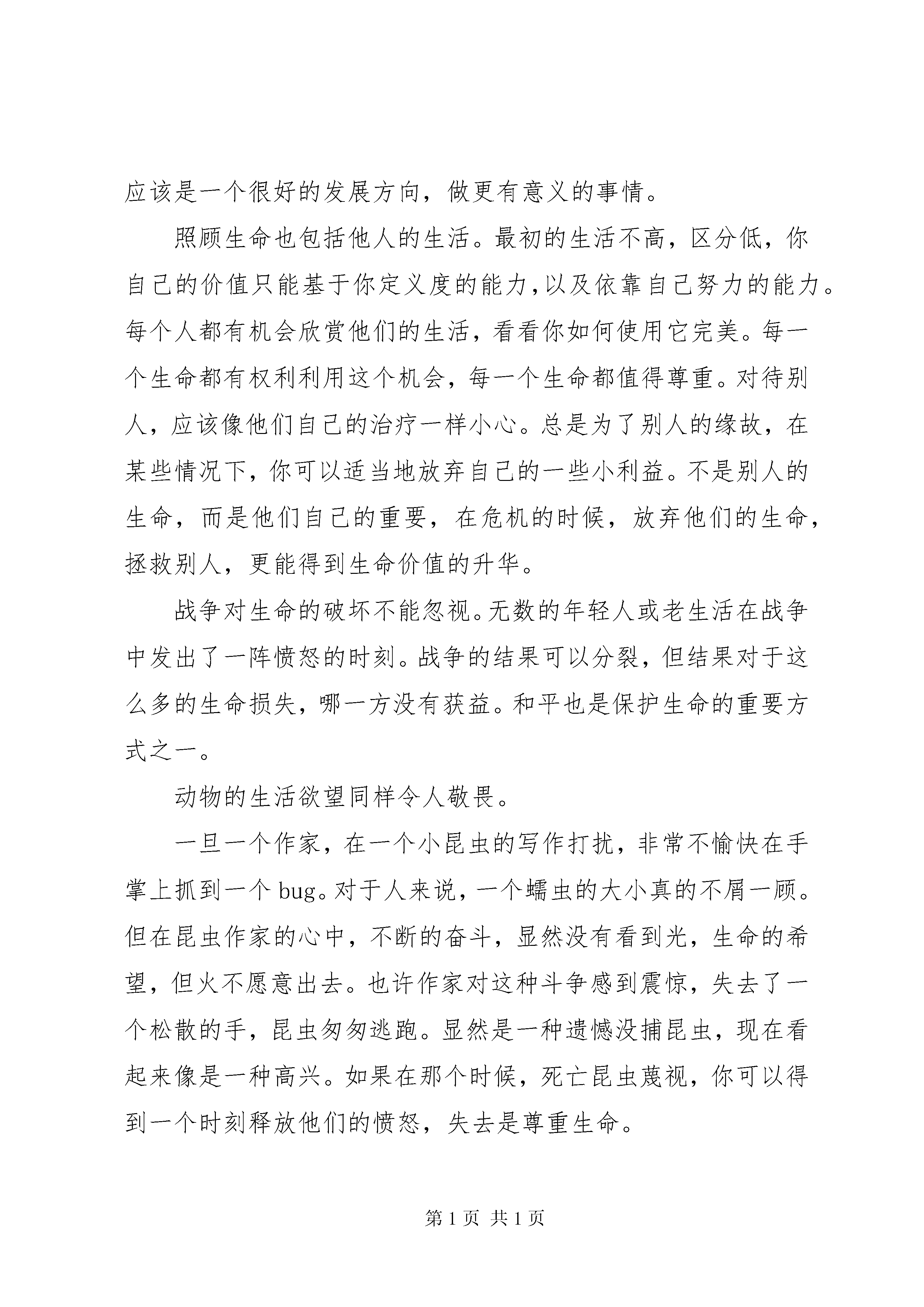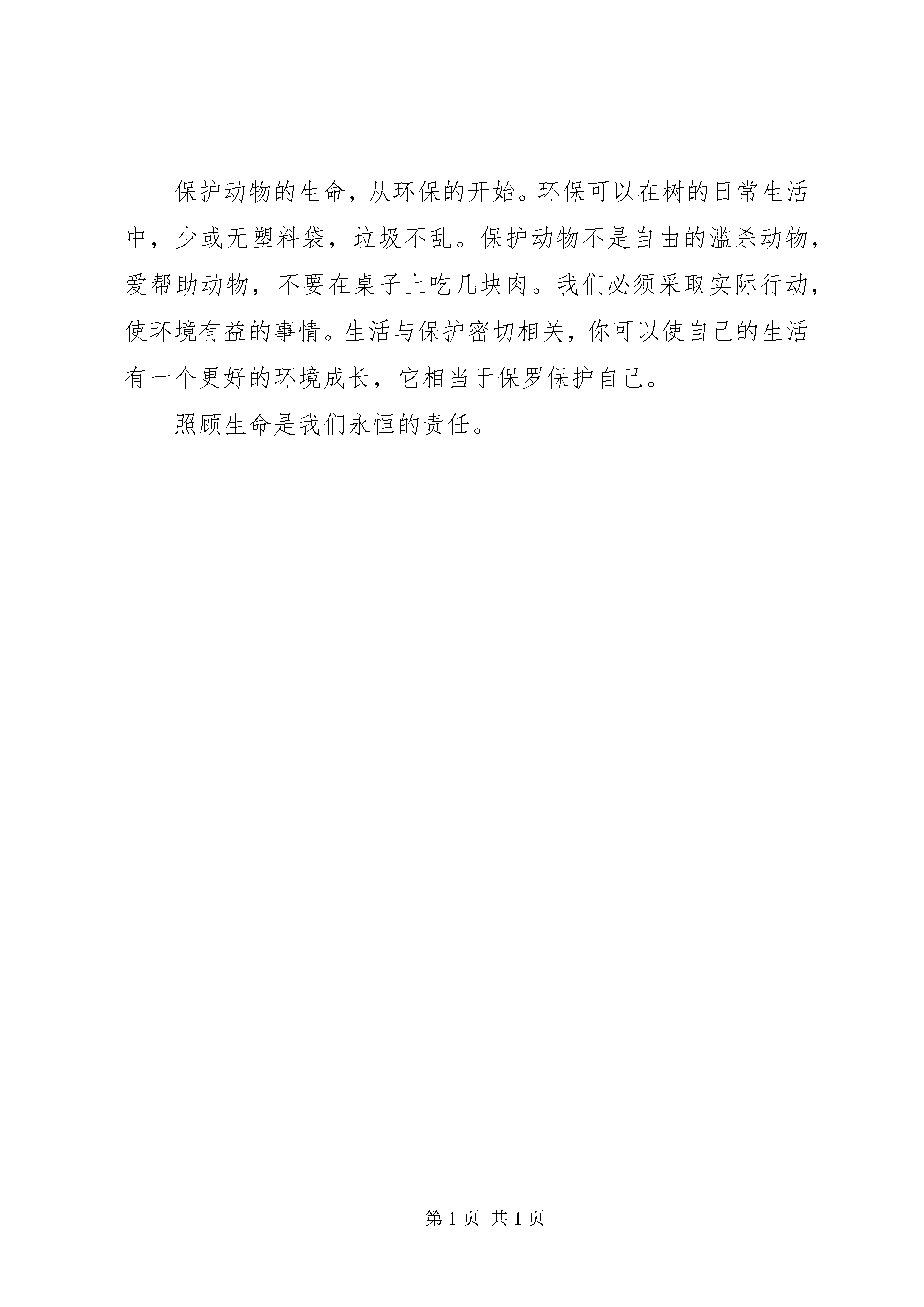 关爱生命演讲稿我们从来没有想过我们会死,但从来不知道这是一个好的选择。一切都是新鲜的,有趣的是偶然的。生命是最珍贵的事故,我们有荣幸见证整个世界,或繁荣或贫瘠。神奇的是,每一个生命都是独一无二的。我们应该珍惜每一个生命,因为每个事故都很难来,更不用说生活。关心生命的第一步,首先要对待自己。人们经常说生活是最重要的大部分时间是指自己的生活。到目前的科技水平,生活只有一次。我们必须努力工作是为了保护自己,让他们的生活更有价值。这不难保护自己,它是超越了该地区的危险,更少的slapstick,知道如何防止安全。真的不是那么简单,因为面对危机,我们必须与命运斗争。人们埋在地震的废墟中,在危机的环境中,对生活的渴望是最大的灵感,在救出后,会发现自己的生活特别有价值。其实,无论有什么经验,生活都是珍贵的,但我们一直在宠物和傲慢的生活环境中,缺乏生活意识机器,这使我们忽视它的重要性。当然,他们自己的保护不仅指身体,也指人物的性格。我们应该努力让自己有一个更好的性格,从每一分钟每秒钟发展良好的习惯。生物的本能是倾向于刺激,以避免有害的刺激。我们也应该是一个很好的发展方向,做更有意义的事情。照顾生命也包括他人的生活。最初的生活不高,区分低,你自己的价值只能基于你定义度的能力,以及依靠自己努力的能力。每个人都有机会欣赏他们的生活,看看你如何使用它完美。每一个生命都有权利利用这个机会,每一个生命都值得尊重。对待别人,应该像他们自己的治疗一样小心。总是为了别人的缘故,在某些情况下,你可以适当地放弃自己的一些小利益。不是别人的生命,而是他们自己的重要,在危机的时候,放弃他们的生命,拯救别人,更能得到生命价值的升华。战争对生命的破坏不能忽视。无数的年轻人或老生活在战争中发出了一阵愤怒的时刻。战争的结果可以分裂,但结果对于这么多的生命损失,哪一方没有获益。和平也是保护生命的重要方式之一。动物的生活欲望同样令人敬畏。一旦一个作家,在一个小昆虫的写作打扰,非常不愉快在手掌上抓到一个bug。对于人来说,一个蠕虫的大小真的不屑一顾。但在昆虫作家的心中,不断的奋斗,显然没有看到光,生命的希望,但火不愿意出去。也许作家对这种斗争感到震惊,失去了一个松散的手,昆虫匆匆逃跑。显然是一种遗憾没捕昆虫,现在看起来像是一种高兴。如果在那个时候,死亡昆虫蔑视,你可以得到一个时刻释放他们的愤怒,失去是尊重生命。保护动物的生命,从环保的开始。环保可以在树的日常生活中,少或无塑料袋,垃圾不乱。保护动物不是自由的滥杀动物,爱帮助动物,不要在桌子上吃几块肉。我们必须采取实际行动,使环境有益的事情。生活与保护密切相关,你可以使自己的生活有一个更好的环境成长,它相当于保罗保护自己。照顾生命是我们永恒的责任。