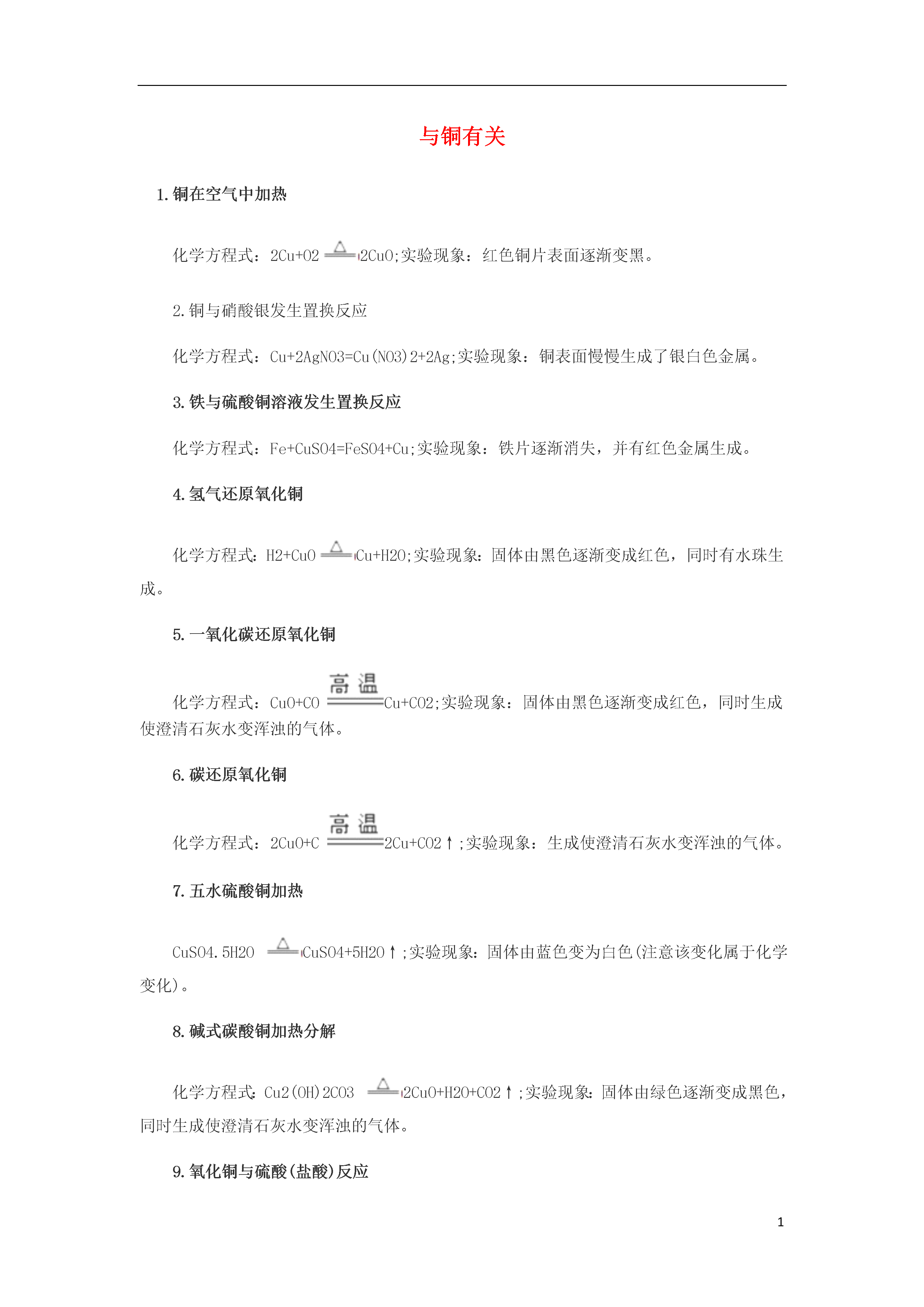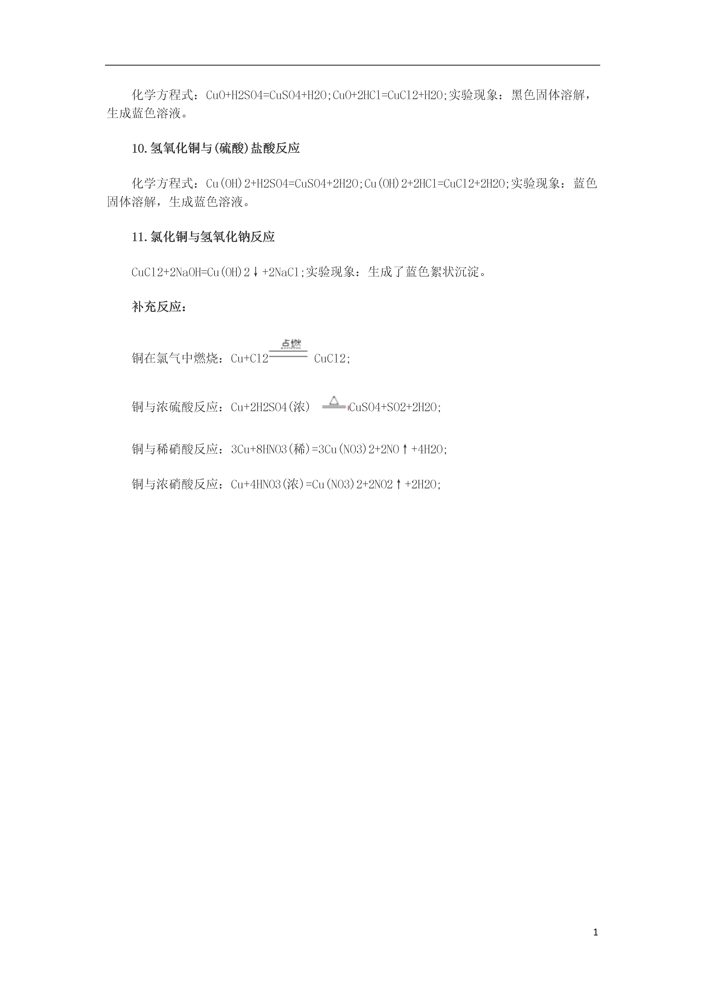 1与铜有关1.铜在空气中加热化学方程式:2Cu+O22CuO;实验现象:红色铜片表面逐渐变黑。2.铜与硝酸银发生置换反应化学方程式:Cu+2AgNO3=Cu(NO3)2+2Ag;实验现象:铜表面慢慢生成了银白色金属。3.铁与硫酸铜溶液发生置换反应化学方程式:Fe+CuSO4=FeSO4+Cu;实验现象:铁片逐渐消失,并有红色金属生成。4.氢气还原氧化铜化学方程式:H2+CuOCu+H2O;实验现象:固体由黑色逐渐变成红色,同时有水珠生成。5.一氧化碳还原氧化铜化学方程式:CuO+COCu+CO2;实验现象:固体由黑色逐渐变成红色,同时生成使澄清石灰水变浑浊的气体。6.碳还原氧化铜化学方程式:2CuO+C2Cu+CO2↑;实验现象:生成使澄清石灰水变浑浊的气体。7.五水硫酸铜加热CuSO4.5H2OCuSO4+5H2O↑;实验现象:固体由蓝色变为白色(注意该变化属于化学变化)。8.碱式碳酸铜加热分解化学方程式:Cu2(OH)2CO32CuO+H2O+CO2↑;实验现象:固体由绿色逐渐变成黑色,同时生成使澄清石灰水变浑浊的气体。9.氧化铜与硫酸(盐酸)反应化学方程式:CuO+H2SO4=CuSO4+H2O;CuO+2HCl=CuCl2+H2O;实验现象:黑色固体溶解,生成蓝色溶液。10.氢氧化铜与(硫酸)盐酸反应化学方程式:Cu(OH)2+H2SO4=CuSO4+2H2O;Cu(OH)2+2HCl=CuCl2+2H2O;实验现象:蓝色固体溶解,生成蓝色溶液。11.氯化铜与氢氧化钠反应CuCl2+2NaOH=Cu(OH)2↓+2NaCl;实验现象:生成了蓝色絮状沉淀。补充反应:铜在氯气中燃烧:Cu+Cl2CuCl2;铜与浓硫酸反应:Cu+2H2SO4(浓)CuSO4+SO2+2H2O;铜与稀硝酸反应:3Cu+8HNO3(稀)=3Cu(NO3)2+2NO↑+4H2O;铜与浓硝酸反应:Cu+4HNO3(浓)=Cu(NO3)2+2NO2↑+2H2O;