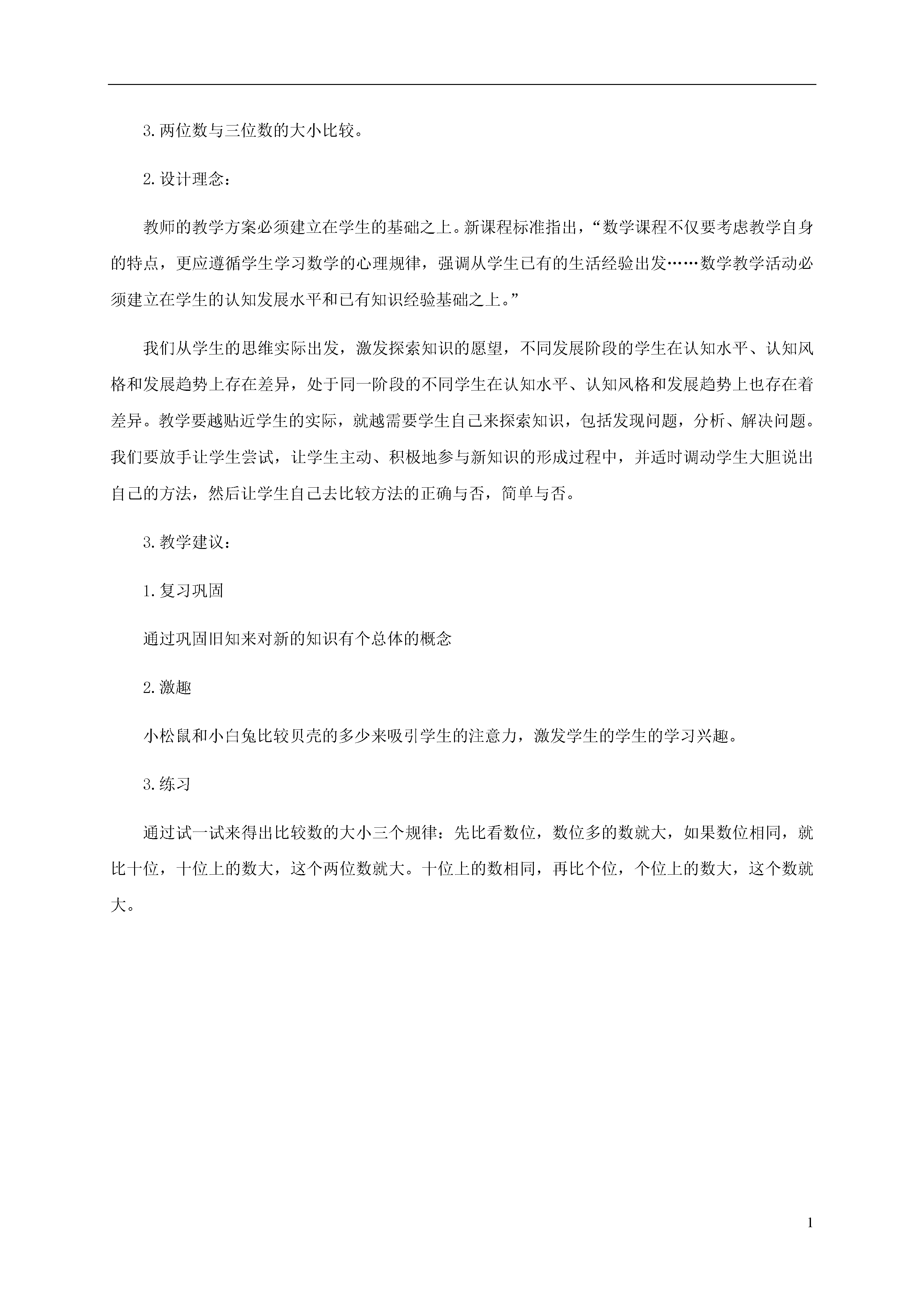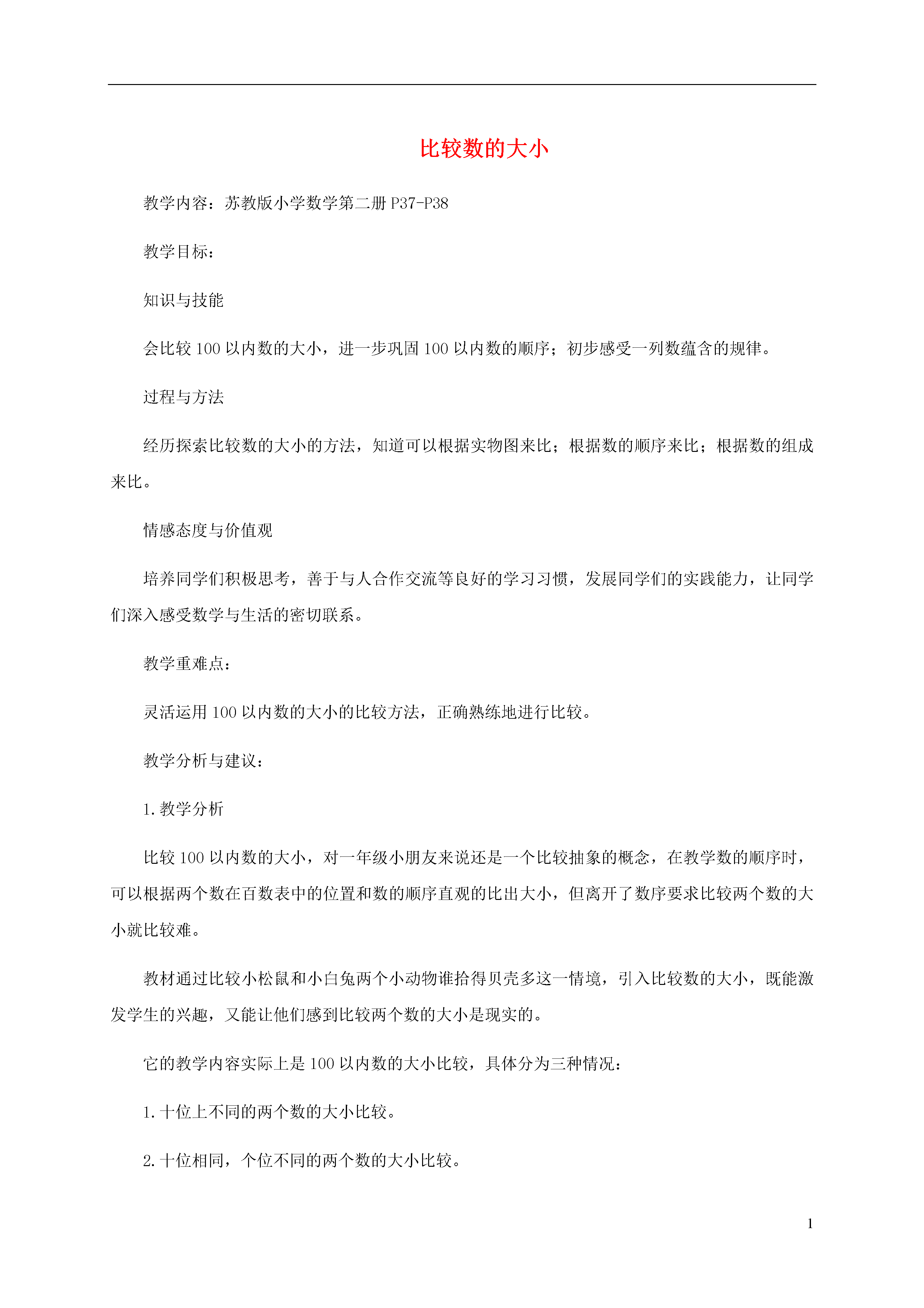 1比较数的大小教学内容:苏教版小学数学第二册P37-P38教学目标:知识与技能会比较100以内数的大小,进一步巩固100以内数的顺序;初步感受一列数蕴含的规律。过程与方法经历探索比较数的大小的方法,知道可以根据实物图来比;根据数的顺序来比;根据数的组成来比。情感态度与价值观培养同学们积极思考,善于与人合作交流等良好的学习习惯,发展同学们的实践能力,让同学们深入感受数学与生活的密切联系。教学重难点:灵活运用100以内数的大小的比较方法,正确熟练地进行比较。教学分析与建议:1.教学分析比较100以内数的大小,对一年级小朋友来说还是一个比较抽象的概念,在教学数的顺序时,可以根据两个数在百数表中的位置和数的顺序直观的比出大小,但离开了数序要求比较两个数的大小就比较难。教材通过比较小松鼠和小白兔两个小动物谁拾得贝壳多这一情境,引入比较数的大小,既能激发学生的兴趣,又能让他们感到比较两个数的大小是现实的。它的教学内容实际上是100以内数的大小比较,具体分为三种情况:1.十位上不同的两个数的大小比较。2.十位相同,个位不同的两个数的大小比较。3.两位数与三位数的大小比较。2.设计理念:教师的教学方案必须建立在学生的基础之上。新课程标准指出,“数学课程不仅要考虑教学自身的特点,更应遵循学生学习数学的心理规律,强调从学生已有的生活经验出发……数学教学活动必须建立在学生的认知发展水平和已有知识经验基础之上。”我们从学生的思维实际出发,激发探索知识的愿望,不同发展阶段的学生在认知水平、认知风格和发展趋势上存在差异,处于同一阶段的不同学生在认知水平、认知风格和发展趋势上也存在着差异。教学要越贴近学生的实际,就越需要学生自己来探索知识,包括发现问题,分析、解决问题。我们要放手让学生尝试,让学生主动、积极地参与新知识的形成过程中,并适时调动学生大胆说出自己的方法,然后让学生自己去比较方法的正确与否,简单与否。3.教学建议:1.复习巩固通过巩固旧知来对新的知识有个总体的概念2.激趣小松鼠和小白兔比较贝壳的多少来吸引学生的注意力,激发学生的学生的学习兴趣。3.练习通过试一试来得出比较数的大小三个规律:先比看数位,数位多的数就大,如果数位相同,就比十位,十位上的数大,这个两位数就大。十位上的数相同,再比个位,个位上的数大,这个数就大。