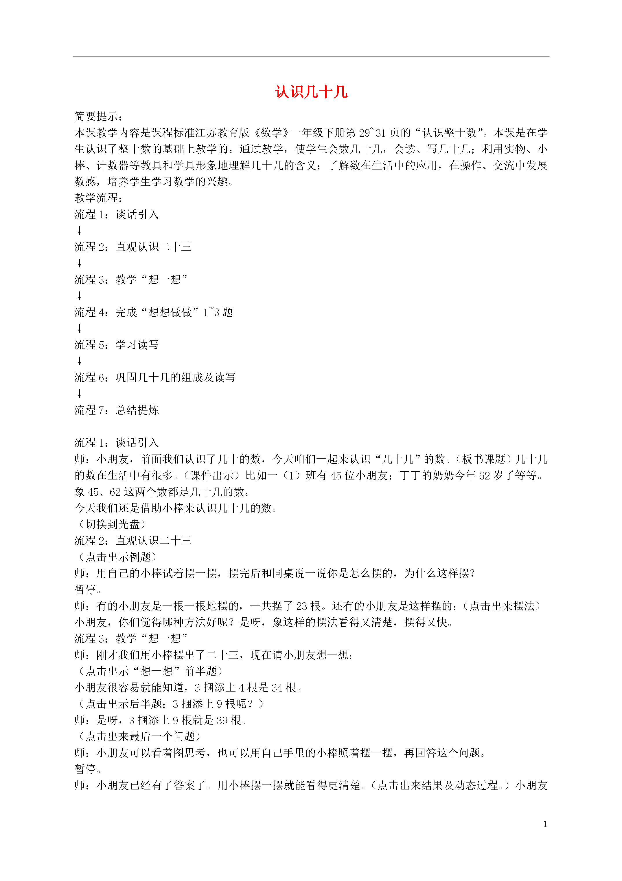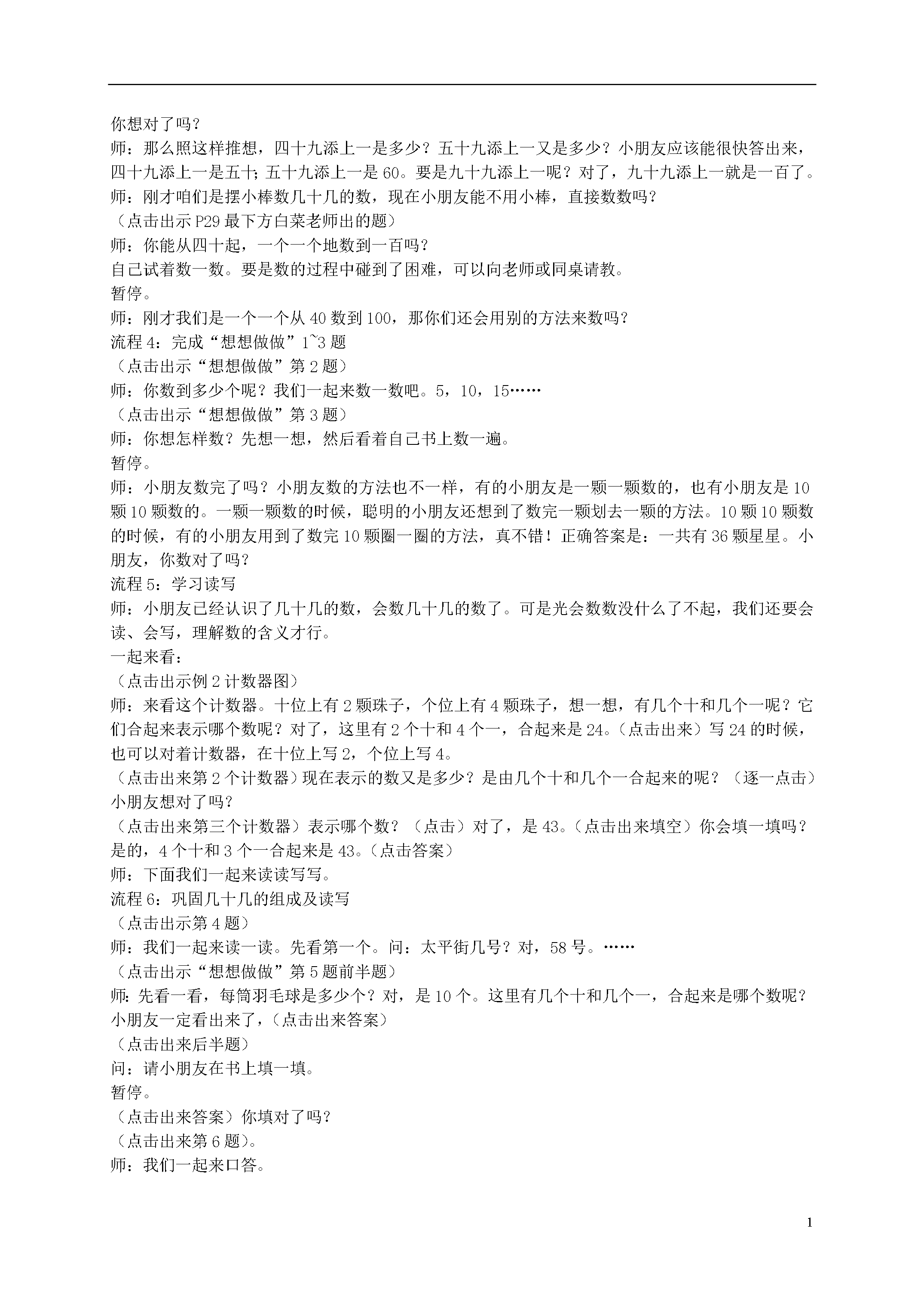 1认识几十几简要提示:本课教学内容是课程标准江苏教育版《数学》一年级下册第29~31页的“认识整十数”。本课是在学生认识了整十数的基础上教学的。通过教学,使学生会数几十几,会读、写几十几;利用实物、小棒、计数器等教具和学具形象地理解几十几的含义;了解数在生活中的应用,在操作、交流中发展数感,培养学生学习数学的兴趣。教学流程:流程1:谈话引入↓流程2:直观认识二十三↓流程3:教学“想一想”↓流程4:完成“想想做做”1~3题↓流程5:学习读写↓流程6:巩固几十几的组成及读写↓流程7:总结提炼流程1:谈话引入师:小朋友,前面我们认识了几十的数,今天咱们一起来认识“几十几”的数。(板书课题)几十几的数在生活中有很多。(课件出示)比如一(1)班有45位小朋友;丁丁的奶奶今年62岁了等等。象45、62这两个数都是几十几的数。今天我们还是借助小棒来认识几十几的数。(切换到光盘)流程2:直观认识二十三(点击出示例题)师:用自己的小棒试着摆一摆,摆完后和同桌说一说你是怎么摆的,为什么这样摆?暂停。师:有的小朋友是一根一根地摆的,一共摆了23根。还有的小朋友是这样摆的:(点击出来摆法)小朋友,你们觉得哪种方法好呢?是呀,象这样的摆法看得又清楚,摆得又快。流程3:教学“想一想”师:刚才我们用小棒摆出了二十三,现在请小朋友想一想:(点击出示“想一想”前半题)小朋友很容易就能知道,3捆添上4根是34根。(点击出示后半题:3捆添上9根呢?)师:是呀,3捆添上9根就是39根。(点击出来最后一个问题)师:小朋友可以看着图思考,也可以用自己手里的小棒照着摆一摆,再回答这个问题。暂停。师:小朋友已经有了答案了。用小棒摆一摆就能看得更清楚。(点击出来结果及动态过程。)小朋友你想对了吗?师:那么照这样推想,四十九添上一是多少?五十九添上一又是多少?小朋友应该能很快答出来,四十九添上一是五十;五十九添上一是60。要是九十九添上一呢?对了,九十九添上一就是一百了。师:刚才咱们是摆小棒数几十几的数,现在小朋友能不用小棒,直接数数吗?(点击出示P29最下方白菜老师出的题)师:你能从四十起,一个一个地数到一百吗?自己试着数一数。要是数的过程中碰到了困难,可以向老师或同桌请教。暂停。师:刚才我们是一个一个从40数到100,那你们还会用别的方法来数吗?流程4:完成“想想做做”1~3题(点击出示“想想做做”第2题)师:你数到多少个呢?我们一起来数一数吧。5,10,15……(点击出示“想想做做”第3题)师:你想怎样数?先想一想,然后看着自己书上数一遍。暂停。师:小朋友数完了吗?小朋友数的方法也不一样,有的小朋友是一颗一颗数的,也有小朋友是10颗10颗数的。一颗一颗数的时候,聪明的小朋友还想到了数完一颗划去一颗的方法。10颗10颗数的时候,有的小朋友用到了数完10颗圈一圈的方法,真不错!正确答案是:一共有36颗星星。小朋友,你数对了吗?流程5:学习读写师:小朋友已经认识了几十几的数,会数几十几的数了。可是光会数数没什么了不起,我们还要会读、会写,理解数的含义才行。一起来看:(点击出示例2计数器图)师:来看这个计数器。十位上有2颗珠子,个位上有4颗珠子,想一想,有几个十和几个一呢?它们合起来表示哪个数呢?对了,这里有2个十和4个一,合起来是24。(点击出来)写24的时候,也可以对着计数器,在十位上写2,个位上写4。(点击出来第2个计数器)现在表示的数又是多少?是由几个十和几个一合起来的呢?(逐一点击)小朋友想对了吗?(点击出来第三个计数器)表示哪个数?(点击)对了,是43。(点击出来填空)你会填一填吗?是的,4个十和3个一合起来是43。(点击答案)师:下面我们一起来读读写写。流程6:巩固几十几的组成及读写(点击出示第4题)师:我们一起来读一读。先看第一个。问:太平街几号?对,58号。……(点击出示“想想做做”第5题前半题)师:先看一看,每筒羽毛球是多少个?对,是10个。这里有几个十和几个一,合起来是哪个数呢?小朋友一定看出来了,(点击出来答案)(点击出来后半题)问:请小朋友在书上填一填。暂停。(点击出来答案)你填对了吗?(点击出来第6题)。师:我们一起来口答。师:最后请小朋友在书上独立完成“想想做做”第7题。暂停。师:一起来校对。(逐一点击)流程7:总结提炼师:小朋友,这节课我们认识了几十几的数。十位上有几个十,个位上有几个一合起来就是几十几。在生活中有许多几十几的数,小朋友,请你做个有心人,去找一找吧!