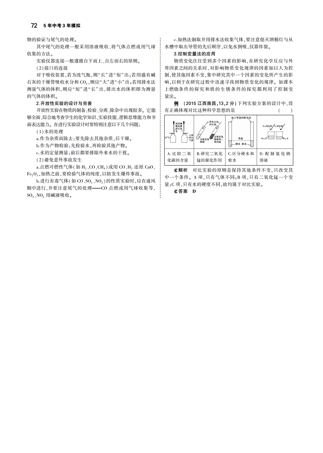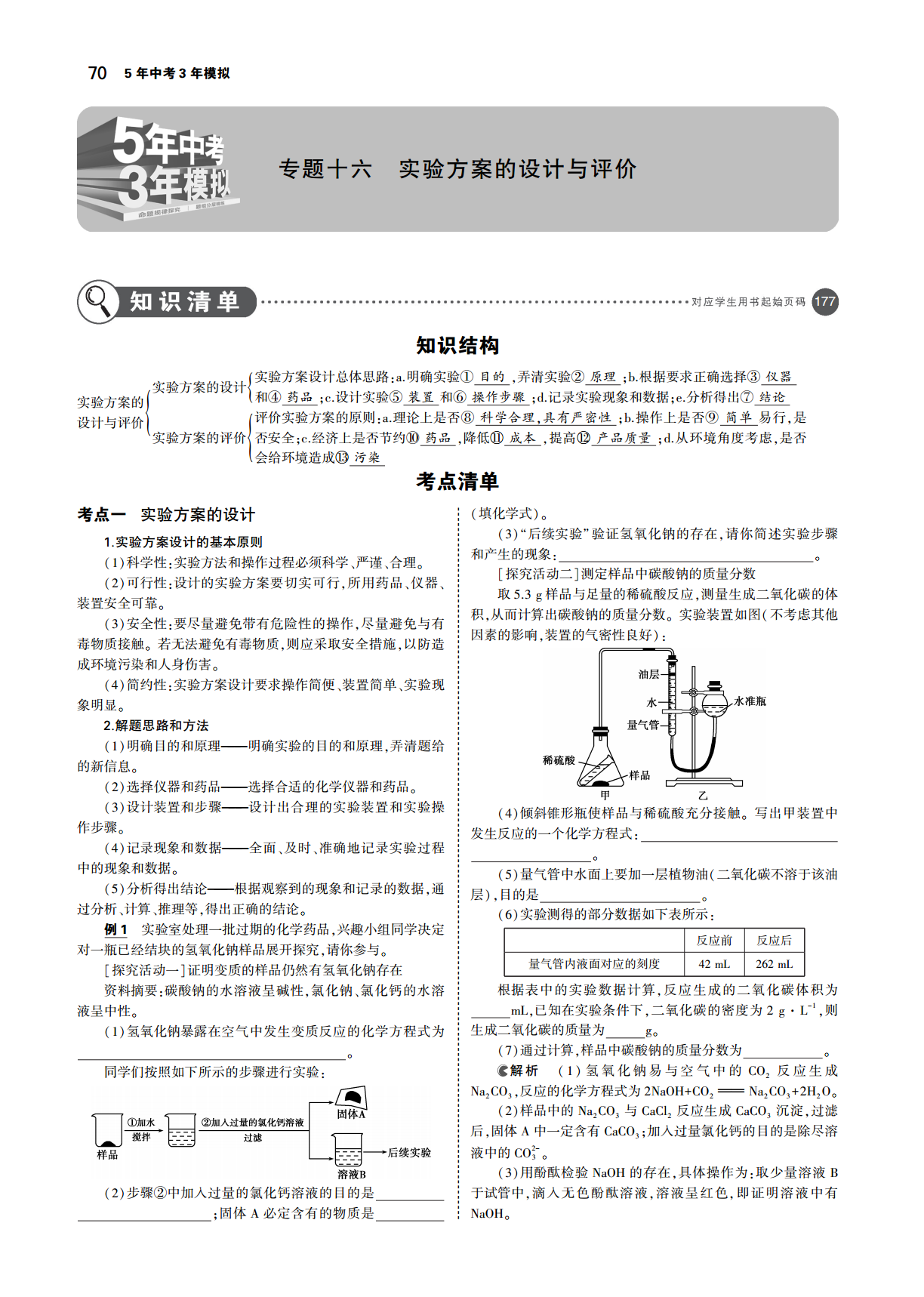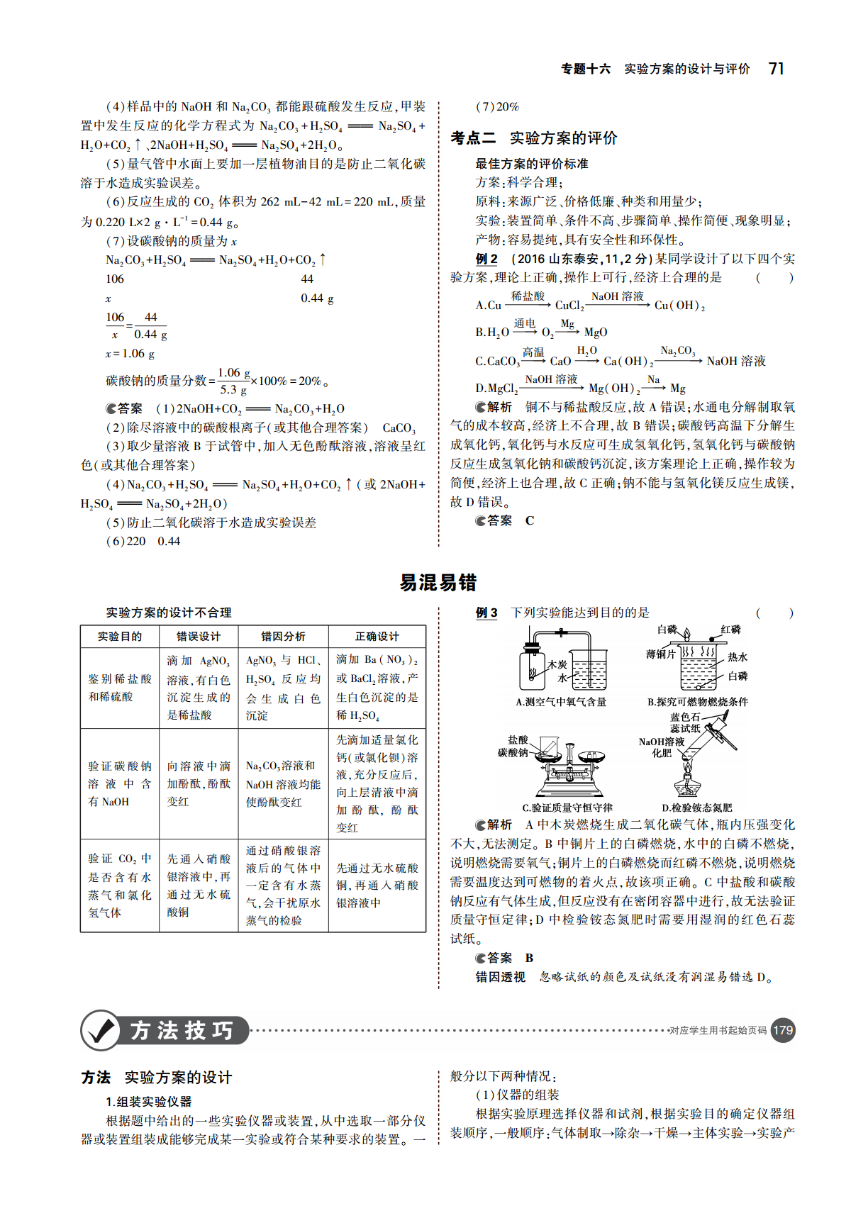 705年中考3年模拟专题十六实验方案的设计与评价177知识结构实验方案设计总体思路明确实验目的弄清实验原理根据要求正确选择仪器实验方案的设计:a.①,②;b.③{和药品设计实验装置和操作步骤记录实验现象和数据分析得出结论实验方案的④;c.⑤⑥;d.;e.⑦评价实验方案的原则理论上是否科学合理,具有严密性操作上是否简单易行是设计与评价{:a.⑧;b.⑨,实验方案的评价否安全经济上是否节约药品降低成本提高产品质量从环境角度考虑是否{;c.⑩,,;d.,会给环境造成污染考点清单考点一实验方案的设计填化学式()。后续实验验证氢氧化钠的存在请你简述实验步骤1实验方案设计的基本原则(3)“”,.和产生的现象科学性实验方法和操作过程必须科学严谨合理:。(1):、、。探究活动二测定样品中碳酸钠的质量分数可行性设计的实验方案要切实可行所用药品仪器[](2):,、、取样品与足量的稀硫酸反应测量生成二氧化碳的体装置安全可靠5.3g,。积从而计算出碳酸钠的质量分数实验装置如图不考虑其他安全性要尽量避免带有危险性的操作尽量避免与有,。((3):,因素的影响装置的气密性良好毒物质接触若无法避免有毒物质则应采取安全措施以防造,):。,,成环境污染和人身伤害。简约性实验方案设计要求操作简便装置简单实验现(4):、、象明显。2解题思路和方法.明确目的和原理明确实验的目的和原理弄清题给(1)———,的新信息。选择仪器和药品选择合适的化学仪器和药品(2)———。设计装置和步骤设计出合理的实验装置和实验操倾斜锥形瓶使样品与稀硫酸充分接触写出甲装置中(3)———(4)。作步骤发生反应的一个化学方程式。:记录现象和数据全面及时准确地记录实验过程(4)———、、。中的现象和数据量气管中水面上要加一层植物油二氧化碳不溶于该油。(5)(分析得出结论根据观察到的现象和记录的数据通层目的是(5)———,),。过分析计算推理等得出正确的结论实验测得的部分数据如下表所示、、,。(6):例1实验室处理一批过期的化学药品兴趣小组同学决定,反应前反应后对一瓶已经结块的氢氧化钠样品展开探究请你参与,。量气管内液面对应的刻度探究活动一证明变质的样品仍然有氢氧化钠存在42mL262mL[]资料摘要碳酸钠的水溶液呈碱性氯化钠氯化钙的水溶根据表中的实验数据计算反应生成的二氧化碳体积为:,、,-1液呈中性已知在实验条件下二氧化碳的密度为则。mL,,2g·L,氢氧化钠暴露在空气中发生变质反应的化学方程式为生成二氧化碳的质量为(1)g。通过计算样品中碳酸钠的质量分数为。(7),。同学们按照如下所示的步骤进行实验解析氢氧化钠易与空气中的反应生成:(1)CO2反应的化学方程式为Na2CO3,2NaOH+CO2Na2CO3+2H2O。样品中的与反应生成沉淀过滤(2)Na2CO3CaCl2CaCO3,后固体中一定含有加入过量氯化钙的目的是除尽溶,ACaCO3;2-液中的CO3。用酚酞检验的存在具体操作为取少量溶液(3)NaOH,:B步骤中加入过量的氯化钙溶液的目的是于试管中滴入无色酚酞溶液溶液呈红色即证明溶液中有(2)②,,,固体必定含有的物质是;ANaOH。专题十六实验方案的设计与评价71样品中的和都能跟硫酸发生反应甲装(4)NaOHNa2CO3,(7)20%置中发生反应的化学方程式为Na2CO3+H2SO4Na2SO4+考点二实验方案的评价2224242HO+CO↑、2NaOH+HSONaSO+2HO。量气管中水面上要加一层植物油目的是防止二氧化碳最佳方案的评价标准(5)溶于水造成实验误差方案科学合理。:;反应生成的体积为质量原料来源广泛价格低廉种类和用量少2(6)CO262mL-42mL=220mL,:、、;为-1实验装置简单条件不高步骤简单操作简便现象明显0.220L×2g·L=0.44g。:、、、、;设碳酸钠的质量为x产物容易提纯具有安全性和环保性(7):,。例2(2016山东泰安,11,2分)某同学设计了以下四个实23242422NaCO+HSONaSO+HO+CO↑验方案理论上正确操作上可行经济上合理的是,,,()10644稀盐酸溶液xNaOH0.44gA.Cu→CuCl2→Cu(OH)210644通电x=Mg0.44gB.H2O→O2→MgOx高温=1.06gH2ONa2CO3溶液C.CaCO3→CaO→Ca(OH)2→NaOH碳酸钠的质量分数1.06g溶液=×100%=20%。NaOHNa5.3gD.MgCl2→Mg(OH)2→Mg答案解析铜不与稀盐酸反应故错误水通电分解制取氧(1)2NaOH+CO2Na2CO3+H2O,A;除尽溶液中的碳酸根离子或其他合