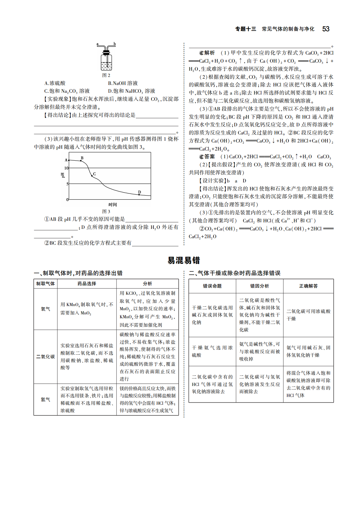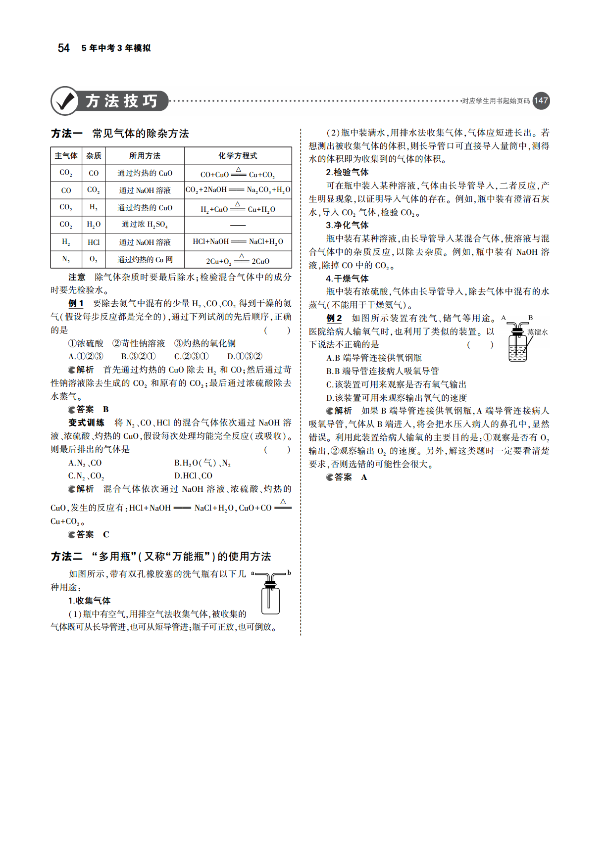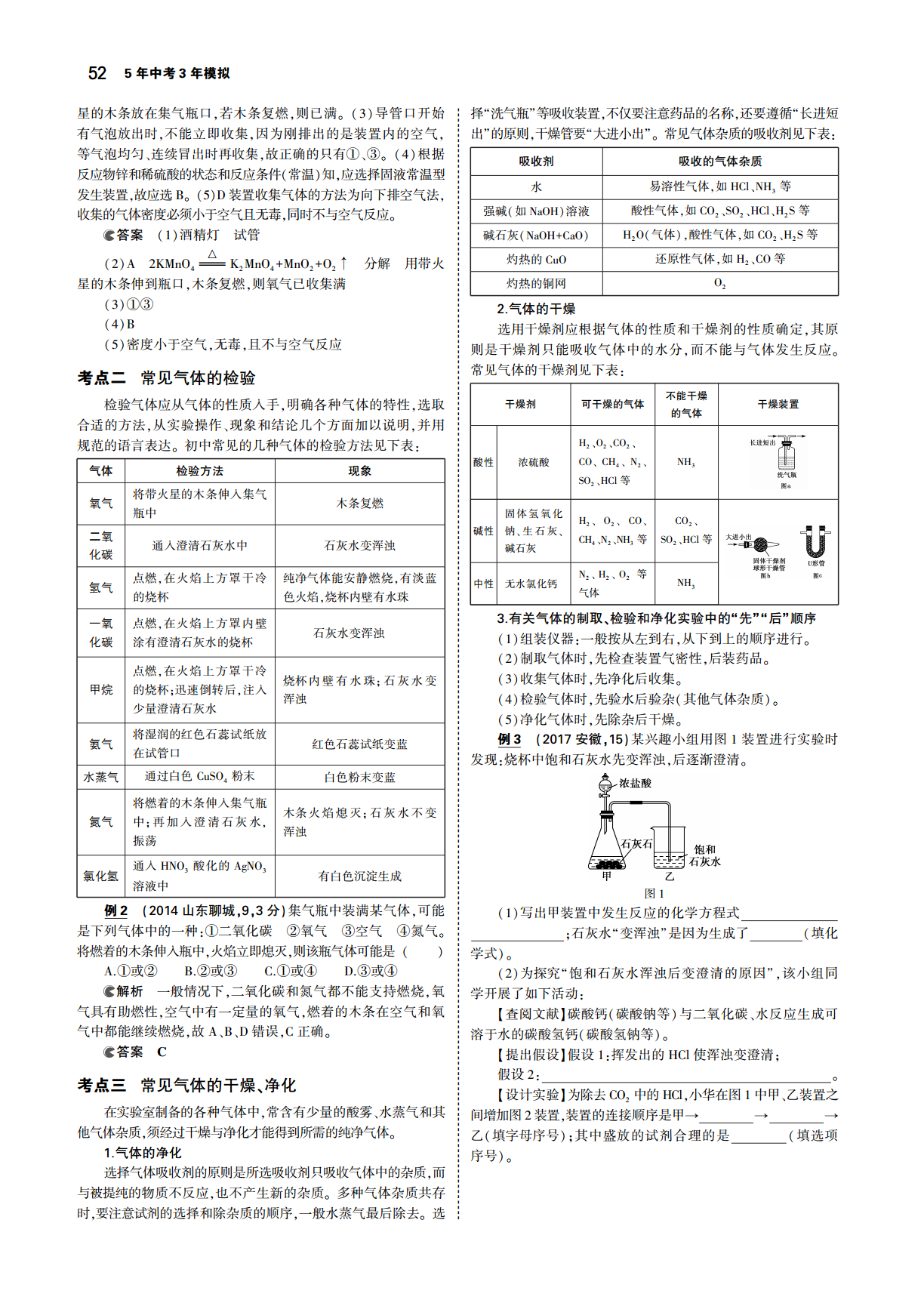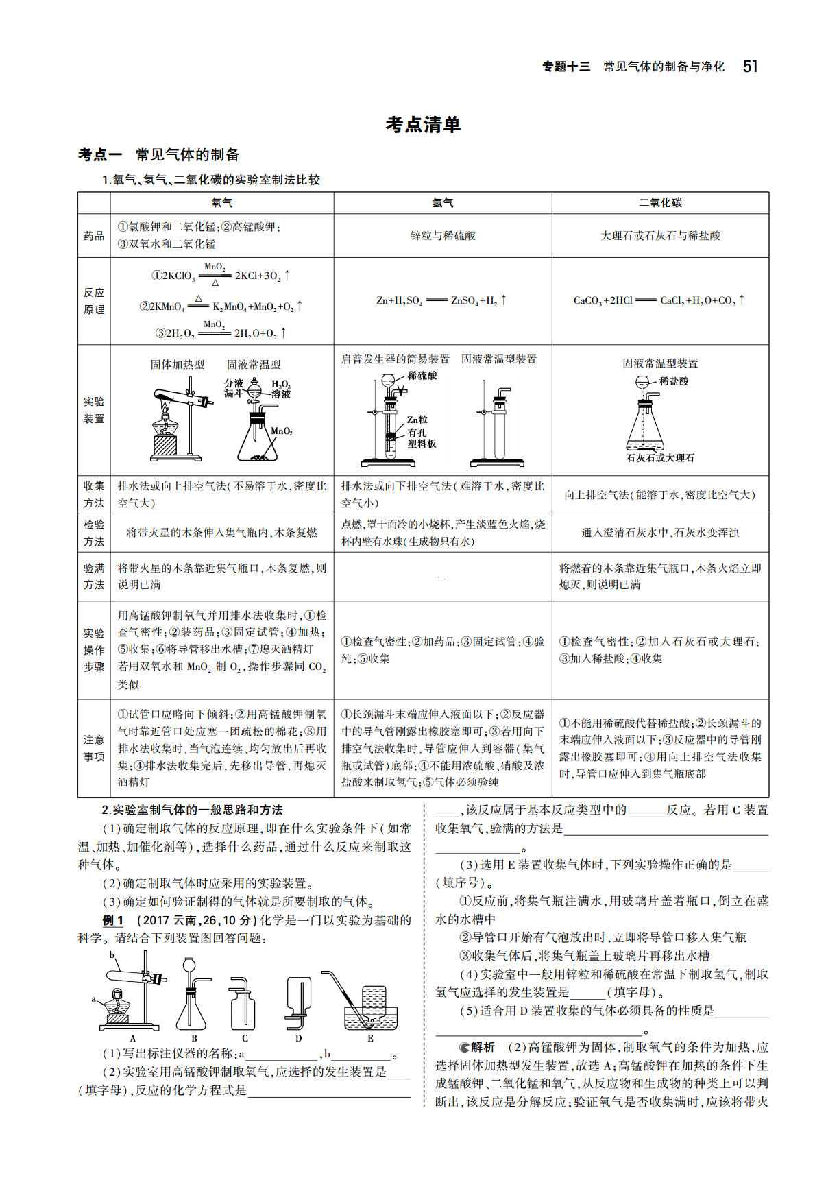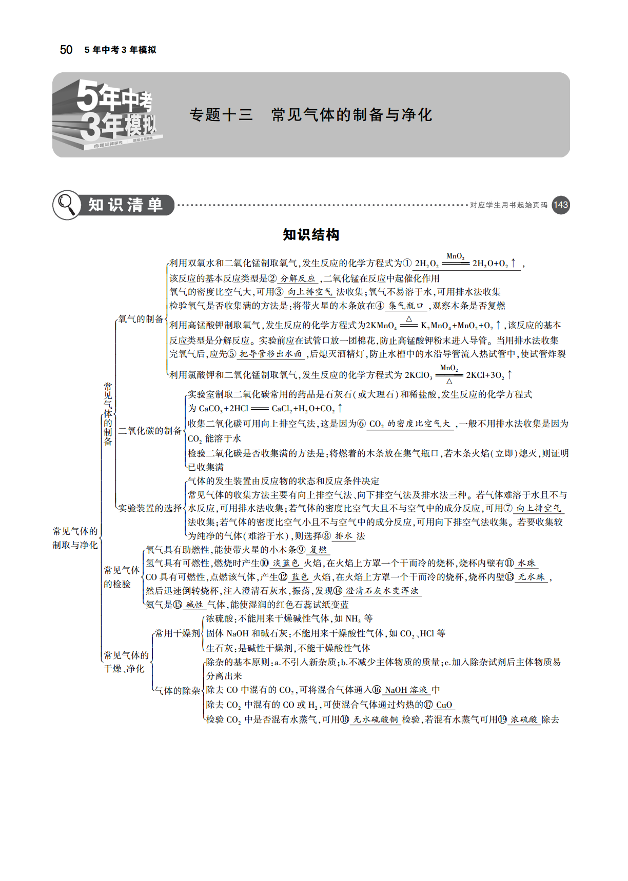 505年中考3年模拟专题十三常见气体的制备与净化143知识结构利用双氧水和二氧化锰制取氧气发生反应的化学方程式为MnO2ïì,①2H2O22H2O+O2↑,该反应的基本反应类型是分解反应二氧化锰在反应中起催化作用ï②,氧气的密度比空气大可用向上排空气法收集氧气不易溶于水可用排水法收集ï,③;,ï检验氧气是否收集满的方法是将带火星的木条放在集气瓶口观察木条是否复燃ï:④,氧气的制备íì利用高锰酸钾制取氧气发生反应的化学方程式为△该反应的基本ïï,2KMnO4K2MnO4+MnO2+O2↑,ïï反应类型是分解反应实验前应在试管口放一团棉花防止高锰酸钾粉末进入导管当用排水法收集。,。ïï完氧气后应先把导管移出水面后熄灭酒精灯防止水槽中的水沿导管流入热试管中使试管炸裂ïï,⑤,,,ïî利用氯酸钾和二氧化锰制取氧气发生反应的化学方程式为MnO2ï,2KClO32KCl+3O2↑常△见ï实验室制取二氧化碳常用的药品是石灰石或大理石和稀盐酸发生反应的化学方程式ïì(),气ïï为体íïCaCO3+2HClCaCl2+H2O+CO2↑ïì的ïï收集二氧化碳可用向上排空气法这是因为的密度比空气大一般不用排水法收集是因为ï制ï二氧化碳的制备í,⑥CO2,备ï能溶于水ïïCO2ïïï检验二氧化碳是否收集满的方法是将燃着的木条放在集气瓶口若木条火焰立即熄灭则证明ï:,(),ïïî已收集满ïï气体的发生装置由反应物的状态和反应条件决定ïïïìïï常见气体的收集方法主要有向上排空气法向下排空气法及排水法三种若气体难溶于水且不与îï、。ï实验装置的选择í水反应可用排水法收集若气体的密度比空气大且不与空气中的成分反应可用向上排空气ïï,;,⑦ï法收集若气体的密度比空气小且不与空气中的成分反应可用向下排空气法收集若要收集较常见气体的ïî;,。í为纯净的气体难溶于水则选择排水法制取与净化(),⑧ï氧气具有助燃性能使带火星的小木条复燃ïì,⑨ï氢气具有可燃性燃烧时产生淡蓝色火焰在火焰上方罩一个干而冷的烧杯烧杯内壁有水珠ï常见气体ï,⑩,,í具有可燃性点燃该气体产生蓝色火焰在火焰上方罩一个干而冷的烧杯烧杯内壁无水珠ï的检验CO,,,,,ïï然后迅速倒转烧杯注入澄清石灰水振荡发现澄清石灰水变浑浊ï,,,ïî氨气是碱性气体能使湿润的红色石蕊试纸变蓝ï,浓硫酸不能用来干燥碱性气体如等ï:,NH3ï常用干燥剂固体和碱石灰不能用来干燥酸性气体如等ïïì{NaOH:,CO2、HClï生石灰是碱性干燥剂不能干燥酸性气体î常见气体的ï:,í除杂的基本原则不引入新杂质不减少主体物质的质量加入除杂试剂后主体物质易干燥净化ïïì:a.;b.;c.、ï分离出来îï气体的除杂í除去中混有的可将混合气体通入溶液中COCO2,NaOHï除去中混有的或可使混合气体通过灼热的ïCO2COH2,CuOî检验中是否混有水蒸气可用无水硫酸铜检验若混有水蒸气可用浓硫酸除去CO2,,专题十三常见气体的制备与净化51考点清单考点一常见气体的制备1氧气、氢气、二氧化碳的实验室制法比较.氧气氢气二氧化碳氯酸钾和二氧化锰高锰酸钾药品①;②;锌粒与稀硫酸大理石或石灰石与稀盐酸双氧水和二氧化锰③MnO2①2KClO32KCl+3O2↑反应△原理△Zn+H2SO4ZnSO4+H2↑CaCO3+2HClCaCl2+H2O+CO2↑②2KMnO4K2MnO4+MnO2+O2↑MnO2③2H2O22H2O+O2↑固体加热型固液常温型启普发生器的简易装置固液常温型装置固液常温型装置实验装置收集排水法或向上排空气法不易溶于水密度比排水法或向下排空气法难溶于水密度比(,(,向上排空气法能溶于水密度比空气大方法空气大空气小(,)))检验点燃罩干而冷的小烧杯产生淡蓝色火焰烧将带火星的木条伸入集气瓶内木条复燃,,,通入澄清石灰水中石灰水变浑浊方法,杯内壁有水珠生成物只有水,()验满将带火星的木条靠近集气瓶口木条复燃则将燃着的木条靠近集气瓶口木条火焰立即,,,方法说明已满—熄灭则说明已满,用高锰酸钾制氧气并用排水法收集时检,①实验查气密性装药品固定试管加热;②;③;④;检查气密性加药品固定试管验检查气密性加入石灰石或大理石操作收集将导管移出水槽熄灭酒精灯①;②;③;④①;②;⑤;⑥;⑦纯收集加入稀盐酸收集步骤若用双氧水和制操作步骤同;⑤③;④MnO2O2,CO2类似试管口应略向下倾斜用高锰酸钾制氧长颈漏斗末端应伸入液面以下反应器①;②①;②不能用稀硫酸代替稀盐酸长颈漏斗的气时靠近管口处应塞一团疏松的棉花用中的导气管刚露出橡胶塞即可若用向下①;②注意;③;③末端应伸入液面以下反应器中的导管刚排水法收集时当气泡连续均匀放出后再收排空气法收集时导管应伸入