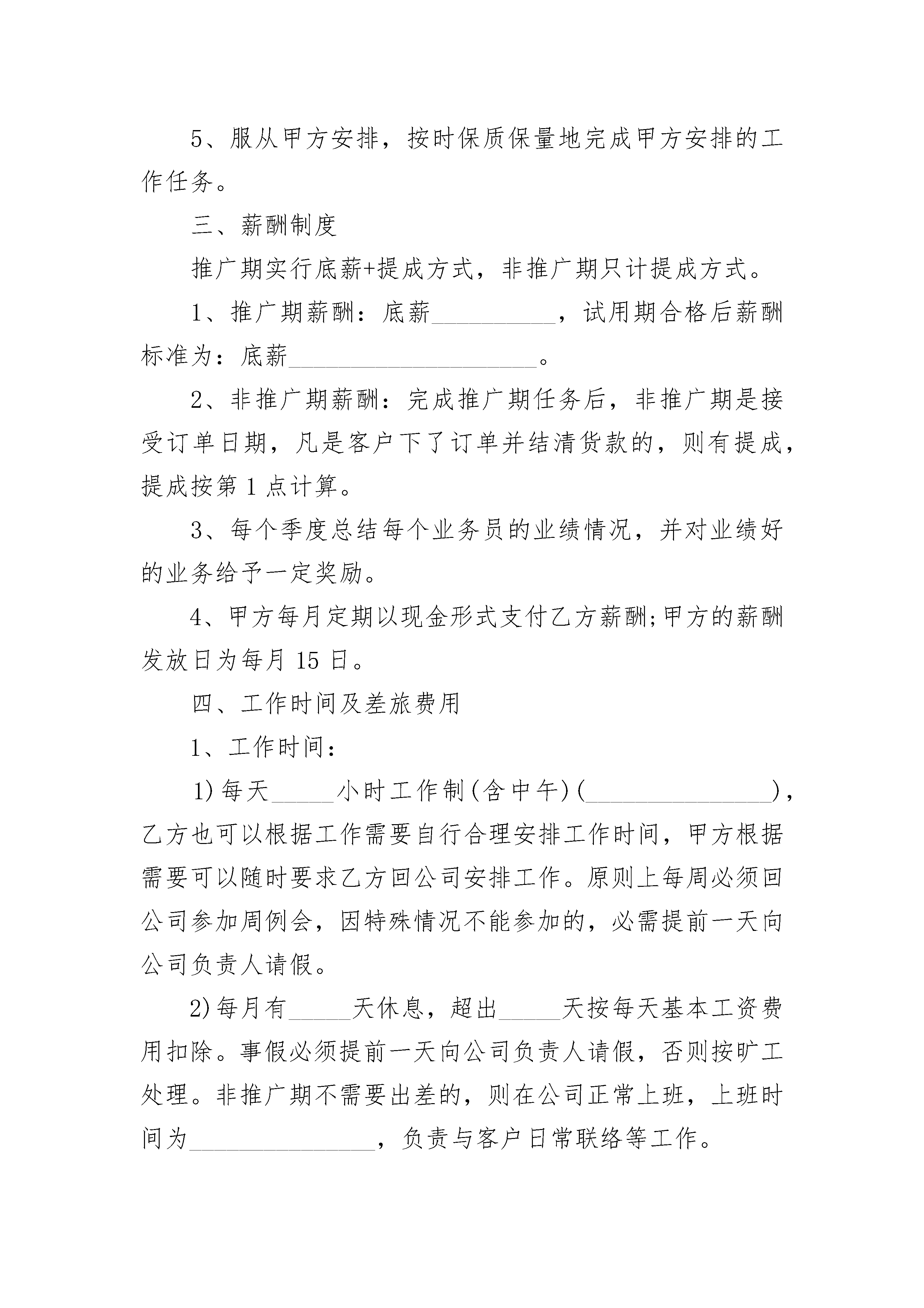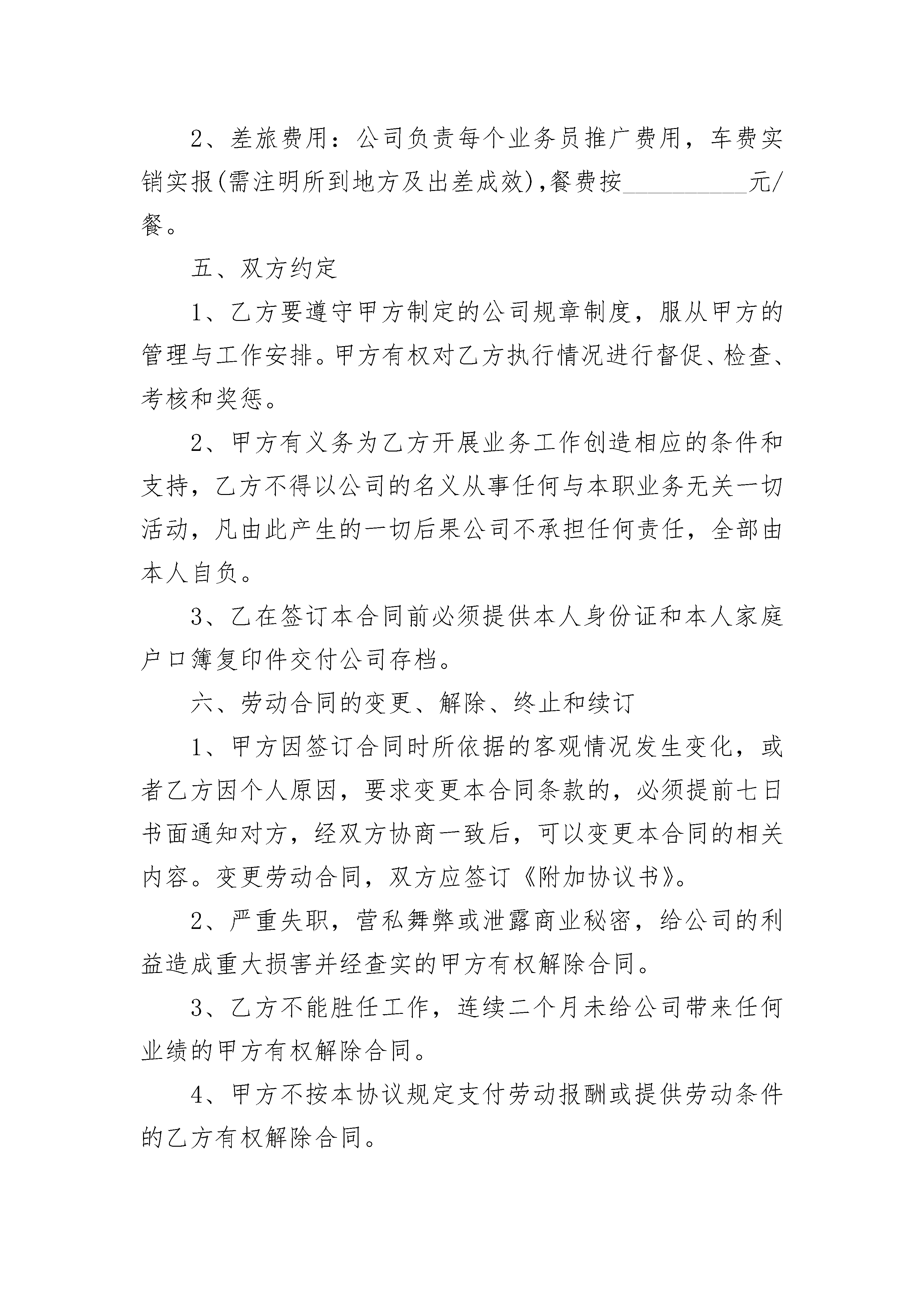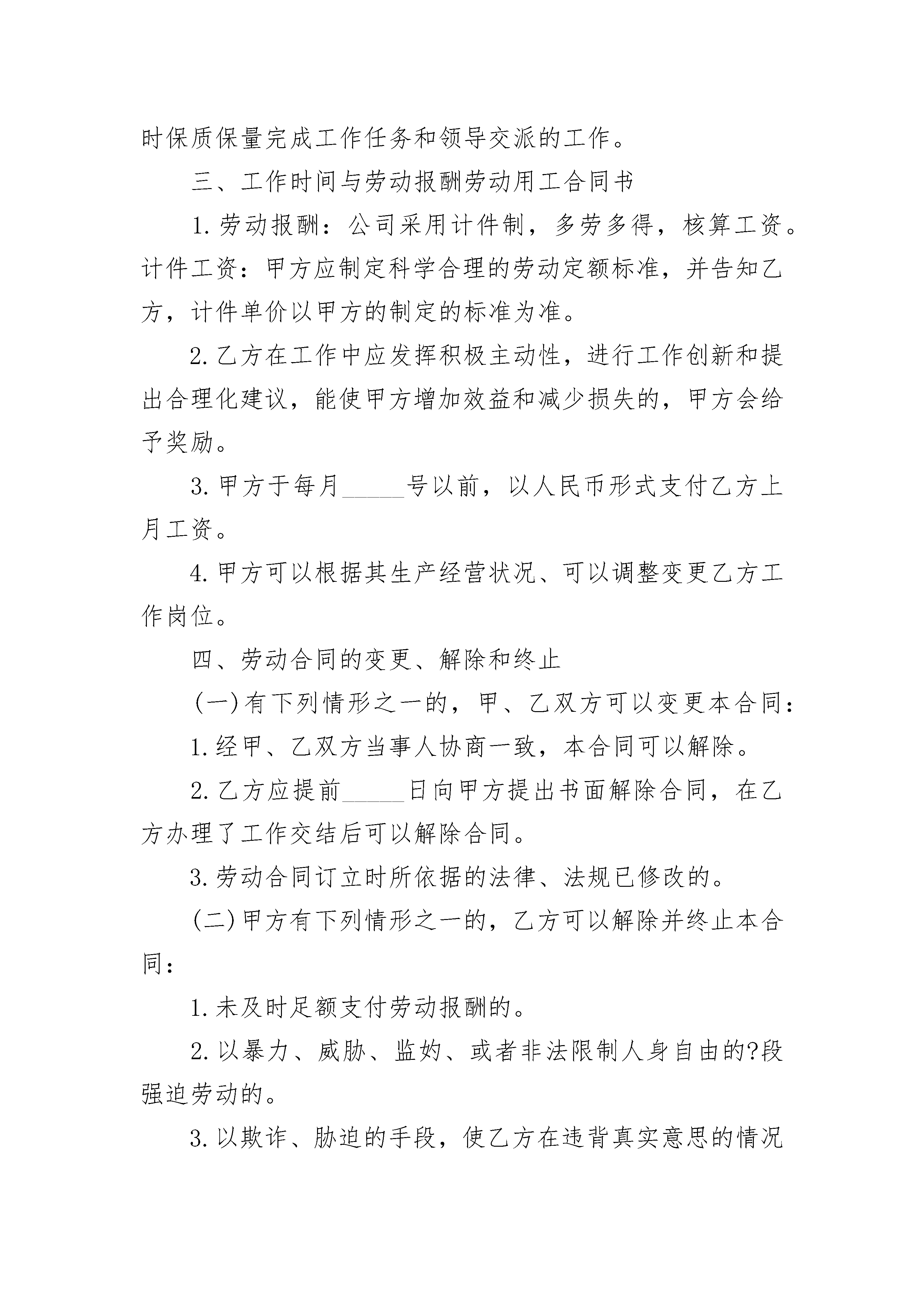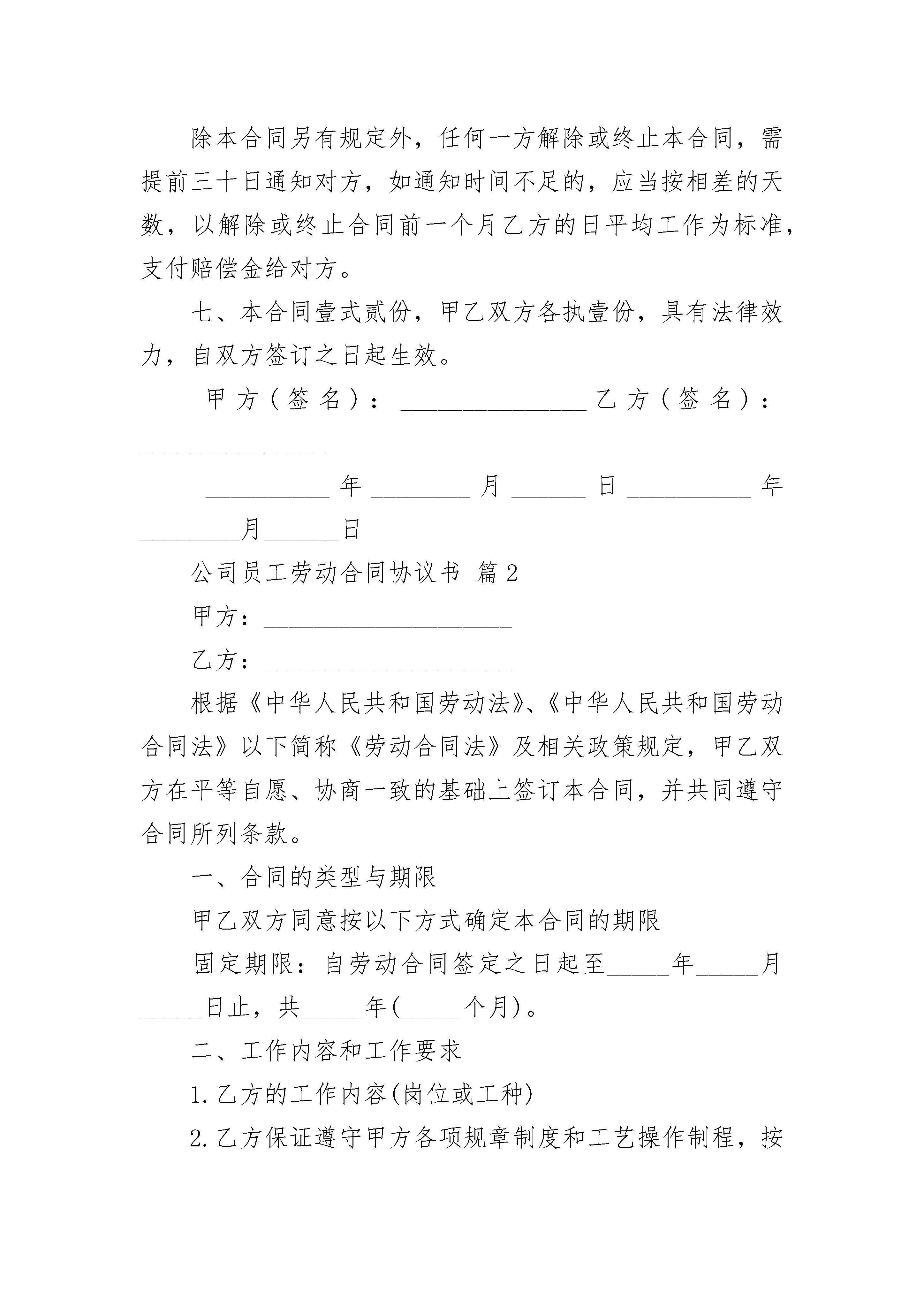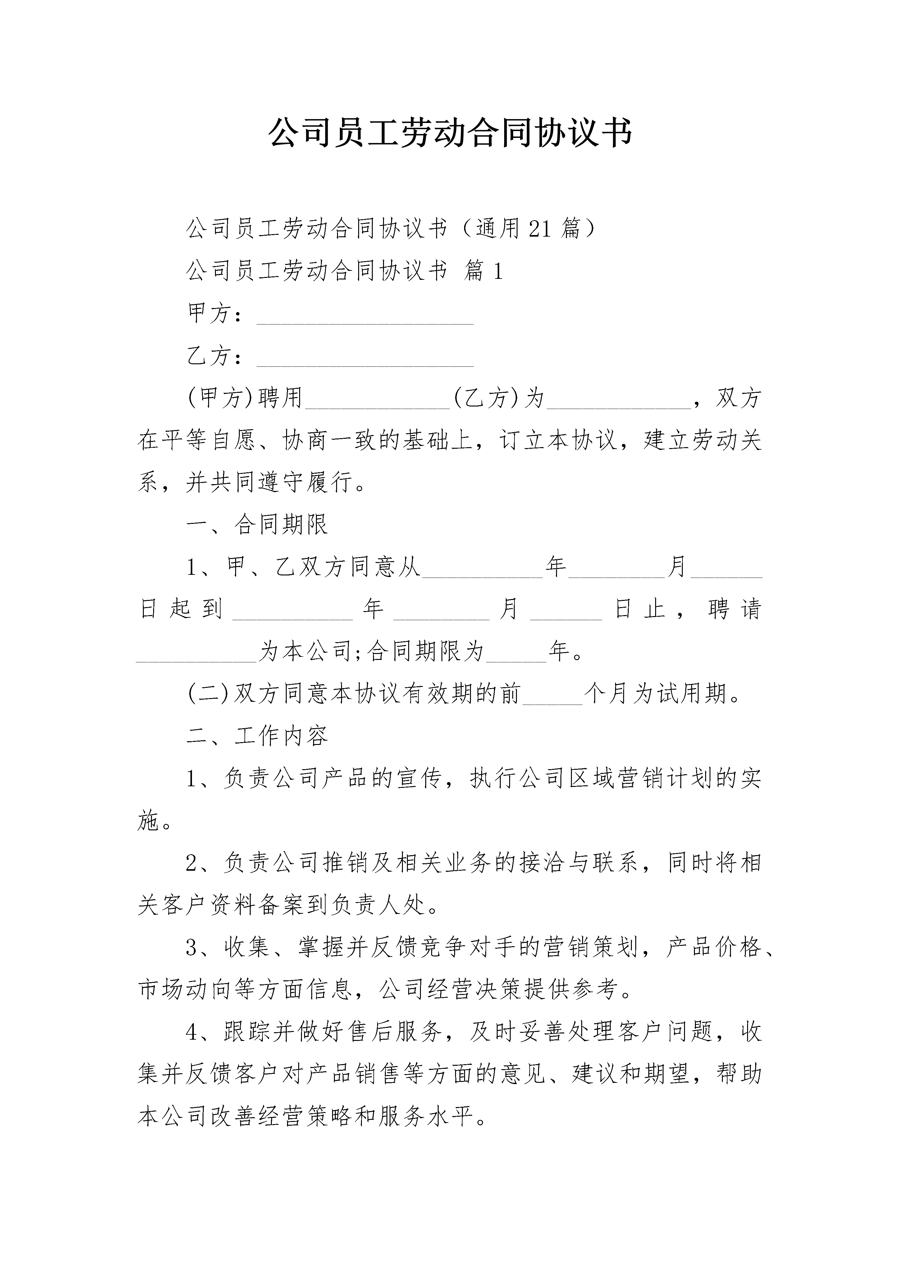 公司员工劳动合同协议书公司员工劳动合同协议书(通用21篇)公司员工劳动合同协议书篇1甲方:__________________乙方:__________________(甲方)聘用____________(乙方)为____________,双方在平等自愿、协商一致的基础上,订立本协议,建立劳动关系,并共同遵守履行。一、合同期限1、甲、乙双方同意从__________年________月______日起到__________年________月______日止,聘请__________为本公司;合同期限为_____年。(二)双方同意本协议有效期的前_____个月为试用期。二、工作内容1、负责公司产品的宣传,执行公司区域营销计划的实施。2、负责公司推销及相关业务的接洽与联系,同时将相关客户资料备案到负责人处。3、收集、掌握并反馈竞争对手的营销策划,产品价格、市场动向等方面信息,公司经营决策提供参考。4、跟踪并做好售后服务,及时妥善处理客户问题,收集并反馈客户对产品销售等方面的意见、建议和期望,帮助本公司改善经营策略和服务水平。5、服从甲方安排,按时保质保量地完成甲方安排的工作任务。三、薪酬制度推广期实行底薪+提成方式,非推广期只计提成方式。1、推广期薪酬:底薪__________,试用期合格后薪酬标准为:底薪____________________。2、非推广期薪酬:完成推广期任务后,非推广期是接受订单日期,凡是客户下了订单并结清货款的,则有提成,提成按第1点计算。3、每个季度总结每个业务员的业绩情况,并对业绩好的业务给予一定奖励。4、甲方每月定期以现金形式支付乙方薪酬;甲方的薪酬发放日为每月15日。四、工作时间及差旅费用1、工作时间:1)每天_____小时工作制(含中午)(_______________),乙方也可以根据工作需要自行合理安排工作时间,甲方根据需要可以随时要求乙方回公司安排工作。原则上每周必须回公司参加周例会,因特殊情况不能参加的,必需提前一天向公司负责人请假。2)每月有_____天休息,超出_____天按每天基本工资费用扣除。事假必须提前一天向公司负责人请假,否则按旷工处理。非推广期不需要出差的,则在公司正常上班,上班时间为_______________,负责与客户日常联络等工作。2、差旅费用:公司负责每个业务员推广费用,车费实销实报(需注明所到地方及出差成效),餐费按__________元/餐。五、双方约定1、乙方要遵守甲方制定的公司规章制度,服从甲方的管理与工作安排。甲方有权对乙方执行情况进行督促、检查、考核和奖惩。2、甲方有义务为乙方开展业务工作创造相应的条件和支持,乙方不得以公司的名义从事任何与本职业务无关一切活动,凡由此产生的一切后果公司不承担任何责任,全部由本人自负。3、乙在签订本合同前必须提供本人身份证和本人家庭户口簿复印件交付公司存档。六、劳动合同的变更、解除、终止和续订1、甲方因签订合同时所依据的客观情况发生变化,或者乙方因个人原因,要求变更本合同条款的,必须提前七日书面通知对方,经双方协商一致后,可以变更本合同的相关内容。变更劳动合同,双方应签订《附加协议书》。2、严重失职,营私舞弊或泄露商业秘密,给公司的利益造成重大损害并经查实的甲方有权解除合同。3、乙方不能胜任工作,连续二个月未给公司带来任何业绩的甲方有权解除合同。4、甲方不按本协议规定支付劳动报酬或提供劳动条件的乙方有权解除合同。除本合同另有规定外,任何一方解除或终止本合同,需提前三十日通知对方,如通知时间不足的,应当按相差的天数,以解除或终止合同前一个月乙方的日平均工作为标准,支付赔偿金给对方。七、本合同壹式贰份,甲乙双方各执壹份,具有法律效力,自双方签订之日起生效。甲方(签名):_______________乙方(签名):_________________________年________月______日__________年________月______日公司员工劳动合同协议书篇2甲方:____________________乙方:____________________根据《中华人民共和国劳动法》、《中华人民共和国劳动合同法》以下简称《劳动合同法》及相关政策规定,甲乙双方在平等自愿、协商一致的基础上签订本合同,并共同遵守合同所列条款。一、合同的类型与期限甲乙双方同意按以下方式确定本合同的期限固定期限:自劳动合同签定之日起至_____年_____月_____日止,共_____年(_____个月)。二、工作内容和工作要求1.乙方的工作内容(岗位或工种)2.乙方保证遵守甲方各项规章制度和工艺操作制程,按时保质保量完成工作任务和领导交派的工作。三、工作时间与劳动报酬劳动用工合同书1.劳动报酬:公司采用计件制,多劳多得,核算工资。计件