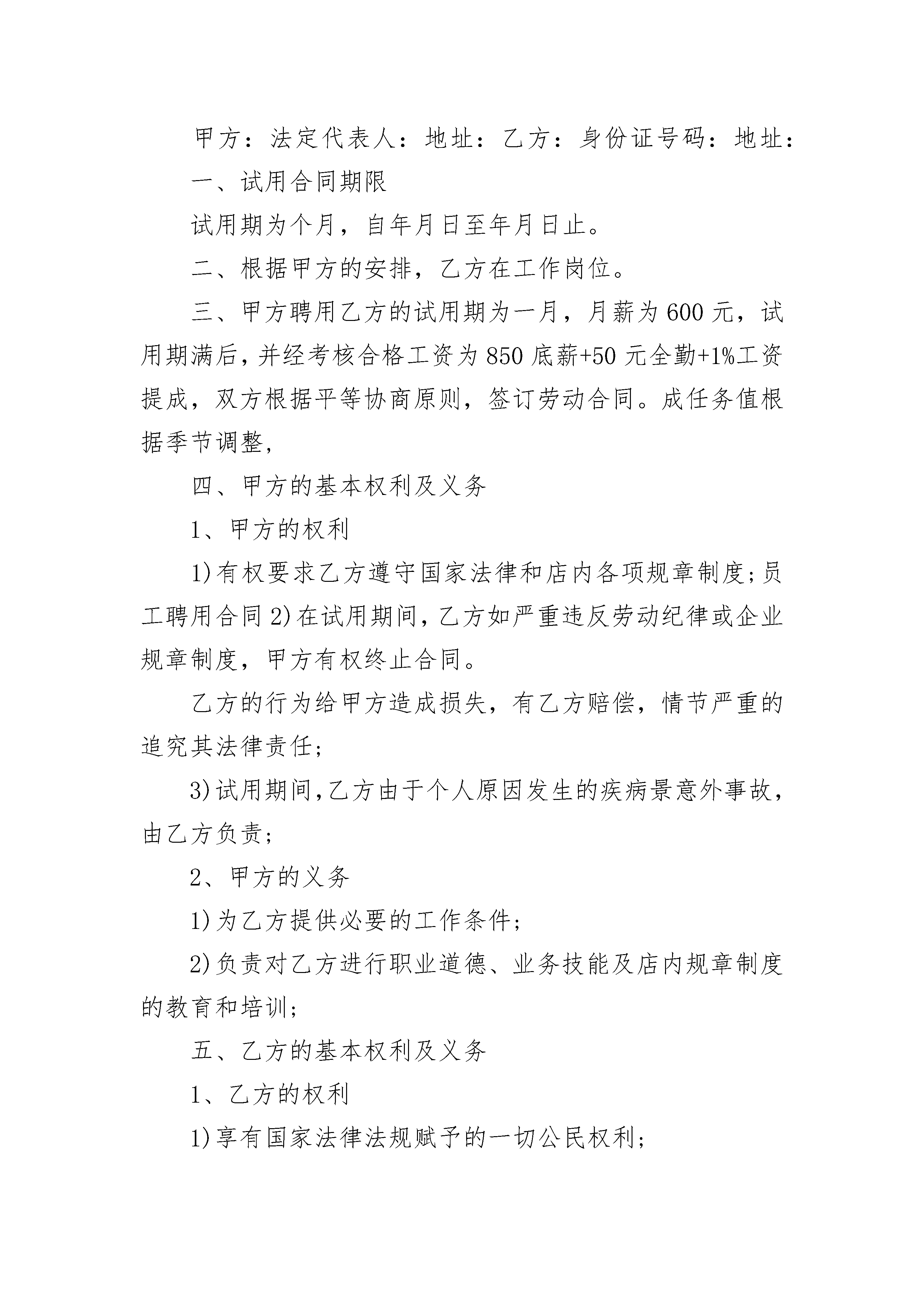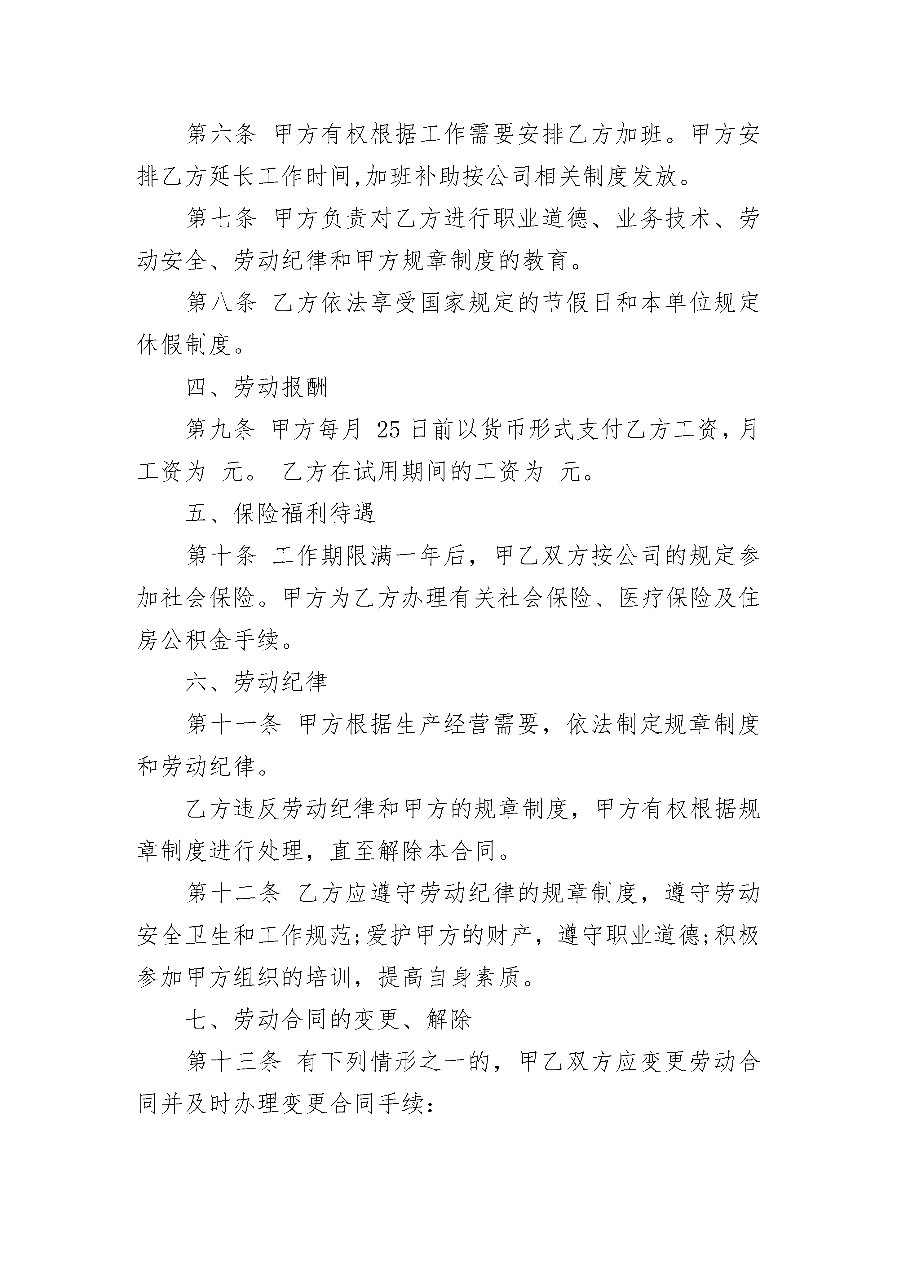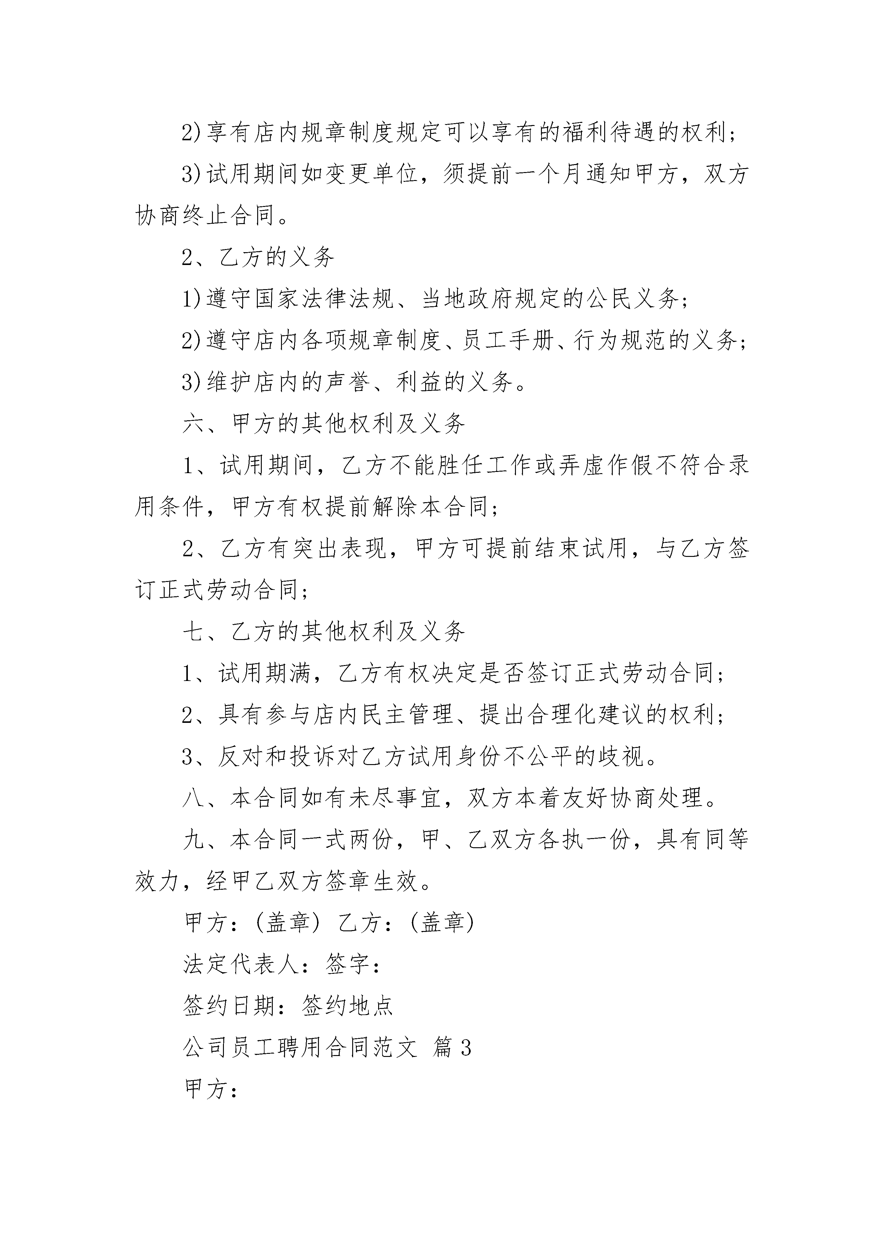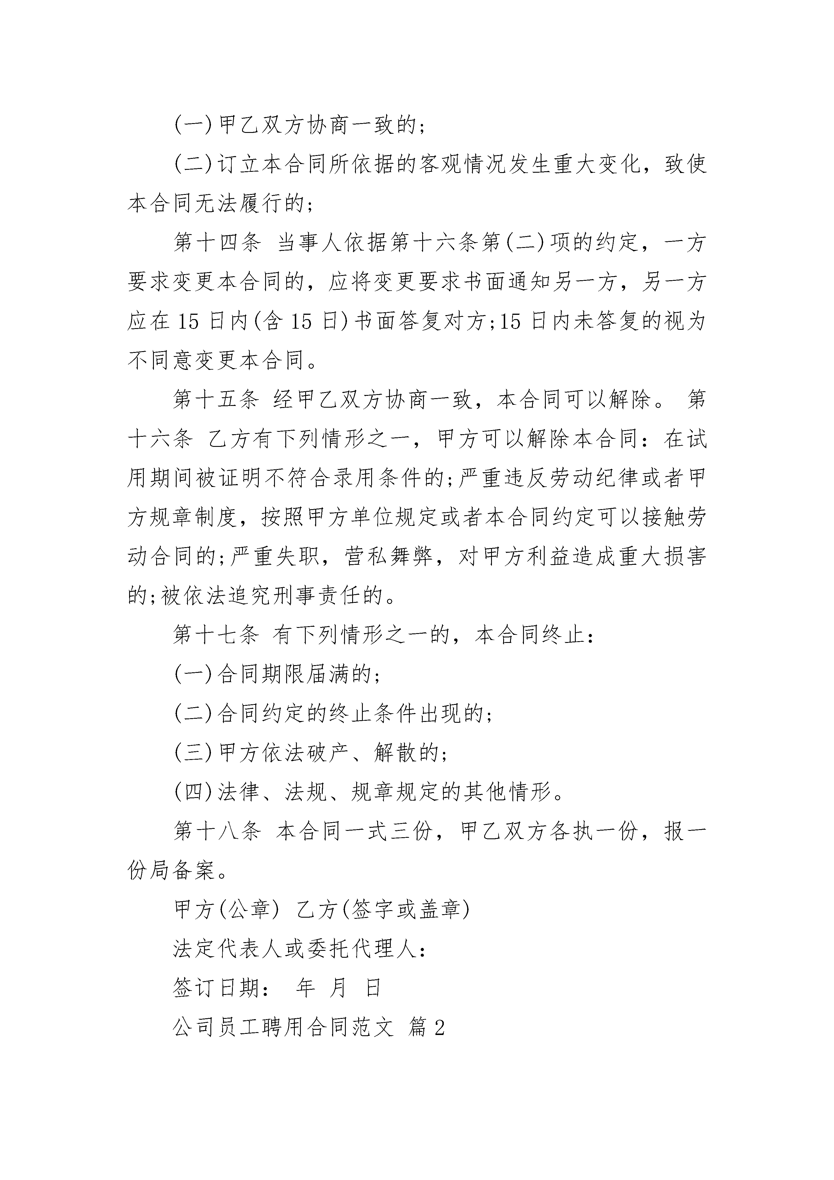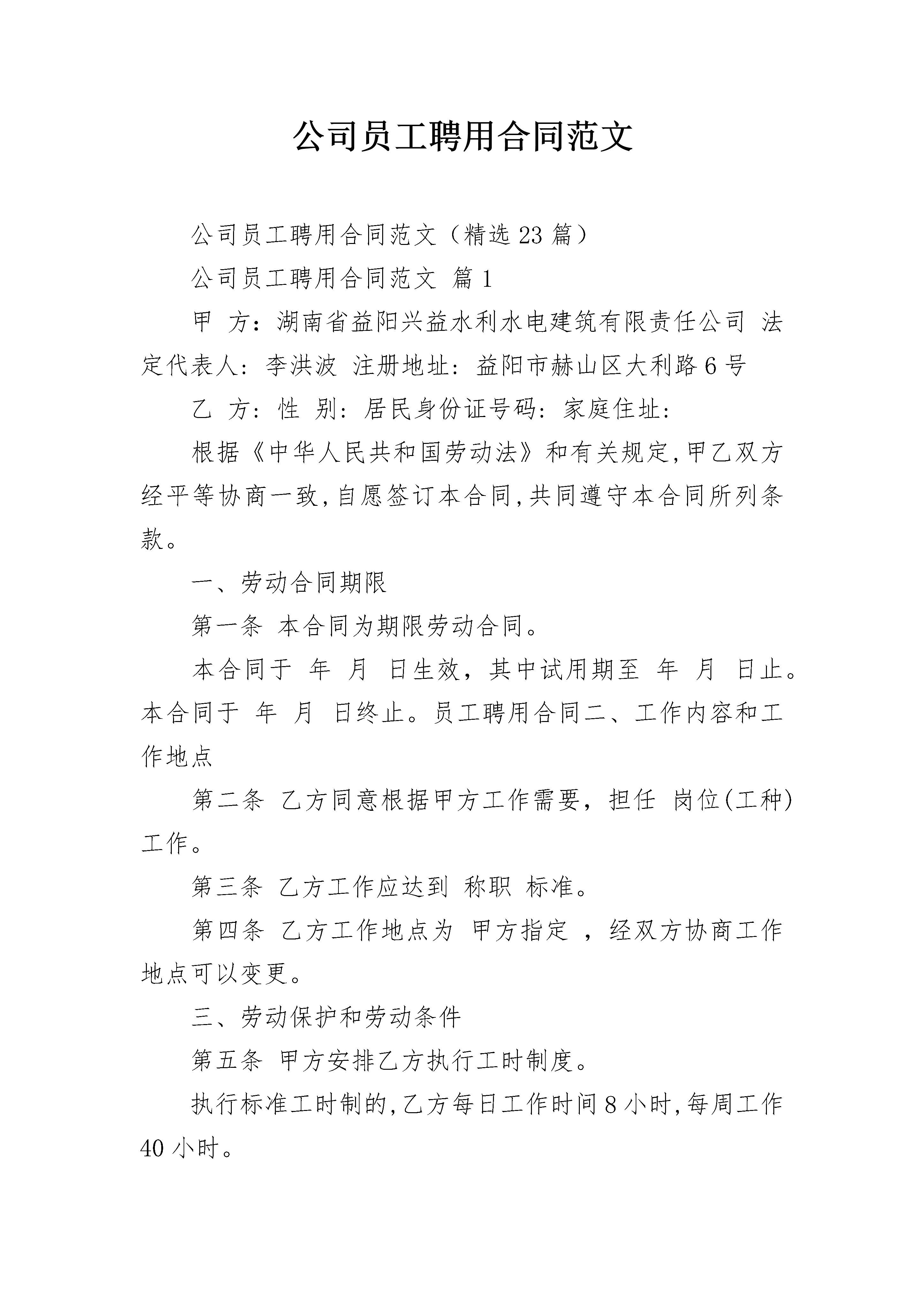 公司员工聘用合同范文公司员工聘用合同范文(精选23篇)公司员工聘用合同范文篇1甲方:湖南省益阳兴益水利水电建筑有限责任公司法定代表人:李洪波注册地址:益阳市赫山区大利路6号乙方:性别:居民身份证号码:家庭住址:根据《中华人民共和国劳动法》和有关规定,甲乙双方经平等协商一致,自愿签订本合同,共同遵守本合同所列条款。一、劳动合同期限第一条本合同为期限劳动合同。本合同于年月日生效,其中试用期至年月日止。本合同于年月日终止。员工聘用合同二、工作内容和工作地点第二条乙方同意根据甲方工作需要,担任岗位(工种)工作。第三条乙方工作应达到称职标准。第四条乙方工作地点为甲方指定,经双方协商工作地点可以变更。三、劳动保护和劳动条件第五条甲方安排乙方执行工时制度。执行标准工时制的,乙方每日工作时间8小时,每周工作40小时。第六条甲方有权根据工作需要安排乙方加班。甲方安排乙方延长工作时间,加班补助按公司相关制度发放。第七条甲方负责对乙方进行职业道德、业务技术、劳动安全、劳动纪律和甲方规章制度的教育。第八条乙方依法享受国家规定的节假日和本单位规定休假制度。四、劳动报酬第九条甲方每月25日前以货币形式支付乙方工资,月工资为元。乙方在试用期间的工资为元。五、保险福利待遇第十条工作期限满一年后,甲乙双方按公司的规定参加社会保险。甲方为乙方办理有关社会保险、医疗保险及住房公积金手续。六、劳动纪律第十一条甲方根据生产经营需要,依法制定规章制度和劳动纪律。乙方违反劳动纪律和甲方的规章制度,甲方有权根据规章制度进行处理,直至解除本合同。第十二条乙方应遵守劳动纪律的规章制度,遵守劳动安全卫生和工作规范;爱护甲方的财产,遵守职业道德;积极参加甲方组织的培训,提高自身素质。七、劳动合同的变更、解除第十三条有下列情形之一的,甲乙双方应变更劳动合同并及时办理变更合同手续:(一)甲乙双方协商一致的;(二)订立本合同所依据的客观情况发生重大变化,致使本合同无法履行的;第十四条当事人依据第十六条第(二)项的约定,一方要求变更本合同的,应将变更要求书面通知另一方,另一方应在15日内(含15日)书面答复对方;15日内未答复的视为不同意变更本合同。第十五条经甲乙双方协商一致,本合同可以解除。第十六条乙方有下列情形之一,甲方可以解除本合同:在试用期间被证明不符合录用条件的;严重违反劳动纪律或者甲方规章制度,按照甲方单位规定或者本合同约定可以接触劳动合同的;严重失职,营私舞弊,对甲方利益造成重大损害的;被依法追究刑事责任的。第十七条有下列情形之一的,本合同终止:(一)合同期限届满的;(二)合同约定的终止条件出现的;(三)甲方依法破产、解散的;(四)法律、法规、规章规定的其他情形。第十八条本合同一式三份,甲乙双方各执一份,报一份局备案。甲方(公章)乙方(签字或盖章)法定代表人或委托代理人:签订日期:年月日公司员工聘用合同范文篇2甲方:法定代表人:地址:乙方:身份证号码:地址:一、试用合同期限试用期为个月,自年月日至年月日止。二、根据甲方的安排,乙方在工作岗位。三、甲方聘用乙方的试用期为一月,月薪为600元,试用期满后,并经考核合格工资为850底薪+50元全勤+1%工资提成,双方根据平等协商原则,签订劳动合同。成任务值根据季节调整,四、甲方的基本权利及义务1、甲方的权利1)有权要求乙方遵守国家法律和店内各项规章制度;员工聘用合同2)在试用期间,乙方如严重违反劳动纪律或企业规章制度,甲方有权终止合同。乙方的行为给甲方造成损失,有乙方赔偿,情节严重的追究其法律责任;3)试用期间,乙方由于个人原因发生的疾病景意外事故,由乙方负责;2、甲方的义务1)为乙方提供必要的工作条件;2)负责对乙方进行职业道德、业务技能及店内规章制度的教育和培训;五、乙方的基本权利及义务1、乙方的权利1)享有国家法律法规赋予的一切公民权利;2)享有店内规章制度规定可以享有的福利待遇的权利;3)试用期间如变更单位,须提前一个月通知甲方,双方协商终止合同。2、乙方的义务1)遵守国家法律法规、当地政府规定的公民义务;2)遵守店内各项规章制度、员工手册、行为规范的义务;3)维护店内的声誉、利益的义务。六、甲方的其他权利及义务1、试用期间,乙方不能胜任工作或弄虚作假不符合录用条件,甲方有权提前解除本合同;2、乙方有突出表现,甲方可提前结束试用,与乙方签订正式劳动合同;七、乙方的其他权利及义务1、试用期满,乙方有权决定是否签订正式劳动合同;2、具有参与店内民主管理、提出合理化建议的权利;3、反对和投诉对乙方试用身份不公平的歧视。八、本合同如有未尽事宜,双方本着友好协商处理。九、本合同一式两份,甲、乙双方各执一份,具有同等效力,经甲乙双方签章生效。甲方:(盖章)乙方:(盖章)法定代表人:签字:签约日期:签约地点公司员工聘用合同范文篇3甲方