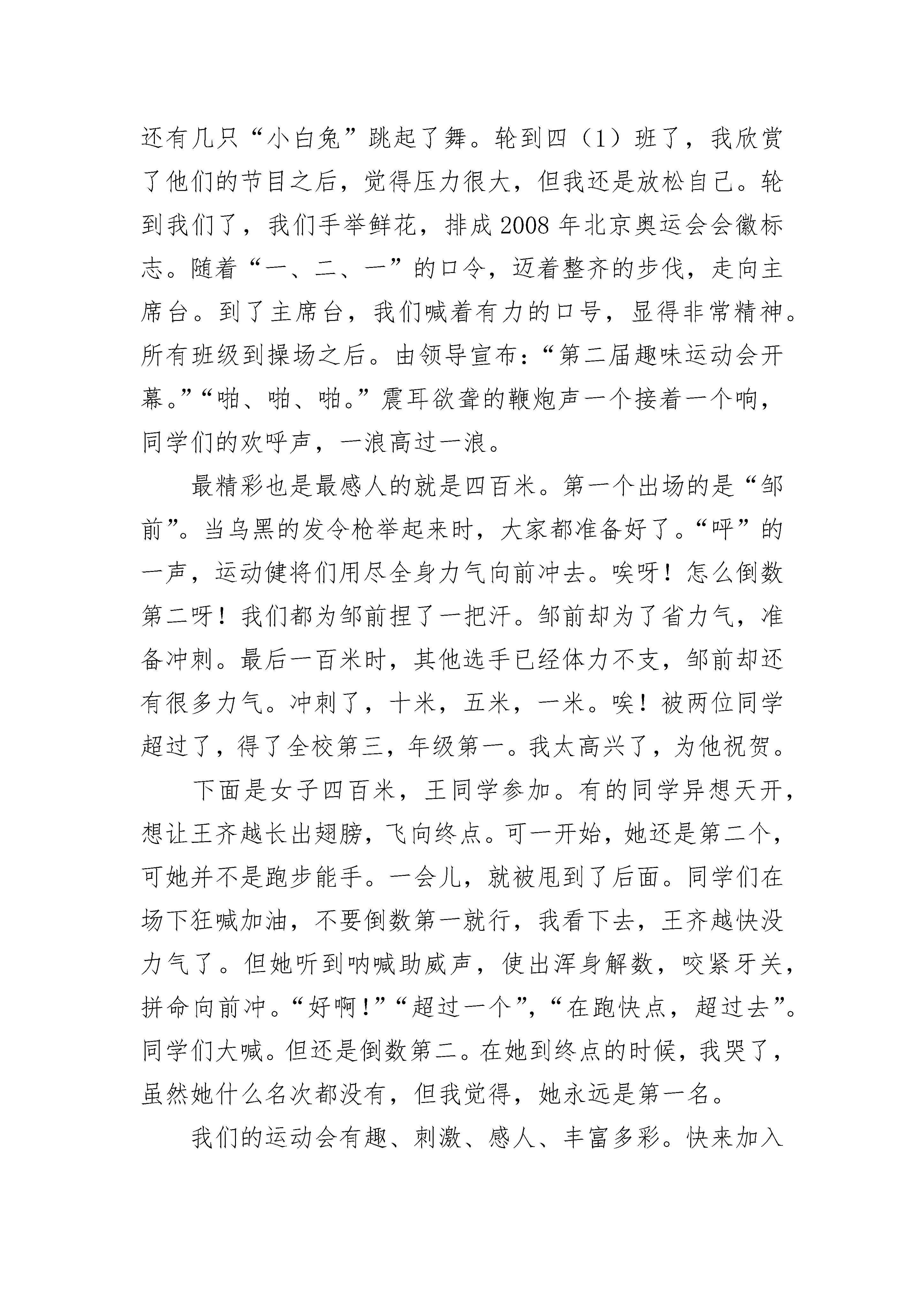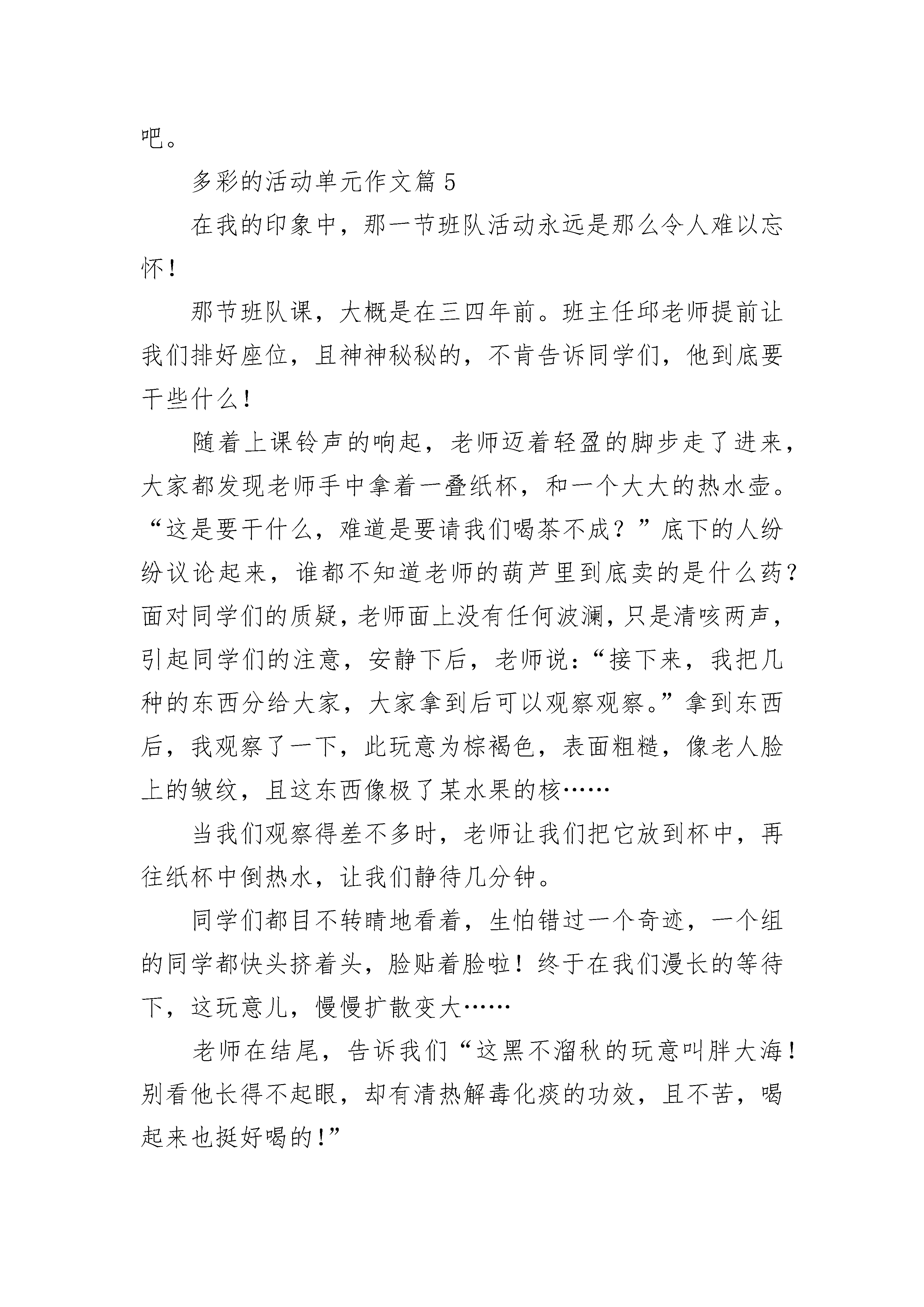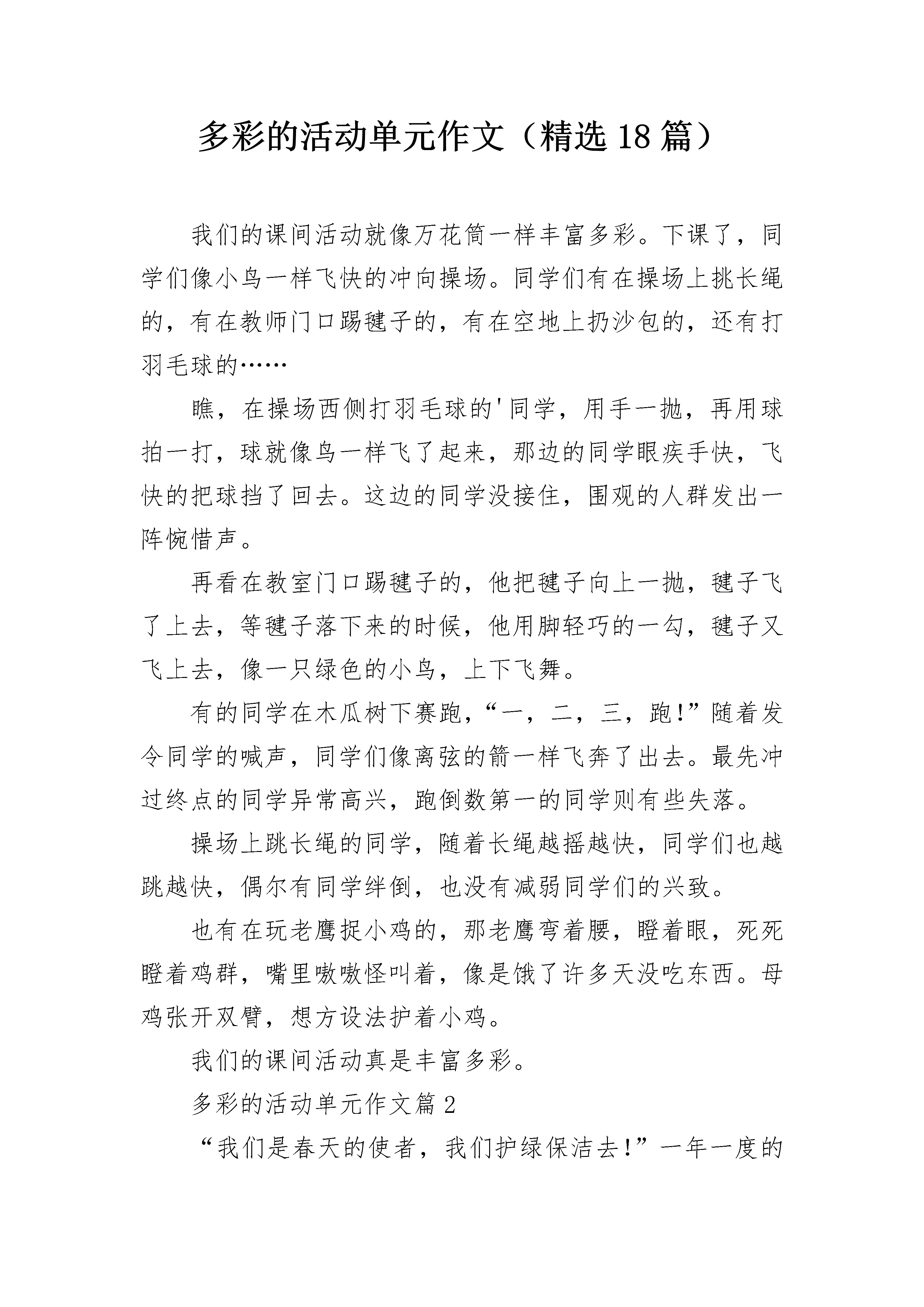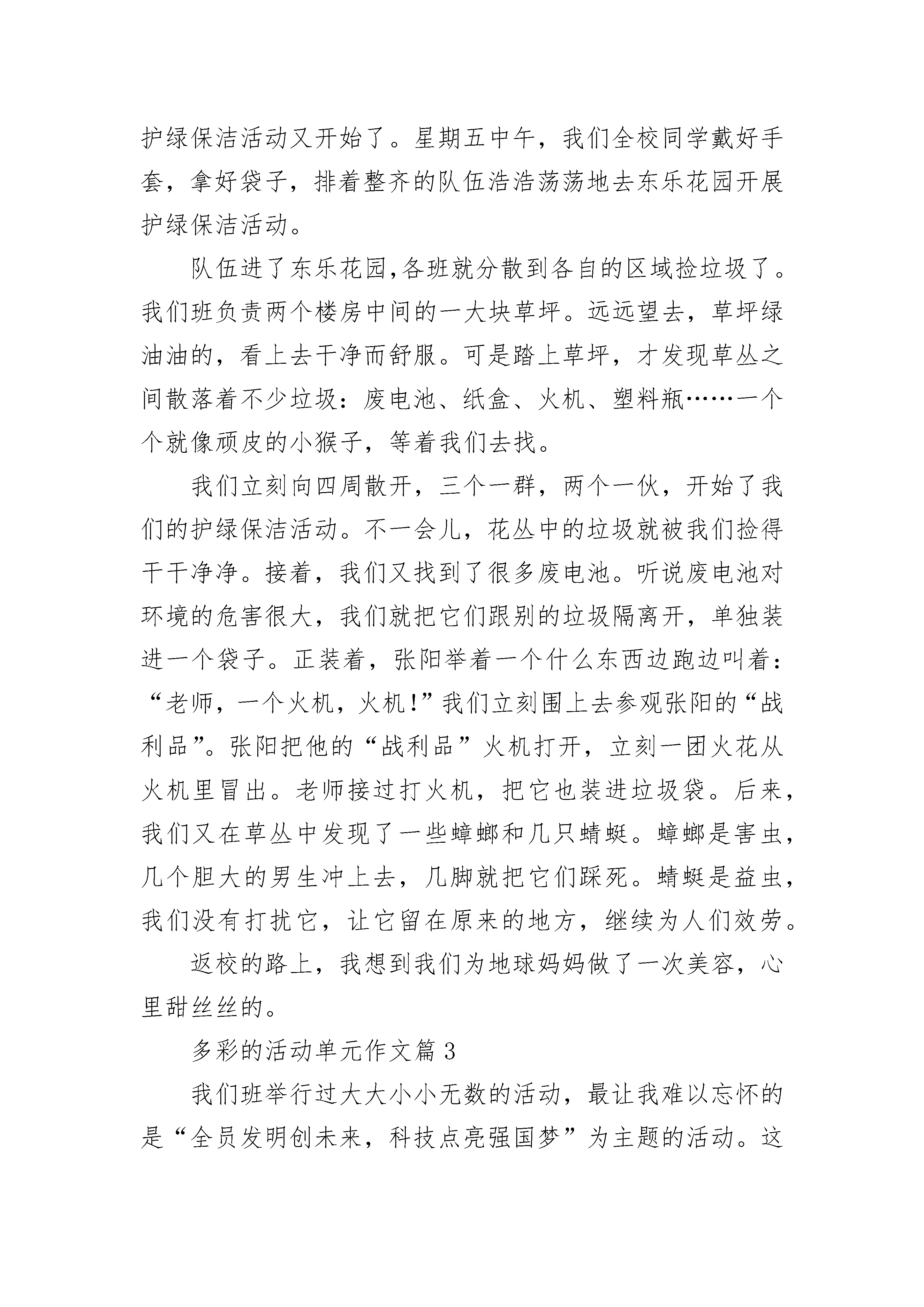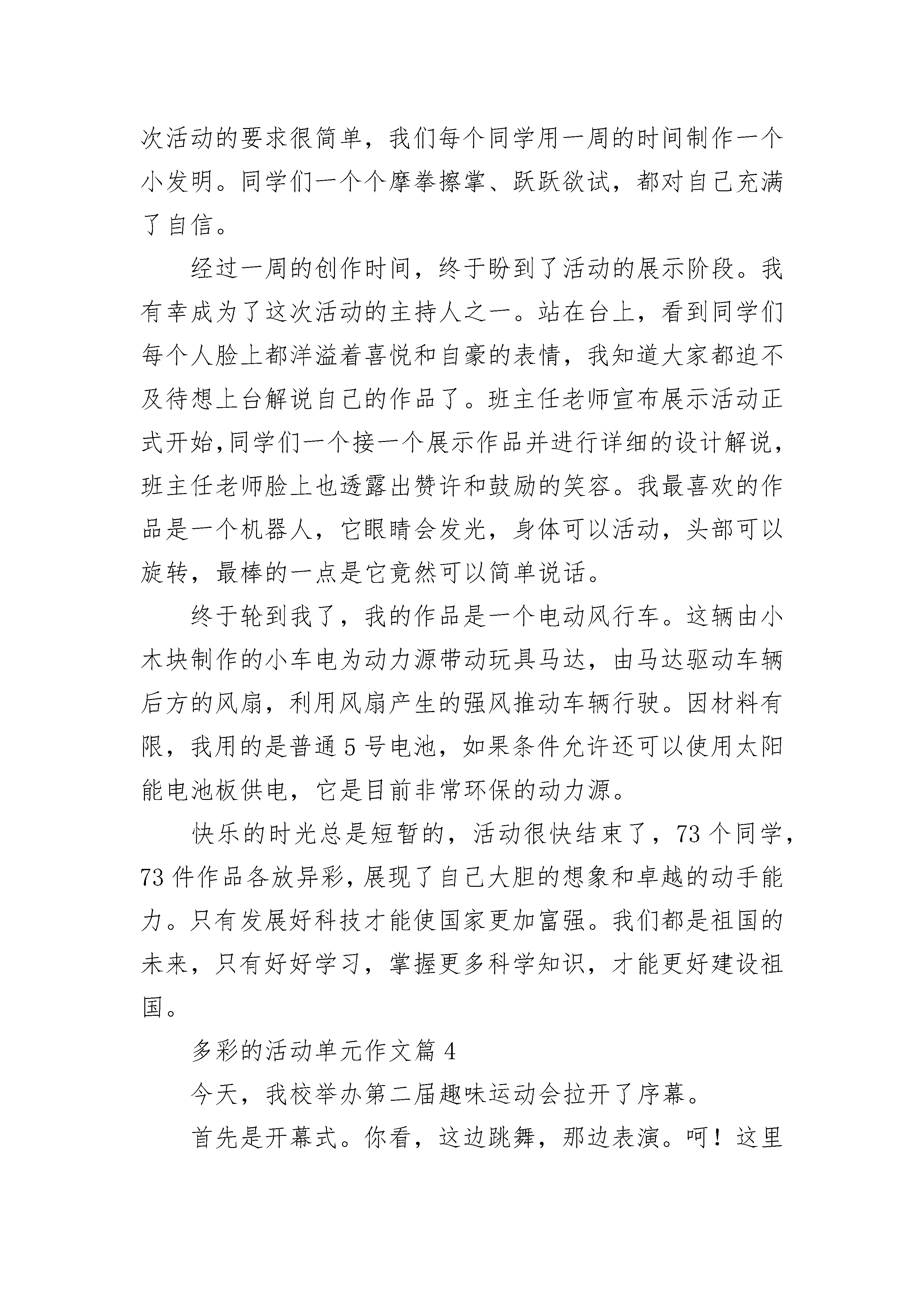 多彩的活动单元作文(精选18篇)我们的课间活动就像万花筒一样丰富多彩。下课了,同学们像小鸟一样飞快的冲向操场。同学们有在操场上挑长绳的,有在教师门口踢毽子的,有在空地上扔沙包的,还有打羽毛球的……瞧,在操场西侧打羽毛球的'同学,用手一抛,再用球拍一打,球就像鸟一样飞了起来,那边的同学眼疾手快,飞快的把球挡了回去。这边的同学没接住,围观的人群发出一阵惋惜声。再看在教室门口踢毽子的,他把毽子向上一抛,毽子飞了上去,等毽子落下来的时候,他用脚轻巧的一勾,毽子又飞上去,像一只绿色的小鸟,上下飞舞。有的同学在木瓜树下赛跑,“一,二,三,跑!”随着发令同学的喊声,同学们像离弦的箭一样飞奔了出去。最先冲过终点的同学异常高兴,跑倒数第一的同学则有些失落。操场上跳长绳的同学,随着长绳越摇越快,同学们也越跳越快,偶尔有同学绊倒,也没有减弱同学们的兴致。也有在玩老鹰捉小鸡的,那老鹰弯着腰,瞪着眼,死死瞪着鸡群,嘴里嗷嗷怪叫着,像是饿了许多天没吃东西。母鸡张开双臂,想方设法护着小鸡。我们的课间活动真是丰富多彩。多彩的活动单元作文篇2“我们是春天的使者,我们护绿保洁去!”一年一度的护绿保洁活动又开始了。星期五中午,我们全校同学戴好手套,拿好袋子,排着整齐的队伍浩浩荡荡地去东乐花园开展护绿保洁活动。队伍进了东乐花园,各班就分散到各自的区域捡垃圾了。我们班负责两个楼房中间的一大块草坪。远远望去,草坪绿油油的,看上去干净而舒服。可是踏上草坪,才发现草丛之间散落着不少垃圾:废电池、纸盒、火机、塑料瓶……一个个就像顽皮的小猴子,等着我们去找。我们立刻向四周散开,三个一群,两个一伙,开始了我们的护绿保洁活动。不一会儿,花丛中的垃圾就被我们捡得干干净净。接着,我们又找到了很多废电池。听说废电池对环境的危害很大,我们就把它们跟别的垃圾隔离开,单独装进一个袋子。正装着,张阳举着一个什么东西边跑边叫着:“老师,一个火机,火机!”我们立刻围上去参观张阳的“战利品”。张阳把他的“战利品”火机打开,立刻一团火花从火机里冒出。老师接过打火机,把它也装进垃圾袋。后来,我们又在草丛中发现了一些蟑螂和几只蜻蜓。蟑螂是害虫,几个胆大的男生冲上去,几脚就把它们踩死。蜻蜓是益虫,我们没有打扰它,让它留在原来的地方,继续为人们效劳。返校的路上,我想到我们为地球妈妈做了一次美容,心里甜丝丝的。多彩的活动单元作文篇3我们班举行过大大小小无数的活动,最让我难以忘怀的是“全员发明创未来,科技点亮强国梦”为主题的活动。这次活动的要求很简单,我们每个同学用一周的时间制作一个小发明。同学们一个个摩拳擦掌、跃跃欲试,都对自己充满了自信。经过一周的创作时间,终于盼到了活动的展示阶段。我有幸成为了这次活动的主持人之一。站在台上,看到同学们每个人脸上都洋溢着喜悦和自豪的表情,我知道大家都迫不及待想上台解说自己的作品了。班主任老师宣布展示活动正式开始,同学们一个接一个展示作品并进行详细的设计解说,班主任老师脸上也透露出赞许和鼓励的笑容。我最喜欢的作品是一个机器人,它眼睛会发光,身体可以活动,头部可以旋转,最棒的一点是它竟然可以简单说话。终于轮到我了,我的作品是一个电动风行车。这辆由小木块制作的小车电为动力源带动玩具马达,由马达驱动车辆后方的风扇,利用风扇产生的强风推动车辆行驶。因材料有限,我用的是普通5号电池,如果条件允许还可以使用太阳能电池板供电,它是目前非常环保的动力源。快乐的时光总是短暂的,活动很快结束了,73个同学,73件作品各放异彩,展现了自己大胆的想象和卓越的动手能力。只有发展好科技才能使国家更加富强。我们都是祖国的未来,只有好好学习,掌握更多科学知识,才能更好建设祖国。多彩的活动单元作文篇4今天,我校举办第二届趣味运动会拉开了序幕。首先是开幕式。你看,这边跳舞,那边表演。呵!这里还有几只“小白兔”跳起了舞。轮到四(1)班了,我欣赏了他们的节目之后,觉得压力很大,但我还是放松自己。轮到我们了,我们手举鲜花,排成2008年北京奥运会会徽标志。随着“一、二、一”的口令,迈着整齐的步伐,走向主席台。到了主席台,我们喊着有力的口号,显得非常精神。所有班级到操场之后。由领导宣布:“第二届趣味运动会开幕。”“啪、啪、啪。”震耳欲聋的鞭炮声一个接着一个响,同学们的欢呼声,一浪高过一浪。最精彩也是最感人的就是四百米。第一个出场的是“邹前”。当乌黑的发令枪举起来时,大家都准备好了。“呯”的一声,运动健将们用尽全身力气向前冲去。唉呀!怎么倒数第二呀!我们都为邹前捏了一把汗。邹前却为了省力气,准备冲刺。最后一百米时,其他选手已经体力不支,邹前却还有很多力气。冲刺了,十米,五米,一米。唉!被两位同学超过了,得了全校第三,年级第一。我太高兴了,为他祝贺。下面是女子四百米,王同学参加。有的同学异想天开,想让王齐越长出翅膀,飞向终