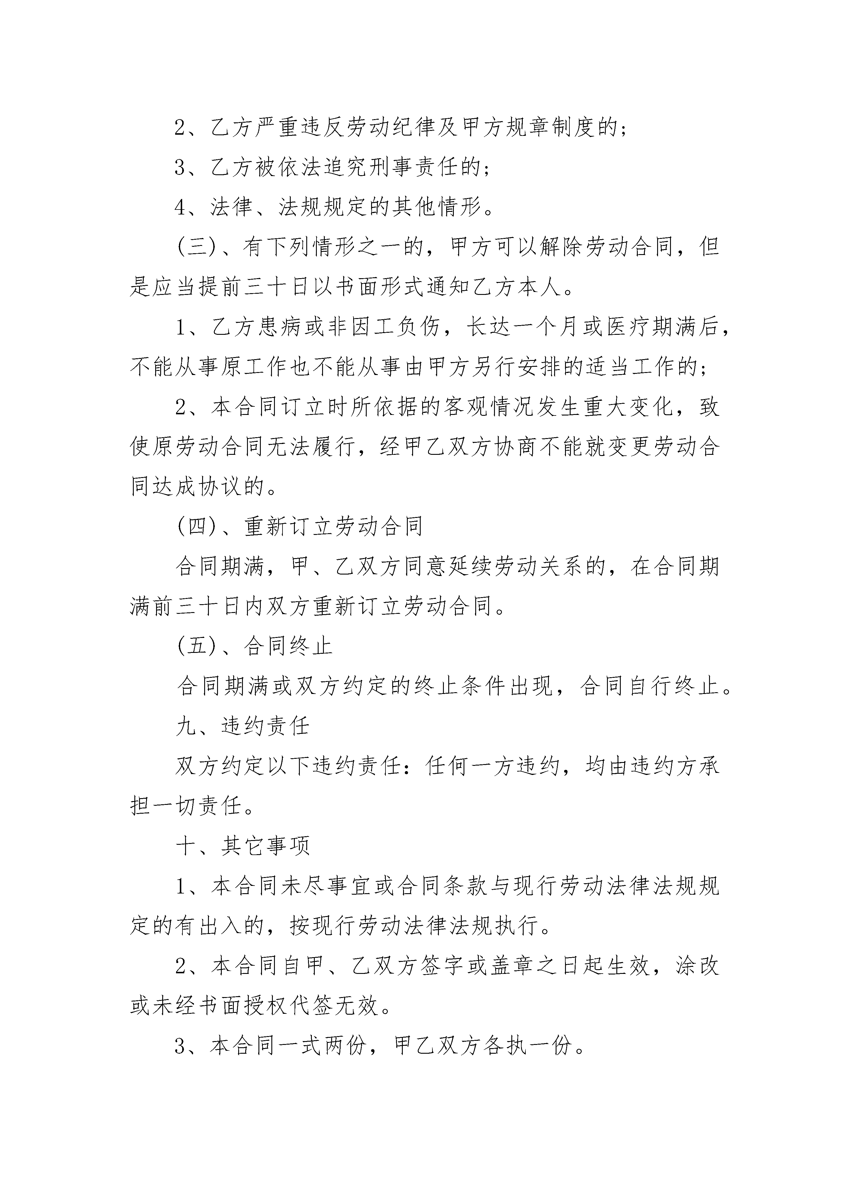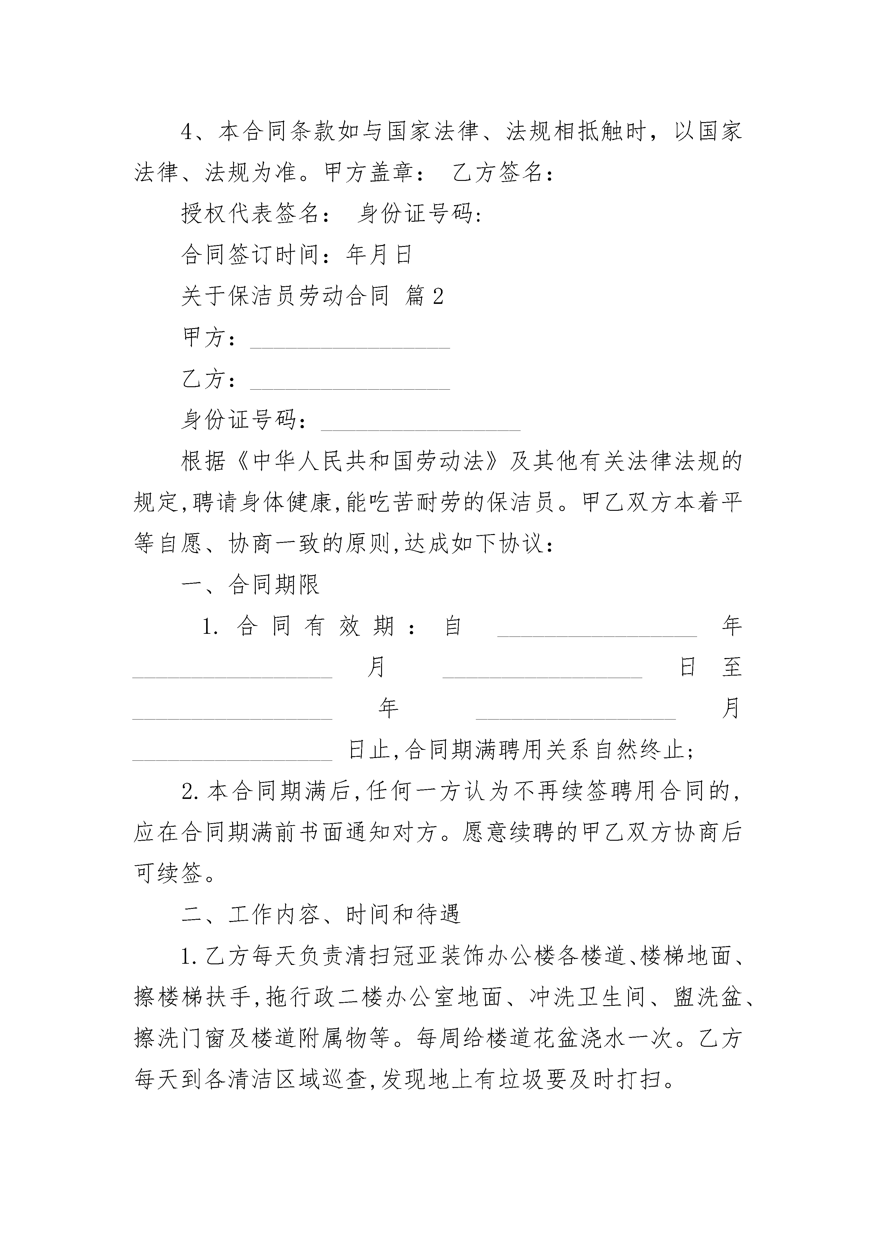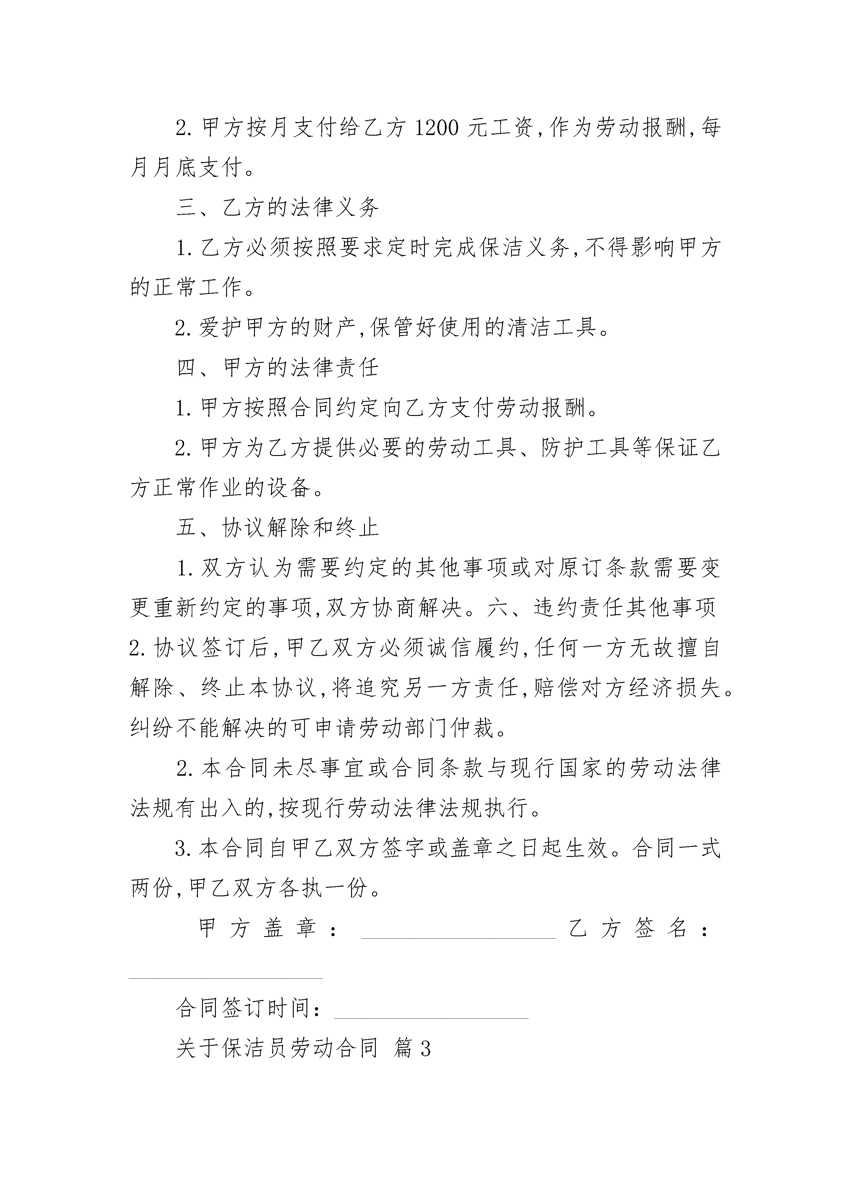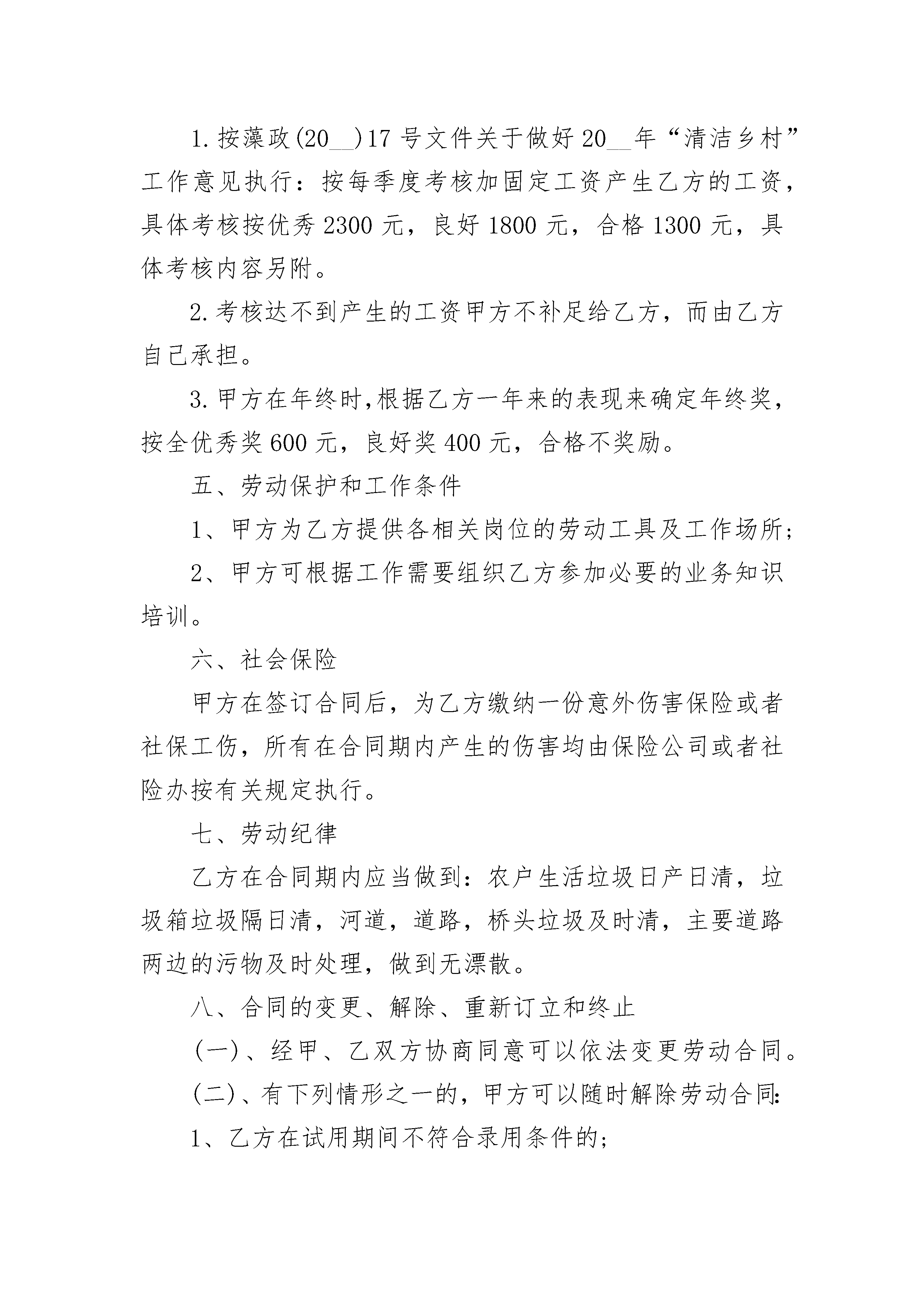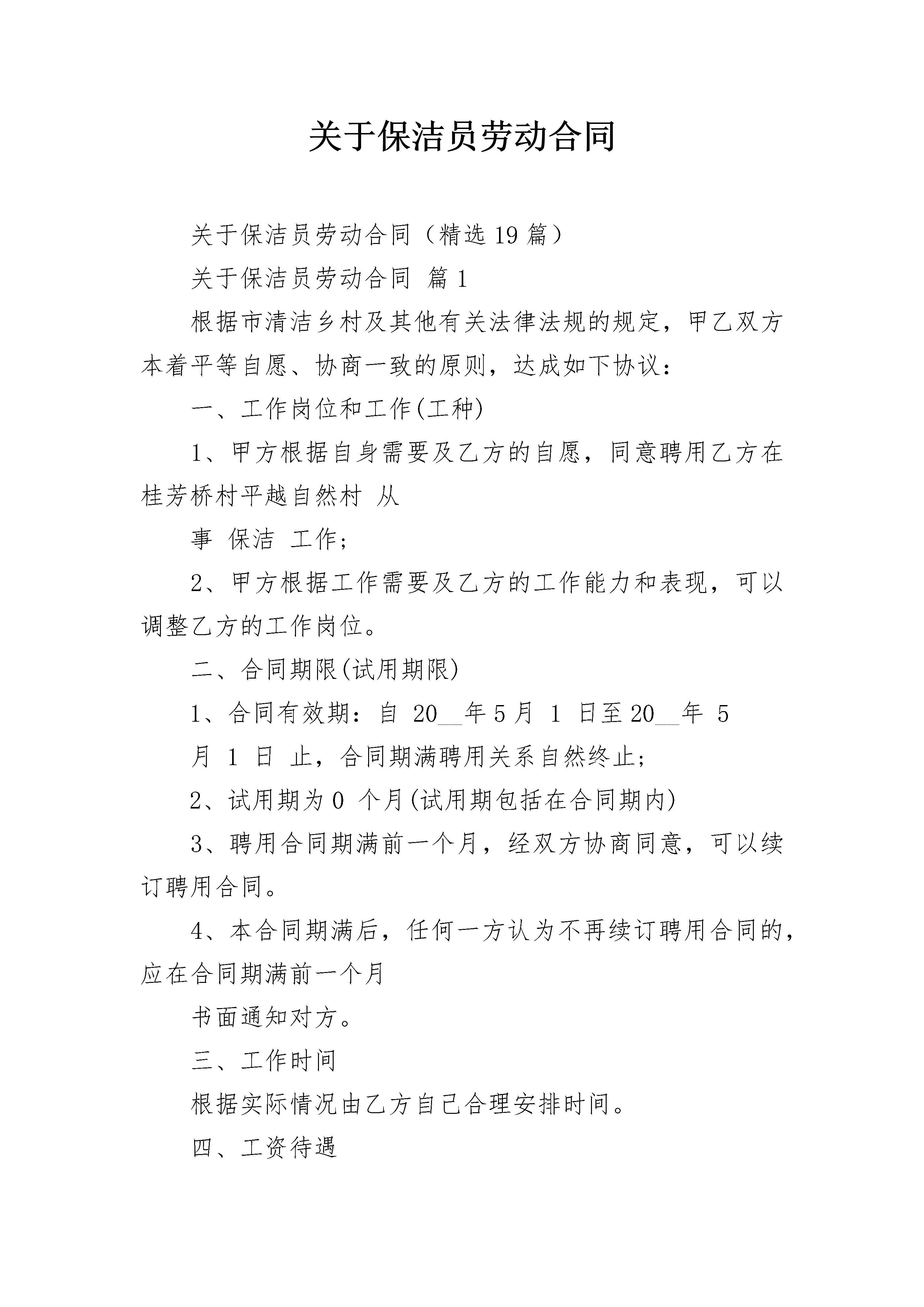 关于保洁员劳动合同关于保洁员劳动合同(精选19篇)关于保洁员劳动合同篇1根据市清洁乡村及其他有关法律法规的规定,甲乙双方本着平等自愿、协商一致的原则,达成如下协议:一、工作岗位和工作(工种)1、甲方根据自身需要及乙方的自愿,同意聘用乙方在桂芳桥村平越自然村从事保洁工作;2、甲方根据工作需要及乙方的工作能力和表现,可以调整乙方的工作岗位。二、合同期限(试用期限)1、合同有效期:自20__年5月1日至20__年5月1日止,合同期满聘用关系自然终止;2、试用期为0个月(试用期包括在合同期内)3、聘用合同期满前一个月,经双方协商同意,可以续订聘用合同。4、本合同期满后,任何一方认为不再续订聘用合同的,应在合同期满前一个月书面通知对方。三、工作时间根据实际情况由乙方自己合理安排时间。四、工资待遇1.按藻政(20__)17号文件关于做好20__年“清洁乡村”工作意见执行:按每季度考核加固定工资产生乙方的工资,具体考核按优秀2300元,良好1800元,合格1300元,具体考核内容另附。2.考核达不到产生的工资甲方不补足给乙方,而由乙方自己承担。3.甲方在年终时,根据乙方一年来的表现来确定年终奖,按全优秀奖600元,良好奖400元,合格不奖励。五、劳动保护和工作条件1、甲方为乙方提供各相关岗位的劳动工具及工作场所;2、甲方可根据工作需要组织乙方参加必要的业务知识培训。六、社会保险甲方在签订合同后,为乙方缴纳一份意外伤害保险或者社保工伤,所有在合同期内产生的伤害均由保险公司或者社险办按有关规定执行。七、劳动纪律乙方在合同期内应当做到:农户生活垃圾日产日清,垃圾箱垃圾隔日清,河道,道路,桥头垃圾及时清,主要道路两边的污物及时处理,做到无漂散。八、合同的变更、解除、重新订立和终止(一)、经甲、乙双方协商同意可以依法变更劳动合同。(二)、有下列情形之一的,甲方可以随时解除劳动合同:1、乙方在试用期间不符合录用条件的;2、乙方严重违反劳动纪律及甲方规章制度的;3、乙方被依法追究刑事责任的;4、法律、法规规定的其他情形。(三)、有下列情形之一的,甲方可以解除劳动合同,但是应当提前三十日以书面形式通知乙方本人。1、乙方患病或非因工负伤,长达一个月或医疗期满后,不能从事原工作也不能从事由甲方另行安排的适当工作的;2、本合同订立时所依据的客观情况发生重大变化,致使原劳动合同无法履行,经甲乙双方协商不能就变更劳动合同达成协议的。(四)、重新订立劳动合同合同期满,甲、乙双方同意延续劳动关系的,在合同期满前三十日内双方重新订立劳动合同。(五)、合同终止合同期满或双方约定的终止条件出现,合同自行终止。九、违约责任双方约定以下违约责任:任何一方违约,均由违约方承担一切责任。十、其它事项1、本合同未尽事宜或合同条款与现行劳动法律法规规定的有出入的,按现行劳动法律法规执行。2、本合同自甲、乙双方签字或盖章之日起生效,涂改或未经书面授权代签无效。3、本合同一式两份,甲乙双方各执一份。4、本合同条款如与国家法律、法规相抵触时,以国家法律、法规为准。甲方盖章:乙方签名:授权代表签名:身份证号码:合同签订时间:年月日关于保洁员劳动合同篇2甲方:_________________乙方:_________________身份证号码:_________________根据《中华人民共和国劳动法》及其他有关法律法规的规定,聘请身体健康,能吃苦耐劳的保洁员。甲乙双方本着平等自愿、协商一致的原则,达成如下协议:一、合同期限1.合同有效期:自_________________年_________________月_________________日至_________________年_________________月_________________日止,合同期满聘用关系自然终止;2.本合同期满后,任何一方认为不再续签聘用合同的,应在合同期满前书面通知对方。愿意续聘的甲乙双方协商后可续签。二、工作内容、时间和待遇1.乙方每天负责清扫冠亚装饰办公楼各楼道、楼梯地面、擦楼梯扶手,拖行政二楼办公室地面、冲洗卫生间、盥洗盆、擦洗门窗及楼道附属物等。每周给楼道花盆浇水一次。乙方每天到各清洁区域巡查,发现地上有垃圾要及时打扫。2.甲方按月支付给乙方1200元工资,作为劳动报酬,每月月底支付。三、乙方的法律义务1.乙方必须按照要求定时完成保洁义务,不得影响甲方的正常工作。2.爱护甲方的财产,保管好使用的清洁工具。四、甲方的法律责任1.甲方按照合同约定向乙方支付劳动报酬。2.甲方为乙方提供必要的劳动工具、防护工具等保证乙方正常作业的设备。五、协议解除和终止1.双方认为需要约定的其他事项或对原订条款需要变更重新约定的事项,双方协商解决。六、违约责任其他事项2.协议签订后,甲乙双方必须诚信履约,任何一方无故