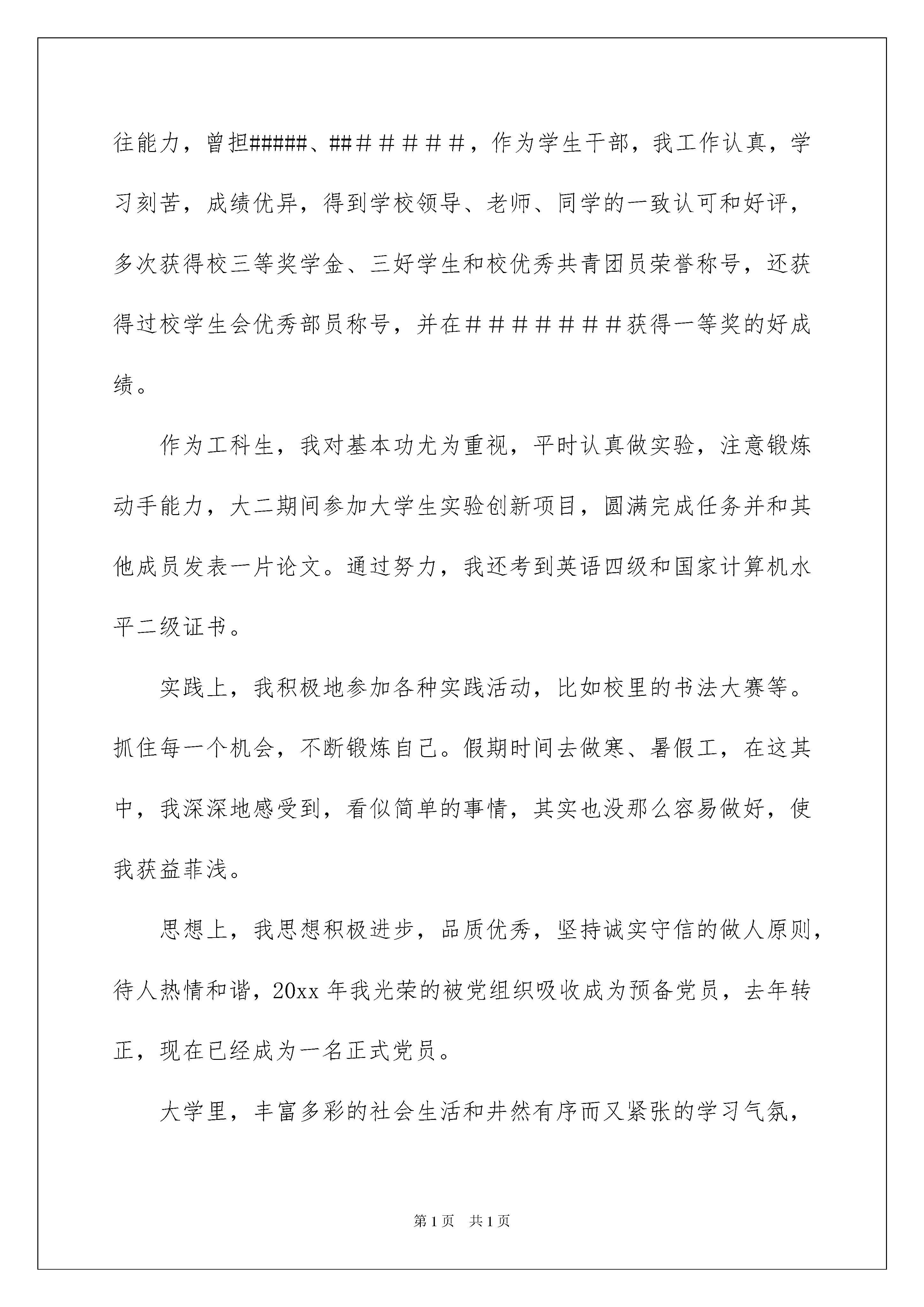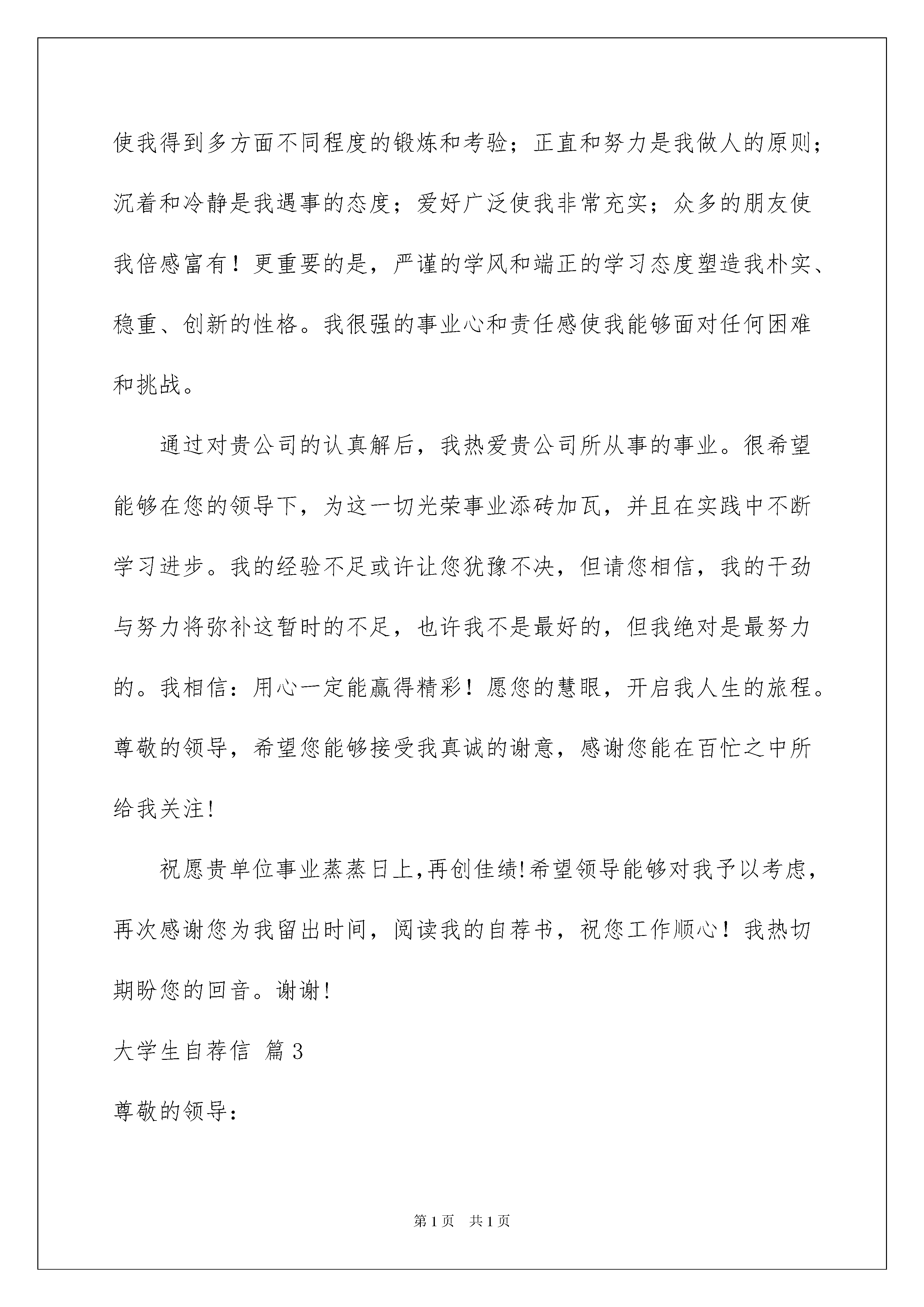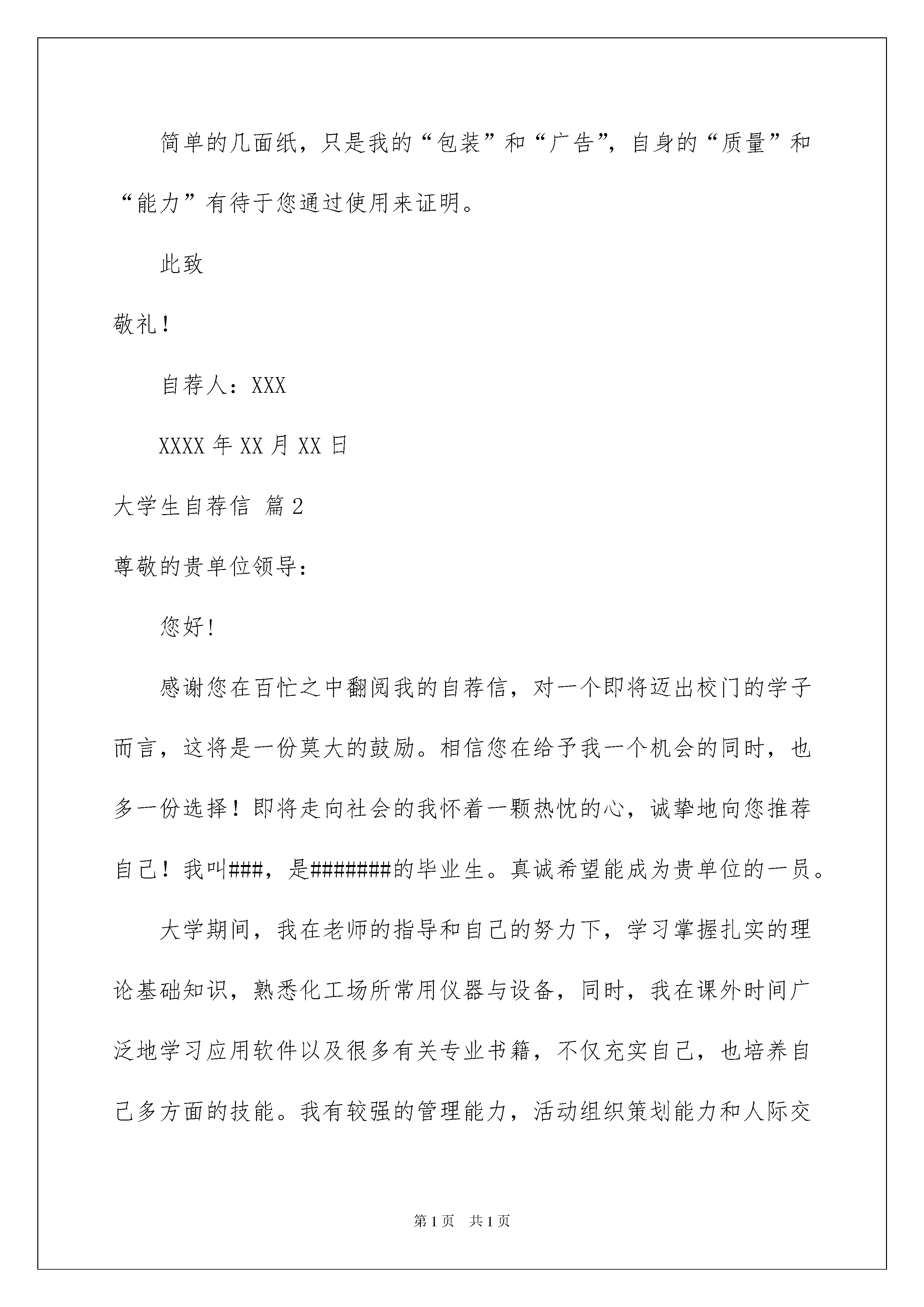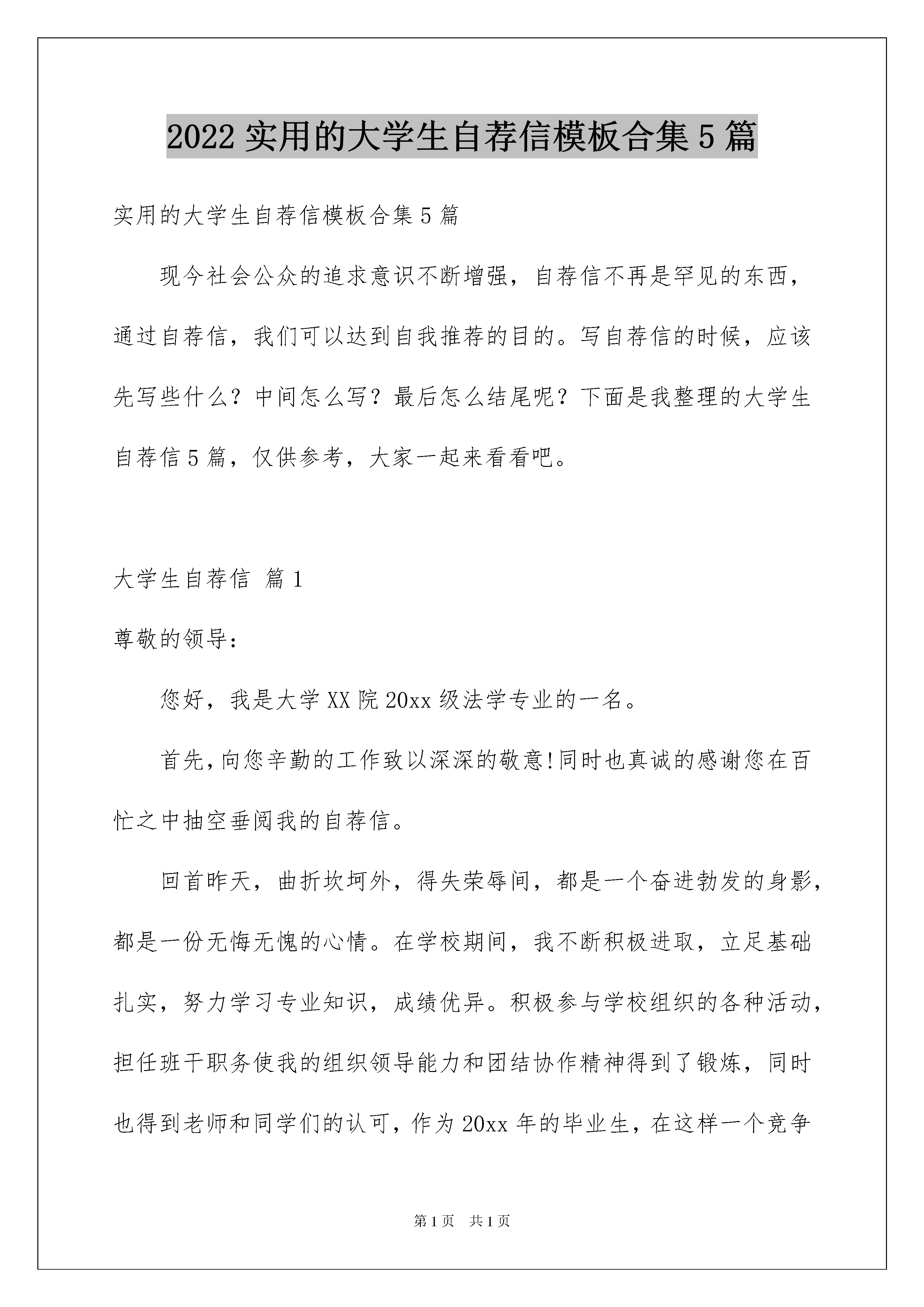 2022实用的大学生自荐信模板合集5篇实用的大学生自荐信模板合集5篇现今社会公众的追求意识不断增强,自荐信不再是罕见的东西,通过自荐信,我们可以达到自我推荐的目的。写自荐信的时候,应该先写些什么?中间怎么写?最后怎么结尾呢?下面是我整理的大学生自荐信5篇,仅供参考,大家一起来看看吧。大学生自荐信篇1尊敬的领导:您好,我是大学XX院20xx级法学专业的一名。首先,向您辛勤的工作致以深深的敬意!同时也真诚的感谢您在百忙之中抽空垂阅我的自荐信。回首昨天,曲折坎坷外,得失荣辱间,都是一个奋进勃发的身影,都是一份无悔无愧的心情。在学校期间,我不断积极进取,立足基础扎实,努力学习专业知识,成绩优异。积极参与学校组织的各种活动,担任班干职务使我的组织领导能力和团结协作精神得到了锻炼,同时也得到老师和同学们的认可,作为20xx年的毕业生,在这样一个竞争激烈的社会里,不仅要掌握好专业知识,更加做到与社会与时代接轨。因此,学习之余,我注重知识与能力的平衡发展。刚踏出校门的我谈不上十分的成熟和足够的经验,但我有过人的胆识和自信心,正所谓:“是龙,就应该去大海搏击,是鹰,就应该去长空翱翔。”面临人生的重大抉择,我希望能加盟于贵单位,展示自己的才能,实现个人的理想与价值。作为一名法学专业的学生,我的大学生涯当然离不开法律。宪法、民法、经济法、诉讼费、刑事法、商法、国际法等等,陪伴我过了大学的四年。有人说,法学专业的学生是寂寞的,因为陪伴着他们的只有各种的法律和考试。而我觉得我大学四年并不寂寞,正是这些法律陪伴着我,考试鞭策着我,我有了自己的目标,将来成为一名帮助弱势群里的律师。四年的行程下来,我通过法学的考试,拿到了奖学金。也证明了我所付出的努力,并没有白费。我为人正直忠诚、勤奋求实的人,不断追求人格的自我完善,我的性格乐观自信、温和开朗、稳重宽厚,因此,我人际关系和谐,适应环境能力较强,所以我觉得自己是很适合到贵公司这样的公司工作的。简单的几面纸,只是我的“包装”和“广告”,自身的“质量”和“能力”有待于您通过使用来证明。此致敬礼!自荐人:XXXXXXX年XX月XX日大学生自荐信篇2尊敬的贵单位领导:您好!感谢您在百忙之中翻阅我的自荐信,对一个即将迈出校门的学子而言,这将是一份莫大的鼓励。相信您在给予我一个机会的同时,也多一份选择!即将走向社会的我怀着一颗热忱的心,诚挚地向您推荐自己!我叫###,是#######的毕业生。真诚希望能成为贵单位的一员。大学期间,我在老师的指导和自己的努力下,学习掌握扎实的理论基础知识,熟悉化工场所常用仪器与设备,同时,我在课外时间广泛地学习应用软件以及很多有关专业书籍,不仅充实自己,也培养自己多方面的技能。我有较强的管理能力,活动组织策划能力和人际交往能力,曾担#####、#######,作为学生干部,我工作认真,学习刻苦,成绩优异,得到学校领导、老师、同学的一致认可和好评,多次获得校三等奖学金、三好学生和校优秀共青团员荣誉称号,还获得过校学生会优秀部员称号,并在#######获得一等奖的好成绩。作为工科生,我对基本功尤为重视,平时认真做实验,注意锻炼动手能力,大二期间参加大学生实验创新项目,圆满完成任务并和其他成员发表一片论文。通过努力,我还考到英语四级和国家计算机水平二级证书。实践上,我积极地参加各种实践活动,比如校里的书法大赛等。抓住每一个机会,不断锻炼自己。假期时间去做寒、暑假工,在这其中,我深深地感受到,看似简单的事情,其实也没那么容易做好,使我获益菲浅。思想上,我思想积极进步,品质优秀,坚持诚实守信的做人原则,待人热情和谐,20xx年我光荣的被党组织吸收成为预备党员,去年转正,现在已经成为一名正式党员。大学里,丰富多彩的社会生活和井然有序而又紧张的学习气氛,使我得到多方面不同程度的锻炼和考验;正直和努力是我做人的原则;沉着和冷静是我遇事的态度;爱好广泛使我非常充实;众多的朋友使我倍感富有!更重要的是,严谨的学风和端正的学习态度塑造我朴实、稳重、创新的性格。我很强的事业心和责任感使我能够面对任何困难和挑战。通过对贵公司的认真解后,我热爱贵公司所从事的事业。很希望能够在您的领导下,为这一切光荣事业添砖加瓦,并且在实践中不断学习进步。我的经验不足或许让您犹豫不决,但请您相信,我的干劲与努力将弥补这暂时的不足,也许我不是最好的,但我绝对是最努力的。我相信:用心一定能赢得精彩!愿您的慧眼,开启我人生的旅程。尊敬的领导,希望您能够接受我真诚的谢意,感谢您能在百忙之中所给我关注!祝愿贵单位事业蒸蒸日上,再创佳绩!希望领导能够对我予以考虑,再次感谢您为我留出时间,阅读