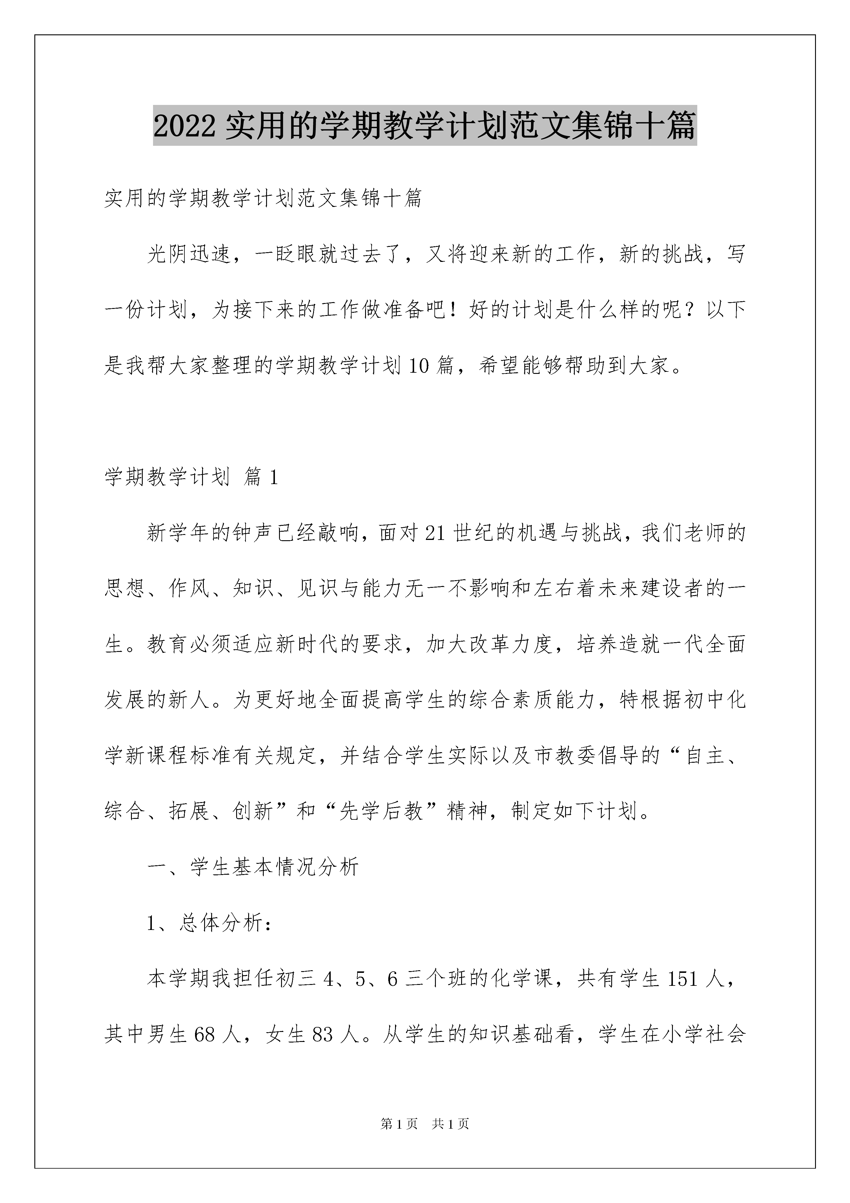 2022实用的学期教学计划范文集锦十篇实用的学期教学计划范文集锦十篇光阴迅速,一眨眼就过去了,又将迎来新的工作,新的挑战,写一份计划,为接下来的工作做准备吧!好的计划是什么样的呢?以下是我帮大家整理的学期教学计划10篇,希望能够帮助到大家。学期教学计划篇1新学年的钟声已经敲响,面对21世纪的机遇与挑战,我们老师的思想、作风、知识、见识与能力无一不影响和左右着未来建设者的一生。教育必须适应新时代的要求,加大改革力度,培养造就一代全面发展的新人。为更好地全面提高学生的综合素质能力,特根据初中化学新课程标准有关规定,并结合学生实际以及市教委倡导的“自主、综合、拓展、创新”和“先学后教”精神,制定如下计划。一、学生基本情况分析1、总体分析:本学期我担任初三4、5、6三个班的化学课,共有学生151人,其中男生68人,女生83人。从学生的知识基础看,学生在小学社会学科中已了解一部分与化学有关的基础知识。从学生的能力发展水平来看,大多数学生已经形成了一定的逻辑推理和分析问题、解决问题的能力。从学生的学习习惯与方法看,75%左右的学生养成了良好的自学习惯,掌握了基本的学习方法,能独立完成作业,但个别学困生自制力差。从学生的学习态度看,四个班的同学90%以上要求进步,态度端正,上进心强,但部分同学学习目标欠明确。四个班发展较为均衡。面对实际情况,在今后的教学中,采取适当的措施,促使全体学生共同进步,全面提高学生的学习成绩。2、具体分析:(1)优等生分析:优生在各班中的分配较均匀,大约占总人数的30%左右。A、优生的知识基础学生已在初二接触过少部分简单的化学知识,如空气、物质的属性等等。对该学科,优等生充满了好奇心,有强烈的求知欲,他们已认识到学习化学的重要性,了解了化学与生活的密切联系,具备了一定的能力。如理论联系实际、分析问题和综合问题的能力等等。并在学好其它学科如物理、生物知识的基础上,为学好本学科奠定了良好的基础,而且他们能广泛涉猎课外知识,并汲取其营养,从而大大拓宽了知识面。B、优生能力发展水平:由于注重对学生各种能力的培养,优生已具备了一定的学习化学的能力,如能运用简单的化学语言来描述常见物质的性质、组成以及在社会生活和生产中的应用;能结合化学与社会、技术的相互联系,分析有关的问题;能运用基本的化学实验技能来设计和完成一些简单的化学实验;能在家庭趣味小实验中提高观察和分析问题的能力。最值得让人欣慰的是,他们能有条不紊地进行规范的实验操作,具备辨别是非、善恶、美丑的能力,具备从已有经验出发,自主探究的能力,能从归纳题型中找规律,从而大大提高了学习效率。在新的学年中,力争让学生再上一个新的层次。C、优生学习态度:优生能认识到化学是自然科学的重要组成部分,它是材料科学、生命科学、环境科学和能源科学的重要基础,化学又与我们的生活息息相关,化学是一门综合性、应用性很强的学科,所以他们的态度端正,课堂上认真听讲,积极开动脑筋,能提出并踊跃回答各种问题,课后又能及时小结、复习巩固,按质按量地完成老师布置的作业。由于在班内作出了表率,很大程度地推进了中程生的发展。D、优生学习方法与习惯学生到了初三,已形成了良好的自学习惯,尤其是优等生,他们能做到课前预习,课中认真听讲,课后又能及时巩固复习;他们能广泛阅读一些化学课外小读物、资料,了解化学与生活的密切联系;他们能敢于打破常规,问出许多为什么;他们已养成随时记下自己的心得与体会的习惯,每人都有集错本,知识集锦,并能将其记录在学习档案袋里。总之,因人而宜,因材施教,优生不但能学,而且会学,从而收到事半功倍之效。(2)中程生分析:中程生在各班中的所占比例较大,约占总人数的60%左右。A、中程生的基础知识:中程生的基础知识掌握较扎实,应用知识也较为灵活。他们在班内占的比例大,情况较为复杂,有的智力好,但学习态度欠端正;有的很勤奋,但学习效率太低。他们的可塑性大,只要教师指导有方,做到多种方法有机结合,在具体问题具体分析中“找感觉”,也许会有意想不到的新收获。B、中程生的能力发展水平:这部分学生能用正确的化学语言描述实验现象、物质的组成和性质,能够从不同角度观察实验现象,进行较简单的化学式、化学方程式的计算;能独立完成学生实验,但操作还不够规范;学生分析问题不是太全面、解决问题的能力稍差。学生有一定的自学能力,但缺乏自主性,更不能灵活运用已有的旧知识来解决、分析新的问题。这部分学生需在教师正确引导和大力督促下,才能趋向提高与完善。随着教育改革的不断深入与发展,对学生的综合能力要求愈来愈高,尤其是实验操作能力,恰恰是中程生的薄弱环节,这就更需要他们能在新的学