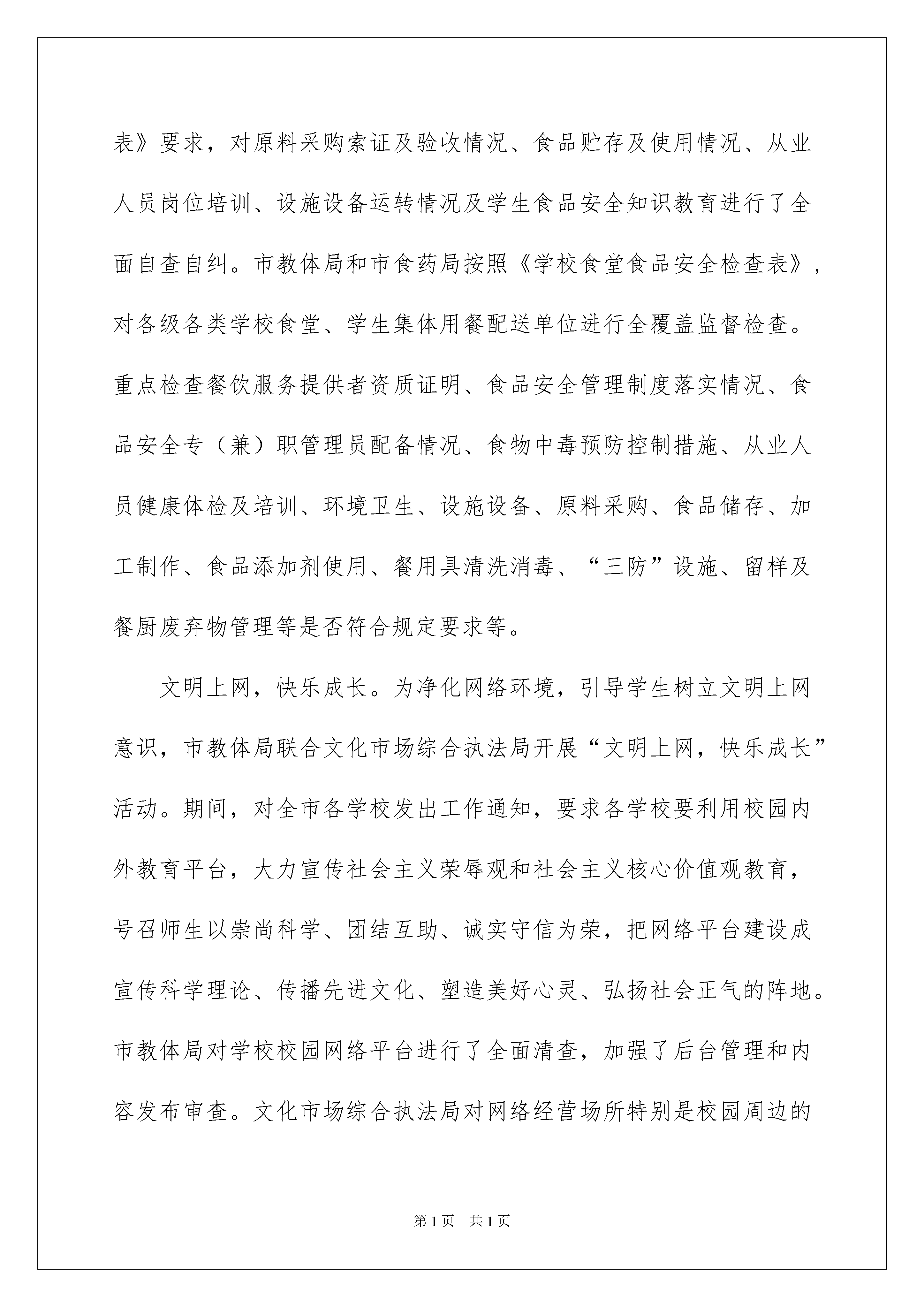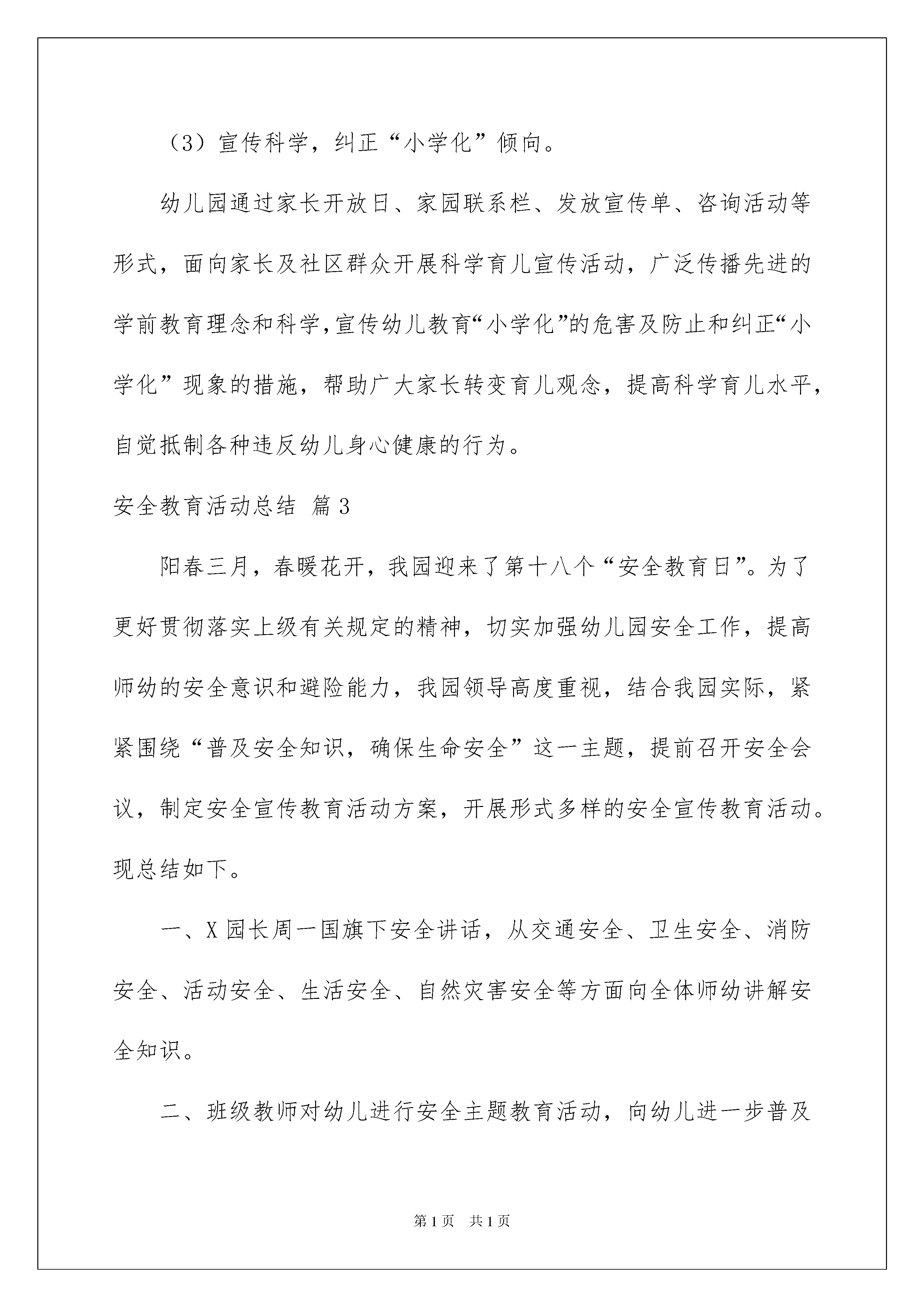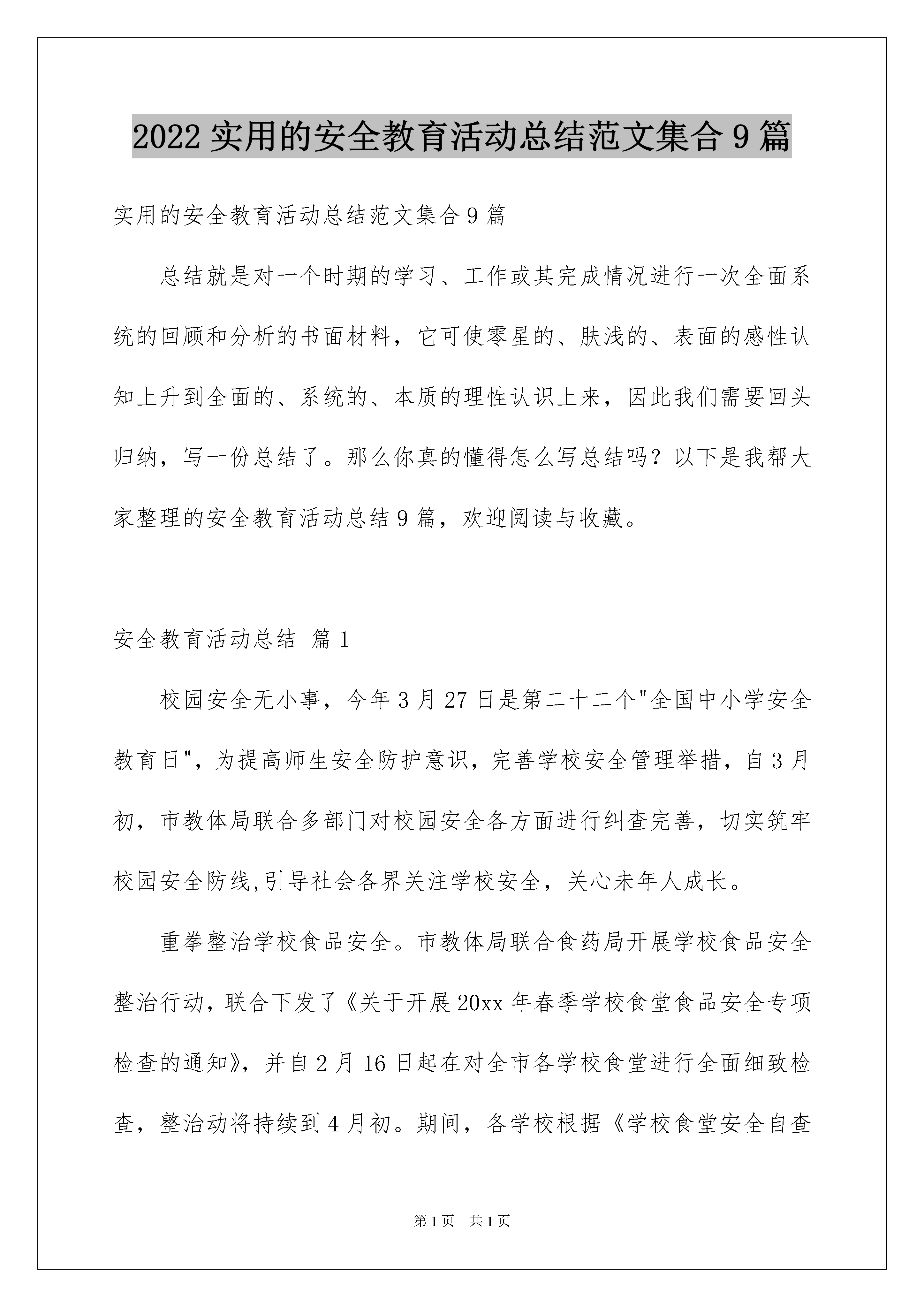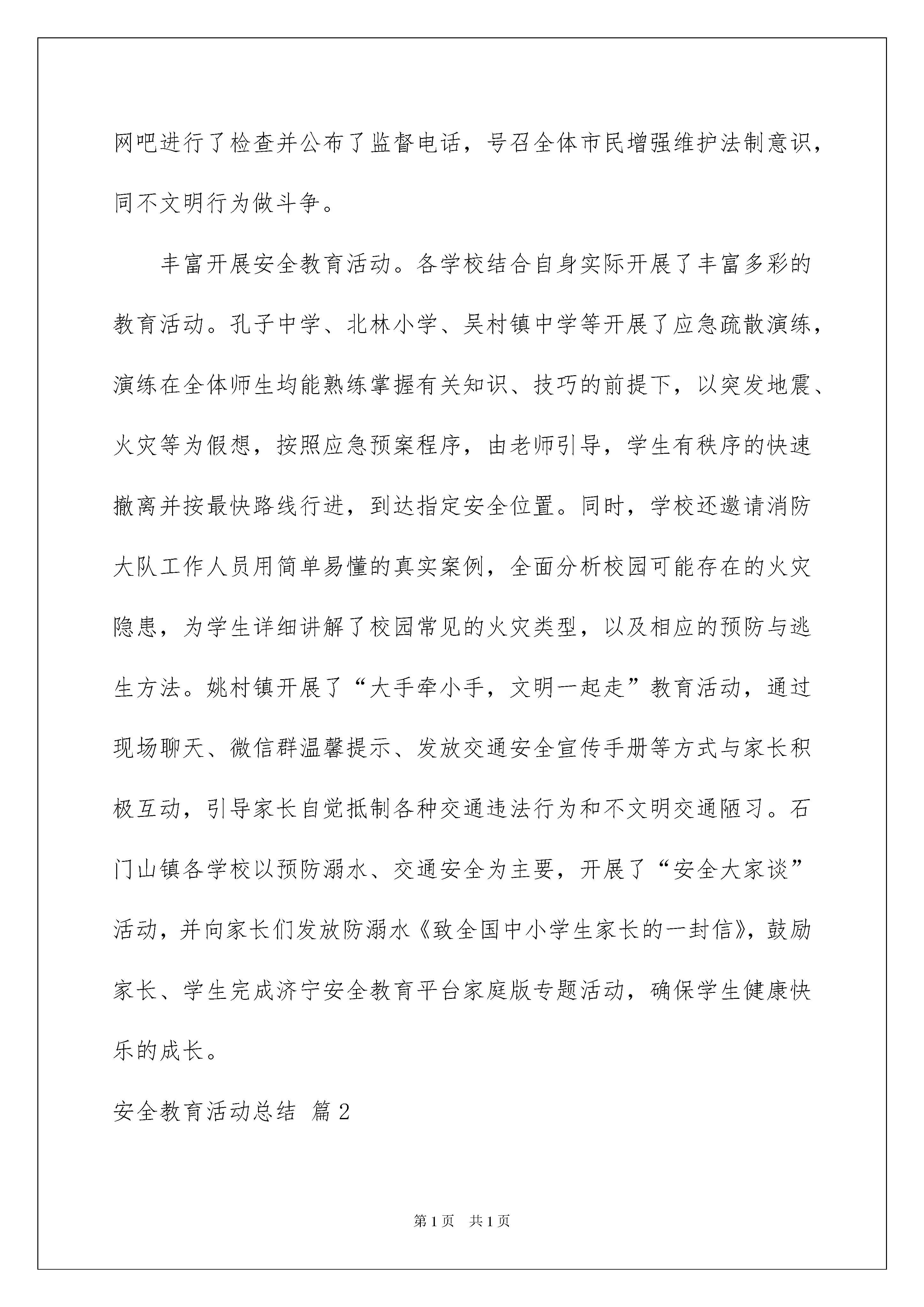 2022实用的安全教育活动总结范文集合9篇实用的安全教育活动总结范文集合9篇总结就是对一个时期的学习、工作或其完成情况进行一次全面系统的回顾和分析的书面材料,它可使零星的、肤浅的、表面的感性认知上升到全面的、系统的、本质的理性认识上来,因此我们需要回头归纳,写一份总结了。那么你真的懂得怎么写总结吗?以下是我帮大家整理的安全教育活动总结9篇,欢迎阅读与收藏。安全教育活动总结篇1校园安全无小事,今年3月27日是第二十二个"全国中小学安全教育日",为提高师生安全防护意识,完善学校安全管理举措,自3月初,市教体局联合多部门对校园安全各方面进行纠查完善,切实筑牢校园安全防线,引导社会各界关注学校安全,关心未年人成长。重拳整治学校食品安全。市教体局联合食药局开展学校食品安全整治行动,联合下发了《关于开展20xx年春季学校食堂食品安全专项检查的通知》,并自2月16日起在对全市各学校食堂进行全面细致检查,整治动将持续到4月初。期间,各学校根据《学校食堂安全自查表》要求,对原料采购索证及验收情况、食品贮存及使用情况、从业人员岗位培训、设施设备运转情况及学生食品安全知识教育进行了全面自查自纠。市教体局和市食药局按照《学校食堂食品安全检查表》,对各级各类学校食堂、学生集体用餐配送单位进行全覆盖监督检查。重点检查餐饮服务提供者资质证明、食品安全管理制度落实情况、食品安全专(兼)职管理员配备情况、食物中毒预防控制措施、从业人员健康体检及培训、环境卫生、设施设备、原料采购、食品储存、加工制作、食品添加剂使用、餐用具清洗消毒、“三防”设施、留样及餐厨废弃物管理等是否符合规定要求等。文明上网,快乐成长。为净化网络环境,引导学生树立文明上网意识,市教体局联合文化市场综合执法局开展“文明上网,快乐成长”活动。期间,对全市各学校发出工作通知,要求各学校要利用校园内外教育平台,大力宣传社会主义荣辱观和社会主义核心价值观教育,号召师生以崇尚科学、团结互助、诚实守信为荣,把网络平台建设成宣传科学理论、传播先进文化、塑造美好心灵、弘扬社会正气的阵地。市教体局对学校校园网络平台进行了全面清查,加强了后台管理和内容发布审查。文化市场综合执法局对网络经营场所特别是校园周边的网吧进行了检查并公布了监督电话,号召全体市民增强维护法制意识,同不文明行为做斗争。丰富开展安全教育活动。各学校结合自身实际开展了丰富多彩的教育活动。孔子中学、北林小学、吴村镇中学等开展了应急疏散演练,演练在全体师生均能熟练掌握有关知识、技巧的前提下,以突发地震、火灾等为假想,按照应急预案程序,由老师引导,学生有秩序的快速撤离并按最快路线行进,到达指定安全位置。同时,学校还邀请消防大队工作人员用简单易懂的真实案例,全面分析校园可能存在的火灾隐患,为学生详细讲解了校园常见的火灾类型,以及相应的预防与逃生方法。姚村镇开展了“大手牵小手,文明一起走”教育活动,通过现场聊天、微信群温馨提示、发放交通安全宣传手册等方式与家长积极互动,引导家长自觉抵制各种交通违法行为和不文明交通陋习。石门山镇各学校以预防溺水、交通安全为主要,开展了“安全大家谈”活动,并向家长们发放防溺水《致全国中小学生家长的一封信》,鼓励家长、学生完成济宁安全教育平台家庭版专题活动,确保学生健康快乐的成长。安全教育活动总结篇2为贯彻落实瓯海区教育局《学前教育宣传月活动实施方案》,抓好社区、家庭、幼儿园“三位一体”的教育共同体,让教育传递爱,让爱启迪教育,营造和谐社会良好氛围,我园结合社区实际,开展了一系列的宣传活动,现将活动情况总结如下:我园围绕活动主题,组织开展主题活动,面向社区开展多种形式的科学育儿宣传指导。开展生动活泼、喜闻乐见的公益性宣传,形成上下联动、全社会参与的良好氛围。(1)以多种形式宣传学前教育发展政策,增强社会共识。通过悬挂横幅、发放传单等形势,大力宣传学前教育的方针政策、发展形势以及区教育局对学前教育的管理、规划等;大力宣传加快发展学前教育的重大意义。(2)宣传学前教育管理规定,促进规范办园。通过家园联系栏,园内公告栏,向家长重点宣传《幼儿园教育指导纲要(试行)》、《3—6岁儿童学习与发展指南》、《关于防止和纠正学前教育“小学化”现象提高保育教育质量的意见》、《幼儿园一日活动行为细则》等一系列学前教育法规、规章制度及各地的相关管理文件,让家长、社会了解幼儿园坚持科学保教,规范办园的行为。(3)宣传科学,纠正“小学化”倾向。幼儿园通过家长开放日、家园联系栏、发放宣传单、咨询活动等形式,面向家长及社区群众开展科学育儿宣传活动,广泛传播先进的学前教育理念和科学,宣传幼儿教育“小学化”的