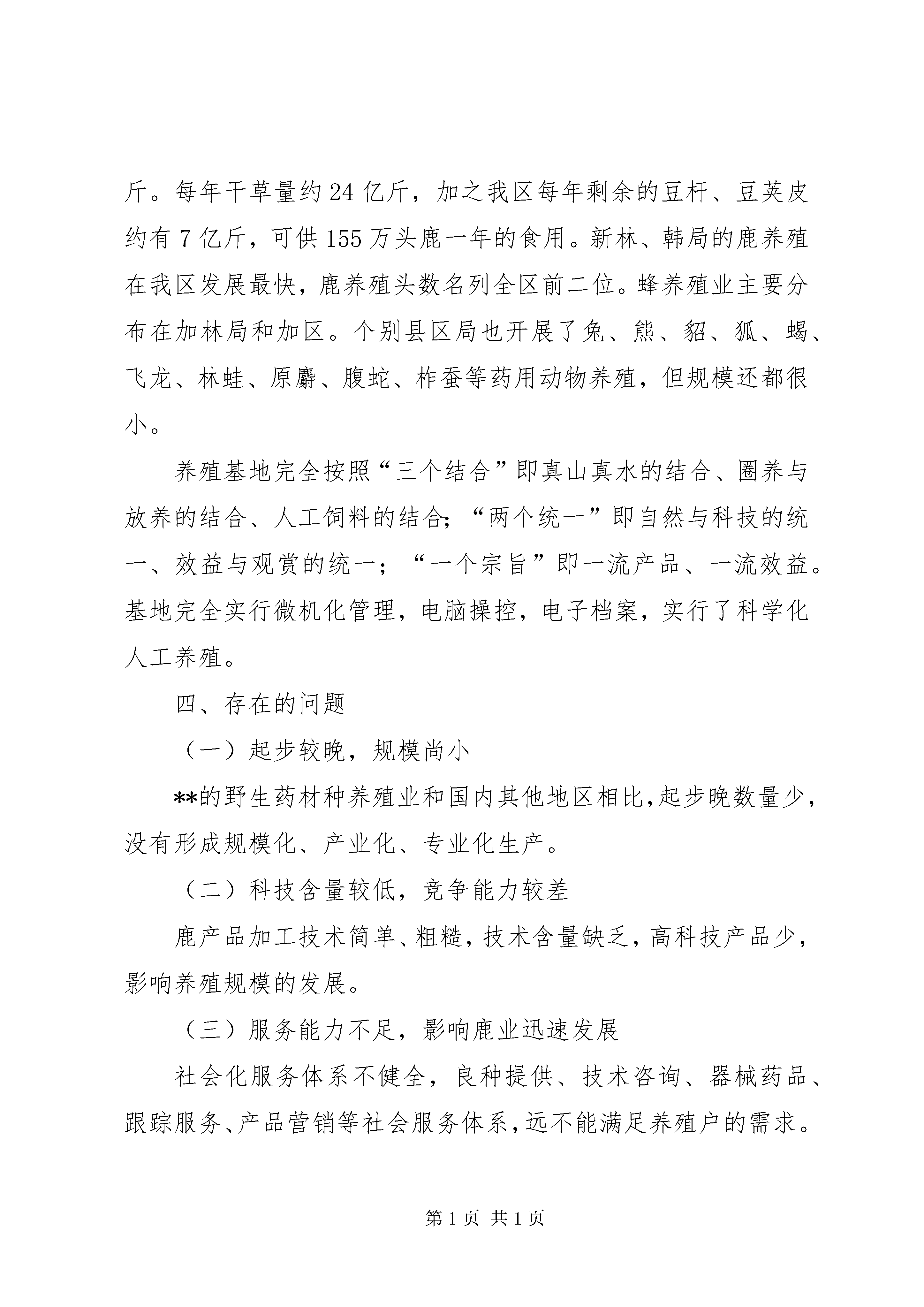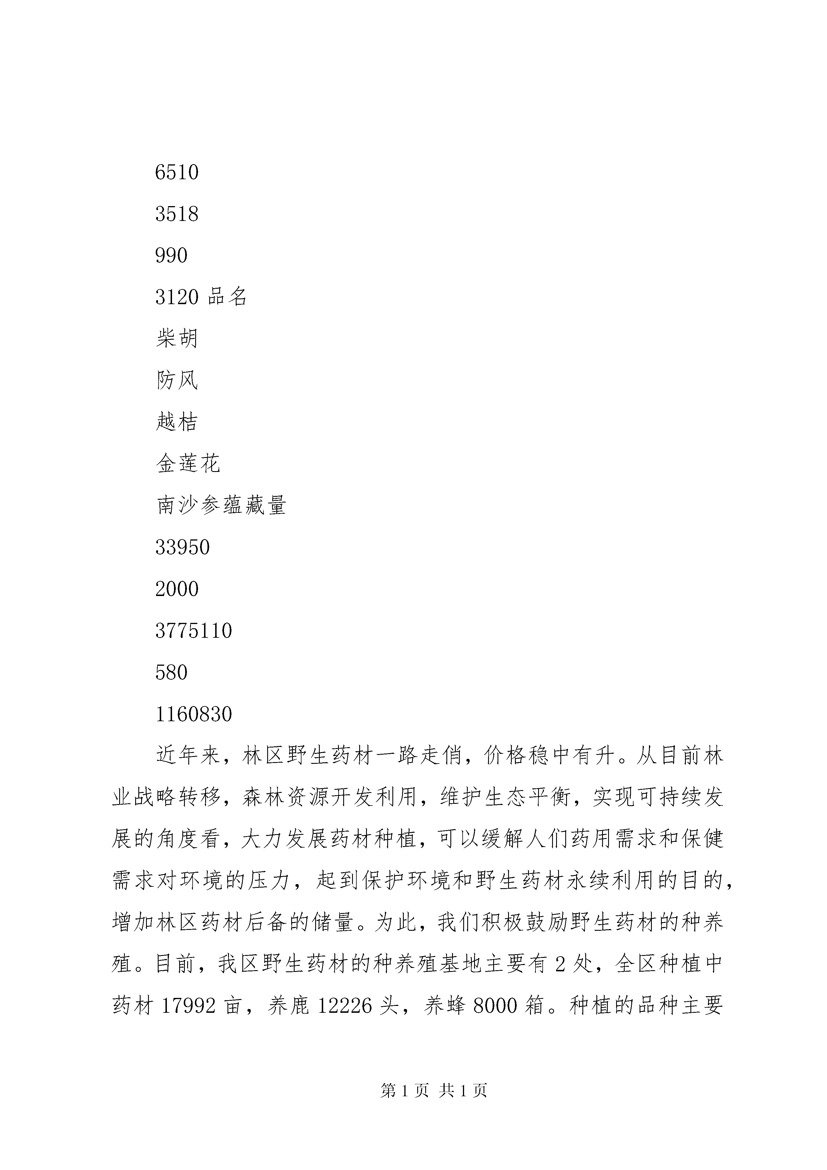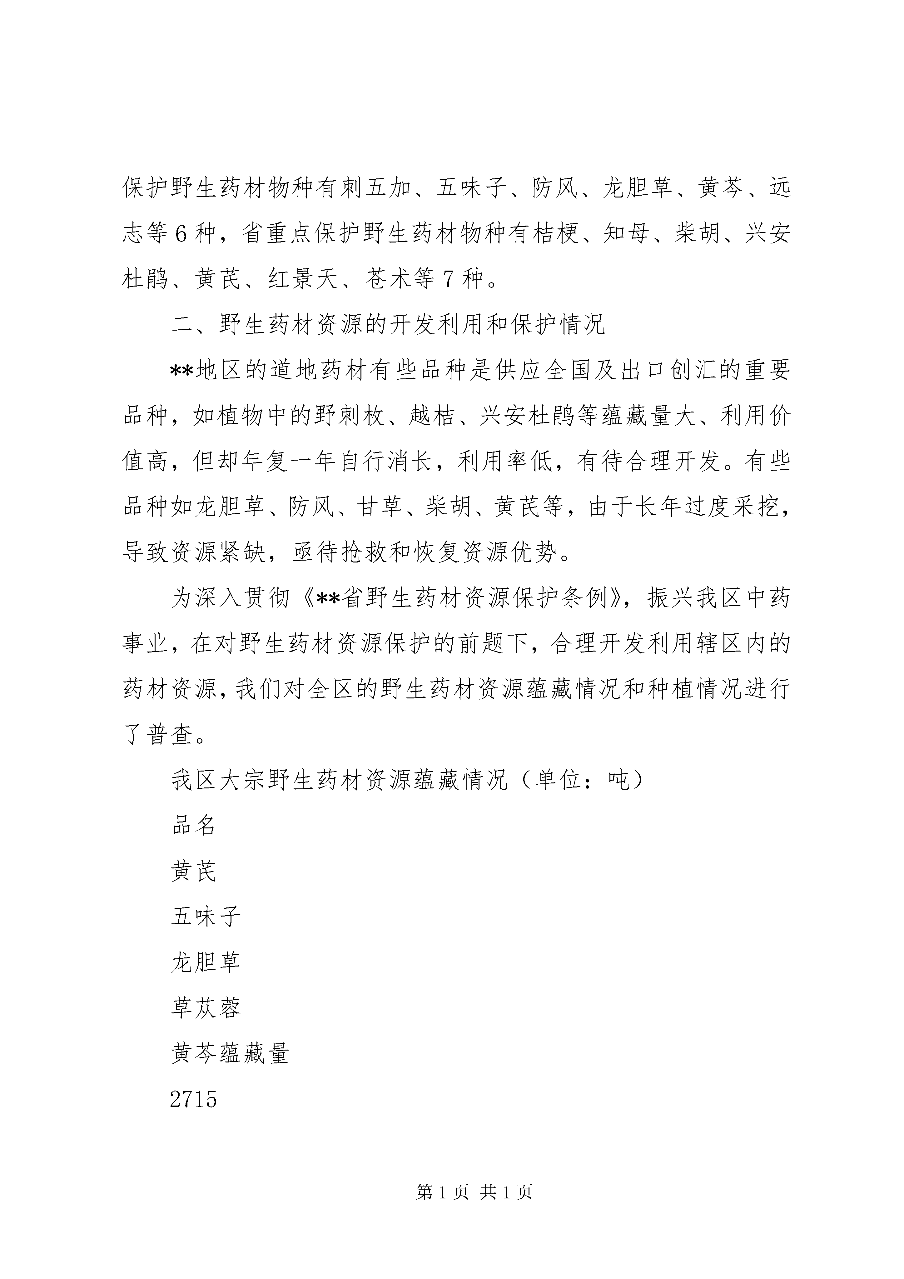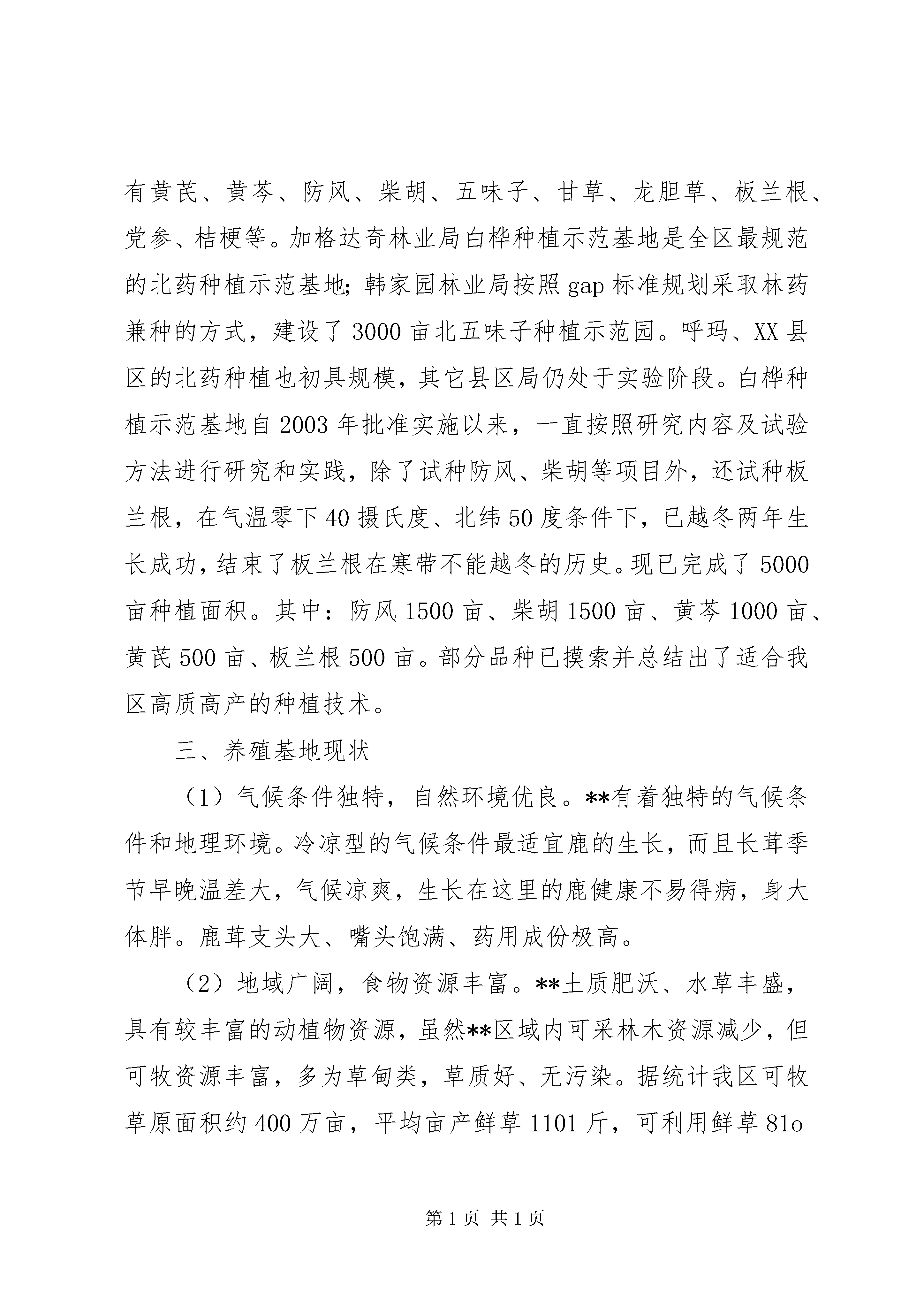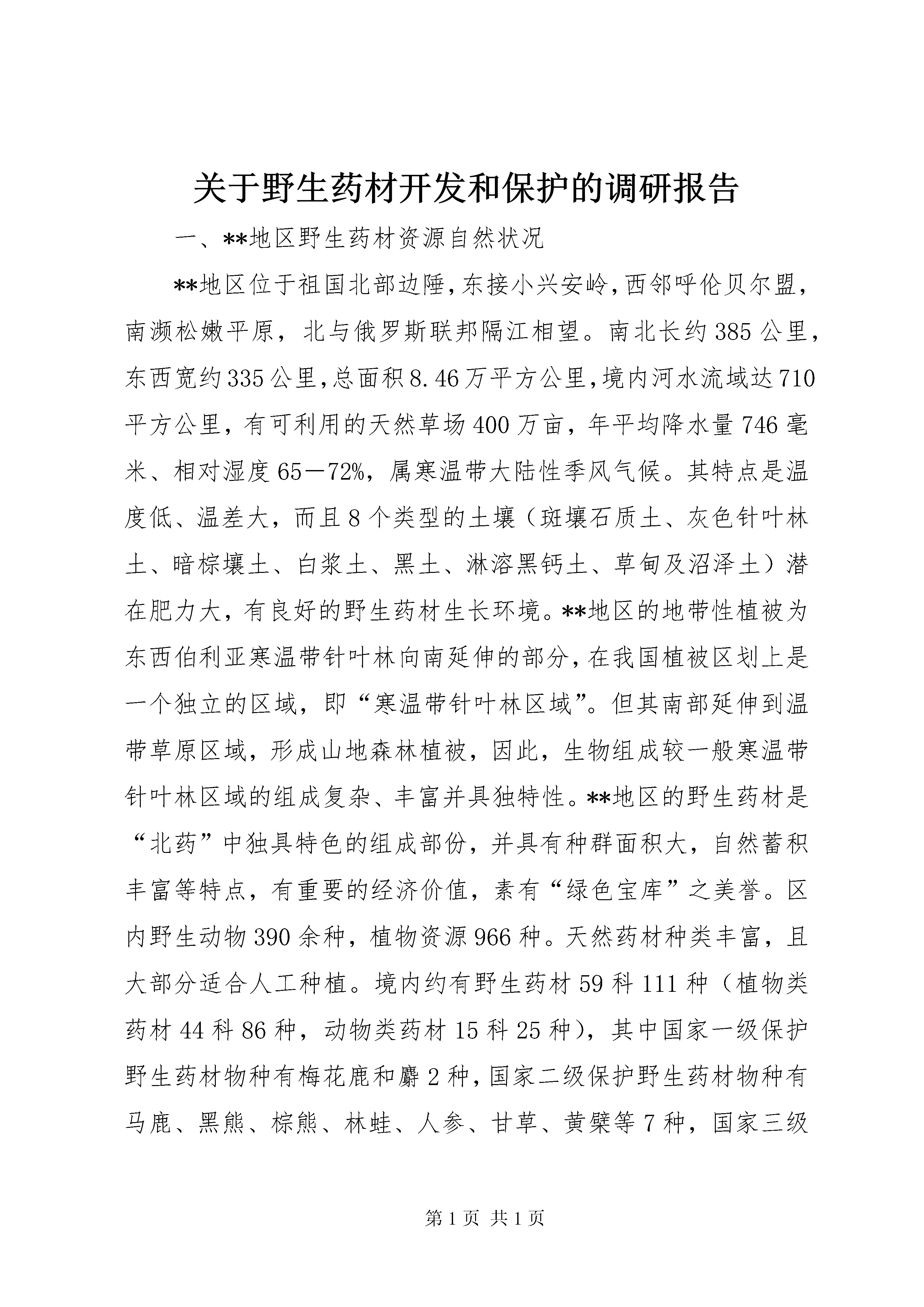 关于野生药材开发和保护的调研报告一、**地区野生药材资源自然状况**地区位于祖国北部边陲,东接小兴安岭,西邻呼伦贝尔盟,南濒松嫩平原,北与俄罗斯联邦隔江相望。南北长约385公里,东西宽约335公里,总面积8.46万平方公里,境内河水流域达710平方公里,有可利用的天然草场400万亩,年平均降水量746毫米、相对湿度65-72%,属寒温带大陆性季风气候。其特点是温度低、温差大,而且8个类型的土壤(斑壤石质土、灰色针叶林土、暗棕壤土、白浆土、黑土、淋溶黑钙土、草甸及沼泽土)潜在肥力大,有良好的野生药材生长环境。**地区的地带性植被为东西伯利亚寒温带针叶林向南延伸的部分,在我国植被区划上是一个独立的区域,即“寒温带针叶林区域”。但其南部延伸到温带草原区域,形成山地森林植被,因此,生物组成较一般寒温带针叶林区域的组成复杂、丰富并具独特性。**地区的野生药材是“北药”中独具特色的组成部份,并具有种群面积大,自然蓄积丰富等特点,有重要的经济价值,素有“绿色宝库”之美誉。区内野生动物390余种,植物资源966种。天然药材种类丰富,且大部分适合人工种植。境内约有野生药材59科111种(植物类药材44科86种,动物类药材15科25种),其中国家一级保护野生药材物种有梅花鹿和麝2种,国家二级保护野生药材物种有马鹿、黑熊、棕熊、林蛙、人参、甘草、黄檗等7种,国家三级保护野生药材物种有刺五加、五味子、防风、龙胆草、黄芩、远志等6种,省重点保护野生药材物种有桔梗、知母、柴胡、兴安杜鹃、黄芪、红景天、苍术等7种。二、野生药材资源的开发利用和保护情况**地区的道地药材有些品种是供应全国及出口创汇的重要品种,如植物中的野刺枚、越桔、兴安杜鹃等蕴藏量大、利用价值高,但却年复一年自行消长,利用率低,有待合理开发。有些品种如龙胆草、防风、甘草、柴胡、黄芪等,由于长年过度采挖,导致资源紧缺,亟待抢救和恢复资源优势。为深入贯彻《**省野生药材资源保护条例》,振兴我区中药事业,在对野生药材资源保护的前题下,合理开发利用辖区内的药材资源,我们对全区的野生药材资源蕴藏情况和种植情况进行了普查。我区大宗野生药材资源蕴藏情况(单位:吨)品名黄芪五味子龙胆草草苁蓉黄芩蕴藏量2715651035189903120品名柴胡防风越桔金莲花南沙参蕴藏量33950200037751105801160830近年来,林区野生药材一路走俏,价格稳中有升。从目前林业战略转移,森林资源开发利用,维护生态平衡,实现可持续发展的角度看,大力发展药材种植,可以缓解人们药用需求和保健需求对环境的压力,起到保护环境和野生药材永续利用的目的,增加林区药材后备的储量。为此,我们积极鼓励野生药材的种养殖。目前,我区野生药材的种养殖基地主要有2处,全区种植中药材17992亩,养鹿12226头,养蜂8000箱。种植的品种主要有黄芪、黄芩、防风、柴胡、五味子、甘草、龙胆草、板兰根、党参、桔梗等。加格达奇林业局白桦种植示范基地是全区最规范的北药种植示范基地;韩家园林业局按照gap标准规划采取林药兼种的方式,建设了3000亩北五味子种植示范园。呼玛、XX县区的北药种植也初具规模,其它县区局仍处于实验阶段。白桦种植示范基地自2003年批准实施以来,一直按照研究内容及试验方法进行研究和实践,除了试种防风、柴胡等项目外,还试种板兰根,在气温零下40摄氏度、北纬50度条件下,已越冬两年生长成功,结束了板兰根在寒带不能越冬的历史。现已完成了5000亩种植面积。其中:防风1500亩、柴胡1500亩、黄芩1000亩、黄芪500亩、板兰根500亩。部分品种已摸索并总结出了适合我区高质高产的种植技术。三、养殖基地现状(1)气候条件独特,自然环境优良。**有着独特的气候条件和地理环境。冷凉型的气候条件最适宜鹿的生长,而且长茸季节早晚温差大,气候凉爽,生长在这里的鹿健康不易得病,身大体胖。鹿茸支头大、嘴头饱满、药用成份极高。(2)地域广阔,食物资源丰富。**土质肥沃、水草丰盛,具有较丰富的动植物资源,虽然**区域内可采林木资源减少,但可牧资源丰富,多为草甸类,草质好、无污染。据统计我区可牧草原面积约400万亩,平均亩产鲜草1101斤,可利用鲜草81o斤。每年干草量约24亿斤,加之我区每年剩余的豆杆、豆荚皮约有7亿斤,可供155万头鹿一年的食用。新林、韩局的鹿养殖在我区发展最快,鹿养殖头数名列全区前二位。蜂养殖业主要分布在加林局和加区。个别县区局也开展了兔、熊、貂、狐、蝎、飞龙、林蛙、原麝、腹蛇、柞蚕等药用动物养殖,但规模还都很小。养殖基地完全按照“三个结合”即真山真水的结合、圈养与放养的结合、人工饲料的结合;“两个统一”即自然与科技的统一、效益与观赏的统一;“一个宗旨”即一流产品、一流效益。基地完全实行微机化管理,电脑操