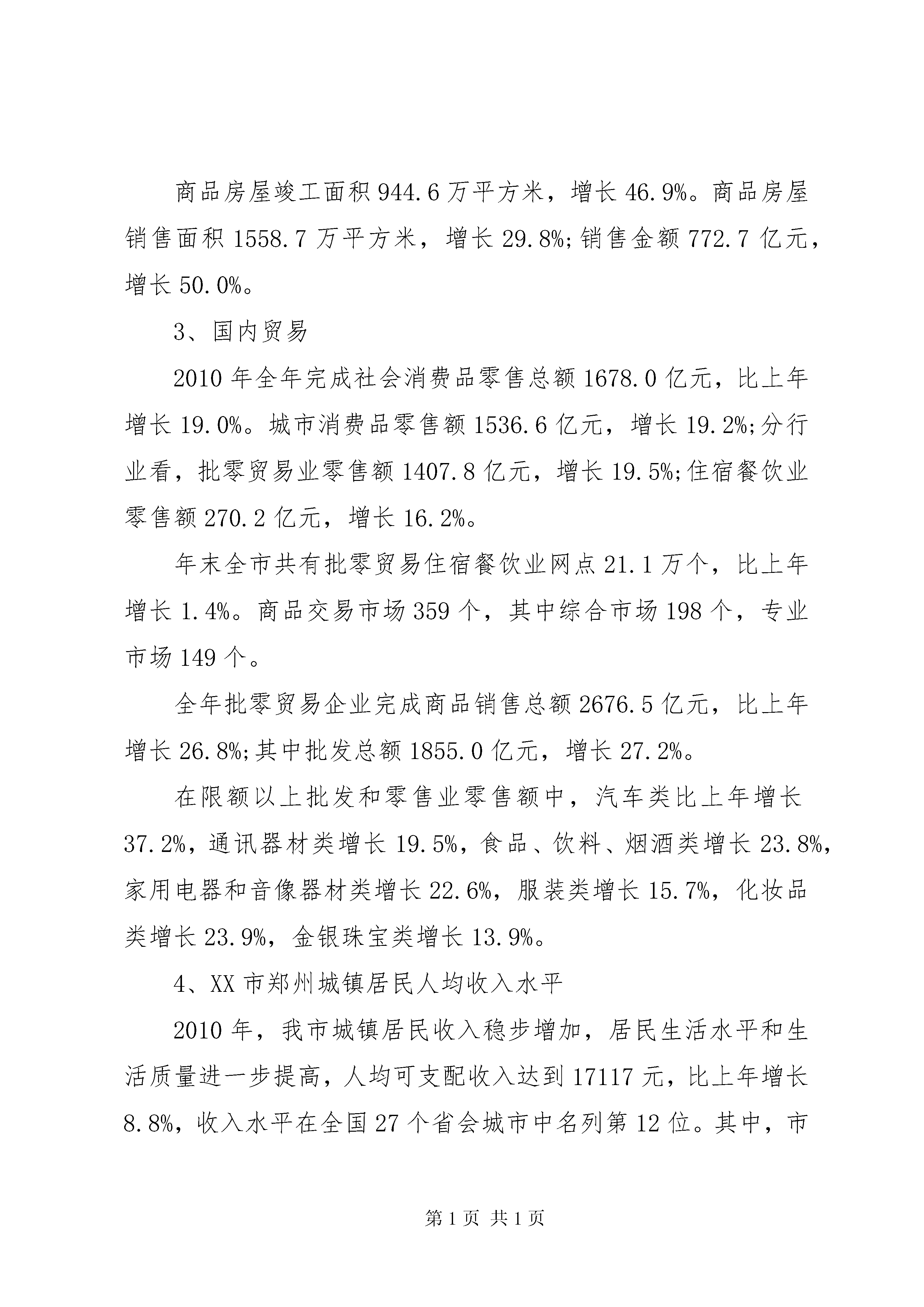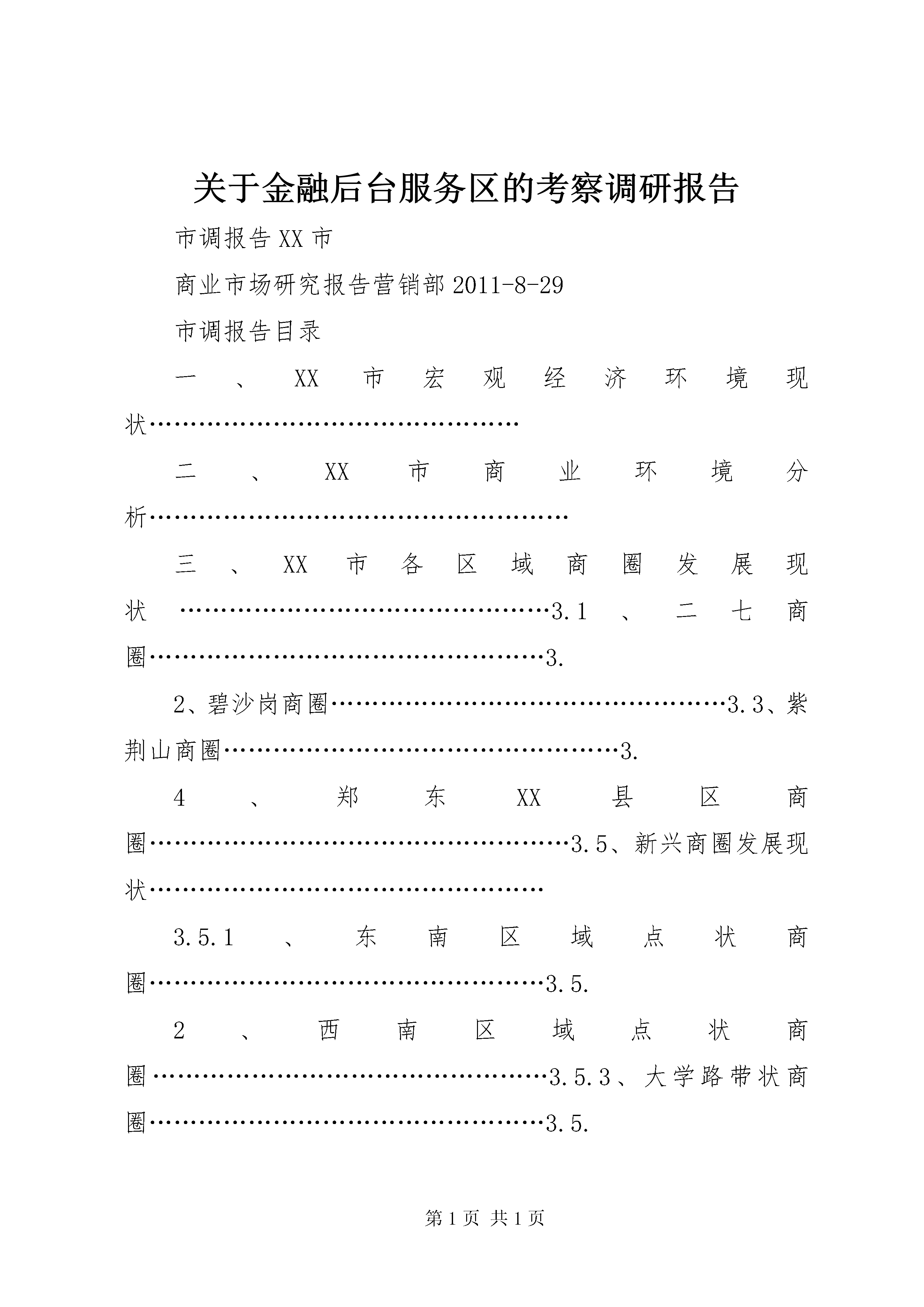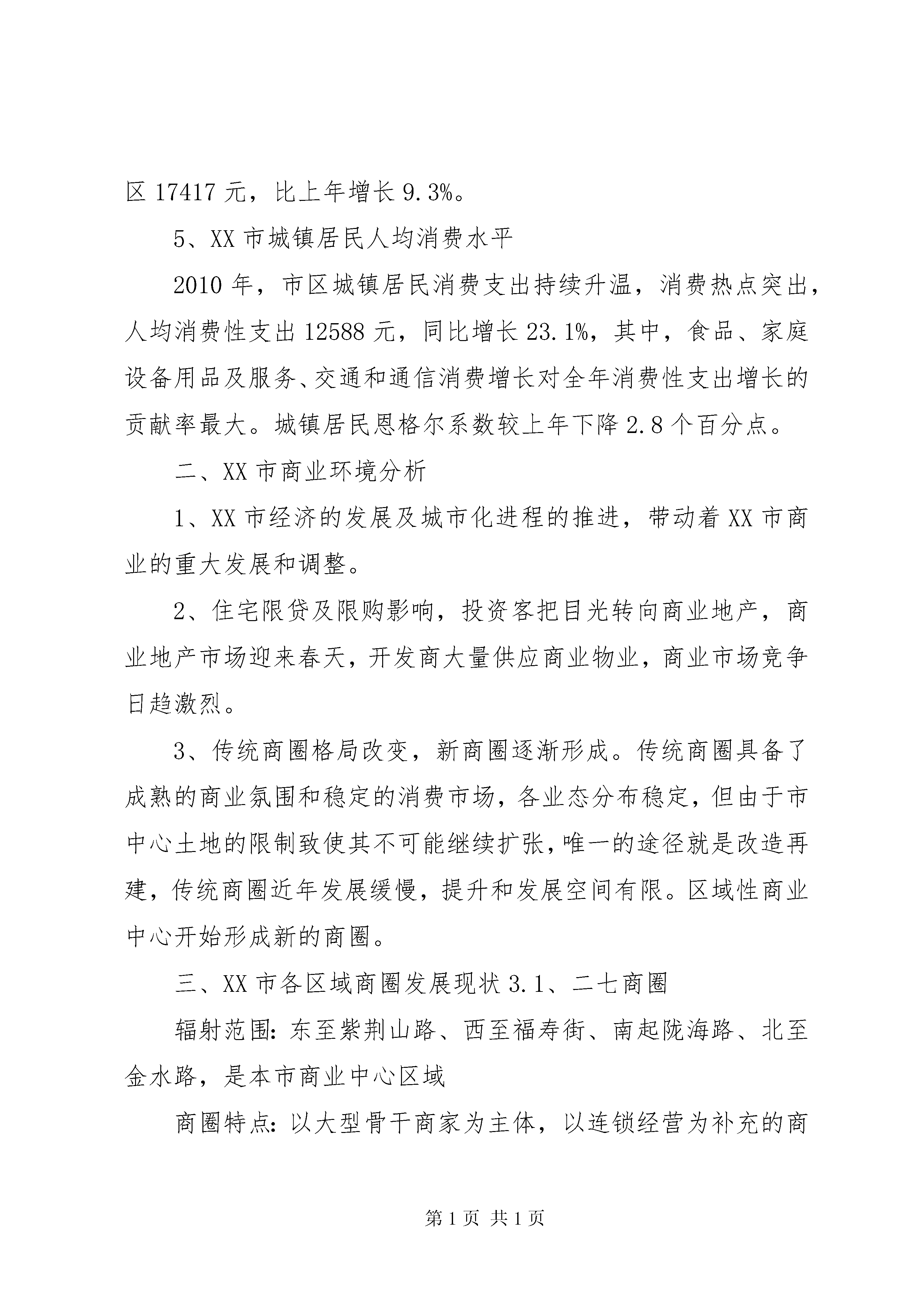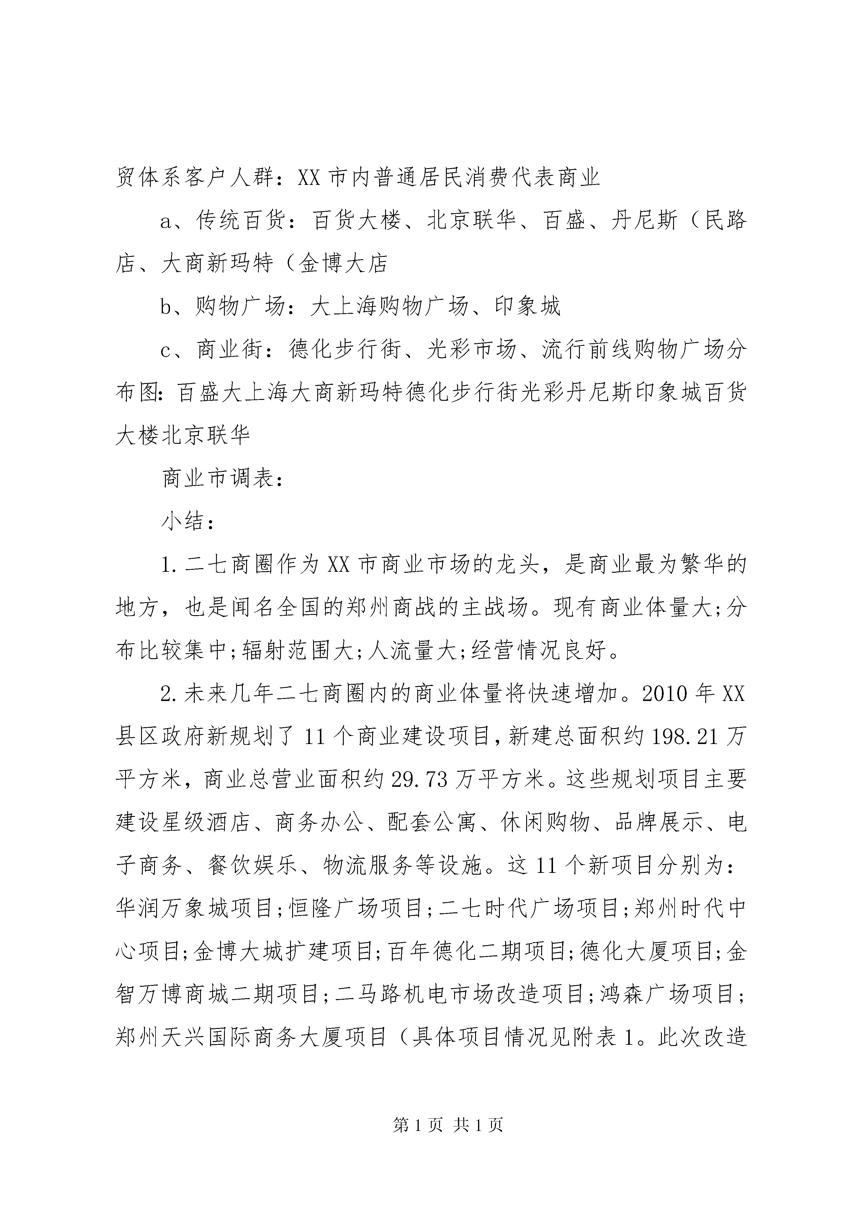 关于金融后台服务区的考察调研报告市调报告XX市商业市场研究报告营销部2011-8-29市调报告目录一、XX市宏观经济环境现状………………………………………二、XX市商业环境分析……………………………………………三、XX市各区域商圈发展现状………………………………………3.1、二七商圈…………………………………………3.2、碧沙岗商圈…………………………………………3.3、紫荆山商圈…………………………………………3.4、郑东XX县区商圈……………………………………………3.5、新兴商圈发展现状…………………………………………3.5.1、东南区域点状商圈…………………………………………3.5.2、西南区域点状商圈…………………………………………3.5.3、大学路带状商圈…………………………………………3.5.4、秦岭路点状商圈…………………………………………四、典型案例分析……………………………………………五、XX市商业市场发展前景预测……………………………六、总结……………………………………………………一、XX市宏观经济环境现状1、gdp发展状况经统计局初步核算,2010年全年完成生产总值4000亿元,比上年增长13.0%;人均生产总值4.9万元。其中第一产业增加值124.6亿元,增长3.0%;第二产业增加值2269.9亿元,增长15.1%;第三产业增加值1605.5亿元,增长10.5%。三次产业结构由上年的3.1∶54.0∶42.9调整为3.1:56.7:40.2。2、固定资产投资2011年全年全社会固定资产投资完成2757.0亿元,比上年增长20.8%。其中城镇固定资产投资完成2432.5亿元,比上年增长21.9%。全年房地产开发完成投资775.2亿元,比上年增长50.9%;其中住宅投资555.7亿元,增长41.0%。商品房屋施工面积6255.5万平方米,比上年增长20.1%;其中住宅施工4582.9万平方米,增长16.3%。商品房新开工面积1811.8万平方米,增长25.5%。商品房屋竣工面积944.6万平方米,增长46.9%。商品房屋销售面积1558.7万平方米,增长29.8%;销售金额772.7亿元,增长50.0%。3、国内贸易2010年全年完成社会消费品零售总额1678.0亿元,比上年增长19.0%。城市消费品零售额1536.6亿元,增长19.2%;分行业看,批零贸易业零售额1407.8亿元,增长19.5%;住宿餐饮业零售额270.2亿元,增长16.2%。年末全市共有批零贸易住宿餐饮业网点21.1万个,比上年增长1.4%。商品交易市场359个,其中综合市场198个,专业市场149个。全年批零贸易企业完成商品销售总额2676.5亿元,比上年增长26.8%;其中批发总额1855.0亿元,增长27.2%。在限额以上批发和零售业零售额中,汽车类比上年增长37.2%,通讯器材类增长19.5%,食品、饮料、烟酒类增长23.8%,家用电器和音像器材类增长22.6%,服装类增长15.7%,化妆品类增长23.9%,金银珠宝类增长13.9%。4、XX市郑州城镇居民人均收入水平2010年,我市城镇居民收入稳步增加,居民生活水平和生活质量进一步提高,人均可支配收入达到17117元,比上年增长8.8%,收入水平在全国27个省会城市中名列第12位。其中,市区17417元,比上年增长9.3%。5、XX市城镇居民人均消费水平2010年,市区城镇居民消费支出持续升温,消费热点突出,人均消费性支出12588元,同比增长23.1%,其中,食品、家庭设备用品及服务、交通和通信消费增长对全年消费性支出增长的贡献率最大。城镇居民恩格尔系数较上年下降2.8个百分点。二、XX市商业环境分析1、XX市经济的发展及城市化进程的推进,带动着XX市商业的重大发展和调整。2、住宅限贷及限购影响,投资客把目光转向商业地产,商业地产市场迎来春天,开发商大量供应商业物业,商业市场竞争日趋激烈。3、传统商圈格局改变,新商圈逐渐形成。传统商圈具备了成熟的商业氛围和稳定的消费市场,各业态分布稳定,但由于市中心土地的限制致使其不可能继续扩张,唯一的途径就是改造再建,传统商圈近年发展缓慢,提升和发展空间有限。区域性商业中心开始形成新的商圈。三、XX市各区域商圈发展现状3.1、二七商圈辐射范围:东至紫荆山路、西至福寿街、南起陇海路、北至金水路,是本市商业中心区域商圈特点:以大型骨干商家为主体,以连锁经营为补充的商贸体系客户人群:XX市内普通居民消费代表商业a、传统百货:百货大楼、北京联华、百盛、丹尼斯(民路店、大商新玛特(金博大店b、购物广场:大上海购物广场、印象城c、商业街:德化步行街、光彩市场、流行前线购物广场分布图:百盛大上海大商新玛特德化步行街光彩丹尼斯印