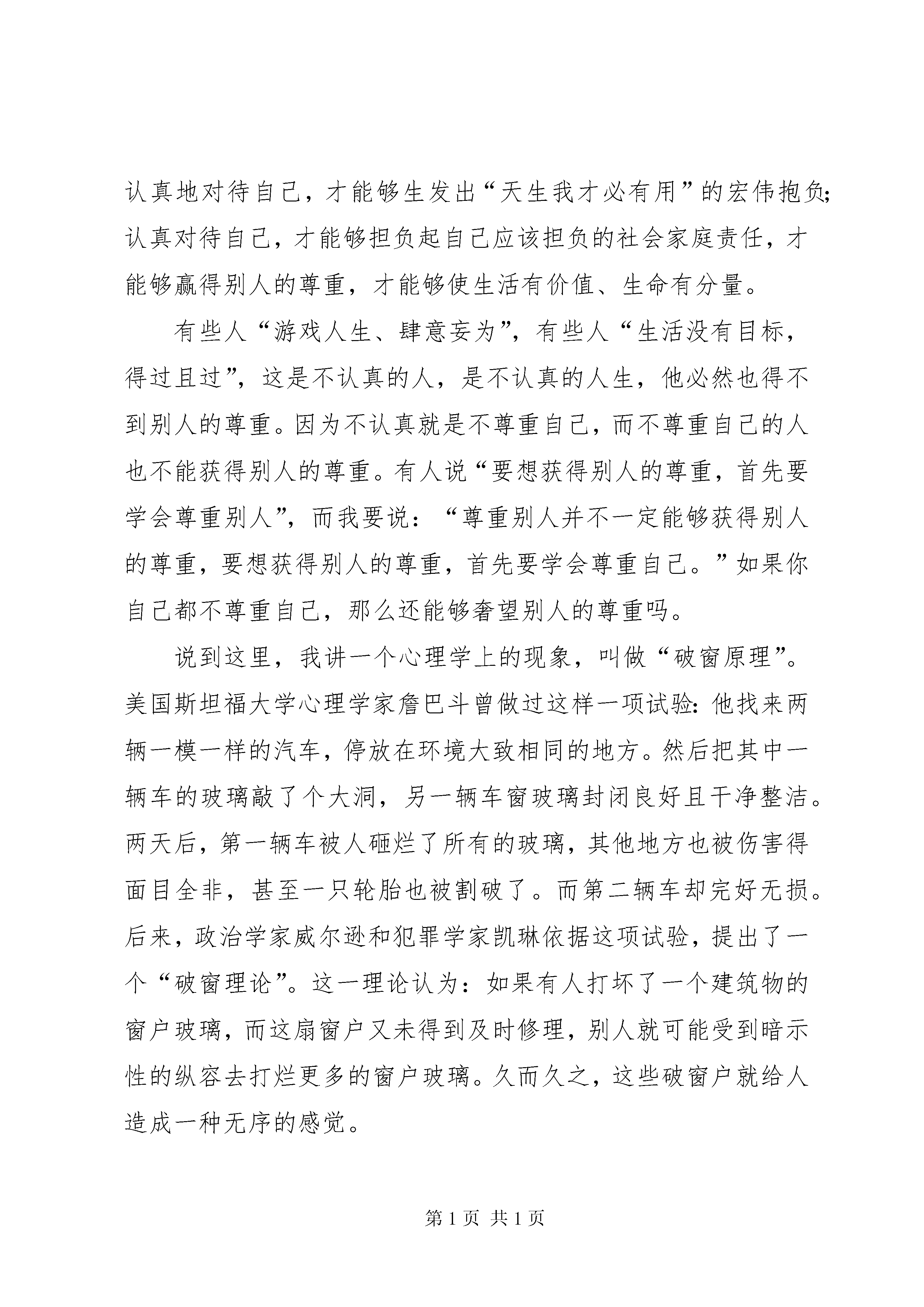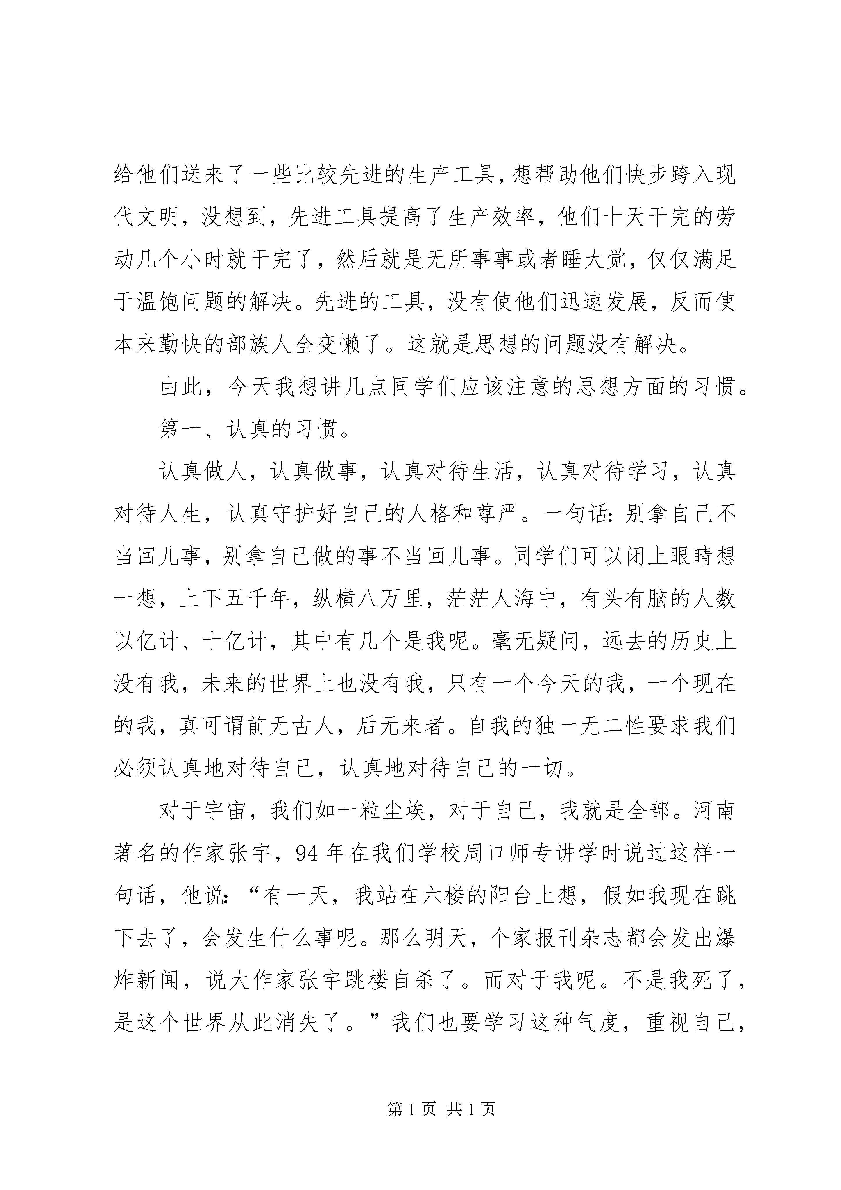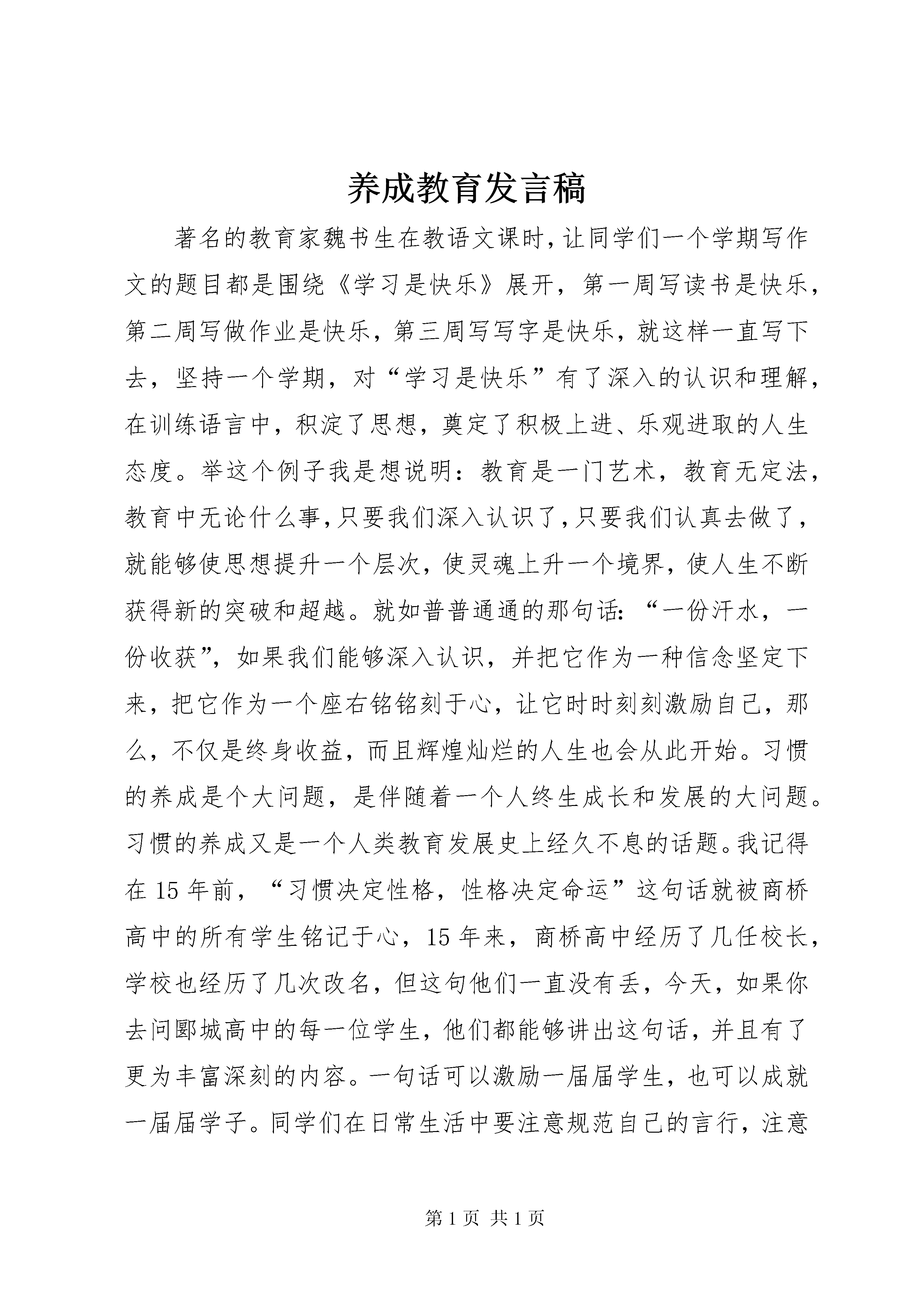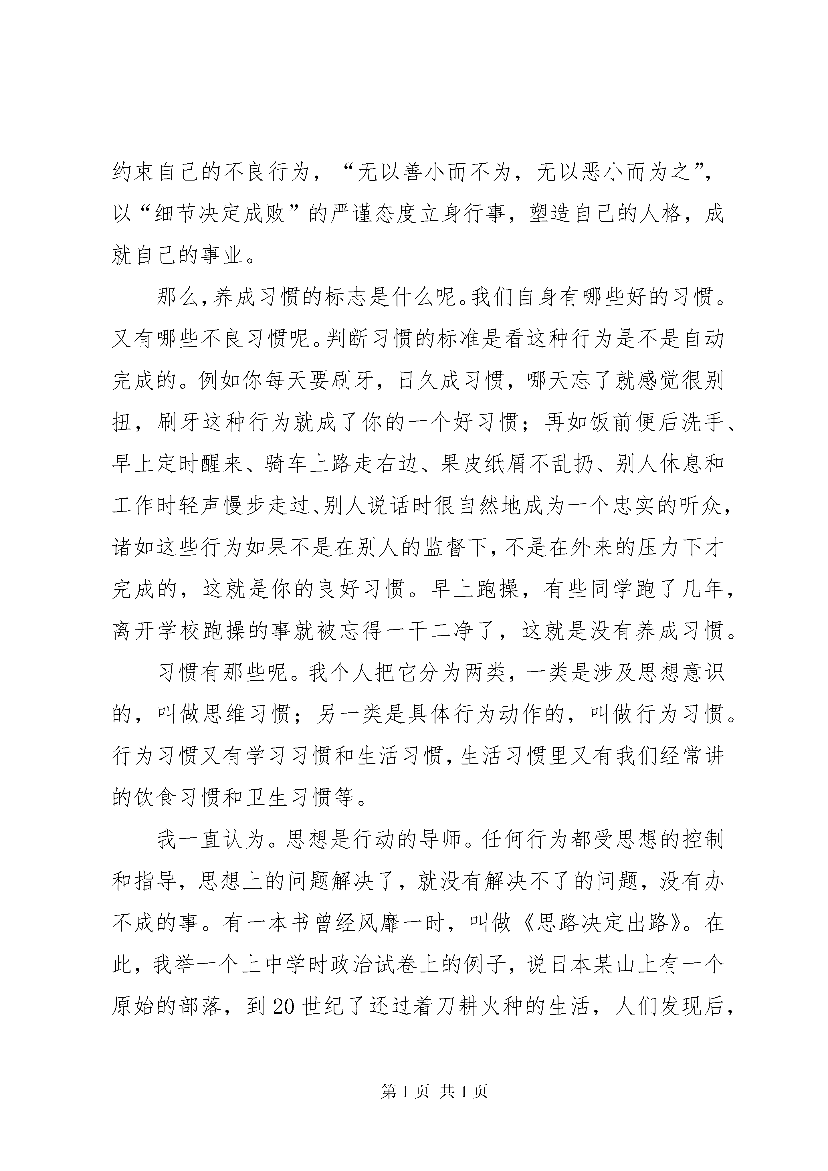 养成教育发言稿著名的教育家魏书生在教语文课时,让同学们一个学期写作文的题目都是围绕《学习是快乐》展开,第一周写读书是快乐,第二周写做作业是快乐,第三周写写字是快乐,就这样一直写下去,坚持一个学期,对“学习是快乐”有了深入的认识和理解,在训练语言中,积淀了思想,奠定了积极上进、乐观进取的人生态度。举这个例子我是想说明:教育是一门艺术,教育无定法,教育中无论什么事,只要我们深入认识了,只要我们认真去做了,就能够使思想提升一个层次,使灵魂上升一个境界,使人生不断获得新的突破和超越。就如普普通通的那句话:“一份汗水,一份收获”,如果我们能够深入认识,并把它作为一种信念坚定下来,把它作为一个座右铭铭刻于心,让它时时刻刻激励自己,那么,不仅是终身收益,而且辉煌灿烂的人生也会从此开始。习惯的养成是个大问题,是伴随着一个人终生成长和发展的大问题。习惯的养成又是一个人类教育发展史上经久不息的话题。我记得在15年前,“习惯决定性格,性格决定命运”这句话就被商桥高中的所有学生铭记于心,15年来,商桥高中经历了几任校长,学校也经历了几次改名,但这句他们一直没有丢,今天,如果你去问郾城高中的每一位学生,他们都能够讲出这句话,并且有了更为丰富深刻的内容。一句话可以激励一届届学生,也可以成就一届届学子。同学们在日常生活中要注意规范自己的言行,注意约束自己的不良行为,“无以善小而不为,无以恶小而为之”,以“细节决定成败”的严谨态度立身行事,塑造自己的人格,成就自己的事业。那么,养成习惯的标志是什么呢。我们自身有哪些好的习惯。又有哪些不良习惯呢。判断习惯的标准是看这种行为是不是自动完成的。例如你每天要刷牙,日久成习惯,哪天忘了就感觉很别扭,刷牙这种行为就成了你的一个好习惯;再如饭前便后洗手、早上定时醒来、骑车上路走右边、果皮纸屑不乱扔、别人休息和工作时轻声慢步走过、别人说话时很自然地成为一个忠实的听众,诸如这些行为如果不是在别人的监督下,不是在外来的压力下才完成的,这就是你的良好习惯。早上跑操,有些同学跑了几年,离开学校跑操的事就被忘得一干二净了,这就是没有养成习惯。习惯有那些呢。我个人把它分为两类,一类是涉及思想意识的,叫做思维习惯;另一类是具体行为动作的,叫做行为习惯。行为习惯又有学习习惯和生活习惯,生活习惯里又有我们经常讲的饮食习惯和卫生习惯等。我一直认为。思想是行动的导师。任何行为都受思想的控制和指导,思想上的问题解决了,就没有解决不了的问题,没有办不成的事。有一本书曾经风靡一时,叫做《思路决定出路》。在此,我举一个上中学时政治试卷上的例子,说日本某山上有一个原始的部落,到20世纪了还过着刀耕火种的生活,人们发现后,给他们送来了一些比较先进的生产工具,想帮助他们快步跨入现代文明,没想到,先进工具提高了生产效率,他们十天干完的劳动几个小时就干完了,然后就是无所事事或者睡大觉,仅仅满足于温饱问题的解决。先进的工具,没有使他们迅速发展,反而使本来勤快的部族人全变懒了。这就是思想的问题没有解决。由此,今天我想讲几点同学们应该注意的思想方面的习惯。第一、认真的习惯。认真做人,认真做事,认真对待生活,认真对待学习,认真对待人生,认真守护好自己的人格和尊严。一句话:别拿自己不当回儿事,别拿自己做的事不当回儿事。同学们可以闭上眼睛想一想,上下五千年,纵横八万里,茫茫人海中,有头有脑的人数以亿计、十亿计,其中有几个是我呢。毫无疑问,远去的历史上没有我,未来的世界上也没有我,只有一个今天的我,一个现在的我,真可谓前无古人,后无来者。自我的独一无二性要求我们必须认真地对待自己,认真地对待自己的一切。对于宇宙,我们如一粒尘埃,对于自己,我就是全部。河南著名的作家张宇,94年在我们学校周口师专讲学时说过这样一句话,他说:“有一天,我站在六楼的阳台上想,假如我现在跳下去了,会发生什么事呢。那么明天,个家报刊杂志都会发出爆炸新闻,说大作家张宇跳楼自杀了。而对于我呢。不是我死了,是这个世界从此消失了。”我们也要学习这种气度,重视自己,认真地对待自己,才能够生发出“天生我才必有用”的宏伟抱负;认真对待自己,才能够担负起自己应该担负的社会家庭责任,才能够赢得别人的尊重,才能够使生活有价值、生命有分量。有些人“游戏人生、肆意妄为”,有些人“生活没有目标,得过且过”,这是不认真的人,是不认真的人生,他必然也得不到别人的尊重。因为不认真就是不尊重自己,而不尊重自己的人也不能获得别人的尊重。有人说“要想获得别人的尊重,首先要学会尊重别人”,而我要说:“尊重别人并不一定能够获得别人的尊重,要想获得别人的尊重,首先要学会尊重自己。”如果你自己都不尊重自己,那么还能够奢望别人的尊重吗。说到这里,我讲一个心理学上的现象,叫做“破窗原理”。美国斯坦福大学心理学家詹巴斗曾做过这样一