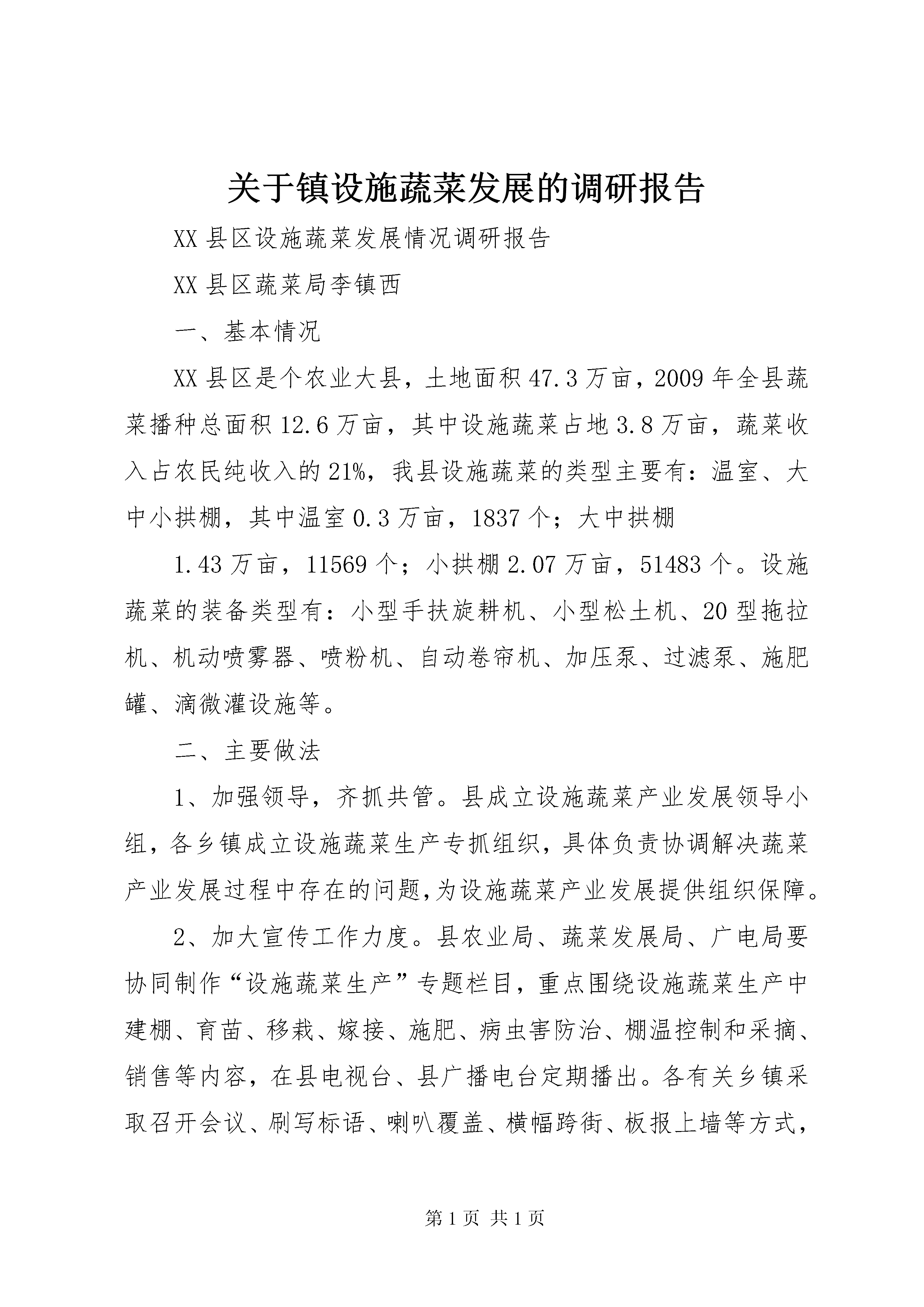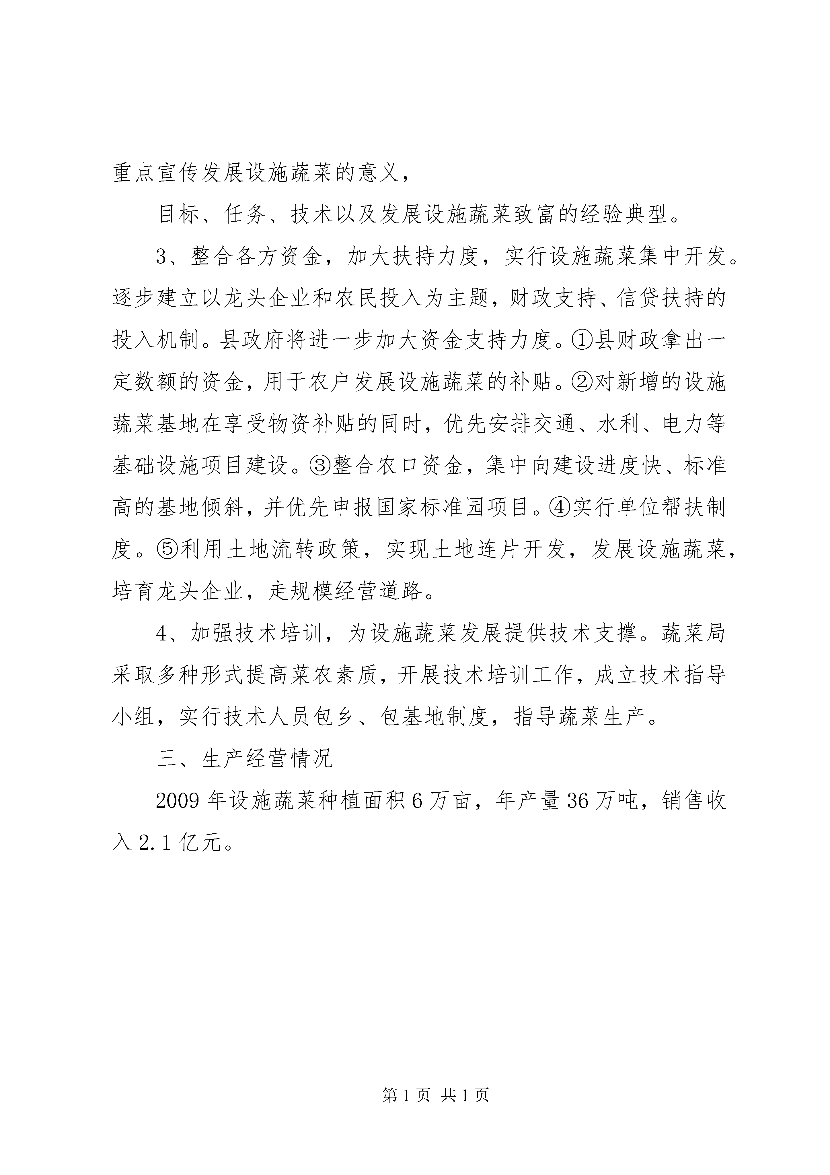 关于镇设施蔬菜发展的调研报告XX县区设施蔬菜发展情况调研报告XX县区蔬菜局李镇西一、基本情况XX县区是个农业大县,土地面积47.3万亩,2009年全县蔬菜播种总面积12.6万亩,其中设施蔬菜占地3.8万亩,蔬菜收入占农民纯收入的21%,我县设施蔬菜的类型主要有:温室、大中小拱棚,其中温室0.3万亩,1837个;大中拱棚1.43万亩,11569个;小拱棚2.07万亩,51483个。设施蔬菜的装备类型有:小型手扶旋耕机、小型松土机、20型拖拉机、机动喷雾器、喷粉机、自动卷帘机、加压泵、过滤泵、施肥罐、滴微灌设施等。二、主要做法1、加强领导,齐抓共管。县成立设施蔬菜产业发展领导小组,各乡镇成立设施蔬菜生产专抓组织,具体负责协调解决蔬菜产业发展过程中存在的问题,为设施蔬菜产业发展提供组织保障。2、加大宣传工作力度。县农业局、蔬菜发展局、广电局要协同制作“设施蔬菜生产”专题栏目,重点围绕设施蔬菜生产中建棚、育苗、移栽、嫁接、施肥、病虫害防治、棚温控制和采摘、销售等内容,在县电视台、县广播电台定期播出。各有关乡镇采取召开会议、刷写标语、喇叭覆盖、横幅跨街、板报上墙等方式,重点宣传发展设施蔬菜的意义,目标、任务、技术以及发展设施蔬菜致富的经验典型。3、整合各方资金,加大扶持力度,实行设施蔬菜集中开发。逐步建立以龙头企业和农民投入为主题,财政支持、信贷扶持的投入机制。县政府将进一步加大资金支持力度。①县财政拿出一定数额的资金,用于农户发展设施蔬菜的补贴。②对新增的设施蔬菜基地在享受物资补贴的同时,优先安排交通、水利、电力等基础设施项目建设。③整合农口资金,集中向建设进度快、标准高的基地倾斜,并优先申报国家标准园项目。④实行单位帮扶制度。⑤利用土地流转政策,实现土地连片开发,发展设施蔬菜,培育龙头企业,走规模经营道路。4、加强技术培训,为设施蔬菜发展提供技术支撑。蔬菜局采取多种形式提高菜农素质,开展技术培训工作,成立技术指导小组,实行技术人员包乡、包基地制度,指导蔬菜生产。三、生产经营情况2009年设施蔬菜种植面积6万亩,年产量36万吨,销售收入2.1亿元。