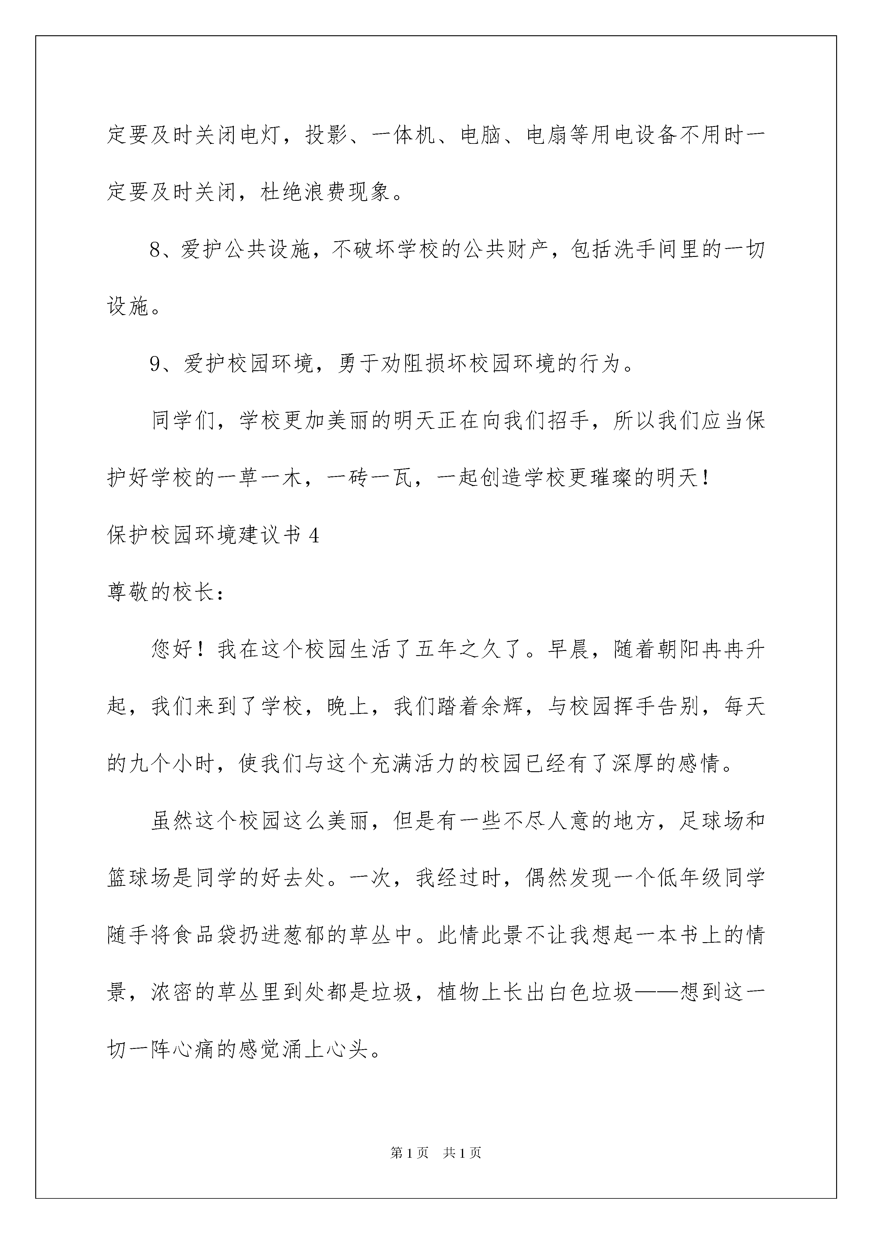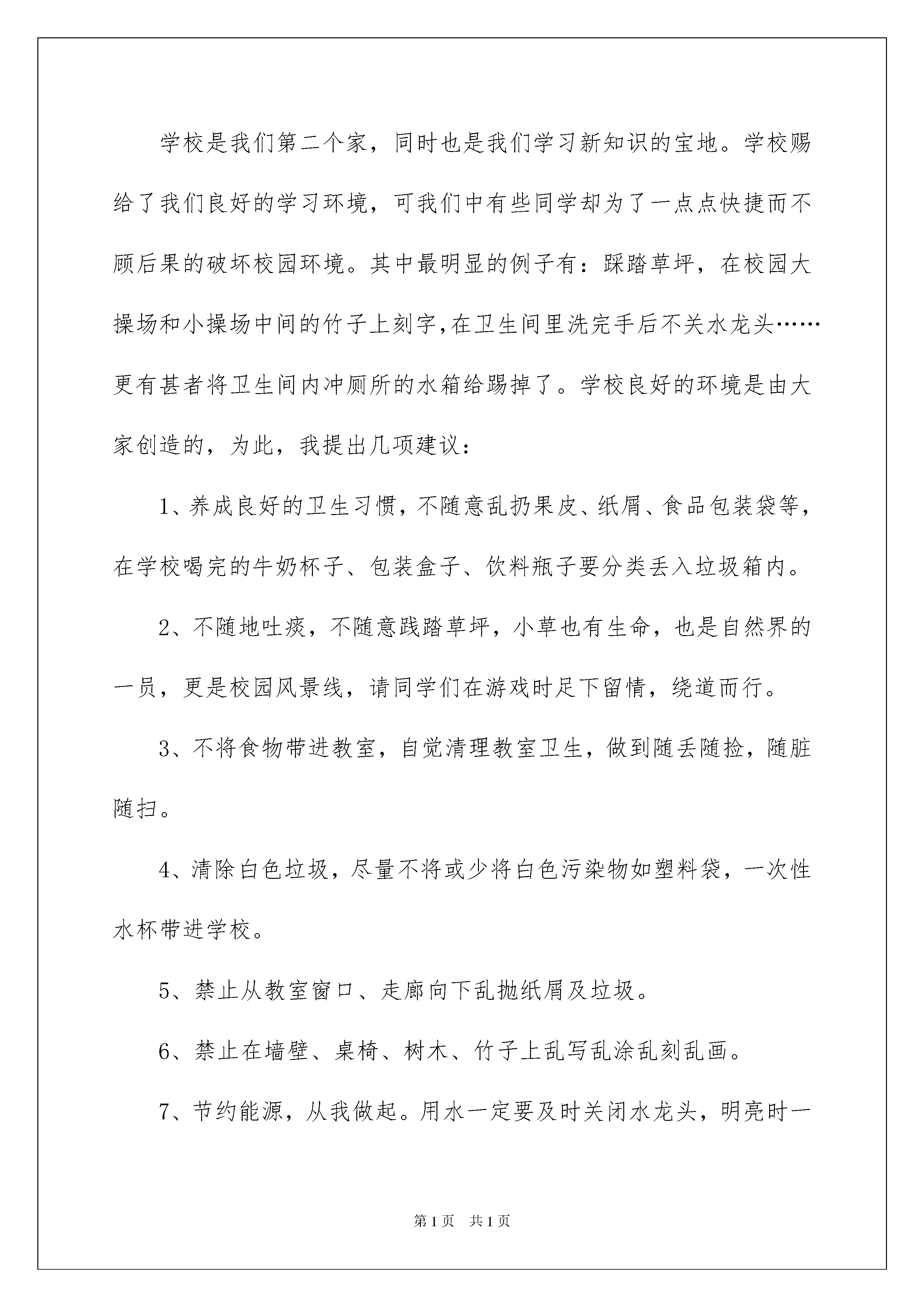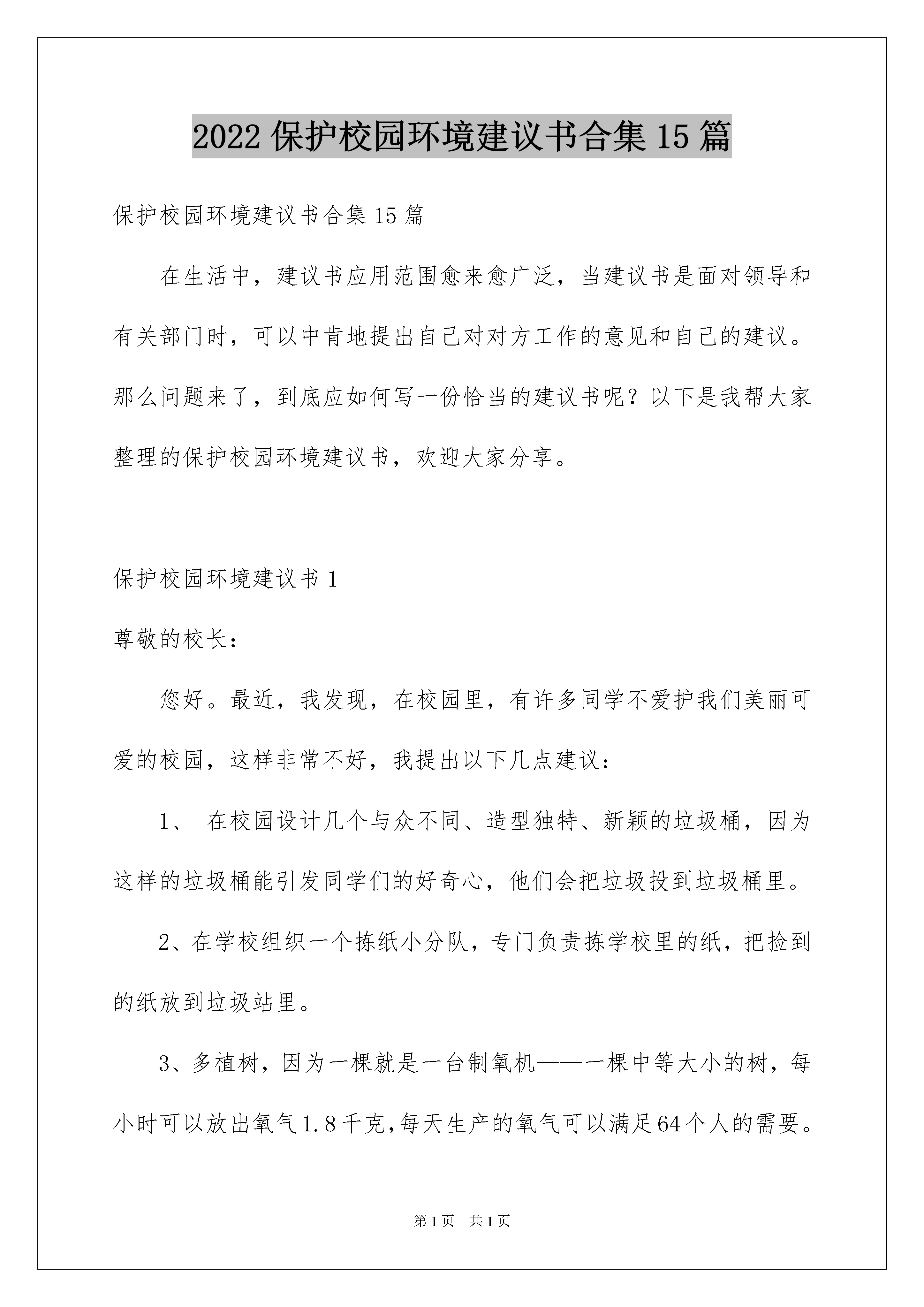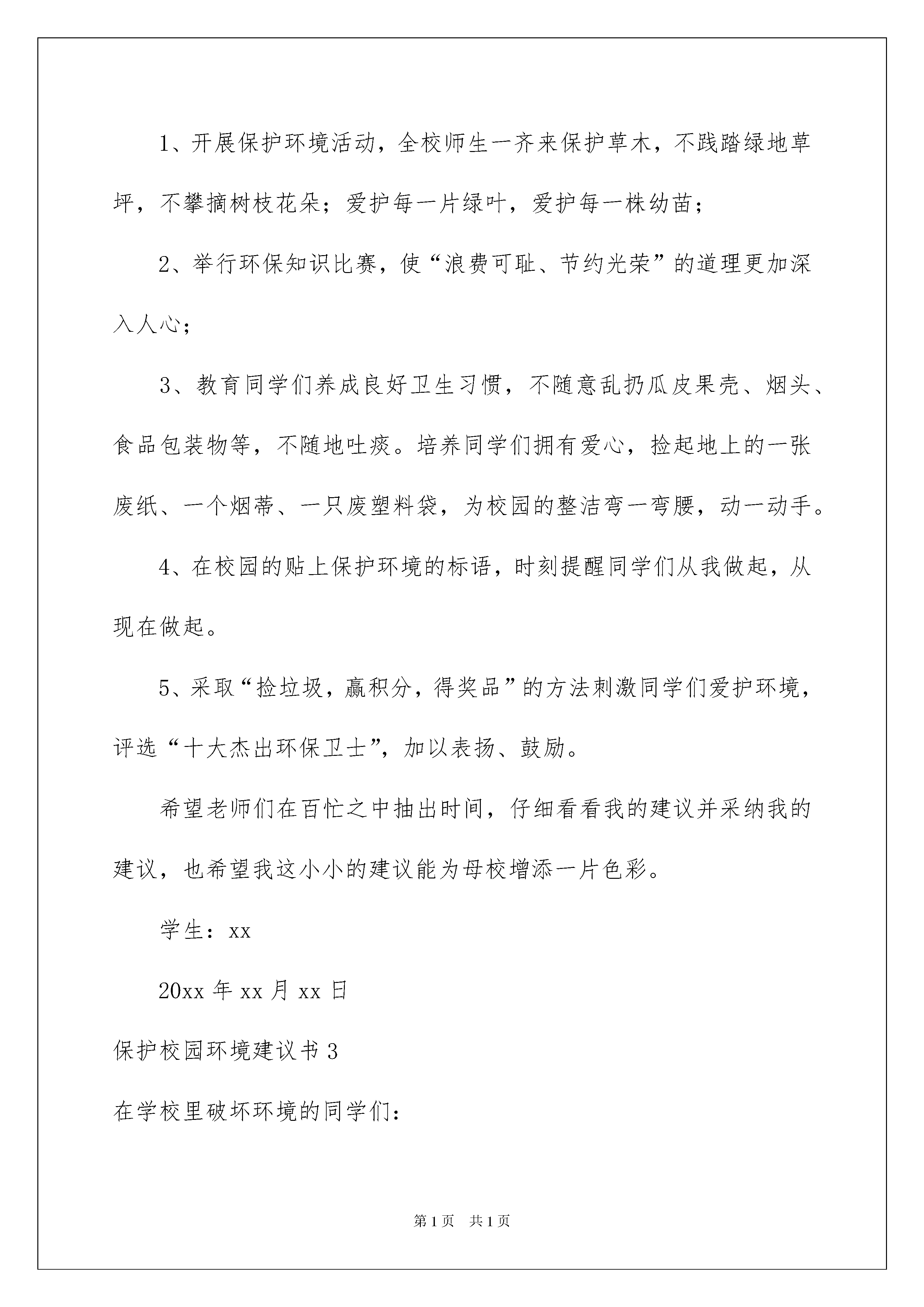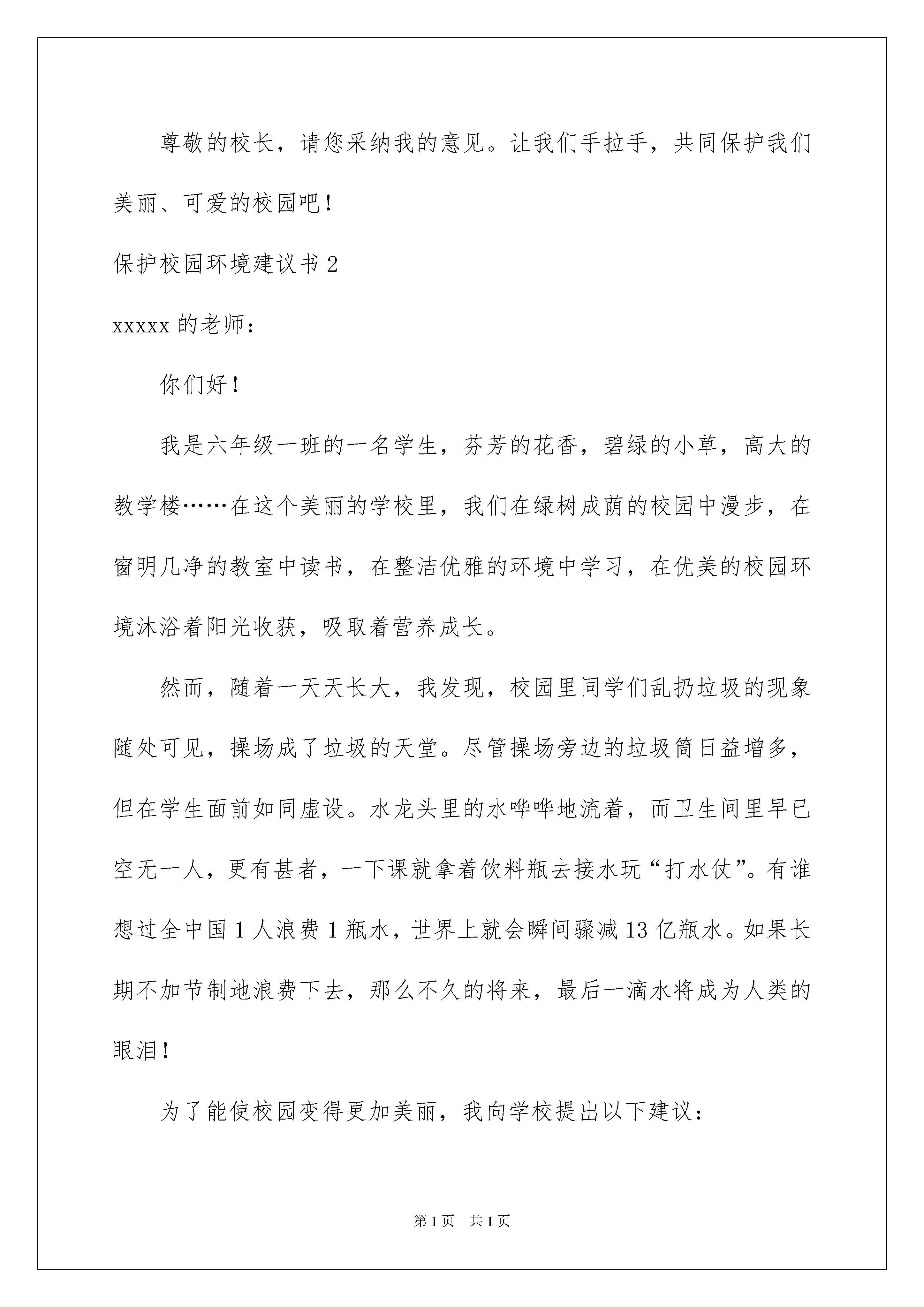2022保护校园环境建议书合集15篇保护校园环境建议书合集15篇在生活中,建议书应用范围愈来愈广泛,当建议书是面对领导和有关部门时,可以中肯地提出自己对对方工作的意见和自己的建议。那么问题来了,到底应如何写一份恰当的建议书呢?以下是我帮大家整理的保护校园环境建议书,欢迎大家分享。保护校园环境建议书1尊敬的校长:您好。最近,我发现,在校园里,有许多同学不爱护我们美丽可爱的校园,这样非常不好,我提出以下几点建议:1、在校园设计几个与众不同、造型独特、新颖的垃圾桶,因为这样的垃圾桶能引发同学们的好奇心,他们会把垃圾投到垃圾桶里。2、在学校组织一个拣纸小分队,专门负责拣学校里的纸,把捡到的纸放到垃圾站里。3、多植树,因为一棵就是一台制氧机——一棵中等大小的树,每小时可以放出氧气1.8千克,每天生产的氧气可以满足64个人的需要。尊敬的校长,请您采纳我的意见。让我们手拉手,共同保护我们美丽、可爱的校园吧!保护校园环境建议书2xxxxx的老师:你们好!我是六年级一班的一名学生,芬芳的花香,碧绿的小草,高大的教学楼……在这个美丽的学校里,我们在绿树成荫的校园中漫步,在窗明几净的教室中读书,在整洁优雅的环境中学习,在优美的校园环境沐浴着阳光收获,吸取着营养成长。然而,随着一天天长大,我发现,校园里同学们乱扔垃圾的现象随处可见,操场成了垃圾的天堂。尽管操场旁边的垃圾筒日益增多,但在学生面前如同虚设。水龙头里的水哗哗地流着,而卫生间里早已空无一人,更有甚者,一下课就拿着饮料瓶去接水玩“打水仗”。有谁想过全中国1人浪费1瓶水,世界上就会瞬间骤减13亿瓶水。如果长期不加节制地浪费下去,那么不久的将来,最后一滴水将成为人类的眼泪!为了能使校园变得更加美丽,我向学校提出以下建议:1、开展保护环境活动,全校师生一齐来保护草木,不践踏绿地草坪,不攀摘树枝花朵;爱护每一片绿叶,爱护每一株幼苗;2、举行环保知识比赛,使“浪费可耻、节约光荣”的道理更加深入人心;3、教育同学们养成良好卫生习惯,不随意乱扔瓜皮果壳、烟头、食品包装物等,不随地吐痰。培养同学们拥有爱心,捡起地上的一张废纸、一个烟蒂、一只废塑料袋,为校园的整洁弯一弯腰,动一动手。4、在校园的贴上保护环境的标语,时刻提醒同学们从我做起,从现在做起。5、采取“捡垃圾,赢积分,得奖品”的方法刺激同学们爱护环境,评选“十大杰出环保卫士”,加以表扬、鼓励。希望老师们在百忙之中抽出时间,仔细看看我的建议并采纳我的建议,也希望我这小小的建议能为母校增添一片色彩。学生:xx20xx年xx月xx日保护校园环境建议书3在学校里破坏环境的同学们:学校是我们第二个家,同时也是我们学习新知识的宝地。学校赐给了我们良好的学习环境,可我们中有些同学却为了一点点快捷而不顾后果的破坏校园环境。其中最明显的例子有:踩踏草坪,在校园大操场和小操场中间的竹子上刻字,在卫生间里洗完手后不关水龙头……更有甚者将卫生间内冲厕所的水箱给踢掉了。学校良好的环境是由大家创造的,为此,我提出几项建议:1、养成良好的卫生习惯,不随意乱扔果皮、纸屑、食品包装袋等,在学校喝完的牛奶杯子、包装盒子、饮料瓶子要分类丢入垃圾箱内。2、不随地吐痰,不随意践踏草坪,小草也有生命,也是自然界的一员,更是校园风景线,请同学们在游戏时足下留情,绕道而行。3、不将食物带进教室,自觉清理教室卫生,做到随丢随捡,随脏随扫。4、清除白色垃圾,尽量不将或少将白色污染物如塑料袋,一次性水杯带进学校。5、禁止从教室窗口、走廊向下乱抛纸屑及垃圾。6、禁止在墙壁、桌椅、树木、竹子上乱写乱涂乱刻乱画。7、节约能源,从我做起。用水一定要及时关闭水龙头,明亮时一定要及时关闭电灯,投影、一体机、电脑、电扇等用电设备不用时一定要及时关闭,杜绝浪费现象。8、爱护公共设施,不破坏学校的公共财产,包括洗手间里的一切设施。9、爱护校园环境,勇于劝阻损坏校园环境的行为。同学们,学校更加美丽的明天正在向我们招手,所以我们应当保护好学校的一草一木,一砖一瓦,一起创造学校更璀璨的明天!保护校园环境建议书4尊敬的校长:您好!我在这个校园生活了五年之久了。早晨,随着朝阳冉冉升起,我们来到了学校,晚上,我们踏着余辉,与校园挥手告别,每天的九个小时,使我们与这个充满活力的校园已经有了深厚的感情。虽然这个校园这么美丽,但是有一些不尽人意的地方,足球场和篮球场是同学的好去处。一次,我经过时,偶然发现一个低年级同学随手将食品袋扔进葱郁的草丛中。此情此景不让我想起一本书上的情景,浓密的草丛里到处都是垃圾,植物上长出白色垃圾——想到这一切一阵心痛的感觉涌上心头。学校的走廊上、操场上、足球