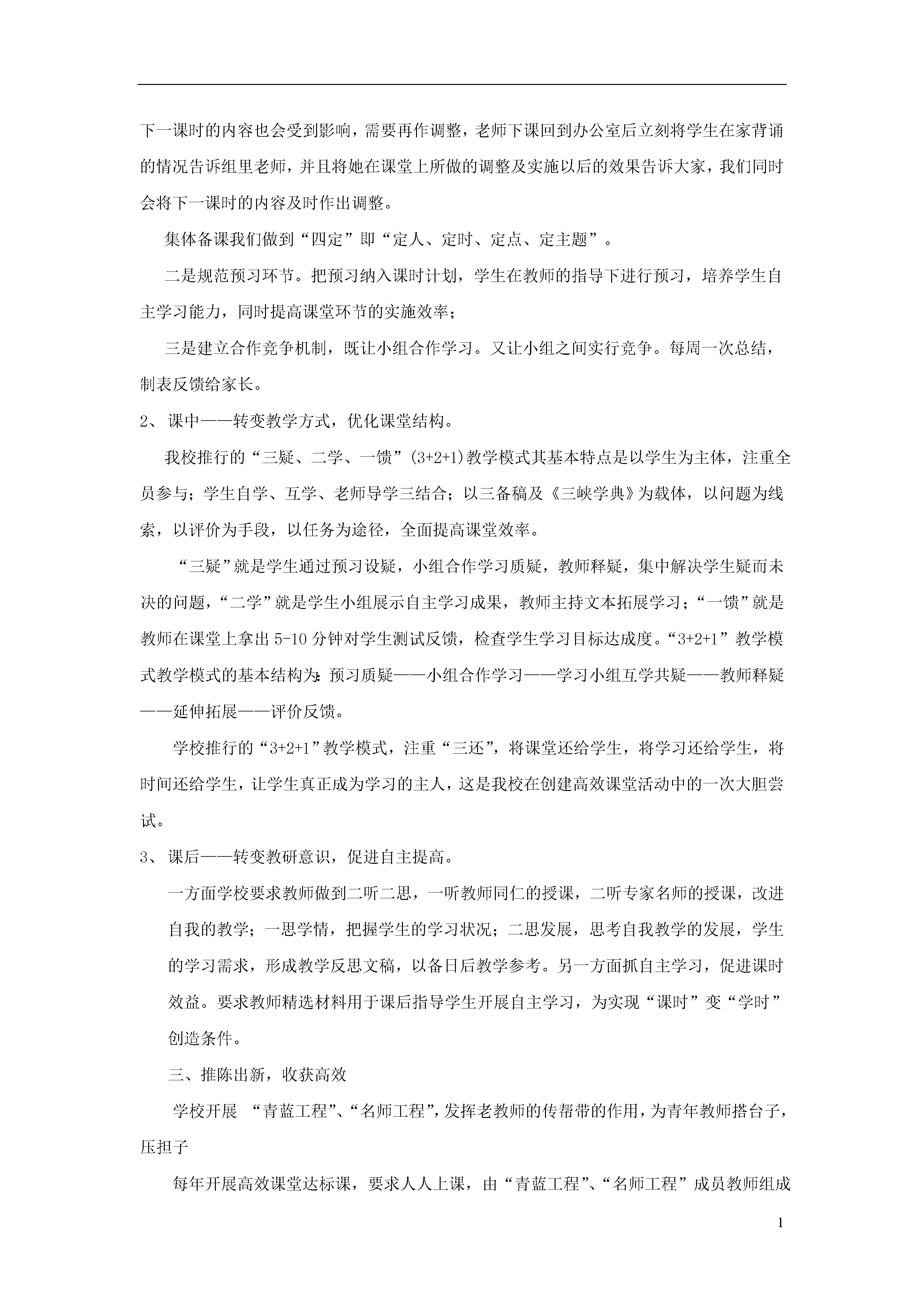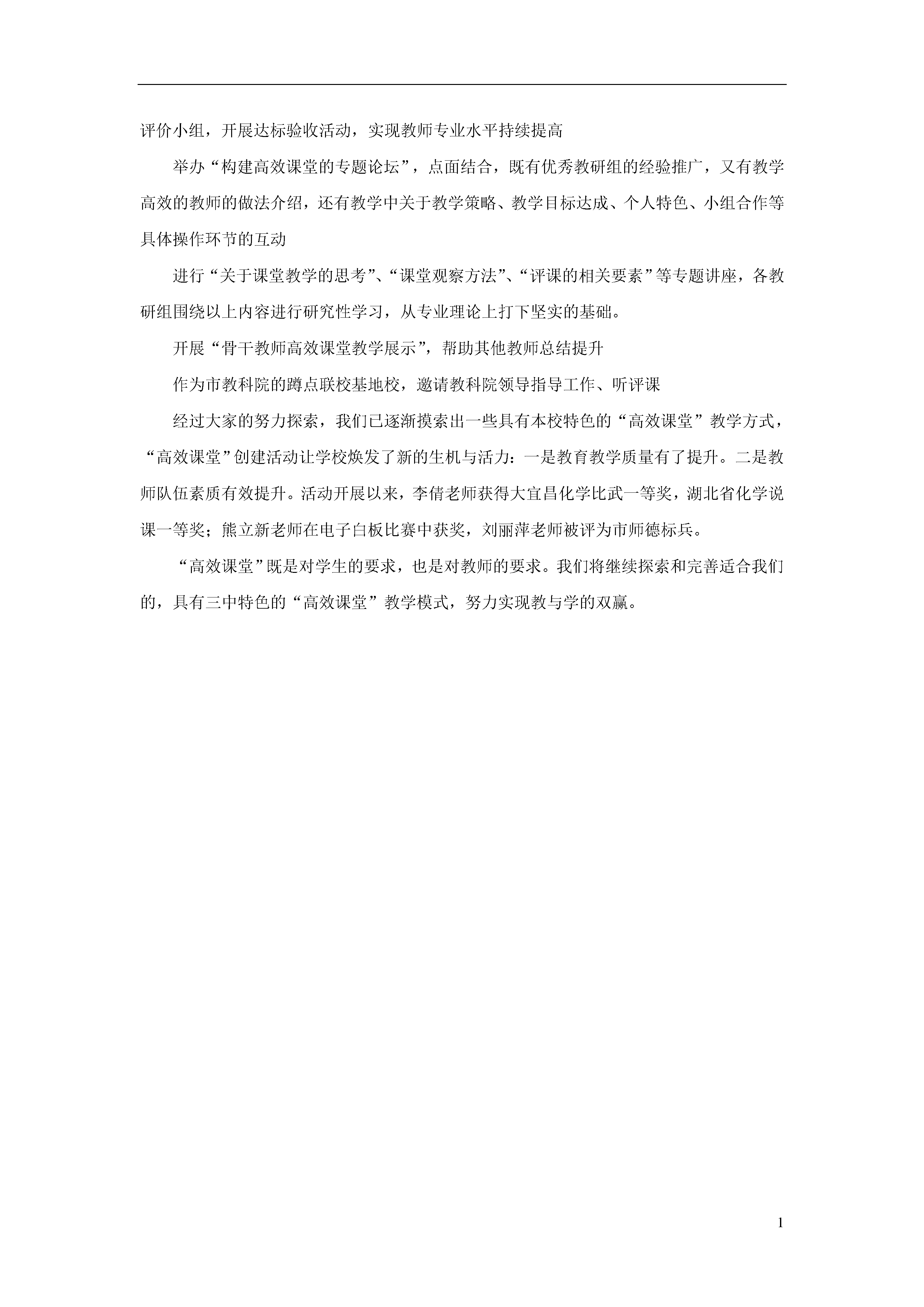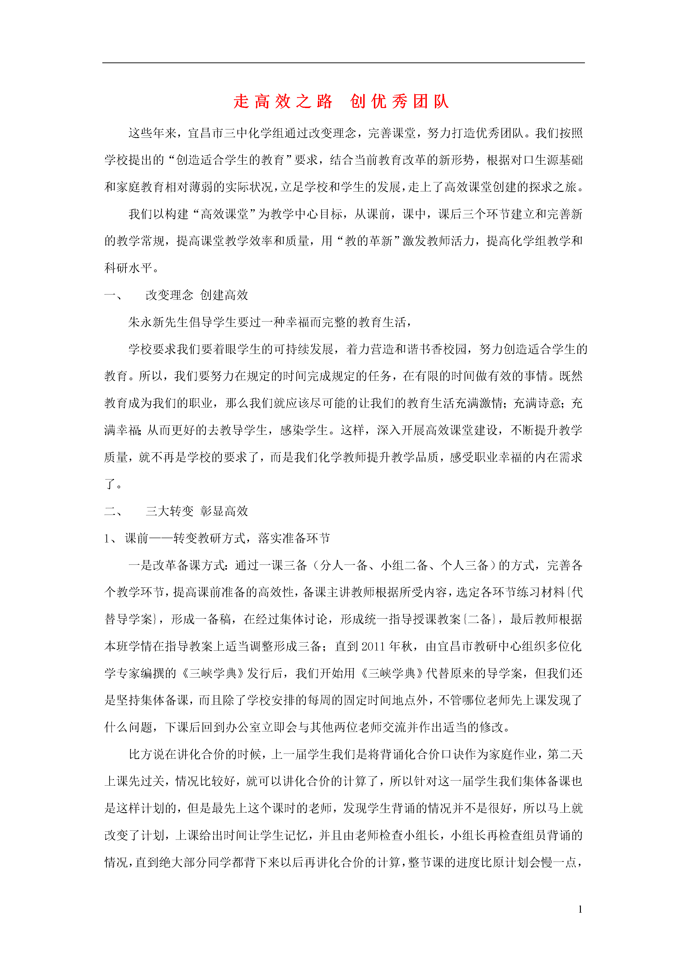 1走高效之路创优秀团队这些年来,宜昌市三中化学组通过改变理念,完善课堂,努力打造优秀团队。我们按照学校提出的“创造适合学生的教育”要求,结合当前教育改革的新形势,根据对口生源基础和家庭教育相对薄弱的实际状况,立足学校和学生的发展,走上了高效课堂创建的探求之旅。我们以构建“高效课堂”为教学中心目标,从课前,课中,课后三个环节建立和完善新的教学常规,提高课堂教学效率和质量,用“教的革新”激发教师活力,提高化学组教学和科研水平。改变理念创建高效朱永新先生倡导学生要过一种幸福而完整的教育生活,学校要求我们要着眼学生的可持续发展,着力营造和谐书香校园,努力创造适合学生的教育。所以,我们要努力在规定的时间完成规定的任务,在有限的时间做有效的事情。既然教育成为我们的职业,那么我们就应该尽可能的让我们的教育生活充满激情;充满诗意;充满幸福;从而更好的去教导学生,感染学生。这样,深入开展高效课堂建设,不断提升教学质量,就不再是学校的要求了,而是我们化学教师提升教学品质,感受职业幸福的内在需求了。三大转变彰显高效课前——转变教研方式,落实准备环节一是改革备课方式:通过一课三备(分人一备、小组二备、个人三备)的方式,完善各个教学环节,提高课前准备的高效性,备课主讲教师根据所受内容,选定各环节练习材料{代替导学案},形成一备稿,在经过集体讨论,形成统一指导授课教案{二备},最后教师根据本班学情在指导教案上适当调整形成三备;直到2011年秋,由宜昌市教研中心组织多位化学专家编撰的《三峡学典》发行后,我们开始用《三峡学典》代替原来的导学案,但我们还是坚持集体备课,而且除了学校安排的每周的固定时间地点外,不管哪位老师先上课发现了什么问题,下课后回到办公室立即会与其他两位老师交流并作出适当的修改。比方说在讲化合价的时候,上一届学生我们是将背诵化合价口诀作为家庭作业,第二天上课先过关,情况比较好,就可以讲化合价的计算了,所以针对这一届学生我们集体备课也是这样计划的,但是最先上这个课时的老师,发现学生背诵的情况并不是很好,所以马上就改变了计划,上课给出时间让学生记忆,并且由老师检查小组长,小组长再检查组员背诵的情况,直到绝大部分同学都背下来以后再讲化合价的计算,整节课的进度比原计划会慢一点,下一课时的内容也会受到影响,需要再作调整,老师下课回到办公室后立刻将学生在家背诵的情况告诉组里老师,并且将她在课堂上所做的调整及实施以后的效果告诉大家,我们同时会将下一课时的内容及时作出调整。集体备课我们做到“四定”即“定人、定时、定点、定主题”。二是规范预习环节。把预习纳入课时计划,学生在教师的指导下进行预习,培养学生自主学习能力,同时提高课堂环节的实施效率;三是建立合作竞争机制,既让小组合作学习。又让小组之间实行竞争。每周一次总结,制表反馈给家长。课中——转变教学方式,优化课堂结构。我校推行的“三疑、二学、一馈”(3+2+1)教学模式其基本特点是以学生为主体,注重全员参与;学生自学、互学、老师导学三结合;以三备稿及《三峡学典》为载体,以问题为线索,以评价为手段,以任务为途径,全面提高课堂效率。“三疑”就是学生通过预习设疑,小组合作学习质疑,教师释疑,集中解决学生疑而未决的问题,“二学”就是学生小组展示自主学习成果,教师主持文本拓展学习;“一馈”就是教师在课堂上拿出5-10分钟对学生测试反馈,检查学生学习目标达成度。“3+2+1”教学模式教学模式的基本结构为:预习质疑——小组合作学习——学习小组互学共疑——教师释疑——延伸拓展——评价反馈。学校推行的“3+2+1”教学模式,注重“三还”,将课堂还给学生,将学习还给学生,将时间还给学生,让学生真正成为学习的主人,这是我校在创建高效课堂活动中的一次大胆尝试。课后——转变教研意识,促进自主提高。一方面学校要求教师做到二听二思,一听教师同仁的授课,二听专家名师的授课,改进自我的教学;一思学情,把握学生的学习状况;二思发展,思考自我教学的发展,学生的学习需求,形成教学反思文稿,以备日后教学参考。另一方面抓自主学习,促进课时效益。要求教师精选材料用于课后指导学生开展自主学习,为实现“课时”变“学时”创造条件。三、推陈出新,收获高效学校开展“青蓝工程”、“名师工程”,发挥老教师的传帮带的作用,为青年教师搭台子,压担子每年开展高效课堂达标课,要求人人上课,由“青蓝工程”、“名师工程”成员教师组成评价小组,开展达标验收活动,实现教师专业水平持续提高举办“构建高效课堂的专题论坛”,点面结合,既有优秀教研组的经验推广,又有教学高效的教师的做法介绍,还有教学中关于教学策略、教学目标达成、个人特色、小组合作等具体操作环节的互动进行“关于课堂教学的思考”、“课堂观察方法”、“评课的相关要素”