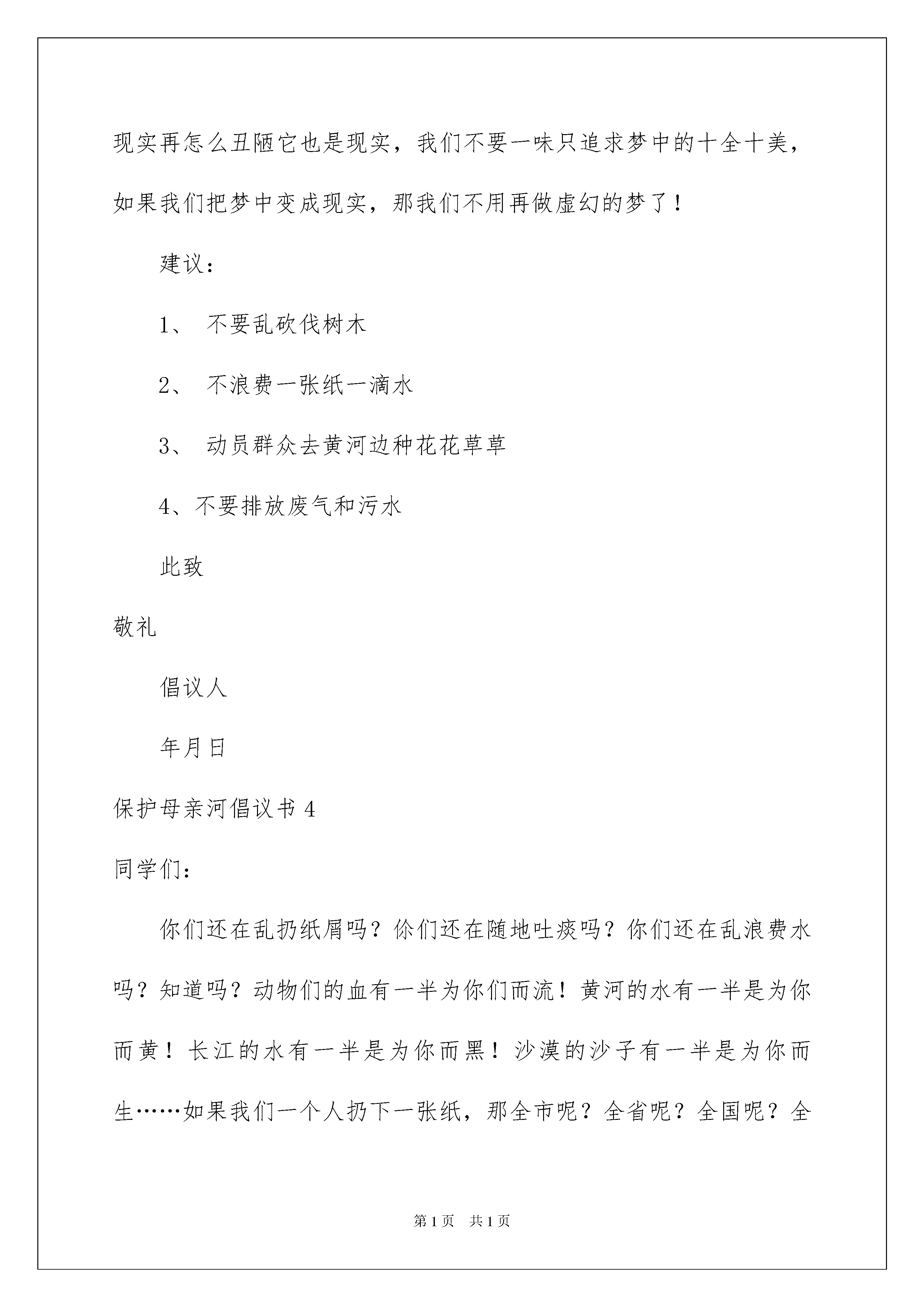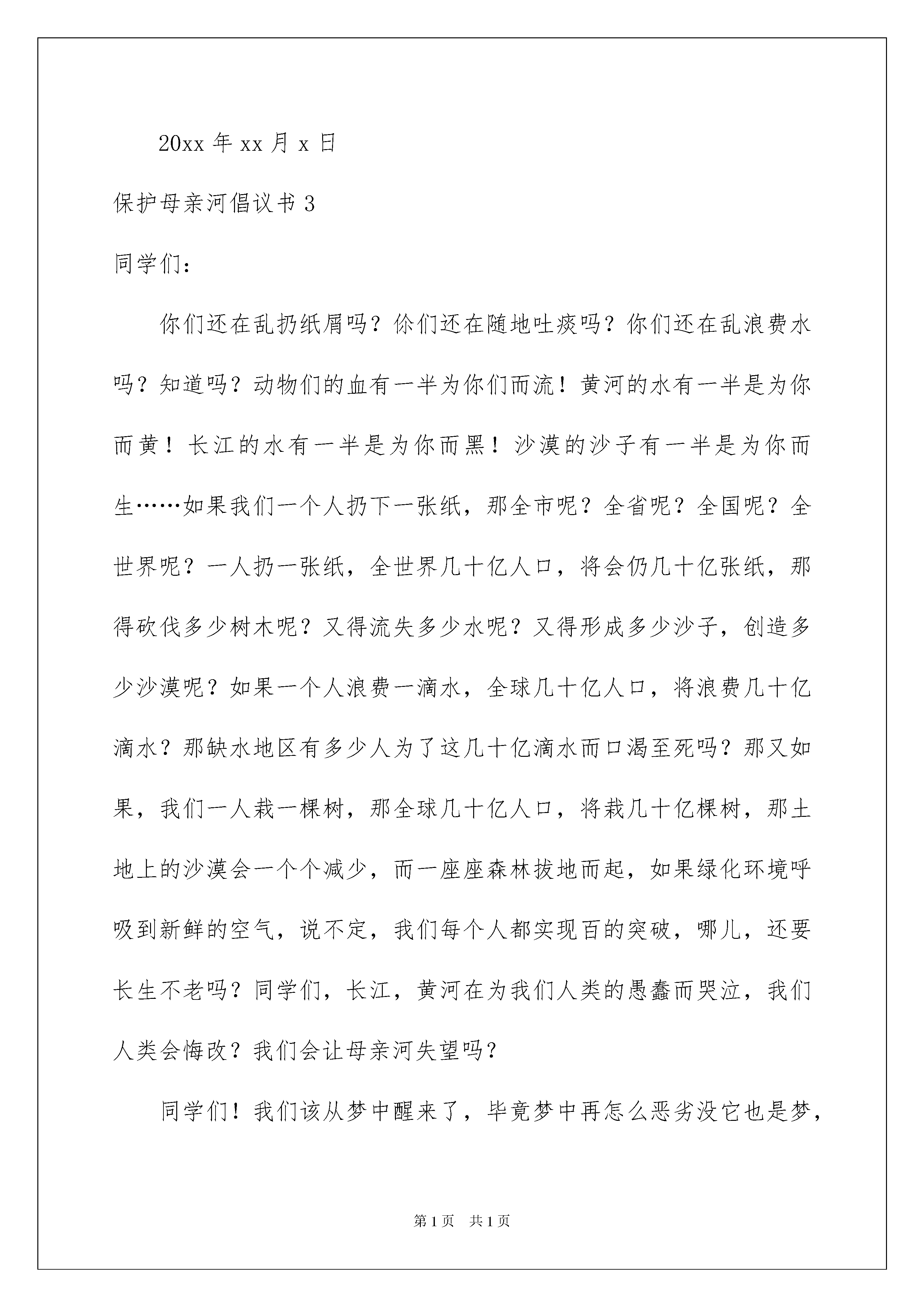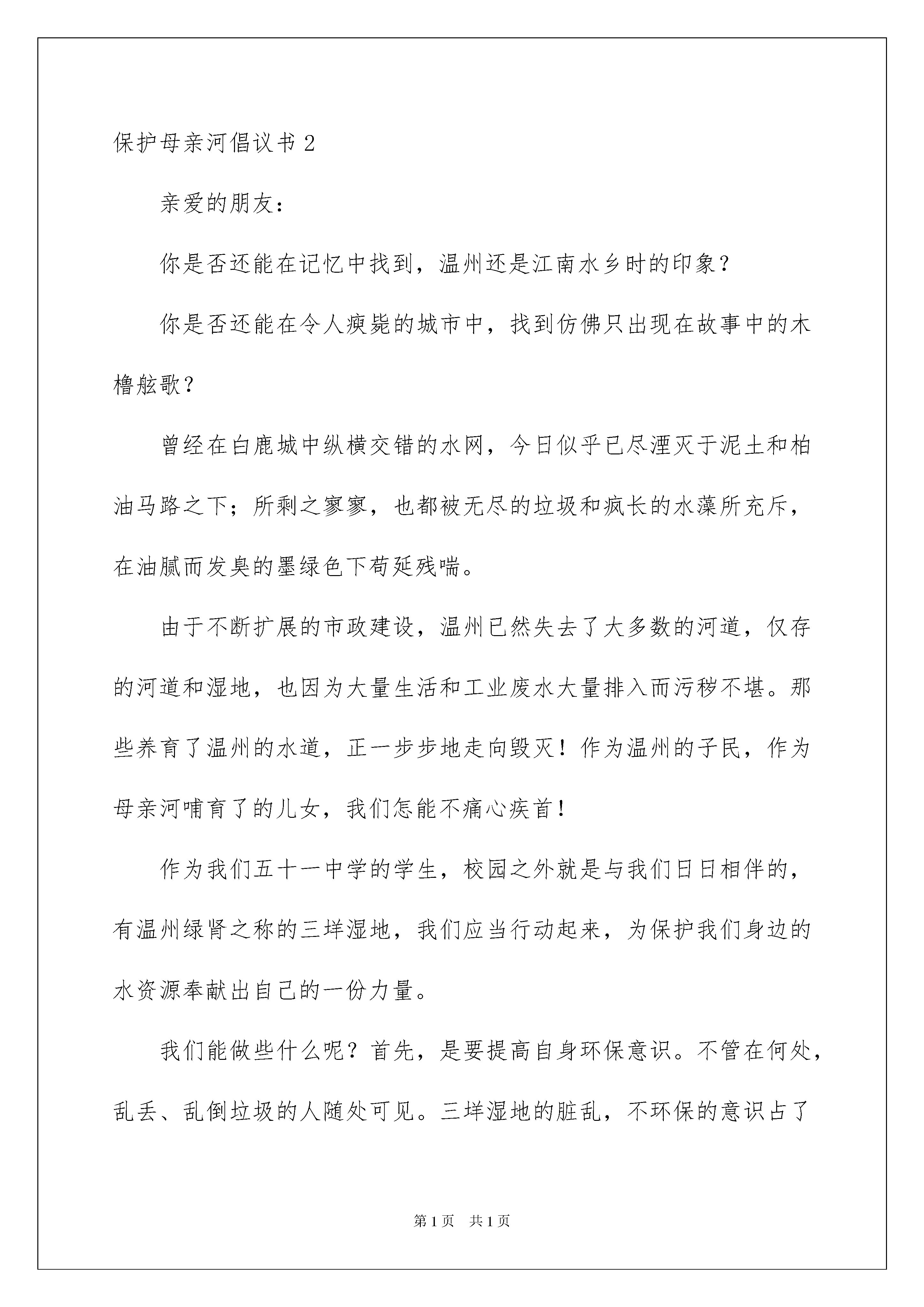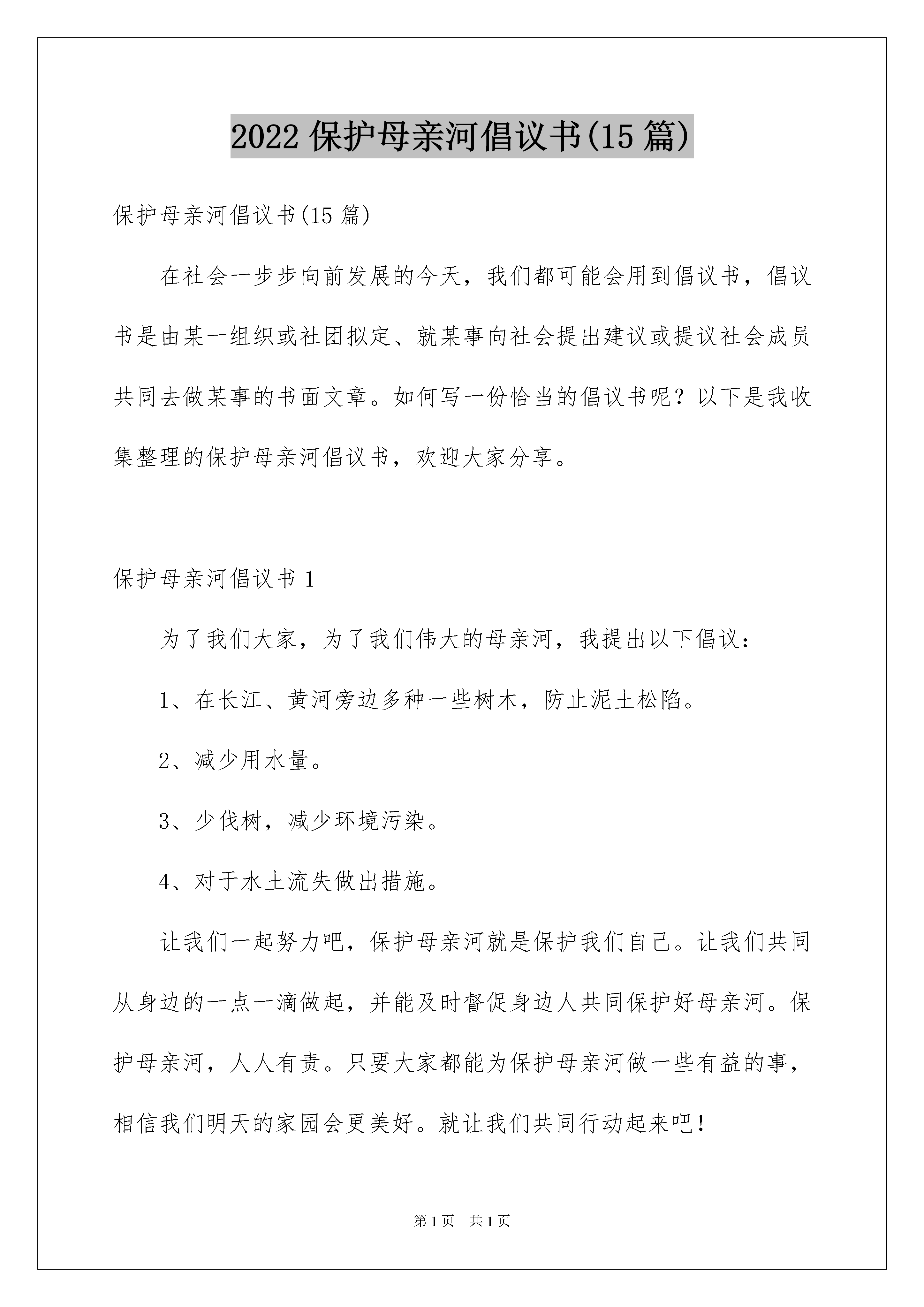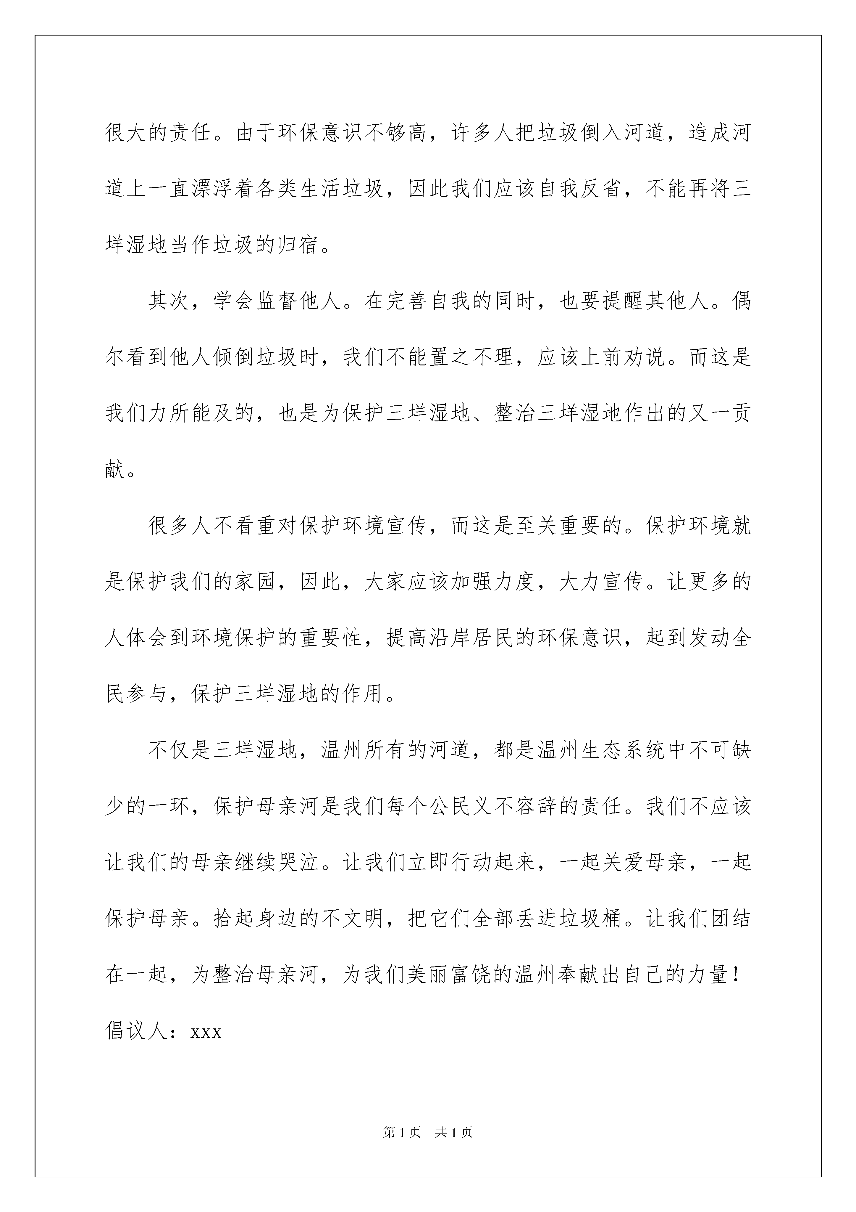 2022保护母亲河倡议书(15篇)保护母亲河倡议书(15篇)在社会一步步向前发展的今天,我们都可能会用到倡议书,倡议书是由某一组织或社团拟定、就某事向社会提出建议或提议社会成员共同去做某事的书面文章。如何写一份恰当的倡议书呢?以下是我收集整理的保护母亲河倡议书,欢迎大家分享。保护母亲河倡议书1为了我们大家,为了我们伟大的母亲河,我提出以下倡议:1、在长江、黄河旁边多种一些树木,防止泥土松陷。2、减少用水量。3、少伐树,减少环境污染。4、对于水土流失做出措施。让我们一起努力吧,保护母亲河就是保护我们自己。让我们共同从身边的一点一滴做起,并能及时督促身边人共同保护好母亲河。保护母亲河,人人有责。只要大家都能为保护母亲河做一些有益的事,相信我们明天的家园会更美好。就让我们共同行动起来吧!保护母亲河倡议书2亲爱的朋友:你是否还能在记忆中找到,温州还是江南水乡时的印象?你是否还能在令人瘐毙的城市中,找到仿佛只出现在故事中的木橹舷歌?曾经在白鹿城中纵横交错的水网,今日似乎已尽湮灭于泥土和柏油马路之下;所剩之寥寥,也都被无尽的垃圾和疯长的水藻所充斥,在油腻而发臭的墨绿色下苟延残喘。由于不断扩展的市政建设,温州已然失去了大多数的河道,仅存的河道和湿地,也因为大量生活和工业废水大量排入而污秽不堪。那些养育了温州的水道,正一步步地走向毁灭!作为温州的子民,作为母亲河哺育了的儿女,我们怎能不痛心疾首!作为我们五十一中学的学生,校园之外就是与我们日日相伴的,有温州绿肾之称的三垟湿地,我们应当行动起来,为保护我们身边的水资源奉献出自己的一份力量。我们能做些什么呢?首先,是要提高自身环保意识。不管在何处,乱丢、乱倒垃圾的人随处可见。三垟湿地的脏乱,不环保的意识占了很大的责任。由于环保意识不够高,许多人把垃圾倒入河道,造成河道上一直漂浮着各类生活垃圾,因此我们应该自我反省,不能再将三垟湿地当作垃圾的归宿。其次,学会监督他人。在完善自我的同时,也要提醒其他人。偶尔看到他人倾倒垃圾时,我们不能置之不理,应该上前劝说。而这是我们力所能及的,也是为保护三垟湿地、整治三垟湿地作出的又一贡献。很多人不看重对保护环境宣传,而这是至关重要的。保护环境就是保护我们的家园,因此,大家应该加强力度,大力宣传。让更多的人体会到环境保护的重要性,提高沿岸居民的环保意识,起到发动全民参与,保护三垟湿地的作用。不仅是三垟湿地,温州所有的河道,都是温州生态系统中不可缺少的一环,保护母亲河是我们每个公民义不容辞的责任。我们不应该让我们的母亲继续哭泣。让我们立即行动起来,一起关爱母亲,一起保护母亲。拾起身边的不文明,把它们全部丢进垃圾桶。让我们团结在一起,为整治母亲河,为我们美丽富饶的温州奉献出自己的力量!倡议人:xxx20xx年xx月x日保护母亲河倡议书3同学们:你们还在乱扔纸屑吗?伱们还在随地吐痰吗?你们还在乱浪费水吗?知道吗?动物们的血有一半为你们而流!黄河的水有一半是为你而黄!长江的水有一半是为你而黑!沙漠的沙子有一半是为你而生……如果我们一个人扔下一张纸,那全市呢?全省呢?全国呢?全世界呢?一人扔一张纸,全世界几十亿人口,将会仍几十亿张纸,那得砍伐多少树木呢?又得流失多少水呢?又得形成多少沙子,创造多少沙漠呢?如果一个人浪费一滴水,全球几十亿人口,将浪费几十亿滴水?那缺水地区有多少人为了这几十亿滴水而口渴至死吗?那又如果,我们一人栽一棵树,那全球几十亿人口,将栽几十亿棵树,那土地上的沙漠会一个个减少,而一座座森林拔地而起,如果绿化环境呼吸到新鲜的空气,说不定,我们每个人都实现百的突破,哪儿,还要长生不老吗?同学们,长江,黄河在为我们人类的愚蠢而哭泣,我们人类会悔改?我们会让母亲河失望吗?同学们!我们该从梦中醒来了,毕竟梦中再怎么恶劣没它也是梦,现实再怎么丑陋它也是现实,我们不要一味只追求梦中的十全十美,如果我们把梦中变成现实,那我们不用再做虚幻的梦了!建议:1、不要乱砍伐树木2、不浪费一张纸一滴水3、动员群众去黄河边种花花草草4、不要排放废气和污水此致敬礼倡议人年月日保护母亲河倡议书4同学们:你们还在乱扔纸屑吗?伱们还在随地吐痰吗?你们还在乱浪费水吗?知道吗?动物们的血有一半为你们而流!黄河的水有一半是为你而黄!长江的水有一半是为你而黑!沙漠的沙子有一半是为你而生……如果我们一个人扔下一张纸,那全市呢?全省呢?全国呢?全世界呢?一人扔一张纸,全世界几十亿人口,将会仍几十亿张纸,那得砍伐多少树木呢?又得流失多少水呢?又得形成多少沙子,创造多少沙漠呢?如果一个人浪费一滴水,全球几十亿人口,将浪费几十亿滴水?那缺水地区有多少人为了这