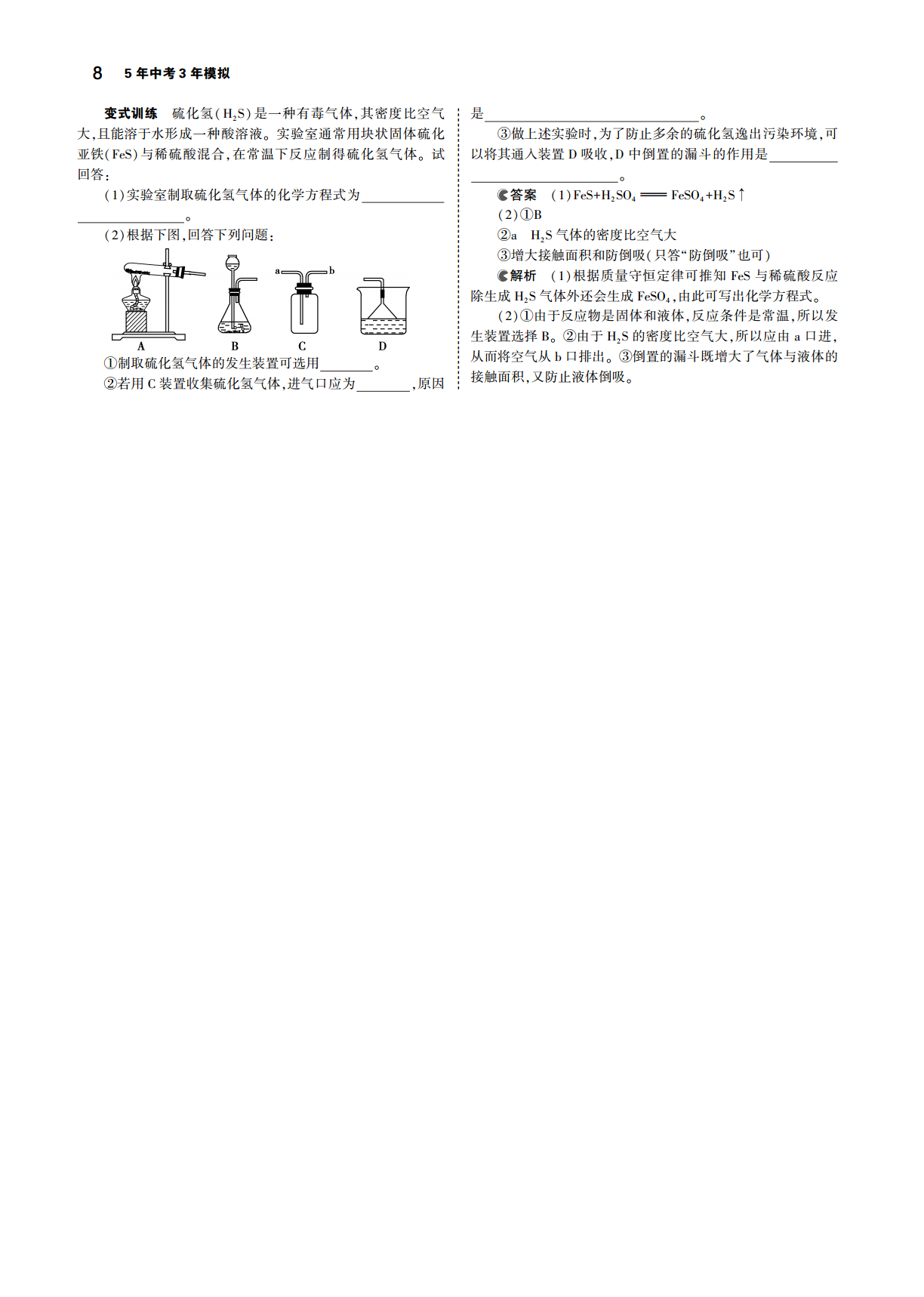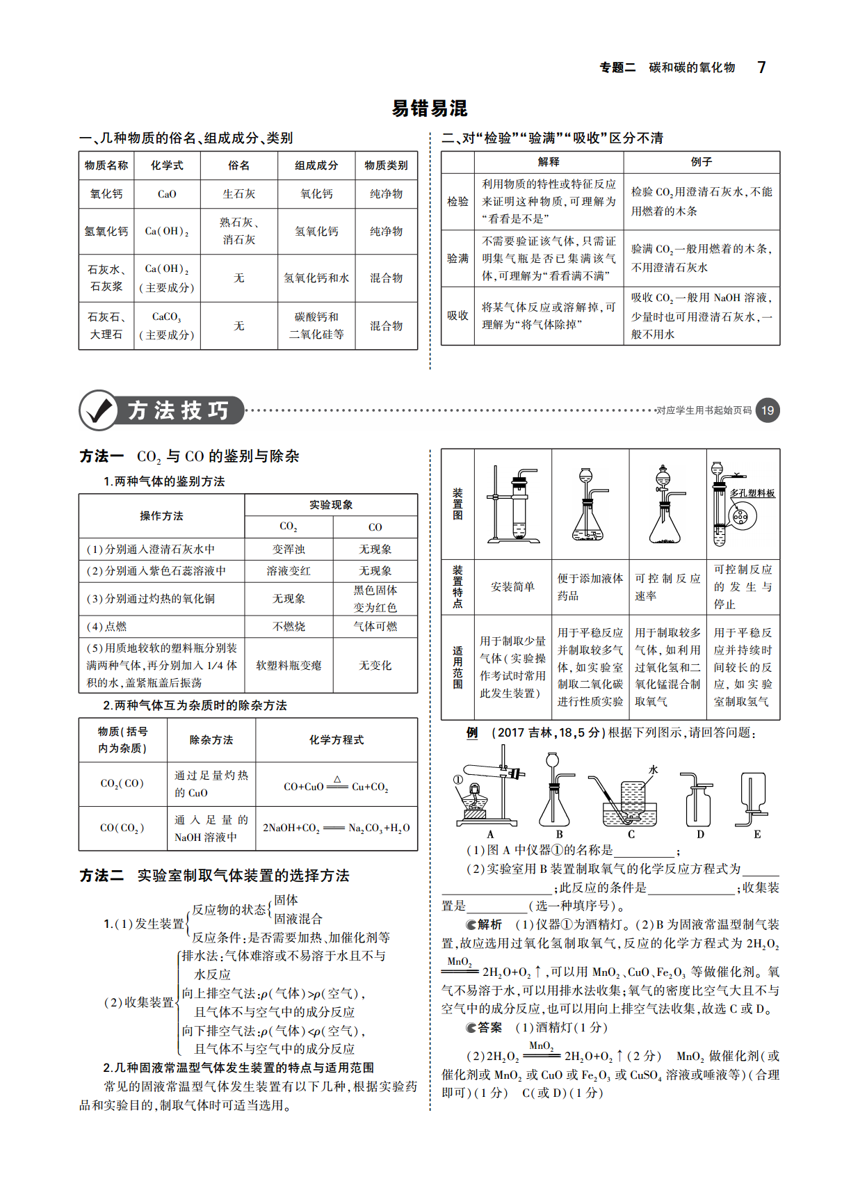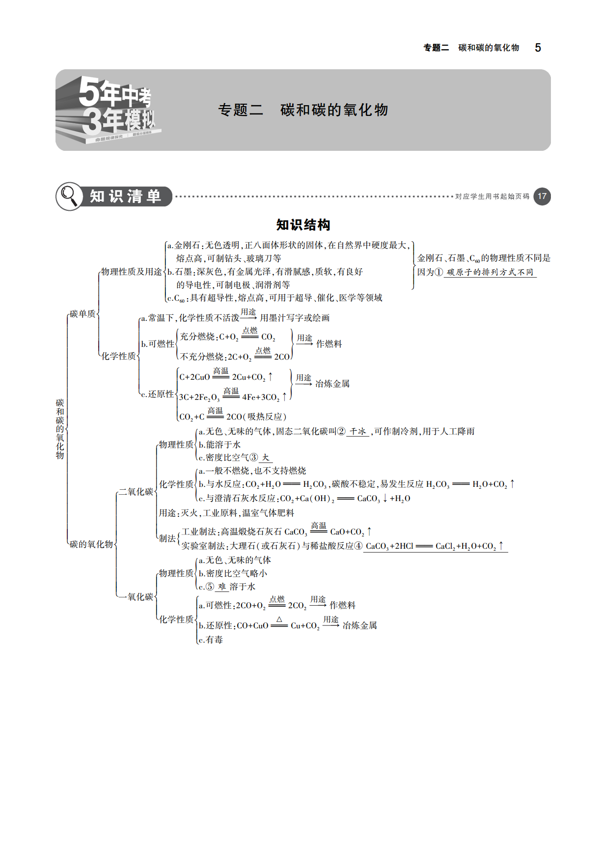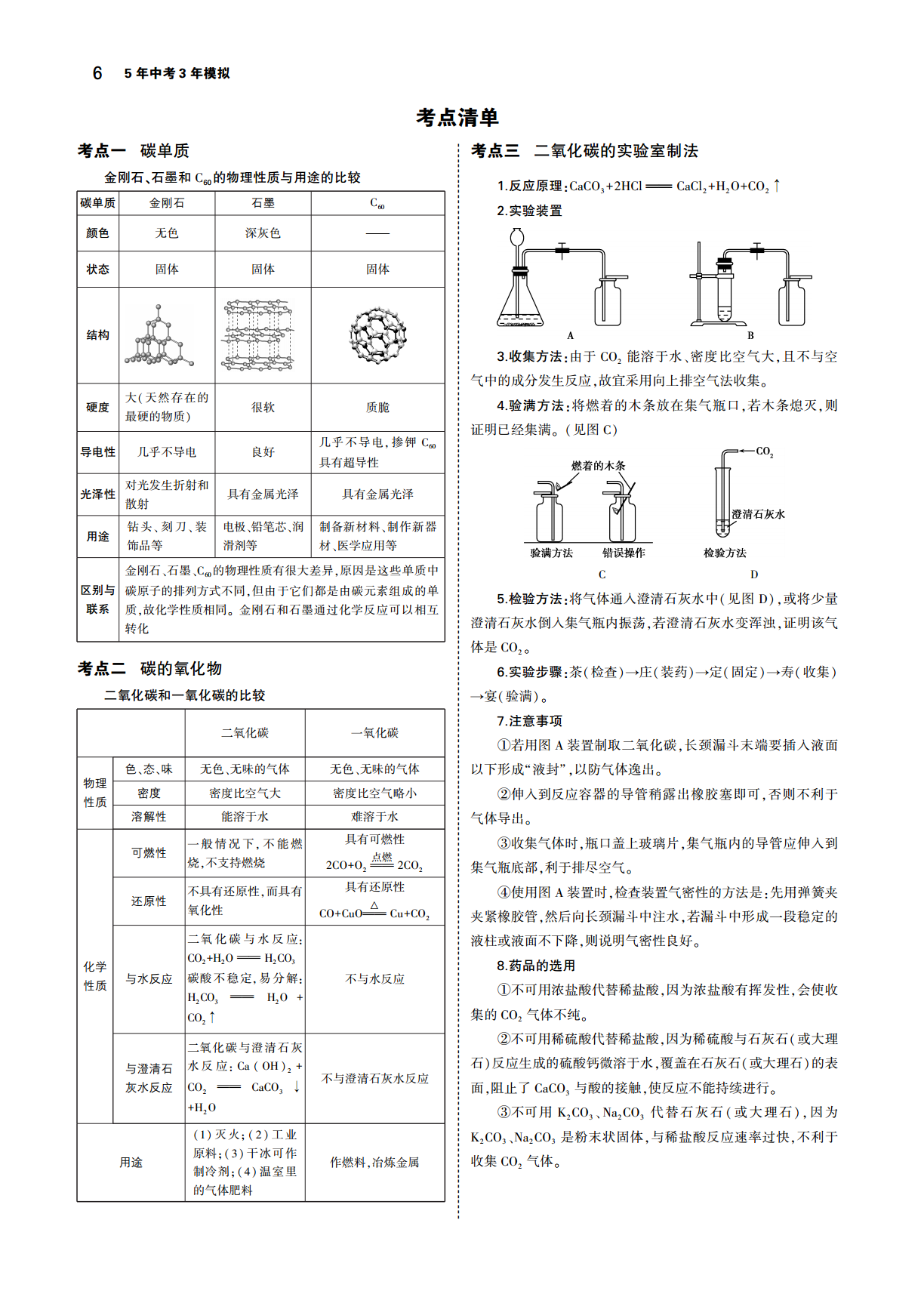 专题二碳和碳的氧化物5专题二碳和碳的氧化物17知识结构金刚石无色透明正八面体形状的固体在自然界中硬度最大ïìa.:,,,ïüï熔点高可制钻头玻璃刀等ï金刚石石墨的物理性质不同是ï,、ý、、C60物理性质及用途í石墨深灰色有金属光泽有滑腻感质软有良好ï因为碳原子的排列方式不同ìb.:,,,,ï①ïï的导电性可制电极润滑剂等þïï,、ïî具有超导性熔点高可用于超导催化医学等领域ïc.C60:,,、、碳单质í用途ì常温下化学性质不活泼用墨汁写字或绘画ïïìa.,→ï点燃ïïï充分燃烧用途+22ïïï可燃性:COCO作燃料ïîb.{点燃}→化学性质í不充分燃烧ïï:2C+O22CO高温ïïïì用途ïïC+2CuO2Cu+CO2↑冶炼金属îï高温ï还原性í}→碳ïc.ï3C+2Fe2O34Fe+3CO2↑和ïï高温碳î吸热反应ïCO2+C2CO()的í无色无味的气体固态二氧化碳叫干冰可作制冷剂用于人工降雨氧ïa.、,②,,物理性质能溶于水化ïì物ï{b.ï密度比空气大ïc.③ï一般不燃烧也不支持燃烧ïïa.,ï化学性质与水反应碳酸不稳定易发生反应ï二氧化碳í{b.:CO2+H2OH2CO3,,H2CO3H2O+CO2↑ïïìï与澄清石灰水反应c.:CO2+Ca(OH)2CaCO3↓+H2Oïïï用途灭火工业原料温室气体肥料ïïï:,,ïï高温ïïî工业制法高温煅烧石灰石îï制法{:CaCO3CaO+CO2↑碳的氧化物í实验室制法大理石或石灰石与稀盐酸反应ï:()④CaCO3+2HClCaCl2+H2O+CO2↑无色无味的气体ïa.、ï物理性质密度比空气略小ïïì{b.ï难溶于水îïc.⑤一氧化碳í点燃用途ïïì可燃性作燃料ï22îïa.:2CO+O2CO→化学性质í用途ï还原性△冶炼金属ïb.:CO+CuOCu+CO2→î有毒c.65年中考3年模拟考点清单考点一碳单质考点三二氧化碳的实验室制法金刚石、石墨和的物理性质与用途的比较C601反应原理:.CaCO3+2HClCaCl2+H2O+CO2↑碳单质金刚石石墨C602实验装置.颜色无色深灰色———状态固体固体固体结构3收集方法:由于能溶于水密度比空气大且不与空.CO2、,气中的成分发生反应故宜采用向上排空气法收集大天然存在的,。硬度(很软质脆4验满方法:将燃着的木条放在集气瓶口若木条熄灭则最硬的物质.,,)证明已经集满见图几乎不导电掺钾。(C)导电性几乎不导电良好,C60具有超导性对光发生折射和光泽性具有金属光泽具有金属光泽散射钻头刻刀装电极铅笔芯润制备新材料制作新器用途、、、、、饰品等滑剂等材医学应用等、金刚石石墨的物理性质有很大差异原因是这些单质中、、C60,CD区别与碳原子的排列方式不同但由于它们都是由碳元素组成的单,5检验方法:将气体通入澄清石灰水中见图或将少量联系质故化学性质相同金刚石和石墨通过化学反应可以相互.(D),,。转化澄清石灰水倒入集气瓶内振荡若澄清石灰水变浑浊证明该气,,体是CO2。考点二碳的氧化物6实验步骤:茶检查庄装药定固定寿收集.()→()→()→()二氧化碳和一氧化碳的比较宴验满→()。7注意事项二氧化碳一氧化碳.若用图装置制取二氧化碳长颈漏斗末端要插入液面①A,色、态、味无色无味的气体无色无味的气体以下形成液封以防气体逸出物理、、“”,。密度密度比空气大密度比空气略小伸入到反应容器的导管稍露出橡胶塞即可否则不利于性质②,溶解性能溶于水难溶于水气体导出。具有可燃性一般情况下不能燃收集气体时瓶口盖上玻璃片集气瓶内的导管应伸入到可燃性,点燃③,,烧不支持燃烧集气瓶底部利于排尽空气,2CO+O22CO2,。不具有还原性而具有具有还原性使用图装置时检查装置气密性的方法是先用弹簧夹还原性,④A,:氧化性△夹紧橡胶管然后向长颈漏斗中注水若漏斗中形成一段稳定的CO+CuOCu+CO2,,二氧化碳与水反应液柱或液面不下降则说明气密性良好:,。2223化学CO+HOHCO8药品的选用与水反应碳酸不稳定易分解不与水反应.性质,:不可用浓盐酸代替稀盐酸因为浓盐酸有挥发性会使收①,,232+HCOHO集的气体不纯2CO2。CO↑不可用稀硫酸代替稀盐酸因为稀硫酸与石灰石或大理二氧化碳与澄清石灰②,(水反应石反应生成的硫酸钙微溶于水覆盖在石灰石或大理石的表与澄清石:Ca(OH)2+不与澄清石灰水反应),()灰水反应面阻止了与酸的接触使反应不能持续进行CO2CaCO3↓,CaCO3,。+H2O不可用代替石灰石或大理石因为③K2CO3、Na2CO3(),灭火工业是粉末状固体与稀盐酸反应速率过快不利于(1);(2)K2CO