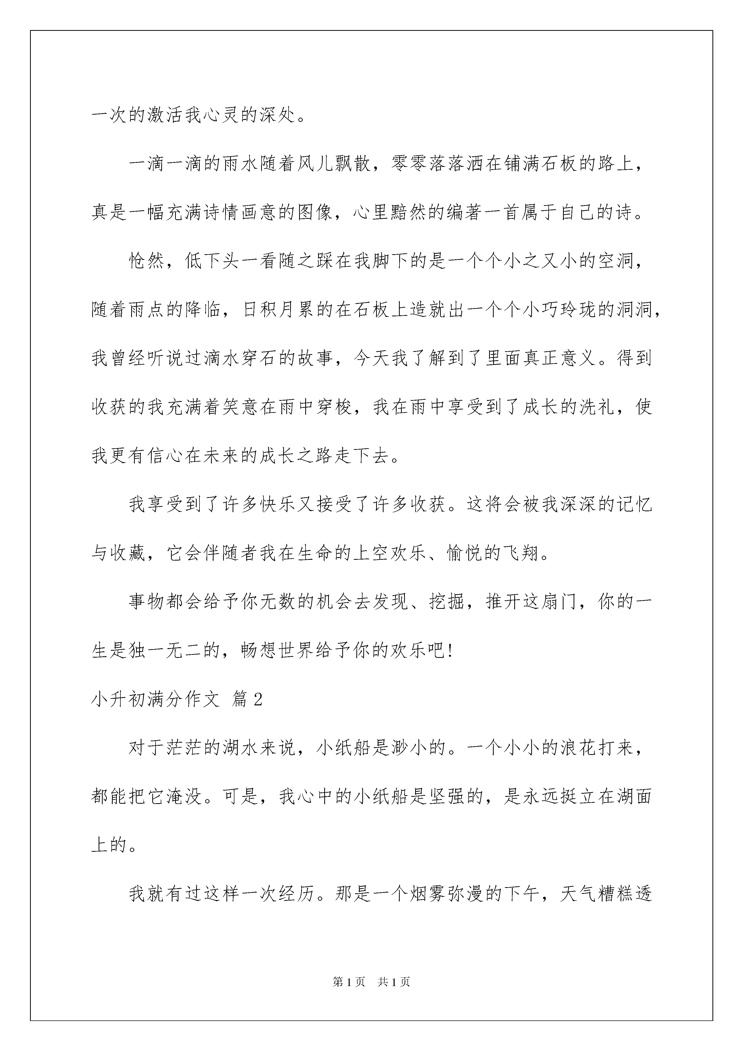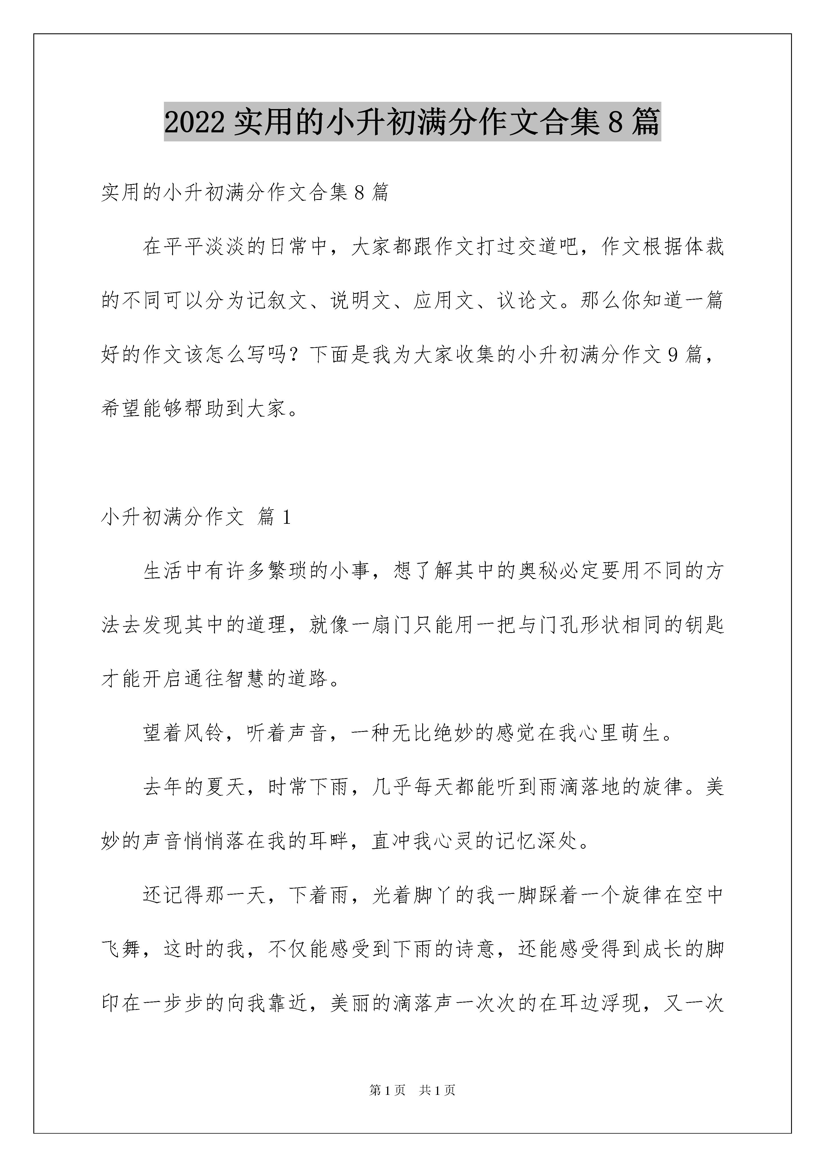 2022实用的小升初满分作文合集8篇实用的小升初满分作文合集8篇在平平淡淡的日常中,大家都跟作文打过交道吧,作文根据体裁的不同可以分为记叙文、说明文、应用文、议论文。那么你知道一篇好的作文该怎么写吗?下面是我为大家收集的小升初满分作文9篇,希望能够帮助到大家。小升初满分作文篇1生活中有许多繁琐的小事,想了解其中的奥秘必定要用不同的方法去发现其中的道理,就像一扇门只能用一把与门孔形状相同的钥匙才能开启通往智慧的道路。望着风铃,听着声音,一种无比绝妙的感觉在我心里萌生。去年的夏天,时常下雨,几乎每天都能听到雨滴落地的旋律。美妙的声音悄悄落在我的耳畔,直冲我心灵的记忆深处。还记得那一天,下着雨,光着脚丫的我一脚踩着一个旋律在空中飞舞,这时的我,不仅能感受到下雨的诗意,还能感受得到成长的脚印在一步步的向我靠近,美丽的滴落声一次次的在耳边浮现,又一次一次的激活我心灵的深处。一滴一滴的雨水随着风儿飘散,零零落落洒在铺满石板的路上,真是一幅充满诗情画意的图像,心里黯然的编著一首属于自己的诗。怆然,低下头一看随之踩在我脚下的是一个个小之又小的空洞,随着雨点的降临,日积月累的在石板上造就出一个个小巧玲珑的洞洞,我曾经听说过滴水穿石的故事,今天我了解到了里面真正意义。得到收获的我充满着笑意在雨中穿梭,我在雨中享受到了成长的洗礼,使我更有信心在未来的成长之路走下去。我享受到了许多快乐又接受了许多收获。这将会被我深深的记忆与收藏,它会伴随者我在生命的上空欢乐、愉悦的飞翔。事物都会给予你无数的机会去发现、挖掘,推开这扇门,你的一生是独一无二的,畅想世界给予你的欢乐吧!小升初满分作文篇2对于茫茫的湖水来说,小纸船是渺小的。一个小小的浪花打来,都能把它淹没。可是,我心中的小纸船是坚强的,是永远挺立在湖面上的。我就有过这样一次经历。那是一个烟雾弥漫的下午,天气糟糕透了。我在家呆不住,毫无目的地向前走着。顺着小路,来到一大片茫茫的湖水边,我停住了脚步。望着波光粼粼的湖面,水面泛起了涟漪,浪儿一层一层打来,冲击着路边的岩石。看着看着,我想起口袋里有一张空白的纸,眼前一亮,有了主意。“或许我可以让小纸船开始它第一次的旅行”我拿起刚折好的船儿自言自语,期待着这刺激的行动。我走到湖水边,把小纸船往湍急的湖水里轻轻一推,船儿乘风而行,轻风托着小纸船,在水面上漂呀,漂呀……这是,一个浪头打来,不偏不倚正好打中纸船儿,我闭上眼睛,不敢看眼前的一幕。过了片刻,我慢慢睁开眼睛,心扑通扑通的跳个不停。这是真的吗?我不敢相信自己的眼睛。小纸船竟安然无恙,依然挺立在水面上,向前冲刺着。无论什么困难都阻挡不了它的前进。一个小的不能再小的纸船竟能战胜汹涌的浪花,太不可思议了!这不是天意,靠的是那坚强、不屈服的精神。人生,是不可能一帆风顺的,总会有崎岖和坎坷阻挡你的前进。在这漫长的旅途中,需要的是勇气和不屈不挠的精神,就会战胜困难。不起眼的小纸船,你将会在湖面上永远挺立!小升初满分作文篇3一丝春风拂过了我的脸颊,空气中一股淡淡的清香立刻沁入心肺,我使劲的嗅了嗅鼻子,哦,你知道吗?春天也是有味道的!当树木的枝丫上探出点点的新绿时,赶早的柳树早已抽出长长的叶子了,香椿树顶着一簇簇紫色的嫩芽,散发着阵阵的幽香,啊,春天的树也是有味道的!早春的迎春花,一条条鹅黄的伸展着,报告着春天的到来,玉兰花也在树枝间绽放开来,白的、紫的,在阳光下散发着淡淡的清香。那不甘落后的桃花也满满的绽放了一树,空气中香气此起彼伏。再过几天大概樱花也会开放了,纷繁的花朵这儿一簇,那儿一朵,红的燃起“火焰”,粉的荡出“霞光”,白的飘溢清香。它们是美的使者,春的精灵,看到这么艳丽的花朵,闻到如此芬芳,大概不能不令人想到秋天那甘甜的果实了。大地也是绿色的,嫩草刚从土壤中钻出,细软轻柔,但很快的这儿一丝,那儿一簇,铺成绿的地毯,织成绿的锦绣,散发出青草特有的味道,使人禁不住想在这草地上打个滚,使劲嗅嗅这“碧绿”的味道呢。春雨来的真及时啊!一场春雨“润物细无声”,连泥土也被浸润的散发出缕缕的清香,弥漫不散,更别说那碧绿如翡翠的枝叶,娇艳如彩霞的花朵了,通通散发出了春天的味道!渔船回来了,餐桌上便多出了一盘鲜美的原汁原味的水煮小虾、喷香的鱼锅饼子……,真是让人回味无穷啊!农民伯伯早春的一把韭菜、一篮子菠菜,碧绿的让人垂涎欲滴……啊!这春天的味道!小升初满分作文篇4刘老师,运动会前,当您宣布要在班上挑选4名女生参加迎面接力赛时,我只觉得心跳突然加快,一股热血涌到脸上。我睁大眼睛望着您,我的眼神向您请求:给我一次机会吧!但我担心,您会首先剔除我,因为去年同学们说过,永远不要我参加接力