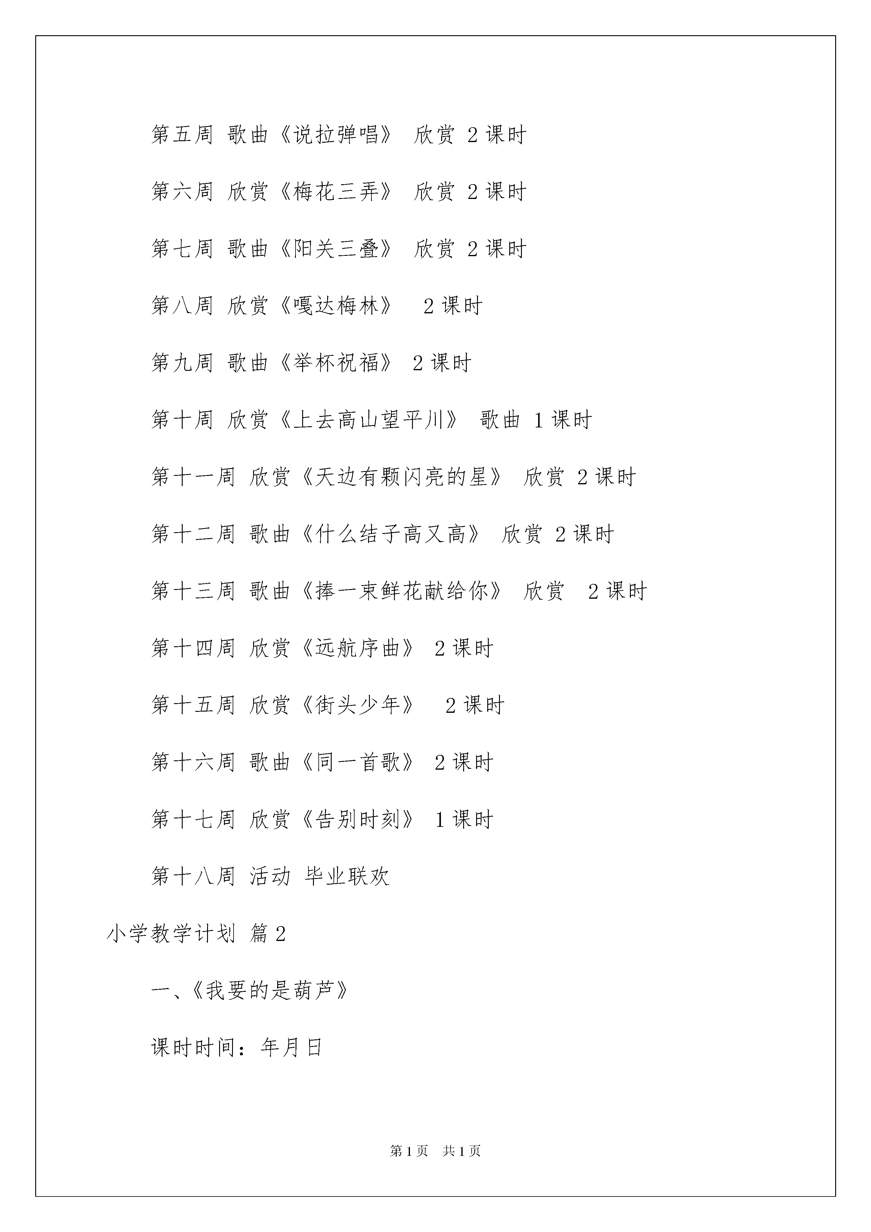 2022实用的小学教学计划范文集合5篇小学教学计划时间的脚步是无声的,它在不经意间流逝,很快就要开展新的工作了,此时此刻我们需要开始做一个计划。那么你真正懂得怎么写好计划吗?以下是我精心整理的小学教学计划5篇,供大家参考借鉴,希望可以帮助到有需要的朋友。小学教学计划篇1一、教材分析:从教育理念上,强调“以学生发展为本”以往的教材,往往从教师的“教”考虑较多,无论从教材内容的构件、教学方法的思路等等都强调以教师为主,很少考虑学生的学。它的理念是建立在“教学中心论”上,强调教师作为教育的主体,学生通过教师的教、传授去获取知识,因此学生往往处于被动的状态中学习。现代教育的理念,强调学生的学,以学生为本,教材组成员们通过学习,认识到要从持续发展、终身教育的视角去考虑问题,所以不仅是以学生为本,还要强调其发展,所以定为“以学生发展为本”的理念。二、学生知识能力分析:音乐教育要面对全体学生,也应当注意学生的个性发展音乐教育的目标之一就是要完善学生的个性。众所周知,学生的音乐能力都会因为先天的遗传因素和后天的教育条件不同而形成巨大的差异。我们六年级学生基础不是很好,因而其音乐兴趣、音乐潜能、音乐生活的方式也会有所不同。音乐本身的非语义性及音乐艺术的自由性和多样性,给接受者对音乐的多解性和个性化的演绎提供了广阔的舞台。三、教学目标1、演唱学习自然呼吸,不耸肩,养成良好习惯,注意咬字、吐字清晰准确,做到有表情唱歌。2、聆听欣赏优秀儿童歌曲,初步感受活泼、雄壮、优美抒情等不同歌曲和乐器。3、合唱学习多声部歌曲,做到音准、和协、动听。4、识谱认识反复记号等以及练习多种节奏类型。四、教学要求:1、突出音乐学科特点,把德育教育与音乐教育相结合。2、启迪智慧,陶冶情操,培养审美情趣,使身心得到健康发展。3、使学生掌握浅显音乐知识和简单音乐技能,培养对音乐的兴趣和爱好。4、了解中外优秀音乐作品,使学生具有初步感受音乐和表现音乐的能力。五、教学重点:学唱歌曲聆听音乐六、教学方法:兴趣是最好的老师.兴趣是最好的老师,把激发学生学习音乐的兴趣贯穿于始终。在组织音乐教学活动时,都应充分挖掘音乐作品的艺术内容和情感内涵,发挥音乐作品的艺术魅力,创造性地设计生动活泼的教学形式,以激发、培养、发展学生的音乐兴趣及爱好。七、教学进度第一周预习课本第二周歌曲《爱的奉献》欣赏《欢乐颂》2课时第三周歌曲《歌声与微笑》欣赏《爱星满天>2课时第四周欣赏《重整河山待后生》欣赏2课时第五周歌曲《说拉弹唱》欣赏2课时第六周欣赏《梅花三弄》欣赏2课时第七周歌曲《阳关三叠》欣赏2课时第八周欣赏《嘎达梅林》2课时第九周歌曲《举杯祝福》2课时第十周欣赏《上去高山望平川》歌曲1课时第十一周欣赏《天边有颗闪亮的星》欣赏2课时第十二周歌曲《什么结子高又高》欣赏2课时第十三周歌曲《捧一束鲜花献给你》欣赏2课时第十四周欣赏《远航序曲》2课时第十五周欣赏《街头少年》2课时第十六周歌曲《同一首歌》2课时第十七周欣赏《告别时刻》1课时第十八周活动毕业联欢小学教学计划篇2一、《我要的是葫芦》课时时间:年月日课题:我要的是葫芦教学目标:会认6个生字,语文三册教案。会写8个字。教学重点难点正确、流利、有感情地朗读课文,体会反问句、感叹句与陈述句的不同语气。课时分配一课时教法合作学习、探究教具生字卡片教学挂图教学过程一、导入:1、认识"葫芦"两个生字。告诉学生"芦"在"葫芦"一词中读轻声2、今天我们来学习一个故事名字叫《我要的是葫芦》,小朋友读了课题知道了什么想知道什么呢?指名说。这个故事讲的就是一个人种了葫芦,这颗葫芦长得什么样呢/请小朋友们自已读故事,看和你想的一样不一样。二、初读课文、识字学词1、观察课文插图,认识"藤"字。观察课文插图中的人物,出示"哇"、"盯"。2、自读课文,自学字词。(1)初读课文,画出生字,借助拼音读准字音。(2)同桌互相交流记字方法。(3)找出带生字的句子来读,要求读通顺。3、生字的巩固。(1)巩固会认的字。我会读:细长的葫芦藤雪白的葫芦花可爱的小葫芦我会找:哇-(蛙)-(娃)-(洼)盯-(丁)-(顶)(2)巩固会写的字。个人加减谁读得准?言每治棵挂哇怪慢谁会发现?同结构的字:治、棵、挂、哇、怪、慢同偏旁的字:怪、慢同部件的字:挂、哇谁会看?(观察老师范写,说说写这些字时要注意什么。)左窄右宽的字:治、棵、挂、哇、怪、慢从上到下的字:言、每谁写得好?学生练写,互相评价。重点讲解:"挂、哇"二字右边的"圭",是由上下两个"土"字组成的;"言"字第一横长,下面两横短;"每"字的笔顺。三、朗读感悟1、自读课文,注意读准字音,找出描写这两幅