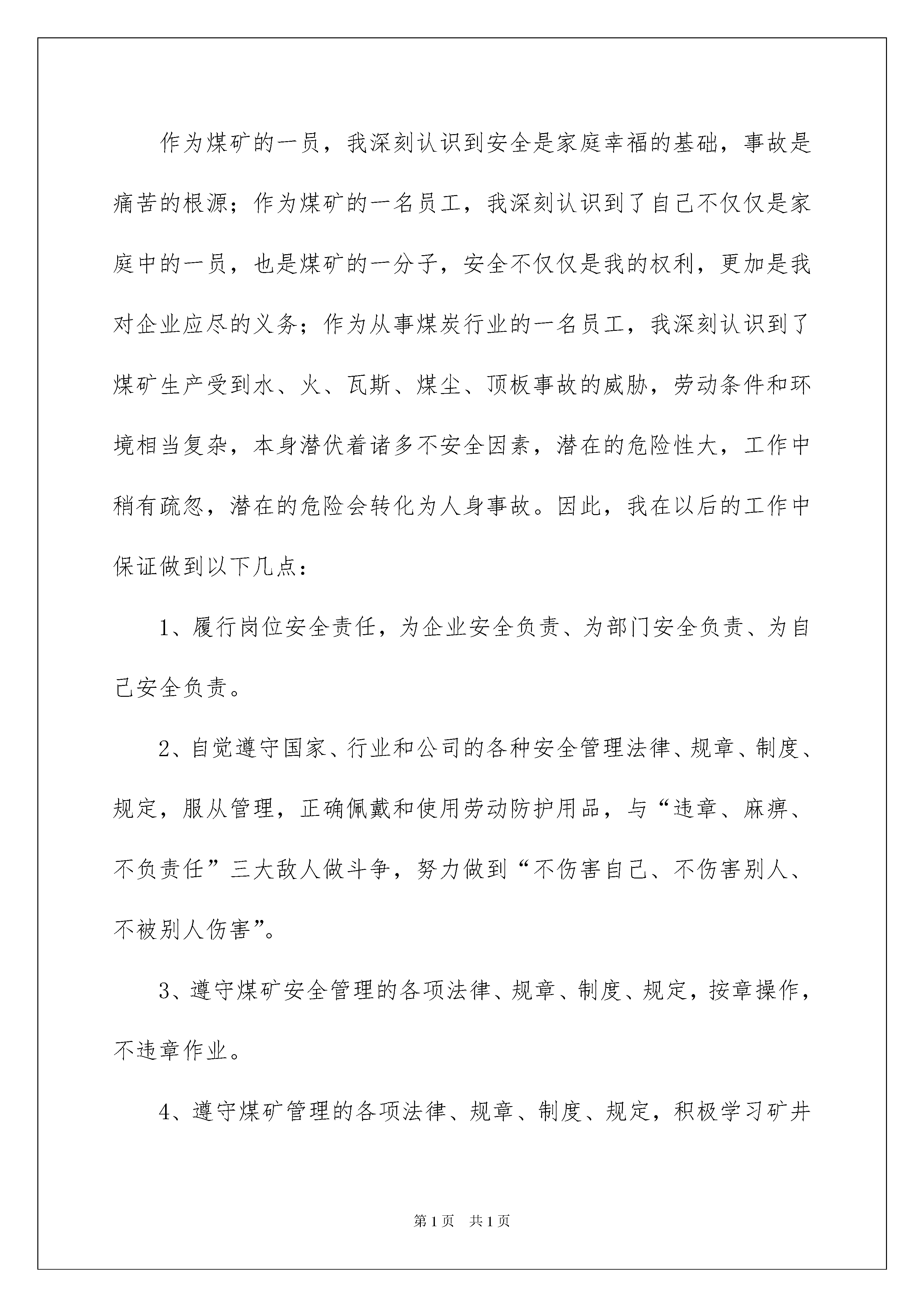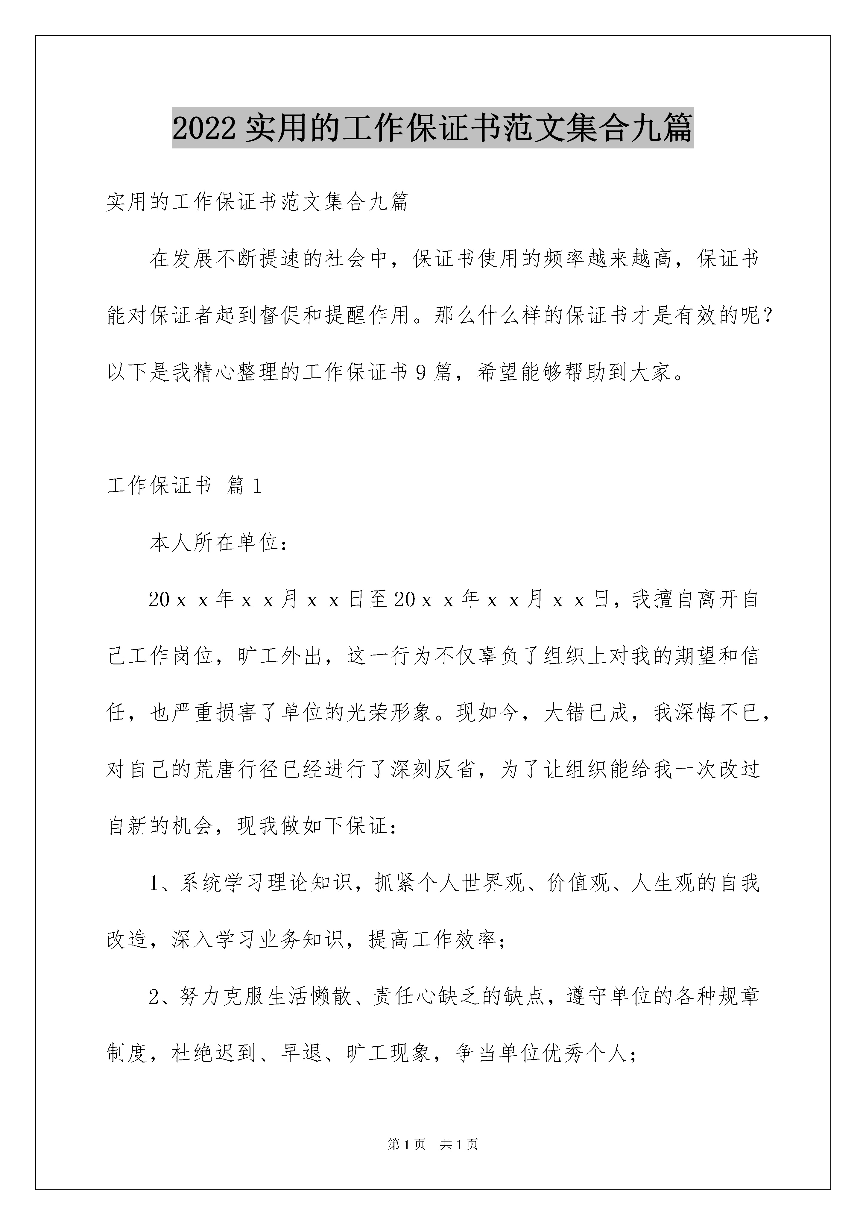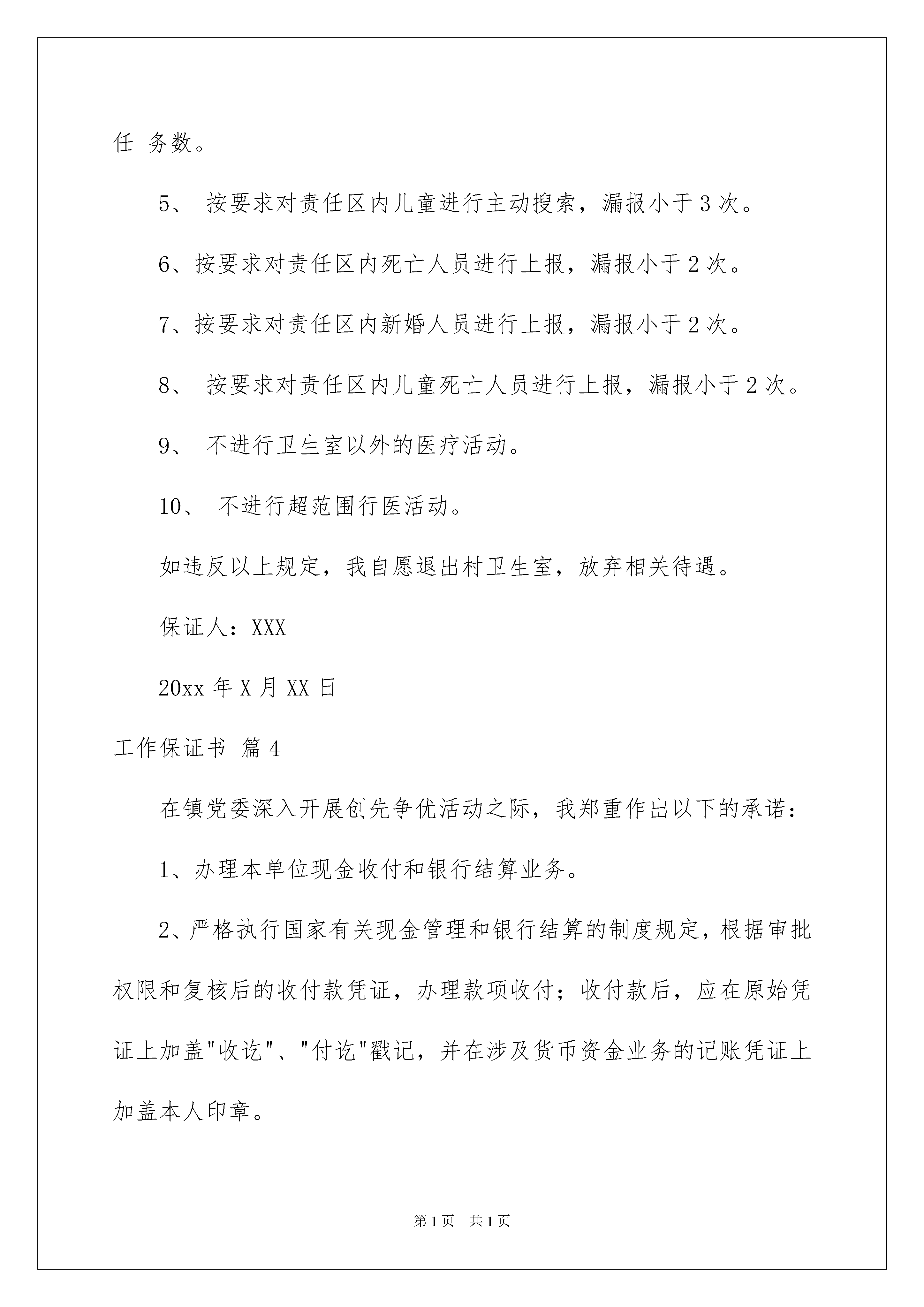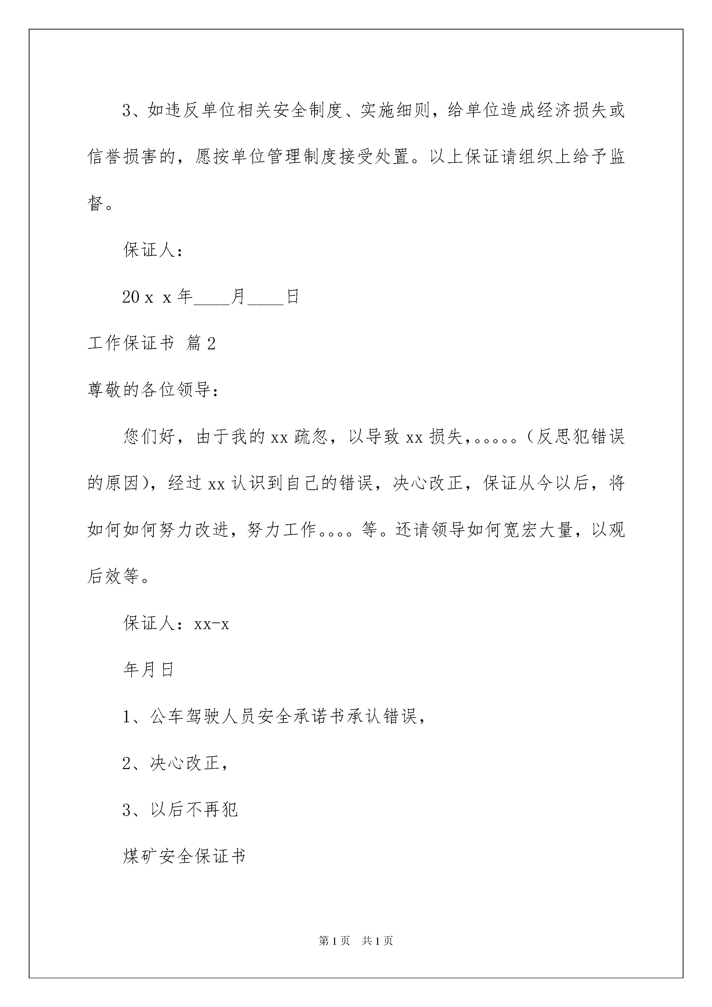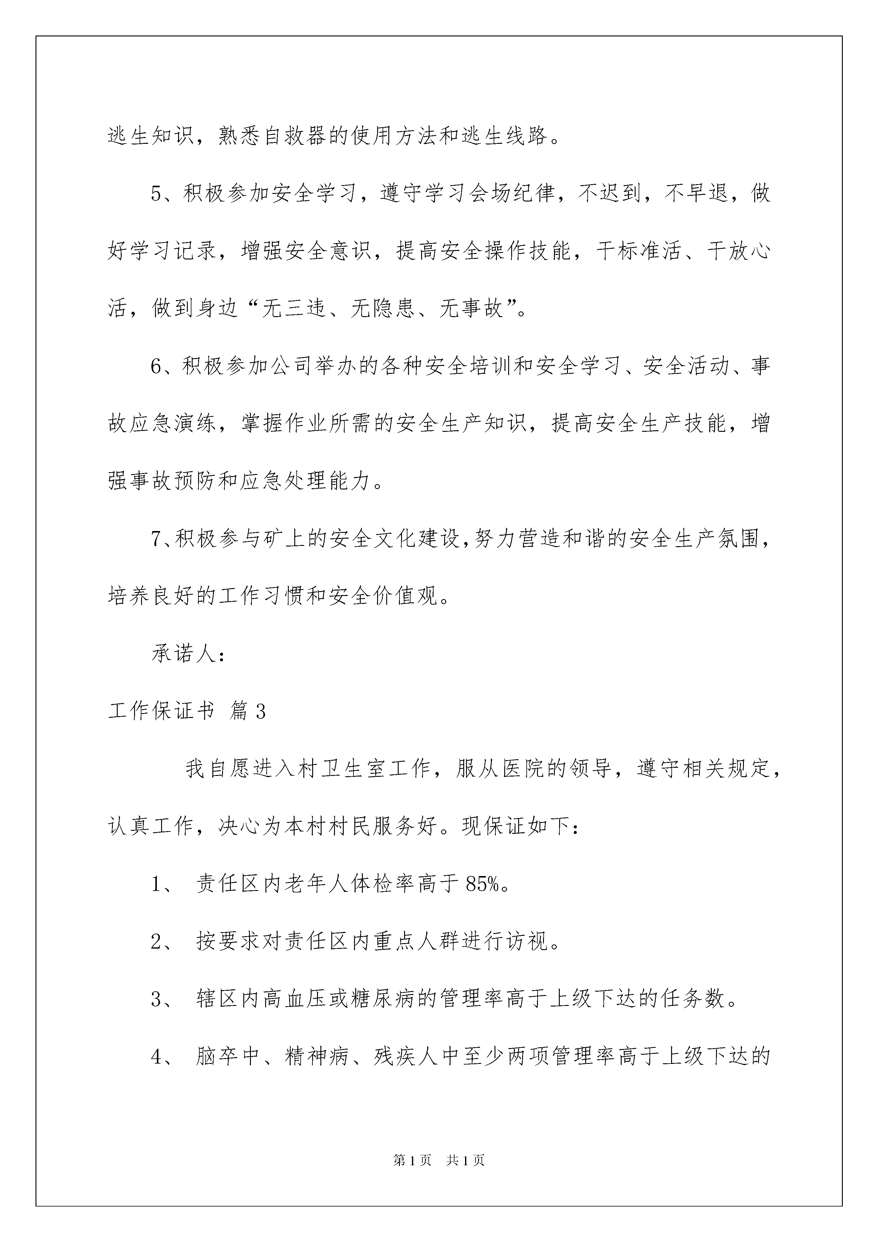 2022实用的工作保证书范文集合九篇实用的工作保证书范文集合九篇在发展不断提速的社会中,保证书使用的频率越来越高,保证书能对保证者起到督促和提醒作用。那么什么样的保证书才是有效的呢?以下是我精心整理的工作保证书9篇,希望能够帮助到大家。工作保证书篇1本人所在单位:20xx年xx月xx日至20xx年xx月xx日,我擅自离开自己工作岗位,旷工外出,这一行为不仅辜负了组织上对我的期望和信任,也严重损害了单位的光荣形象。现如今,大错已成,我深悔不已,对自己的荒唐行径已经进行了深刻反省,为了让组织能给我一次改过自新的机会,现我做如下保证:1、系统学习理论知识,抓紧个人世界观、价值观、人生观的自我改造,深入学习业务知识,提高工作效率;2、努力克服生活懒散、责任心缺乏的缺点,遵守单位的各种规章制度,杜绝迟到、早退、旷工现象,争当单位优秀个人;3、如违反单位相关安全制度、实施细则,给单位造成经济损失或信誉损害的,愿按单位管理制度接受处置。以上保证请组织上给予监督。保证人:20xx年____月____日工作保证书篇2尊敬的各位领导:您们好,由于我的xx疏忽,以导致xx损失,。。。。。(反思犯错误的原因),经过xx认识到自己的错误,决心改正,保证从今以后,将如何如何努力改进,努力工作。。。。等。还请领导如何宽宏大量,以观后效等。保证人:xx-x年月日1、公车驾驶人员安全承诺书承认错误,2、决心改正,3、以后不再犯煤矿安全保证书作为煤矿的一员,我深刻认识到安全是家庭幸福的基础,事故是痛苦的根源;作为煤矿的一名员工,我深刻认识到了自己不仅仅是家庭中的一员,也是煤矿的一分子,安全不仅仅是我的权利,更加是我对企业应尽的义务;作为从事煤炭行业的一名员工,我深刻认识到了煤矿生产受到水、火、瓦斯、煤尘、顶板事故的威胁,劳动条件和环境相当复杂,本身潜伏着诸多不安全因素,潜在的危险性大,工作中稍有疏忽,潜在的危险会转化为人身事故。因此,我在以后的工作中保证做到以下几点:1、履行岗位安全责任,为企业安全负责、为部门安全负责、为自己安全负责。2、自觉遵守国家、行业和公司的各种安全管理法律、规章、制度、规定,服从管理,正确佩戴和使用劳动防护用品,与“违章、麻痹、不负责任”三大敌人做斗争,努力做到“不伤害自己、不伤害别人、不被别人伤害”。3、遵守煤矿安全管理的各项法律、规章、制度、规定,按章操作,不违章作业。4、遵守煤矿管理的各项法律、规章、制度、规定,积极学习矿井逃生知识,熟悉自救器的使用方法和逃生线路。5、积极参加安全学习,遵守学习会场纪律,不迟到,不早退,做好学习记录,增强安全意识,提高安全操作技能,干标准活、干放心活,做到身边“无三违、无隐患、无事故”。6、积极参加公司举办的各种安全培训和安全学习、安全活动、事故应急演练,掌握作业所需的安全生产知识,提高安全生产技能,增强事故预防和应急处理能力。7、积极参与矿上的安全文化建设,努力营造和谐的安全生产氛围,培养良好的工作习惯和安全价值观。承诺人:工作保证书篇3我自愿进入村卫生室工作,服从医院的领导,遵守相关规定,认真工作,决心为本村村民服务好。现保证如下:1、责任区内老年人体检率高于85%。2、按要求对责任区内重点人群进行访视。3、辖区内高血压或糖尿病的管理率高于上级下达的任务数。4、脑卒中、精神病、残疾人中至少两项管理率高于上级下达的任务数。5、按要求对责任区内儿童进行主动搜索,漏报小于3次。6、按要求对责任区内死亡人员进行上报,漏报小于2次。7、按要求对责任区内新婚人员进行上报,漏报小于2次。8、按要求对责任区内儿童死亡人员进行上报,漏报小于2次。9、不进行卫生室以外的医疗活动。10、不进行超范围行医活动。如违反以上规定,我自愿退出村卫生室,放弃相关待遇。保证人:XXX20xx年X月XX日工作保证书篇4在镇党委深入开展创先争优活动之际,我郑重作出以下的承诺:1、办理本单位现金收付和银行结算业务。2、严格执行国家有关现金管理和银行结算的制度规定,根据审批权限和复核后的收付款凭证,办理款项收付;收付款后,应在原始凭证上加盖"收讫"、"付讫"戳记,并在涉及货币资金业务的记账凭证上加盖本人印章。3、有库存现金的,库存现金不得超过限额,不得"白条抵库",不得挪用现金。4、不准签发空白支票,因特殊情况确需签发不填金额的支票时,必须经本部门负责人批准,在支票上写明收款单位、款项用途、签发日期及用款限额,并由领用人在设立的《银行票据购买、使用登记表》上登记;逾期未用的.空白支票应及时收回,不得将空白支票交给其他单位和个人签发;填写错误的支票,必须加盖"作废"戳记,与存根一并