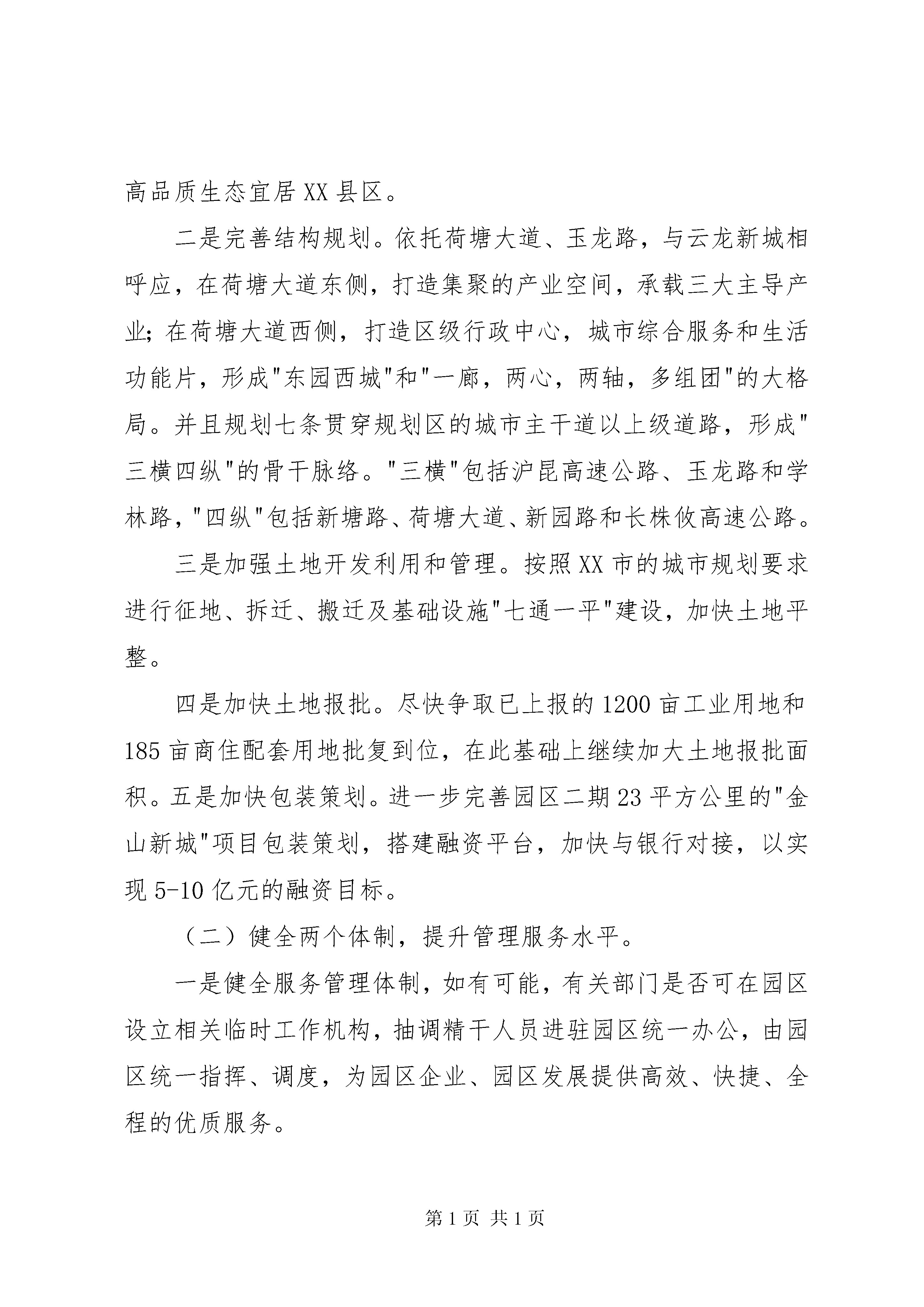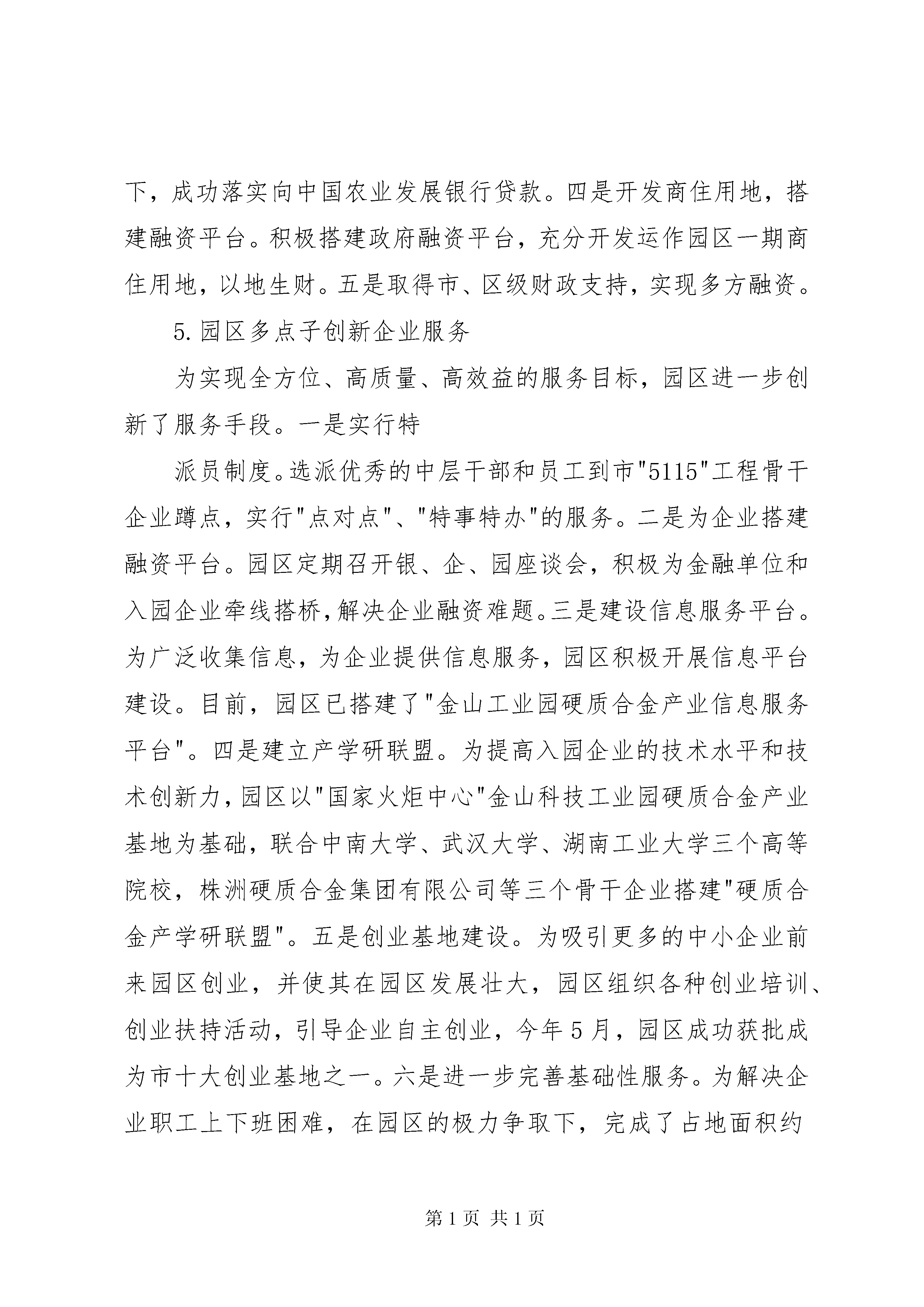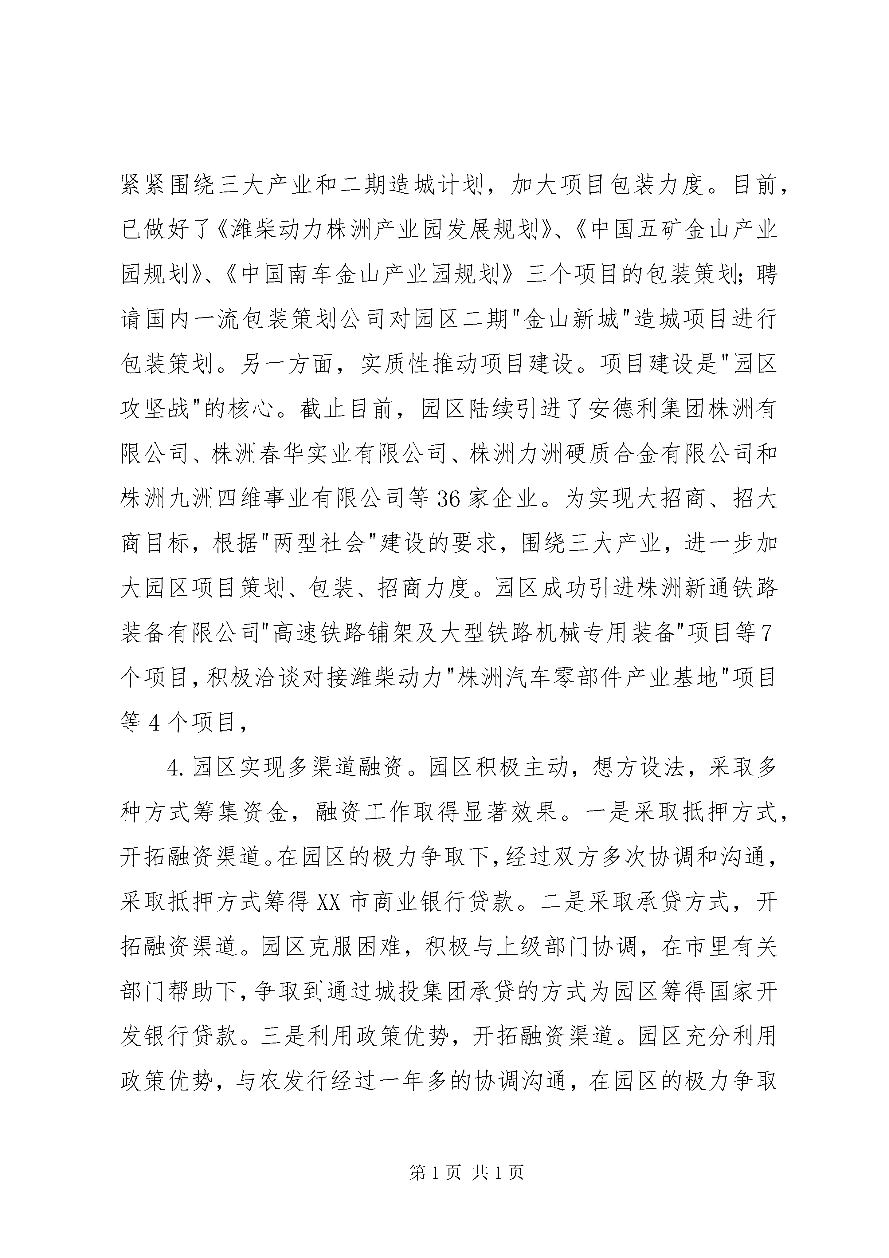 关于阳平芳畈工业园建设与发展的调研报告[范文]关于加快金山工业园建设的调研报告一、园区发展现状株洲金山科技工业园始建于2003年,是国家火炬计划硬质合金特色产业基地和国家高技术产业基地株洲新材料产业园,同时也是今年XX市园区攻坚战的主战场之一。金山科技工业园总规划面积近30平方公里(一期6.96平方公里、二期约23平方公里)。园区以三大产业为支柱产业,即硬质合金产业、轨道交通装备及工程机械产业、汽车及零部件产业。1.园区企业经济效益明显提升。截至2010年上半年,园区引进企业36家,已投产19家,在建4家,工业园完成固定资产投资103867.44万元。涉及汽车及零部件、轨道交通装备、钨钼铅锌精加工、交流及电子信息等行业。累计实现税收42870.41万元,其中2009年末实现税收4103万元。2.园区基础设施建设富有成效。至2010年上半年,园区完成基础建设总投资45808.94万元。其中,实际征用土地900亩,目前在征280亩,待征165亩;硬化道路4条,2000米;铺设给、排水管道2000米;栽植路旁、空地树木1800棵;草坪10200平方米;安装路灯310盏;建设标准厂房100000平方米。3.园区项目建设如火如荼。一方面,大手笔包装项目。园区紧紧围绕三大产业和二期造城计划,加大项目包装力度。目前,已做好了《潍柴动力株洲产业园发展规划》、《中国五矿金山产业园规划》、《中国南车金山产业园规划》三个项目的包装策划;聘请国内一流包装策划公司对园区二期"金山新城"造城项目进行包装策划。另一方面,实质性推动项目建设。项目建设是"园区攻坚战"的核心。截止目前,园区陆续引进了安德利集团株洲有限公司、株洲春华实业有限公司、株洲力洲硬质合金有限公司和株洲九洲四维事业有限公司等36家企业。为实现大招商、招大商目标,根据"两型社会"建设的要求,围绕三大产业,进一步加大园区项目策划、包装、招商力度。园区成功引进株洲新通铁路装备有限公司"高速铁路铺架及大型铁路机械专用装备"项目等7个项目,积极洽谈对接潍柴动力"株洲汽车零部件产业基地"项目等4个项目,4.园区实现多渠道融资。园区积极主动,想方设法,采取多种方式筹集资金,融资工作取得显著效果。一是采取抵押方式,开拓融资渠道。在园区的极力争取下,经过双方多次协调和沟通,采取抵押方式筹得XX市商业银行贷款。二是采取承贷方式,开拓融资渠道。园区克服困难,积极与上级部门协调,在市里有关部门帮助下,争取到通过城投集团承贷的方式为园区筹得国家开发银行贷款。三是利用政策优势,开拓融资渠道。园区充分利用政策优势,与农发行经过一年多的协调沟通,在园区的极力争取下,成功落实向中国农业发展银行贷款。四是开发商住用地,搭建融资平台。积极搭建政府融资平台,充分开发运作园区一期商住用地,以地生财。五是取得市、区级财政支持,实现多方融资。5.园区多点子创新企业服务为实现全方位、高质量、高效益的服务目标,园区进一步创新了服务手段。一是实行特派员制度。选派优秀的中层干部和员工到市"5115"工程骨干企业蹲点,实行"点对点"、"特事特办"的服务。二是为企业搭建融资平台。园区定期召开银、企、园座谈会,积极为金融单位和入园企业牵线搭桥,解决企业融资难题。三是建设信息服务平台。为广泛收集信息,为企业提供信息服务,园区积极开展信息平台建设。目前,园区已搭建了"金山工业园硬质合金产业信息服务平台"。四是建立产学研联盟。为提高入园企业的技术水平和技术创新力,园区以"国家火炬中心"金山科技工业园硬质合金产业基地为基础,联合中南大学、武汉大学、湖南工业大学三个高等院校,株洲硬质合金集团有限公司等三个骨干企业搭建"硬质合金产学研联盟"。五是创业基地建设。为吸引更多的中小企业前来园区创业,并使其在园区发展壮大,园区组织各种创业培训、创业扶持活动,引导企业自主创业,今年5月,园区成功获批成为市十大创业基地之一。六是进一步完善基础性服务。为解决企业职工上下班困难,在园区的极力争取下,完成了占地面积约5000平方米的公交首末站建设。二、存在的问题近几年,我区虽然在工业园区发展上做了许多工作,取得了一些成绩,但是与先进园区相比,还存在有一定差距,主要体现在以下几个方面:一是缺乏有利政策支持,园区功能不够完善,影响了园区建设的质量和效率,制约了园区更好发展。二是融资难题仍然存在,财政对园区建设和发展经费的支持力度有限,银行部门也缺乏对园区发展的专项贷款支持。三是征地拆迁难,征地费用高,失地农民安置问题难以保障,用地指标受到严格控制,审批时间长,导致项目建设用地供需矛盾突出。三、对策及建议围绕"上档次,上规模,大发展"战略思想,2010年的金山科技工业园工作目标是,力争完成基础设施建设投资1亿元,完成园区招商5亿元,实现项目落地4个,项目完成