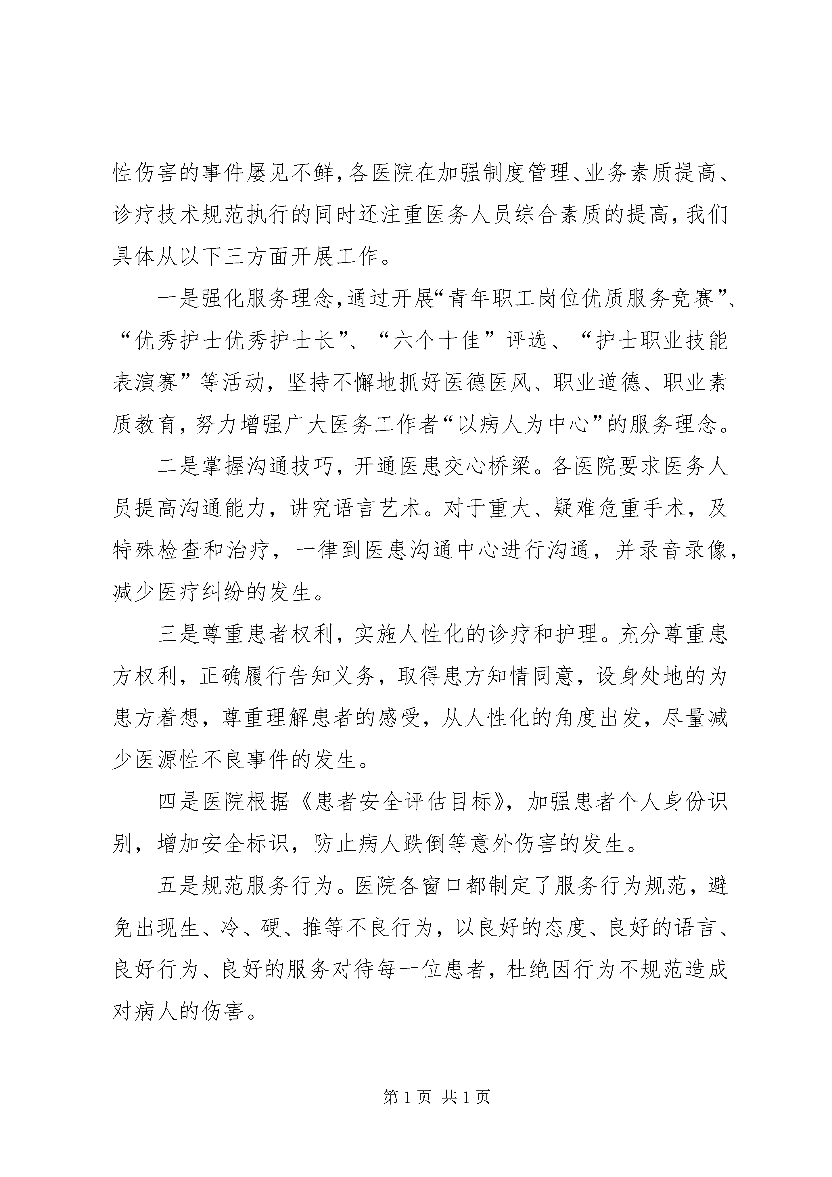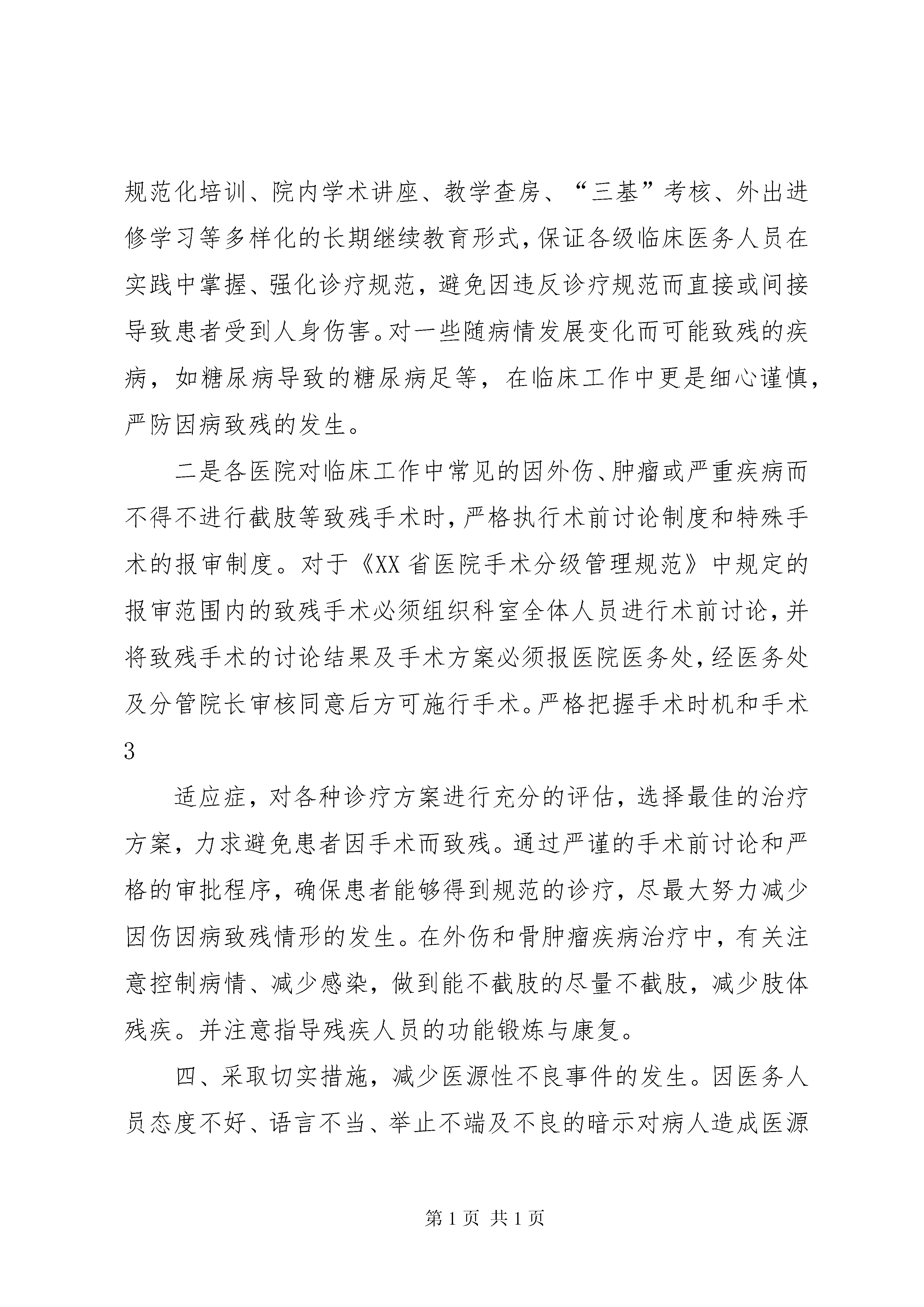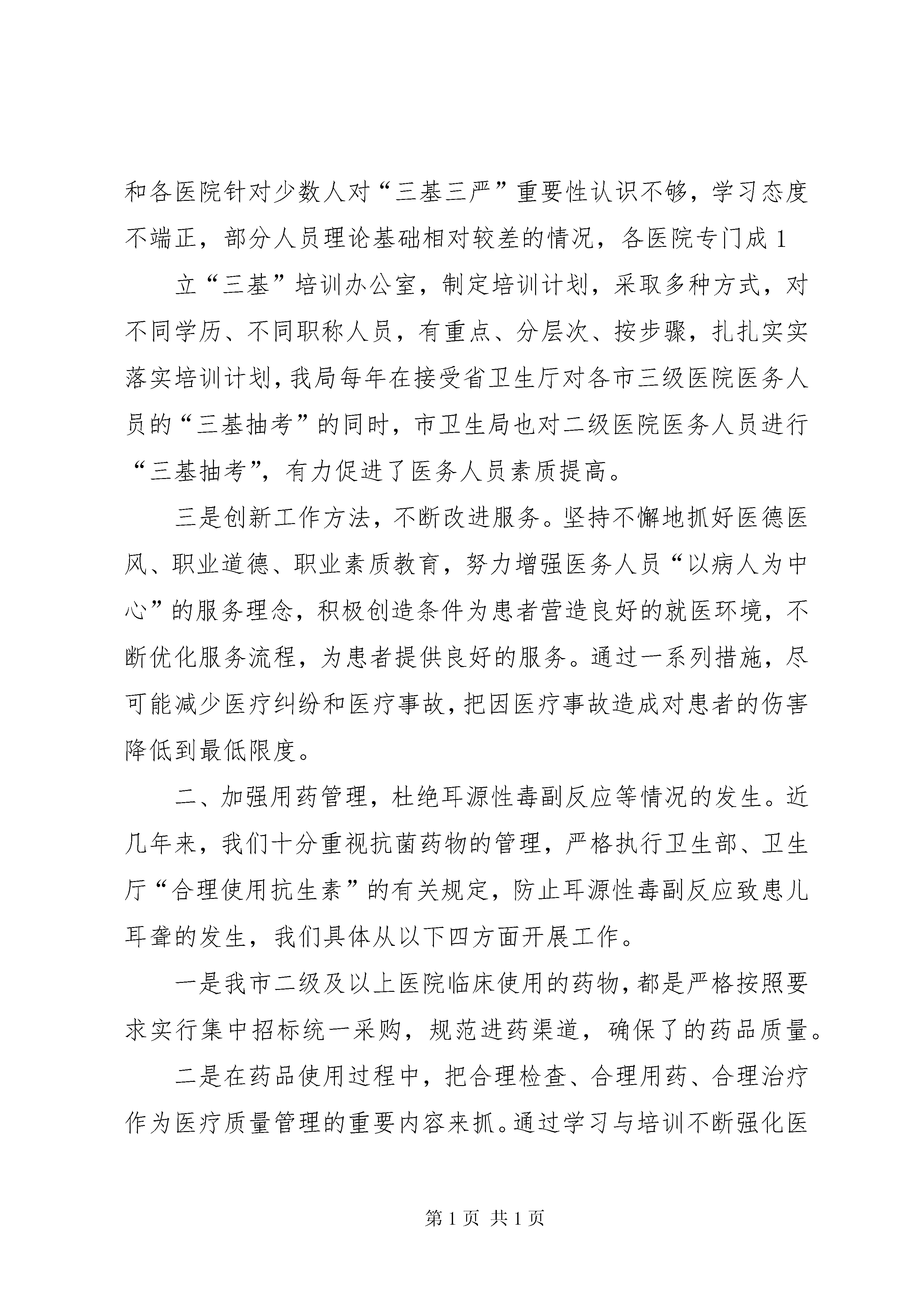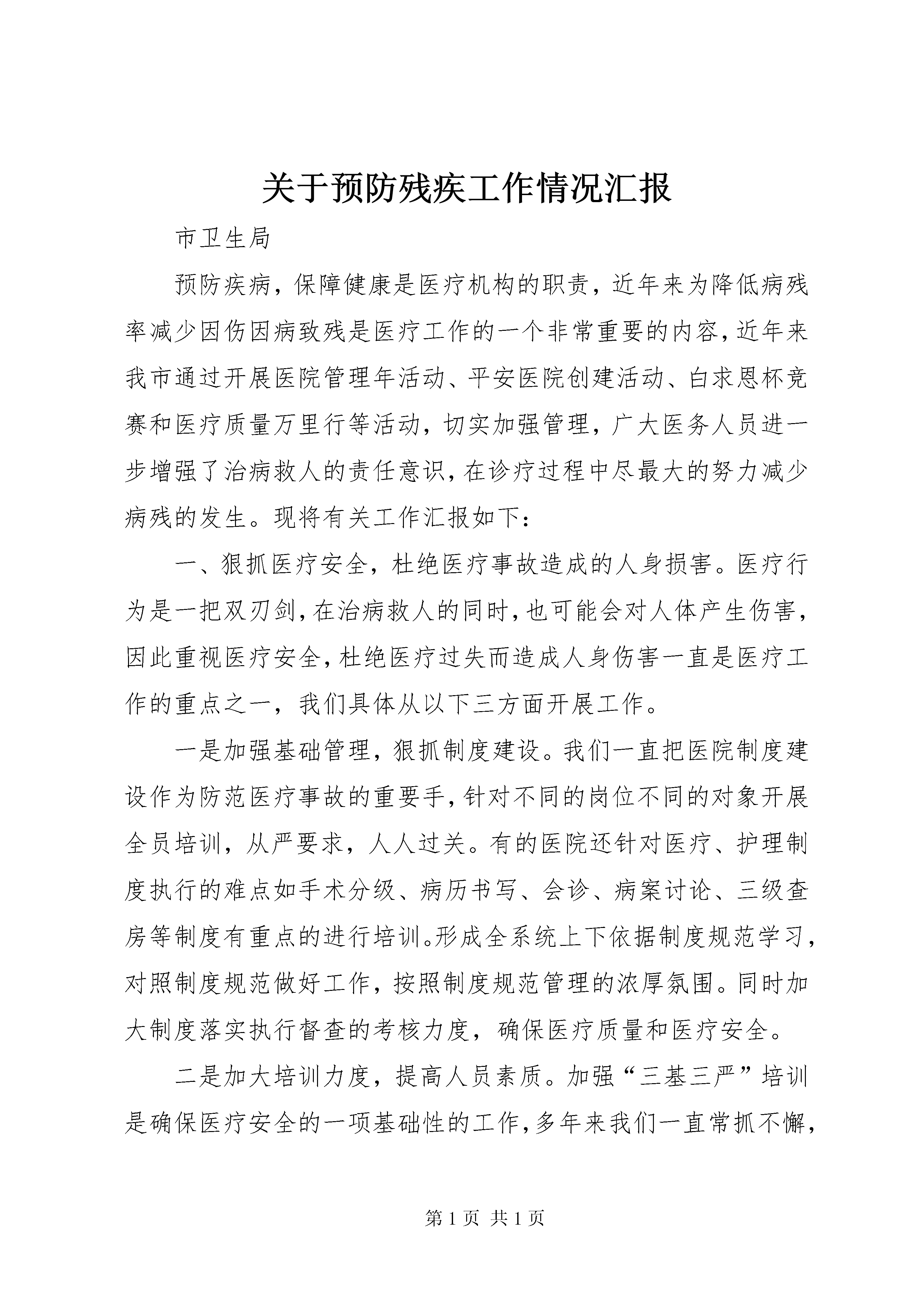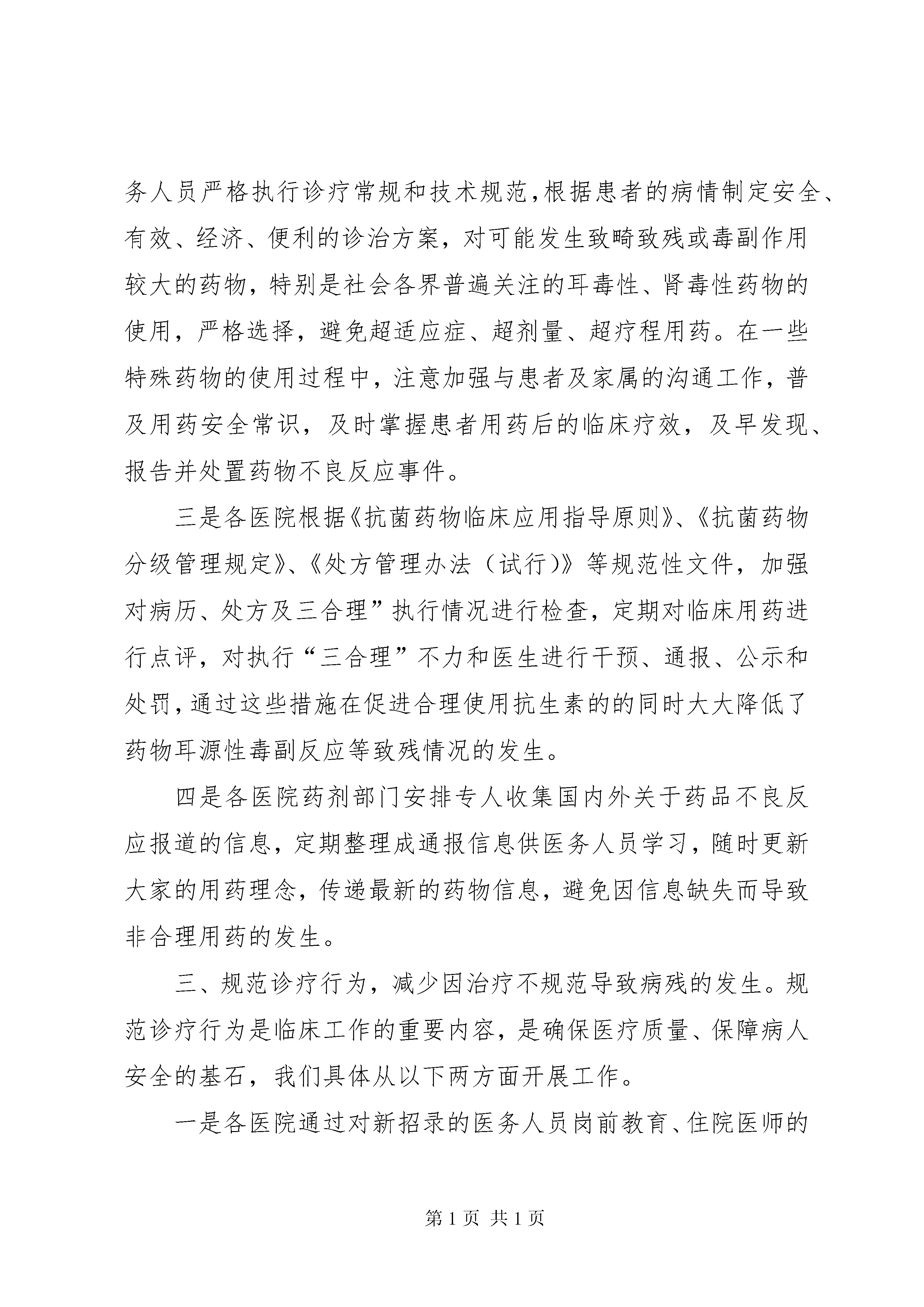 关于预防残疾工作情况汇报市卫生局预防疾病,保障健康是医疗机构的职责,近年来为降低病残率减少因伤因病致残是医疗工作的一个非常重要的内容,近年来我市通过开展医院管理年活动、平安医院创建活动、白求恩杯竞赛和医疗质量万里行等活动,切实加强管理,广大医务人员进一步增强了治病救人的责任意识,在诊疗过程中尽最大的努力减少病残的发生。现将有关工作汇报如下:一、狠抓医疗安全,杜绝医疗事故造成的人身损害。医疗行为是一把双刃剑,在治病救人的同时,也可能会对人体产生伤害,因此重视医疗安全,杜绝医疗过失而造成人身伤害一直是医疗工作的重点之一,我们具体从以下三方面开展工作。一是加强基础管理,狠抓制度建设。我们一直把医院制度建设作为防范医疗事故的重要手,针对不同的岗位不同的对象开展全员培训,从严要求,人人过关。有的医院还针对医疗、护理制度执行的难点如手术分级、病历书写、会诊、病案讨论、三级查房等制度有重点的进行培训。形成全系统上下依据制度规范学习,对照制度规范做好工作,按照制度规范管理的浓厚氛围。同时加大制度落实执行督查的考核力度,确保医疗质量和医疗安全。二是加大培训力度,提高人员素质。加强“三基三严”培训是确保医疗安全的一项基础性的工作,多年来我们一直常抓不懈,和各医院针对少数人对“三基三严”重要性认识不够,学习态度不端正,部分人员理论基础相对较差的情况,各医院专门成1立“三基”培训办公室,制定培训计划,采取多种方式,对不同学历、不同职称人员,有重点、分层次、按步骤,扎扎实实落实培训计划,我局每年在接受省卫生厅对各市三级医院医务人员的“三基抽考”的同时,市卫生局也对二级医院医务人员进行“三基抽考”,有力促进了医务人员素质提高。三是创新工作方法,不断改进服务。坚持不懈地抓好医德医风、职业道德、职业素质教育,努力增强医务人员“以病人为中心”的服务理念,积极创造条件为患者营造良好的就医环境,不断优化服务流程,为患者提供良好的服务。通过一系列措施,尽可能减少医疗纠纷和医疗事故,把因医疗事故造成对患者的伤害降低到最低限度。二、加强用药管理,杜绝耳源性毒副反应等情况的发生。近几年来,我们十分重视抗菌药物的管理,严格执行卫生部、卫生厅“合理使用抗生素”的有关规定,防止耳源性毒副反应致患儿耳聋的发生,我们具体从以下四方面开展工作。一是我市二级及以上医院临床使用的药物,都是严格按照要求实行集中招标统一采购,规范进药渠道,确保了的药品质量。二是在药品使用过程中,把合理检查、合理用药、合理治疗作为医疗质量管理的重要内容来抓。通过学习与培训不断强化医务人员严格执行诊疗常规和技术规范,根据患者的病情制定安全、有效、经济、便利的诊治方案,对可能发生致畸致残或毒副作用较大的药物,特别是社会各界普遍关注的耳毒性、肾毒性药物的使用,严格选择,避免超适应症、超剂量、超疗程用药。在一些特殊药物的使用过程中,注意加强与患者及家属的沟通工作,普及用药安全常识,及时掌握患者用药后的临床疗效,及早发现、报告并处置药物不良反应事件。三是各医院根据《抗菌药物临床应用指导原则》、《抗菌药物分级管理规定》、《处方管理办法(试行)》等规范性文件,加强对病历、处方及三合理”执行情况进行检查,定期对临床用药进行点评,对执行“三合理”不力和医生进行干预、通报、公示和处罚,通过这些措施在促进合理使用抗生素的的同时大大降低了药物耳源性毒副反应等致残情况的发生。四是各医院药剂部门安排专人收集国内外关于药品不良反应报道的信息,定期整理成通报信息供医务人员学习,随时更新大家的用药理念,传递最新的药物信息,避免因信息缺失而导致非合理用药的发生。三、规范诊疗行为,减少因治疗不规范导致病残的发生。规范诊疗行为是临床工作的重要内容,是确保医疗质量、保障病人安全的基石,我们具体从以下两方面开展工作。一是各医院通过对新招录的医务人员岗前教育、住院医师的规范化培训、院内学术讲座、教学查房、“三基”考核、外出进修学习等多样化的长期继续教育形式,保证各级临床医务人员在实践中掌握、强化诊疗规范,避免因违反诊疗规范而直接或间接导致患者受到人身伤害。对一些随病情发展变化而可能致残的疾病,如糖尿病导致的糖尿病足等,在临床工作中更是细心谨慎,严防因病致残的发生。二是各医院对临床工作中常见的因外伤、肿瘤或严重疾病而不得不进行截肢等致残手术时,严格执行术前讨论制度和特殊手术的报审制度。对于《XX省医院手术分级管理规范》中规定的报审范围内的致残手术必须组织科室全体人员进行术前讨论,并将致残手术的讨论结果及手术方案必须报医院医务处,经医务处及分管院长审核同意后方可施行手术。严格把握手术时机和手术3适应症,对各种诊疗方案进行充分的评估,选择最佳的治疗方案,力求避免患者因手术而致残。通过严谨的手术前讨论和严格的审批程序,确保患者能够得到规