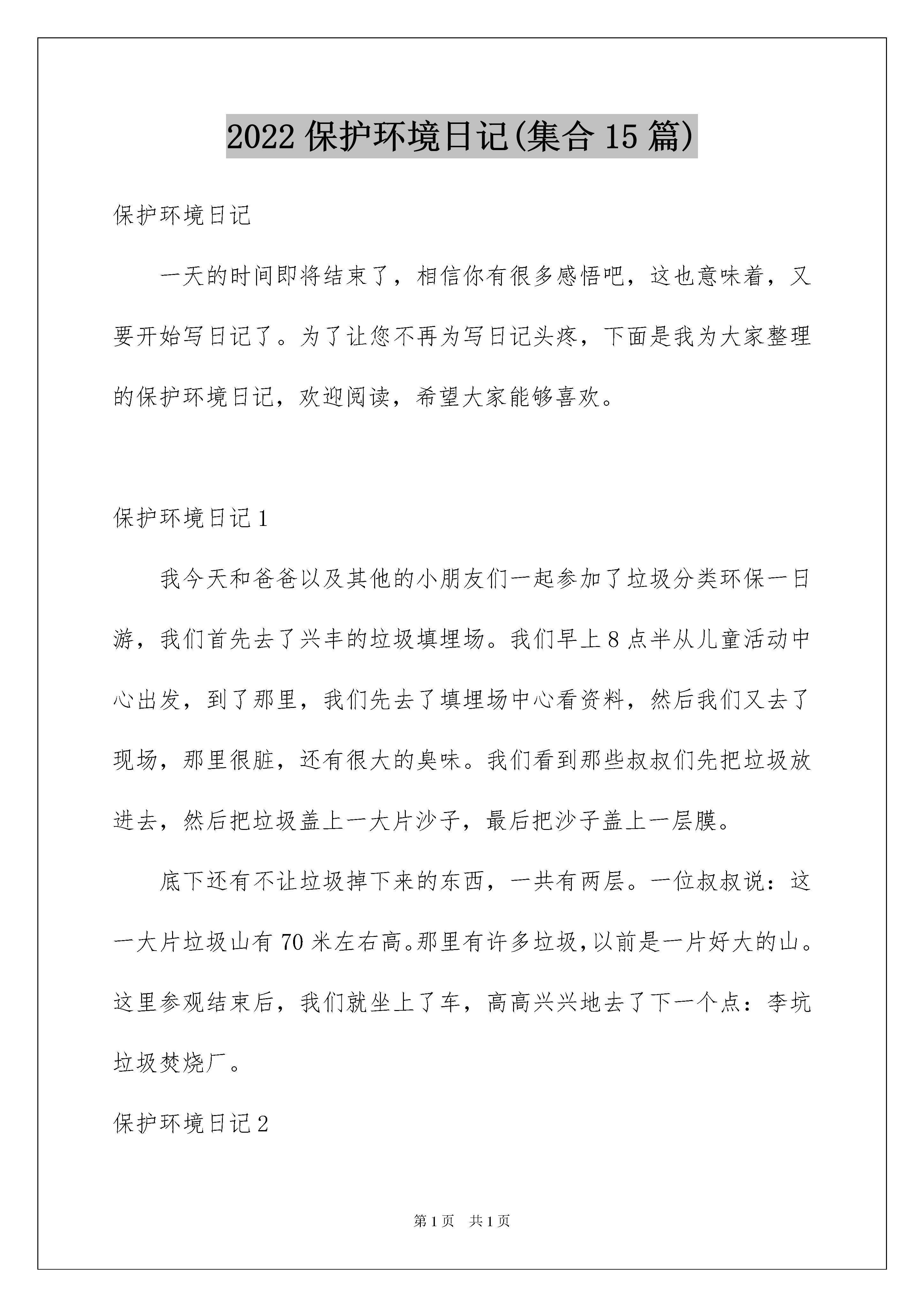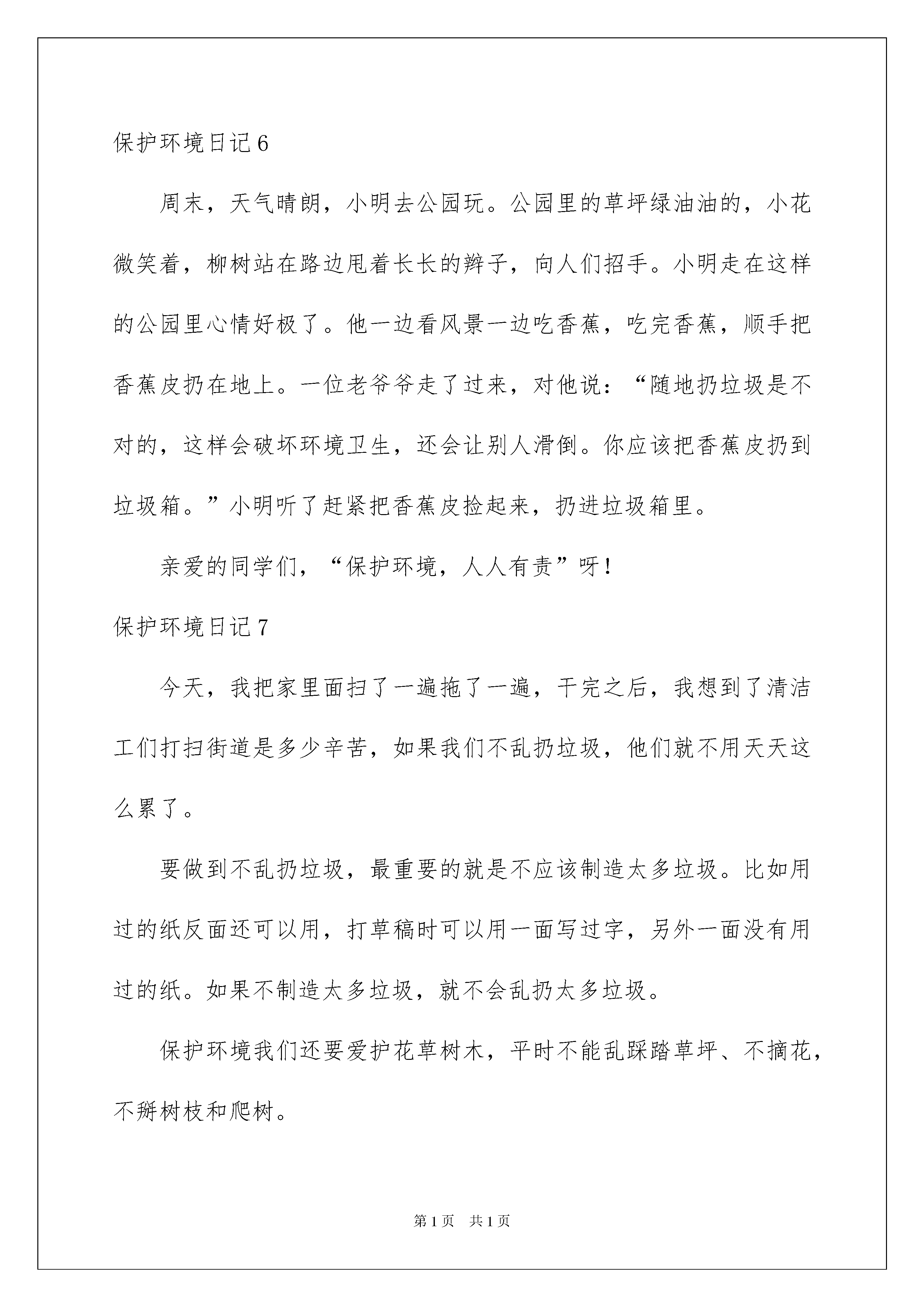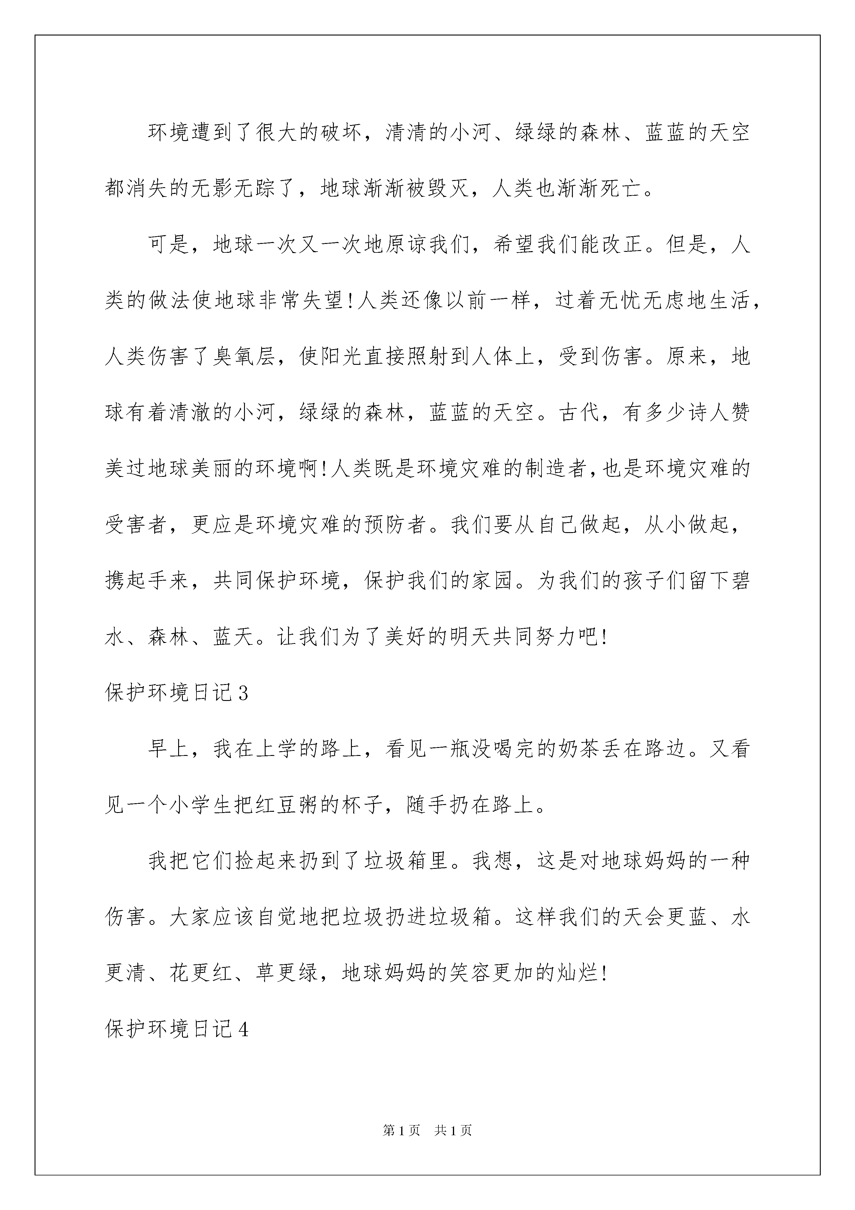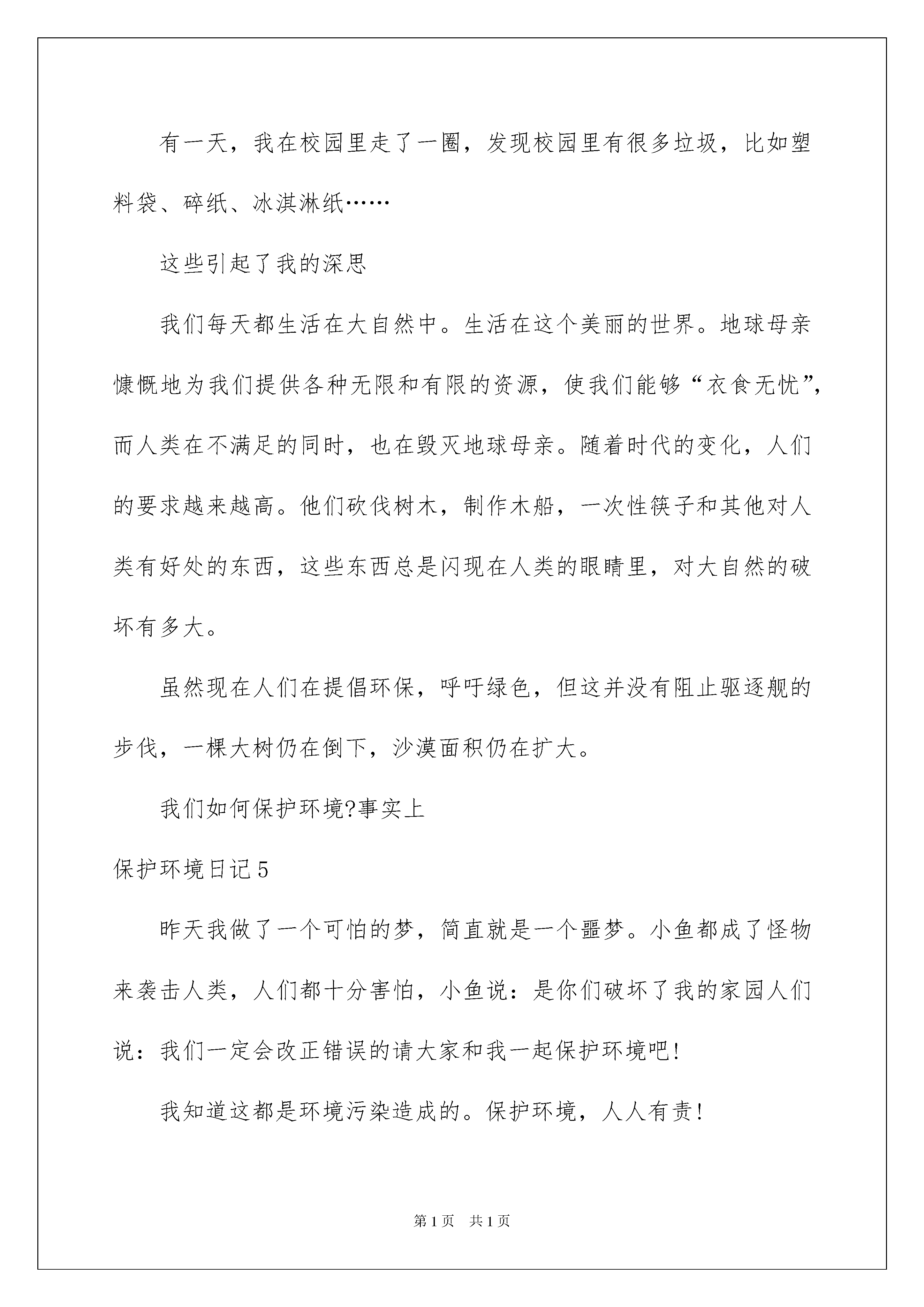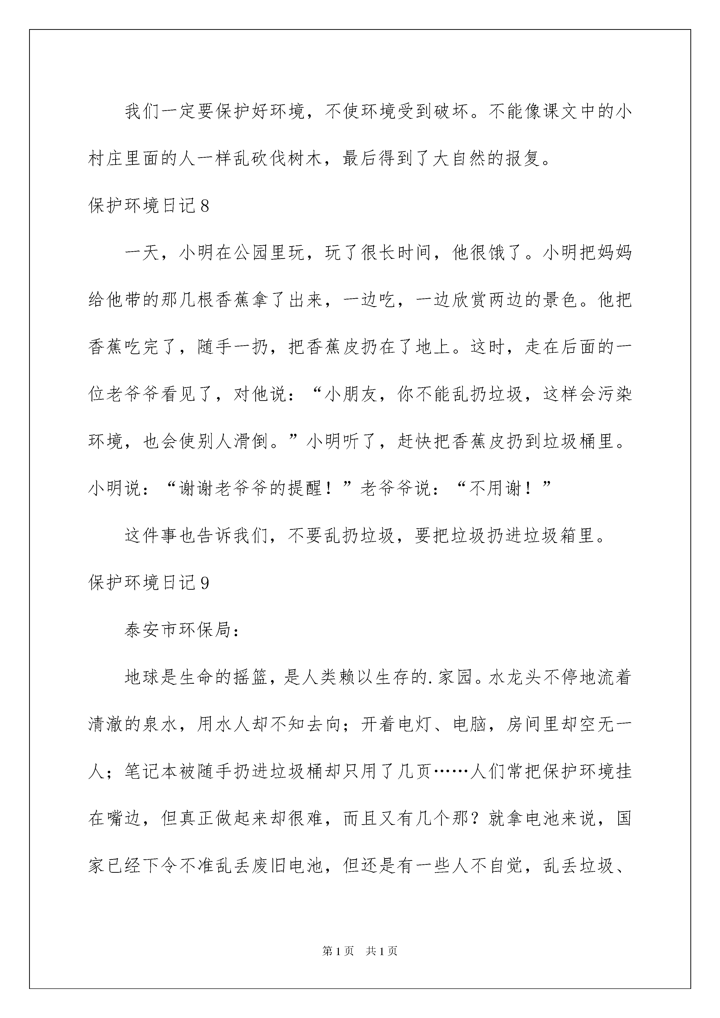 2022保护环境日记(集合15篇)保护环境日记一天的时间即将结束了,相信你有很多感悟吧,这也意味着,又要开始写日记了。为了让您不再为写日记头疼,下面是我为大家整理的保护环境日记,欢迎阅读,希望大家能够喜欢。保护环境日记1我今天和爸爸以及其他的小朋友们一起参加了垃圾分类环保一日游,我们首先去了兴丰的垃圾填埋场。我们早上8点半从儿童活动中心出发,到了那里,我们先去了填埋场中心看资料,然后我们又去了现场,那里很脏,还有很大的臭味。我们看到那些叔叔们先把垃圾放进去,然后把垃圾盖上一大片沙子,最后把沙子盖上一层膜。底下还有不让垃圾掉下来的东西,一共有两层。一位叔叔说:这一大片垃圾山有70米左右高。那里有许多垃圾,以前是一片好大的山。这里参观结束后,我们就坐上了车,高高兴兴地去了下一个点:李坑垃圾焚烧厂。保护环境日记2环境遭到了很大的破坏,清清的小河、绿绿的森林、蓝蓝的天空都消失的无影无踪了,地球渐渐被毁灭,人类也渐渐死亡。可是,地球一次又一次地原谅我们,希望我们能改正。但是,人类的做法使地球非常失望!人类还像以前一样,过着无忧无虑地生活,人类伤害了臭氧层,使阳光直接照射到人体上,受到伤害。原来,地球有着清澈的小河,绿绿的森林,蓝蓝的天空。古代,有多少诗人赞美过地球美丽的环境啊!人类既是环境灾难的制造者,也是环境灾难的受害者,更应是环境灾难的预防者。我们要从自己做起,从小做起,携起手来,共同保护环境,保护我们的家园。为我们的孩子们留下碧水、森林、蓝天。让我们为了美好的明天共同努力吧!保护环境日记3早上,我在上学的路上,看见一瓶没喝完的奶茶丢在路边。又看见一个小学生把红豆粥的杯子,随手扔在路上。我把它们捡起来扔到了垃圾箱里。我想,这是对地球妈妈的一种伤害。大家应该自觉地把垃圾扔进垃圾箱。这样我们的天会更蓝、水更清、花更红、草更绿,地球妈妈的笑容更加的灿烂!保护环境日记4有一天,我在校园里走了一圈,发现校园里有很多垃圾,比如塑料袋、碎纸、冰淇淋纸……这些引起了我的深思我们每天都生活在大自然中。生活在这个美丽的世界。地球母亲慷慨地为我们提供各种无限和有限的资源,使我们能够“衣食无忧”,而人类在不满足的同时,也在毁灭地球母亲。随着时代的变化,人们的要求越来越高。他们砍伐树木,制作木船,一次性筷子和其他对人类有好处的东西,这些东西总是闪现在人类的眼睛里,对大自然的破坏有多大。虽然现在人们在提倡环保,呼吁绿色,但这并没有阻止驱逐舰的步伐,一棵大树仍在倒下,沙漠面积仍在扩大。我们如何保护环境?事实上保护环境日记5昨天我做了一个可怕的梦,简直就是一个噩梦。小鱼都成了怪物来袭击人类,人们都十分害怕,小鱼说:是你们破坏了我的家园人们说:我们一定会改正错误的请大家和我一起保护环境吧!我知道这都是环境污染造成的。保护环境,人人有责!保护环境日记6周末,天气晴朗,小明去公园玩。公园里的草坪绿油油的,小花微笑着,柳树站在路边甩着长长的辫子,向人们招手。小明走在这样的公园里心情好极了。他一边看风景一边吃香蕉,吃完香蕉,顺手把香蕉皮扔在地上。一位老爷爷走了过来,对他说:“随地扔垃圾是不对的,这样会破坏环境卫生,还会让别人滑倒。你应该把香蕉皮扔到垃圾箱。”小明听了赶紧把香蕉皮捡起来,扔进垃圾箱里。亲爱的同学们,“保护环境,人人有责”呀!保护环境日记7今天,我把家里面扫了一遍拖了一遍,干完之后,我想到了清洁工们打扫街道是多少辛苦,如果我们不乱扔垃圾,他们就不用天天这么累了。要做到不乱扔垃圾,最重要的就是不应该制造太多垃圾。比如用过的纸反面还可以用,打草稿时可以用一面写过字,另外一面没有用过的纸。如果不制造太多垃圾,就不会乱扔太多垃圾。保护环境我们还要爱护花草树木,平时不能乱踩踏草坪、不摘花,不掰树枝和爬树。我们一定要保护好环境,不使环境受到破坏。不能像课文中的小村庄里面的人一样乱砍伐树木,最后得到了大自然的报复。保护环境日记8一天,小明在公园里玩,玩了很长时间,他很饿了。小明把妈妈给他带的那几根香蕉拿了出来,一边吃,一边欣赏两边的景色。他把香蕉吃完了,随手一扔,把香蕉皮扔在了地上。这时,走在后面的一位老爷爷看见了,对他说:“小朋友,你不能乱扔垃圾,这样会污染环境,也会使别人滑倒。”小明听了,赶快把香蕉皮扔到垃圾桶里。小明说:“谢谢老爷爷的提醒!”老爷爷说:“不用谢!”这件事也告诉我们,不要乱扔垃圾,要把垃圾扔进垃圾箱里。保护环境日记9泰安市环保局:地球是生命的摇篮,是人类赖以生存的.家园。水龙头不停地流着清澈的泉水,用水人却不知去向;开着电灯、电脑,房间里却空无一人;笔记本被随手扔进垃圾桶却只用了几页……人们常把保护环