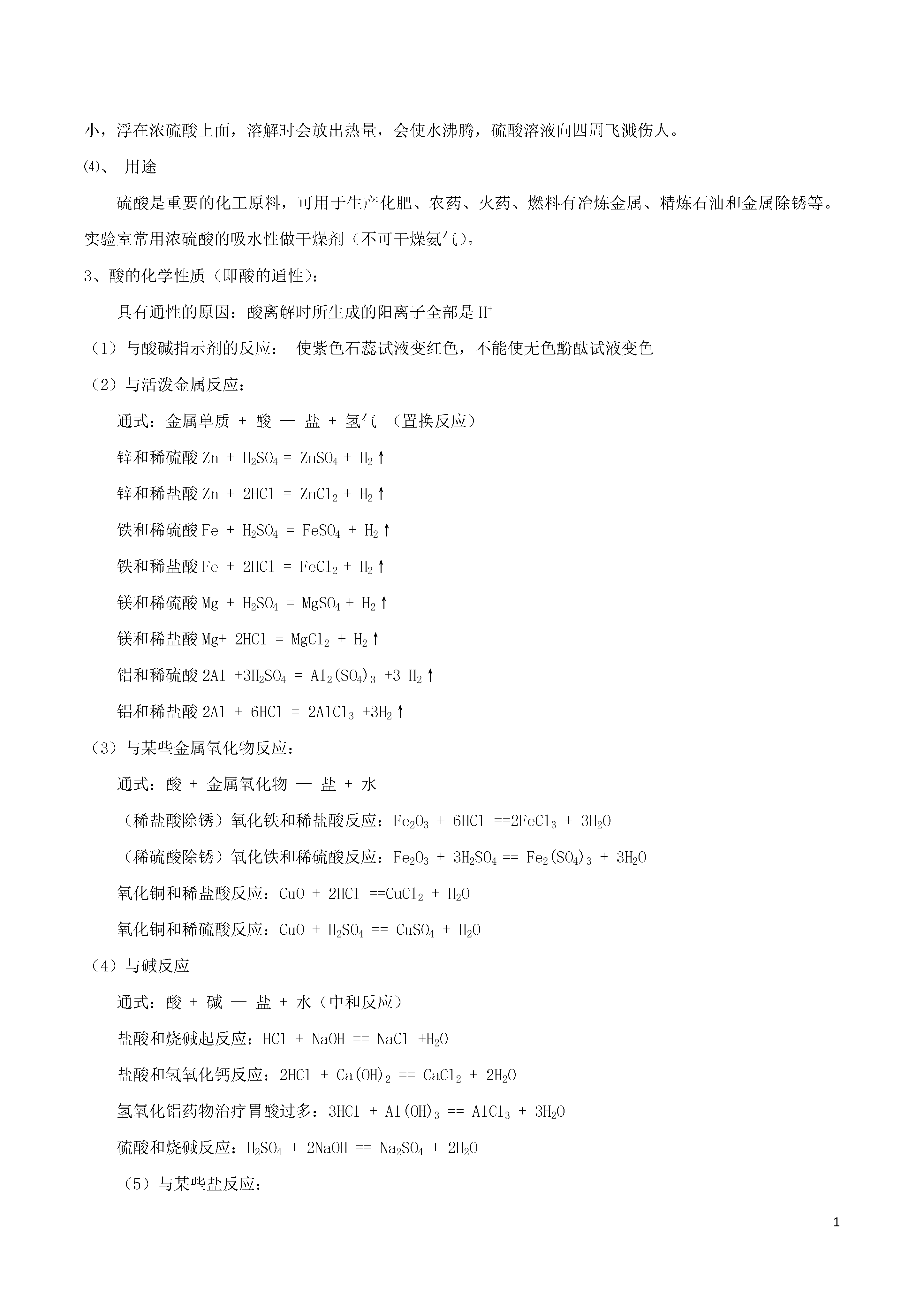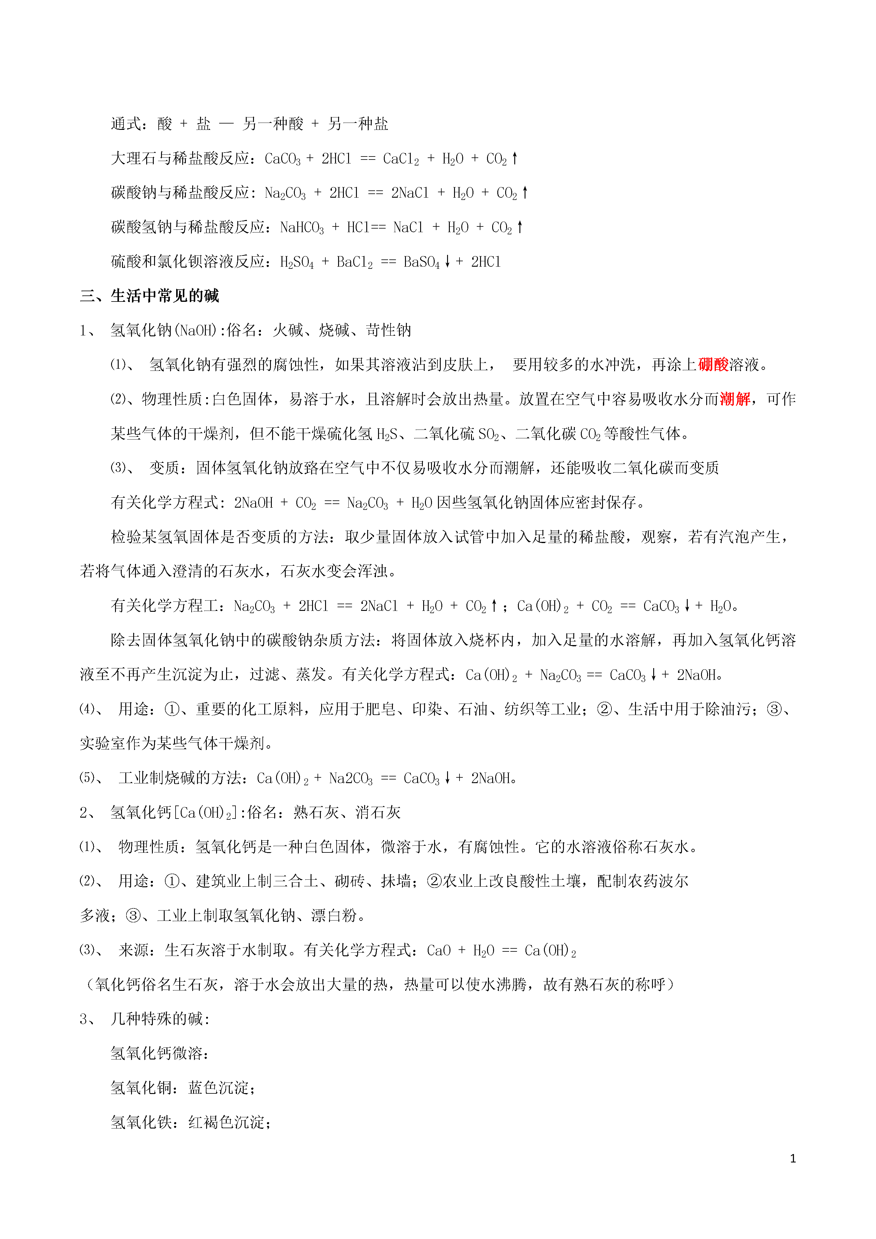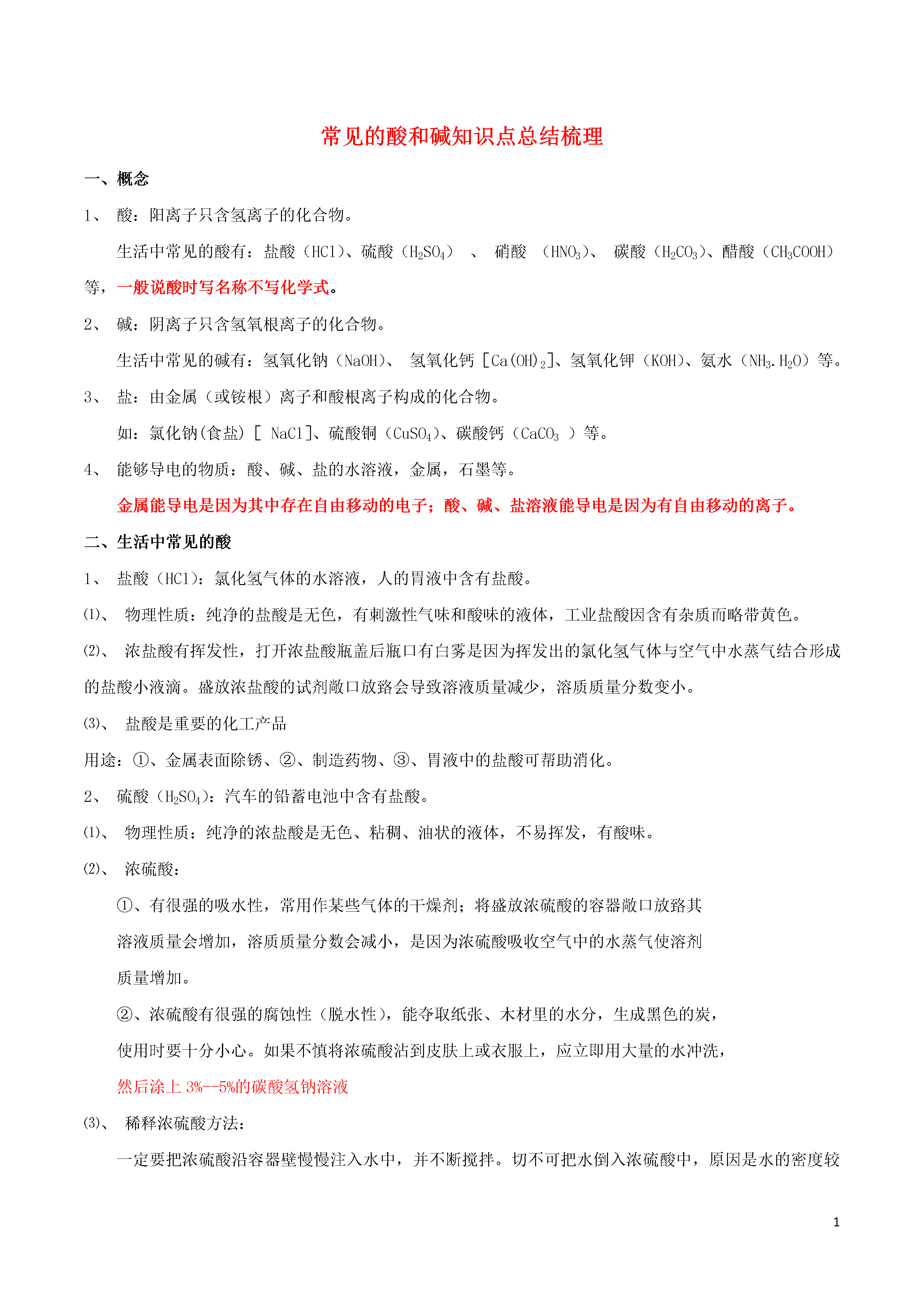 1常见的酸和碱知识点总结梳理一、概念1、酸:阳离子只含氢离子的化合物。生活中常见的酸有:盐酸(HCl)、硫酸(H2SO4)、硝酸(HNO3)、碳酸(H2CO3)、醋酸(CH3COOH)等,一般说酸时写名称不写化学式。碱:阴离子只含氢氧根离子的化合物。生活中常见的碱有:氢氧化钠(NaOH)、氢氧化钙[Ca(OH)2]、氢氧化钾(KOH)、氨水(NH3.H2O)等。盐:由金属(或铵根)离子和酸根离子构成的化合物。如:氯化钠(食盐)[NaCl]、硫酸铜(CuSO4)、碳酸钙(CaCO3)等。4、能够导电的物质:酸、碱、盐的水溶液,金属,石墨等。金属能导电是因为其中存在自由移动的电子;酸、碱、盐溶液能导电是因为有自由移动的离子。二、生活中常见的酸1、盐酸(HCl):氯化氢气体的水溶液,人的胃液中含有盐酸。⑴、物理性质:纯净的盐酸是无色,有刺激性气味和酸味的液体,工业盐酸因含有杂质而略带黄色。⑵、浓盐酸有挥发性,打开浓盐酸瓶盖后瓶口有白雾是因为挥发出的氯化氢气体与空气中水蒸气结合形成的盐酸小液滴。盛放浓盐酸的试剂敞口放臵会导致溶液质量减少,溶质质量分数变小。⑶、盐酸是重要的化工产品用途:①、金属表面除锈、②、制造药物、③、胃液中的盐酸可帮助消化。2、硫酸(H2SO4):汽车的铅蓄电池中含有盐酸。⑴、物理性质:纯净的浓盐酸是无色、粘稠、油状的液体,不易挥发,有酸味。⑵、浓硫酸:①、有很强的吸水性,常用作某些气体的干燥剂;将盛放浓硫酸的容器敞口放臵其溶液质量会增加,溶质质量分数会减小,是因为浓硫酸吸收空气中的水蒸气使溶剂质量增加。②、浓硫酸有很强的腐蚀性(脱水性),能夺取纸张、木材里的水分,生成黑色的炭,使用时要十分小心。如果不慎将浓硫酸沾到皮肤上或衣服上,应立即用大量的水冲洗,然后涂上3%--5%的碳酸氢钠溶液⑶、稀释浓硫酸方法:一定要把浓硫酸沿容器壁慢慢注入水中,并不断搅拌。切不可把水倒入浓硫酸中,原因是水的密度较小,浮在浓硫酸上面,溶解时会放出热量,会使水沸腾,硫酸溶液向四周飞溅伤人。⑷、用途硫酸是重要的化工原料,可用于生产化肥、农药、火药、燃料有冶炼金属、精炼石油和金属除锈等。实验室常用浓硫酸的吸水性做干燥剂(不可干燥氨气)。酸的化学性质(即酸的通性):具有通性的原因:酸离解时所生成的阳离子全部是H+(1)与酸碱指示剂的反应:使紫色石蕊试液变红色,不能使无色酚酞试液变色(2)与活泼金属反应:通式:金属单质+酸—盐+氢气(置换反应)锌和稀硫酸Zn+H2SO4=ZnSO4+H2↑锌和稀盐酸Zn+2HCl=ZnCl2+H2↑铁和稀硫酸Fe+H2SO4=FeSO4+H2↑铁和稀盐酸Fe+2HCl=FeCl2+H2↑镁和稀硫酸Mg+H2SO4=MgSO4+H2↑镁和稀盐酸Mg+2HCl=MgCl2+H2↑铝和稀硫酸2Al+3H2SO4=Al2(SO4)3+3H2↑铝和稀盐酸2Al+6HCl=2AlCl3+3H2↑(3)与某些金属氧化物反应:通式:酸+金属氧化物—盐+水(稀盐酸除锈)氧化铁和稀盐酸反应:Fe2O3+6HCl==2FeCl3+3H2O(稀硫酸除锈)氧化铁和稀硫酸反应:Fe2O3+3H2SO4==Fe2(SO4)3+3H2O氧化铜和稀盐酸反应:CuO+2HCl==CuCl2+H2O氧化铜和稀硫酸反应:CuO+H2SO4==CuSO4+H2O(4)与碱反应通式:酸+碱—盐+水(中和反应)盐酸和烧碱起反应:HCl+NaOH==NaCl+H2O盐酸和氢氧化钙反应:2HCl+Ca(OH)2==CaCl2+2H2O氢氧化铝药物治疗胃酸过多:3HCl+Al(OH)3==AlCl3+3H2O硫酸和烧碱反应:H2SO4+2NaOH==Na2SO4+2H2O(5)与某些盐反应:通式:酸+盐—另一种酸+另一种盐大理石与稀盐酸反应:CaCO3+2HCl==CaCl2+H2O+CO2↑碳酸钠与稀盐酸反应:Na2CO3+2HCl==2NaCl+H2O+CO2↑碳酸氢钠与稀盐酸反应:NaHCO3+HCl==NaCl+H2O+CO2↑硫酸和氯化钡溶液反应:H2SO4+BaCl2==BaSO4↓+2HCl三、生活中常见的碱1、氢氧化钠(NaOH):俗名:火碱、烧碱、苛性钠⑴、氢氧化钠有强烈的腐蚀性,如果其溶液沾到皮肤上,要用较多的水冲洗,再涂上硼酸溶液。⑵、物理性质:白色固体,易溶于水,且溶解时会放出热量。放置在空气中容易吸收水分而潮解,可作某些气体的干燥剂,但不能干燥硫化氢H2S、二氧化硫SO2、二氧化碳CO2等酸性气体。⑶、变质:固体氢氧化钠放臵在空气中不仅易吸收水分而潮解,还能吸收二氧化碳而变质有关化学方程式:2