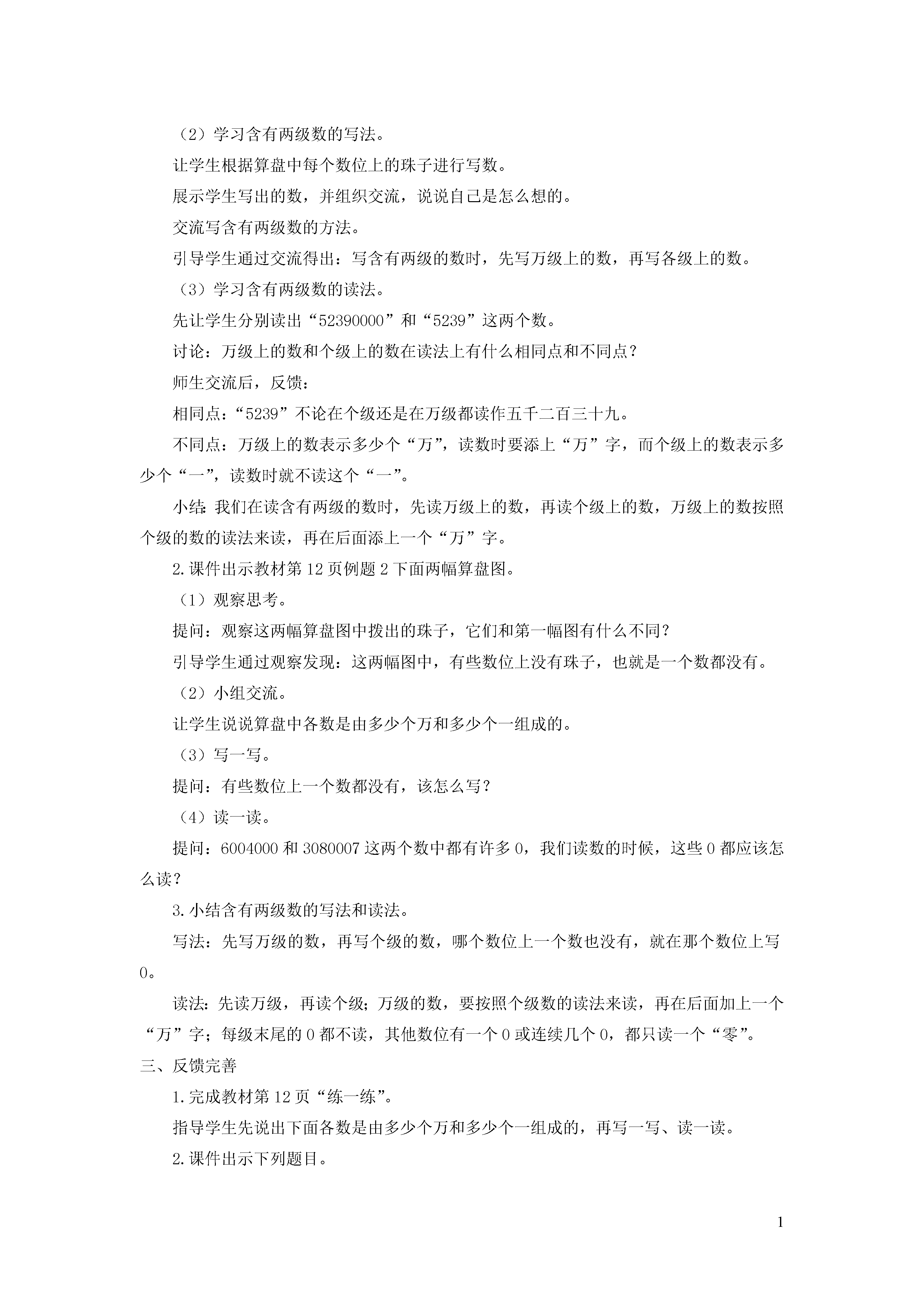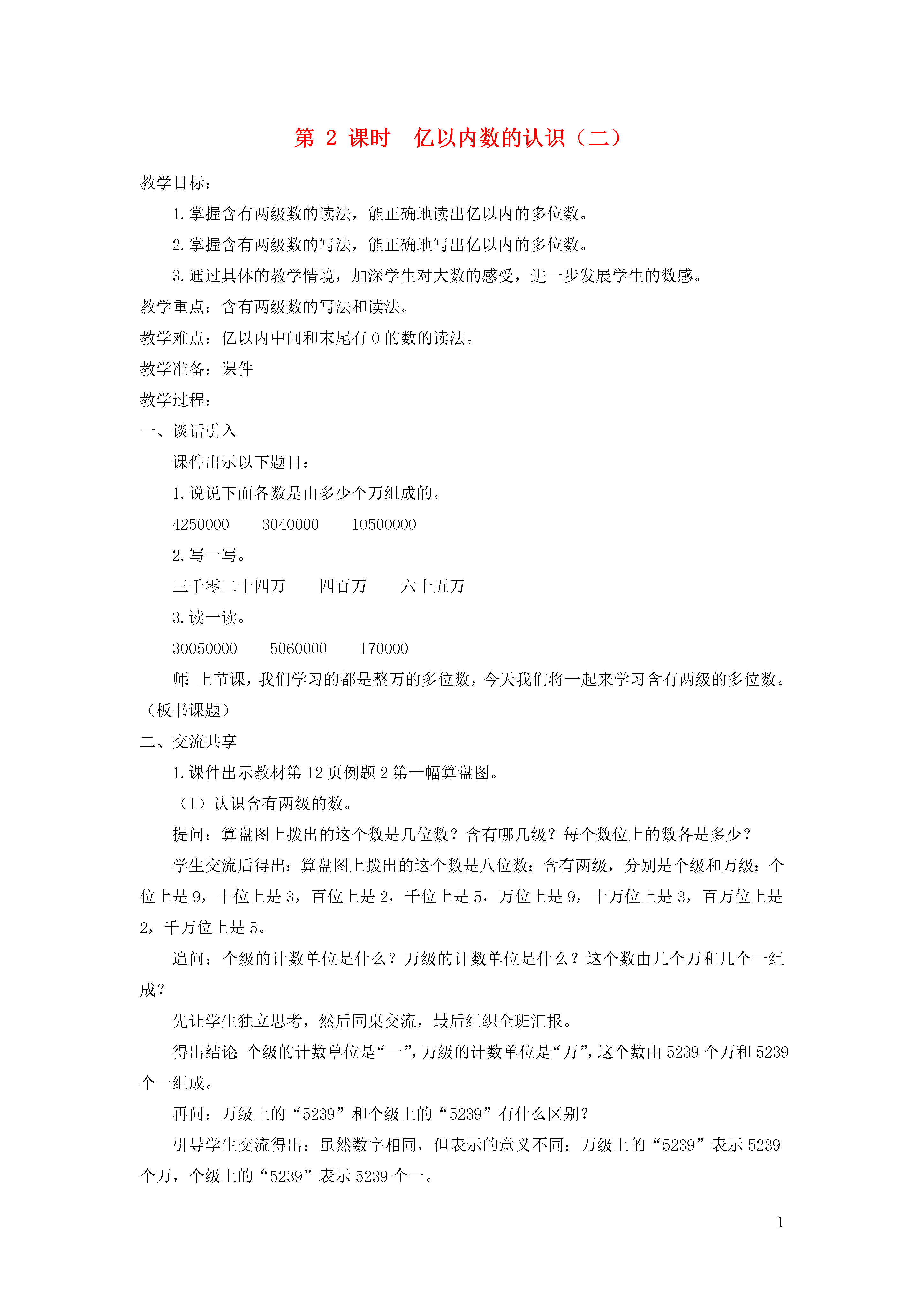 1第2课时亿以内数的认识(二)教学目标:1.掌握含有两级数的读法,能正确地读出亿以内的多位数。2.掌握含有两级数的写法,能正确地写出亿以内的多位数。3.通过具体的教学情境,加深学生对大数的感受,进一步发展学生的数感。教学重点:含有两级数的写法和读法。教学难点:亿以内中间和末尾有0的数的读法。教学准备:课件教学过程:一、谈话引入课件出示以下题目:1.说说下面各数是由多少个万组成的。42500003040000105000002.写一写。三千零二十四万四百万六十五万3.读一读。300500005060000170000师:上节课,我们学习的都是整万的多位数,今天我们将一起来学习含有两级的多位数。(板书课题)二、交流共享1.课件出示教材例题2第一幅算盘图。(1)认识含有两级的数。提问:算盘图上拨出的这个数是几位数?含有哪几级?每个数位上的数各是多少?学生交流后得出:算盘图上拨出的这个数是八位数;含有两级,分别是个级和万级;个位上是9,十位上是3,百位上是2,千位上是5,万位上是9,十万位上是3,百万位上是2,千万位上是5。追问:个级的计数单位是什么?万级的计数单位是什么?这个数由几个万和几个一组成?先让学生独立思考,然后同桌交流,最后组织全班汇报。得出结论:个级的计数单位是“一”,万级的计数单位是“万”,这个数由5239个万和5239个一组成。再问:万级上的“5239”和个级上的“5239”有什么区别?引导学生交流得出:虽然数字相同,但表示的意义不同:万级上的“5239”表示5239个万,个级上的“5239”表示5239个一。(2)学习含有两级数的写法。让学生根据算盘中每个数位上的珠子进行写数。展示学生写出的数,并组织交流,说说自己是怎么想的。交流写含有两级数的方法。引导学生通过交流得出:写含有两级的数时,先写万级上的数,再写各级上的数。(3)学习含有两级数的读法。先让学生分别读出“52390000”和“5239”这两个数。讨论:万级上的数和个级上的数在读法上有什么相同点和不同点?师生交流后,反馈:相同点:“5239”不论在个级还是在万级都读作五千二百三十九。不同点:万级上的数表示多少个“万”,读数时要添上“万”字,而个级上的数表示多少个“一”,读数时就不读这个“一”。小结:我们在读含有两级的数时,先读万级上的数,再读个级上的数,万级上的数按照个级的数的读法来读,再在后面添上一个“万”字。2.课件出示教材例题2下面两幅算盘图。(1)观察思考。提问:观察这两幅算盘图中拨出的珠子,它们和第一幅图有什么不同?引导学生通过观察发现:这两幅图中,有些数位上没有珠子,也就是一个数都没有。(2)小组交流。让学生说说算盘中各数是由多少个万和多少个一组成的。(3)写一写。提问:有些数位上一个数都没有,该怎么写?(4)读一读。提问:6004000和3080007这两个数中都有许多0,我们读数的时候,这些0都应该怎么读?3.小结含有两级数的写法和读法。写法:先写万级的数,再写个级的数,哪个数位上一个数也没有,就在那个数位上写0。读法:先读万级,再读个级;万级的数,要按照个级数的读法来读,再在后面加上一个“万”字;每级末尾的0都不读,其他数位有一个0或连续几个0,都只读一个“零”。三、反馈完善1.完成教材“练一练”。指导学生先说出下面各数是由多少个万和多少个一组成的,再写一写、读一读。2.课件出示下列题目。(1)读一读。①2014年中国科技馆接待观众1900803人次。②地球赤道周长约为40075700米。③永乐大钟上铸了230184个汉字,是世界上汉字最多的大钟。学生试读后,让学生说说这些数分别是怎样读的。(2)写出下列横线上的数。①我国的领土面积约九百六十万平方千米。②中国国家图书馆累计藏书约二千一百六十万零九百册。学生独立写数,并组织汇报。四、反思总结通过本课的学习,你有什么收获?还有哪些疑问?