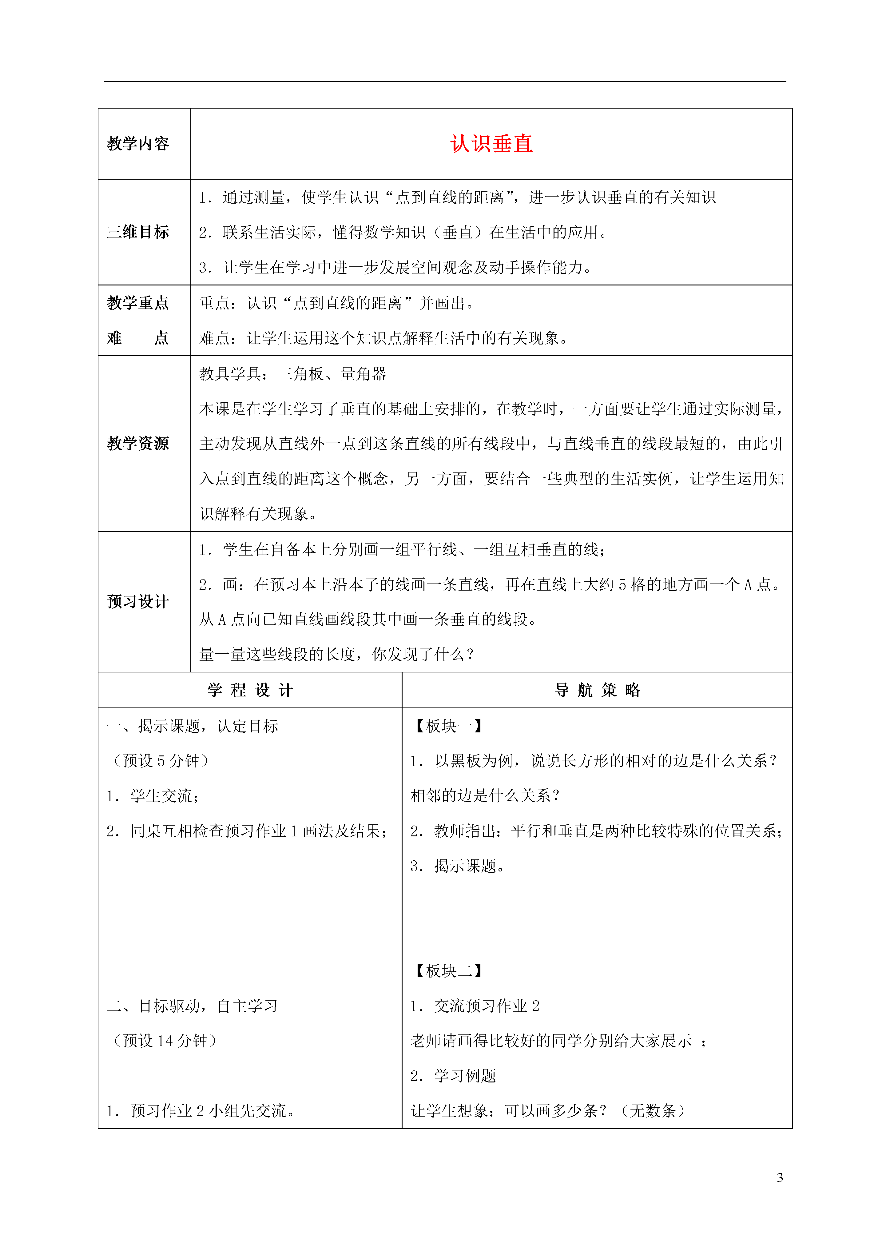 3教学内容认识垂直三维目标1.通过测量,使学生认识“点到直线的距离”,进一步认识垂直的有关知识2.联系生活实际,懂得数学知识(垂直)在生活中的应用。3.让学生在学习中进一步发展空间观念及动手操作能力。教学重点难点重点:认识“点到直线的距离”并画出。难点:让学生运用这个知识点解释生活中的有关现象。教学资源教具学具:三角板、量角器本课是在学生学习了垂直的基础上安排的,在教学时,一方面要让学生通过实际测量,主动发现从直线外一点到这条直线的所有线段中,与直线垂直的线段最短的,由此引入点到直线的距离这个概念,另一方面,要结合一些典型的生活实例,让学生运用知识解释有关现象。预习设计1.学生在自备本上分别画一组平行线、一组互相垂直的线;2.画:在预习本上沿本子的线画一条直线,再在直线上大约5格的地方画一个A点。从A点向已知直线画线段其中画一条垂直的线段。量一量这些线段的长度,你发现了什么?学程设计导航策略一、揭示课题,认定目标(预设5分钟)1.学生交流;2.同桌互相检查预习作业1画法及结果;二、目标驱动,自主学习(预设14分钟)1.预习作业2小组先交流。2.比较量得的长度,你有什么发现?说给同桌听。全班交流。在交流的基础上,组织学生阅读书上的结论:这条垂直的线段最短三、全班交流,提炼建模(预设6分钟)1.学生读什么是“距离”;2.学生继续读书:什么是“点到这条直线的距离”3.学生思考什么是点到直线的距离?有什么特点?再看,这个距离指的是点到线的距离,比一比,两个距离有什么共同的地方吗?(都是最短的)4.先指名交流:你可以画几条?怎么画?给学生一分钟的时间,学生动手画一画量一量这些线段的长度,你有什么发现?(这些线段的长度都是2厘米,是相等的。)继续摆动手中的尺,试一试,有没有用别的方法,可以得到这两条平行线之间更短的线段?(没有)5.动手画一画,量一量。交流结果6.小组交流的基础上,再组织全班的交流。你在生活中还能找到这样的例子吗?。7.全班演示,交流。四、分层练习,内化提升(预设5分钟)1.想想做做12.想想做做33.想想做做4【板块一】1.以黑板为例,说说长方形的相对的边是什么关系?相邻的边是什么关系?2.教师指出:平行和垂直是两种比较特殊的位置关系;3.揭示课题。【板块二】1.交流预习作业2老师请画得比较好的同学分别给大家展示;2.学习例题让学生想象:可以画多少条?(无数条)想一想,哪一条最特殊?(垂直的线段)再分别请几个学生报一报自己的测量的结果,其他学生根据发现判断他的测量是否有明显的问题。【板块三】1.教学“距离”问:“距离”一说,你在前面也学过,是哪里?(把书翻到)2.(把书翻到)继续读书:从直线外一点到这条直线所画的垂直线段的长度,叫做这点到这条直线的距离。3.提问:什么是点到直线的距离?有什么特点?4.想想做做第2题:在两条平行线之间画几条与平行线垂直的线段指出:连接这两条平行线,只有这些垂直的线的长度是最短的。那谁能来试着说一说:这垂直的线段的长度就是两条平行线之间的什么?(距离)为什么可以这么说?(最短)回忆:在开始认识平行线的时候,有同学指出一种画法,可以先任意地画出一条直线,然后再在这条直线之外分别量两个2cm,再把这两个点连起来,这样得到的另一条线就和刚才的那条是平行的关系想一想:这是为什么呢?【板块四】1.想想做做1问:量的是距离,也就是要量什么?2.想想做做3你知道为什么这样测量吗?3.想想做做4怎样走路线最短?为什么?